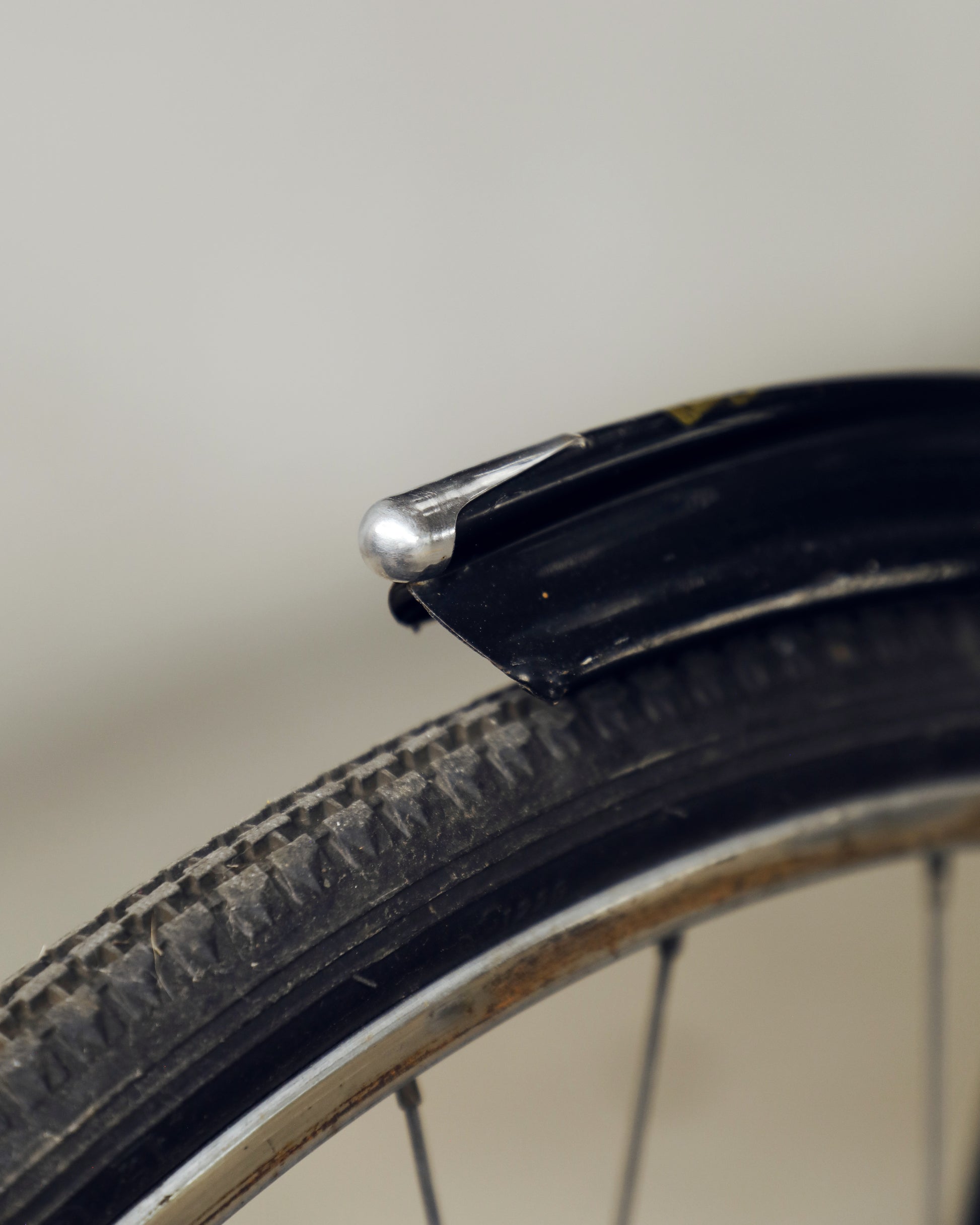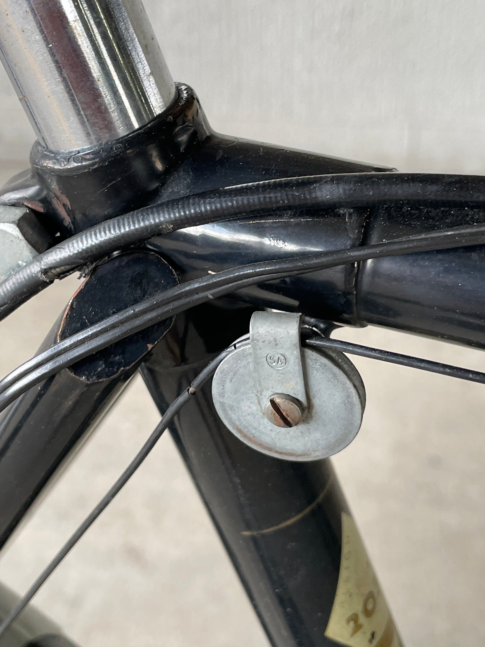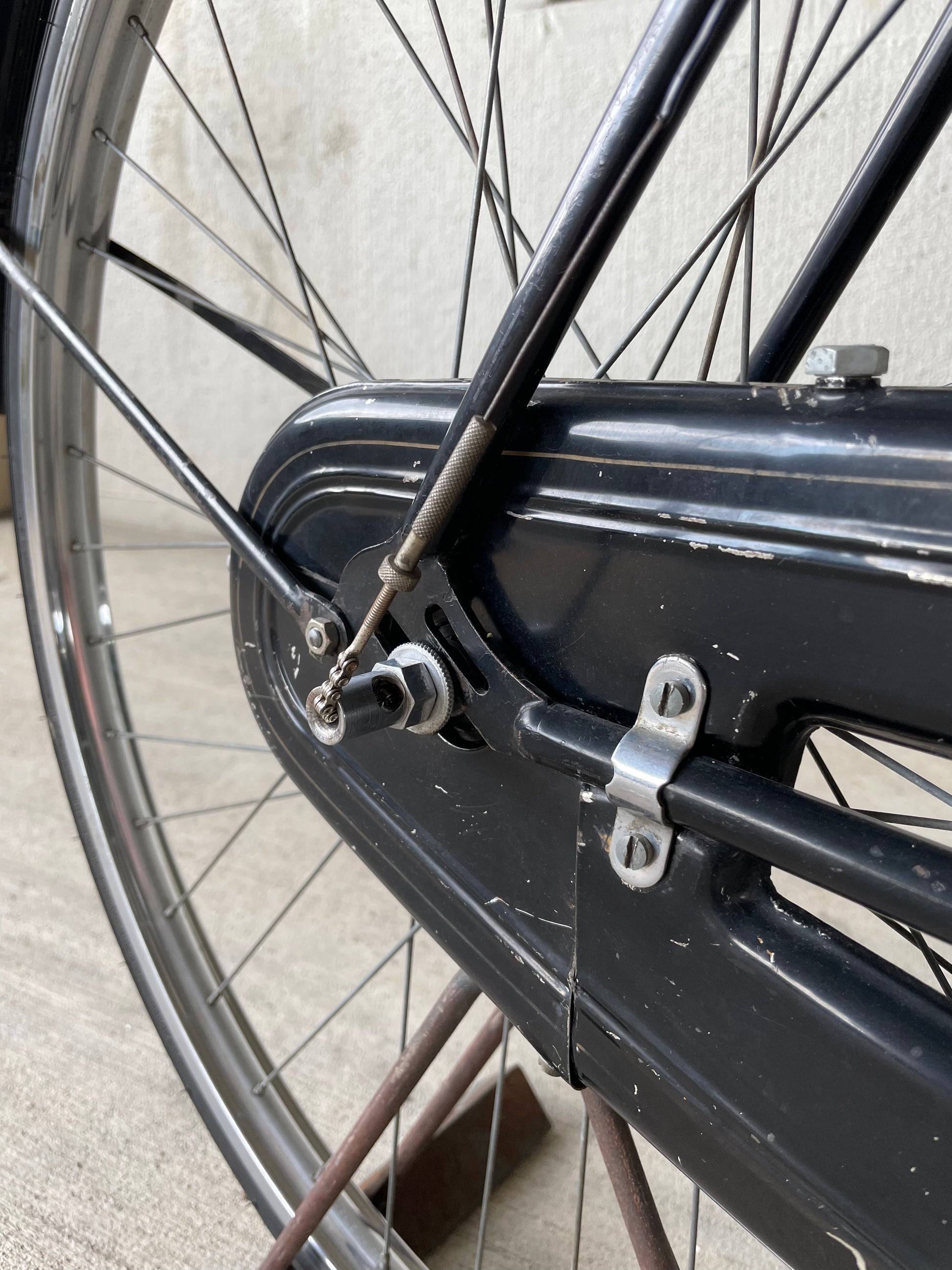 This bike shows great patina and is in overall good condition. Both the front and rear lights still work and are powered by the front dyno-hub. All of the other bits and pieces are original as to when Toni purchased the bike in 1954, except for the tires which have been replaced. There are no dents, cracks or bends in the frame. There is rust in some sections but not enough to hurt the structure of the bike. The rear reflector on the fender has a crack in it. The frame pump has a crack in the handle but is still functional. It also feels like the rear hub is a little sticky and can only grab 2 of the 3 gears. This could be fixed by spraying the inside of the hub with a little lube and maybe some compressed air. The fenders have a couple hail sized dents but nothing that stands out too much. There is also some wear on the inside of the drive side crank from rubbing on the chain protector. Finally, the rims have some corrosion on the braking surface.