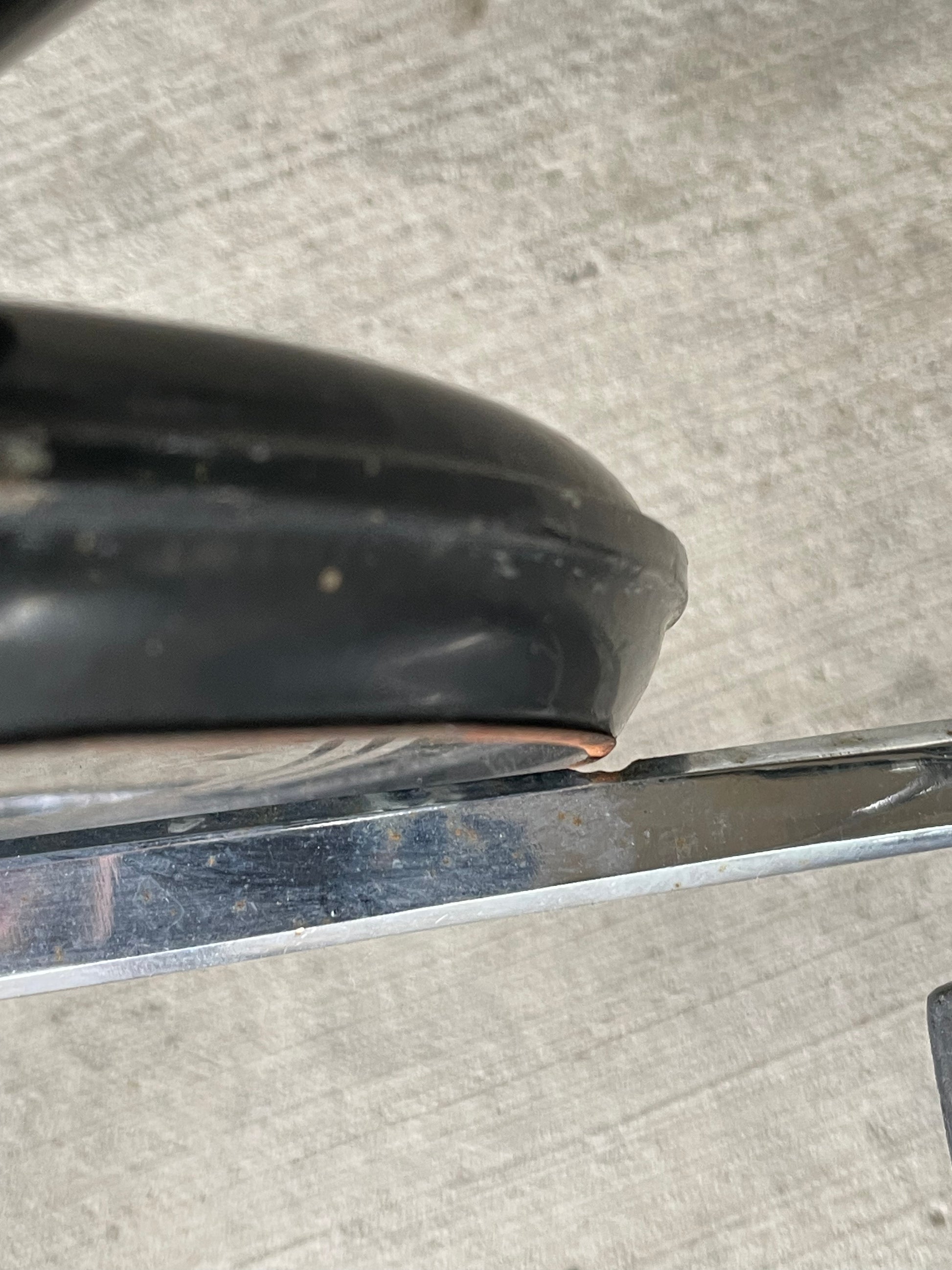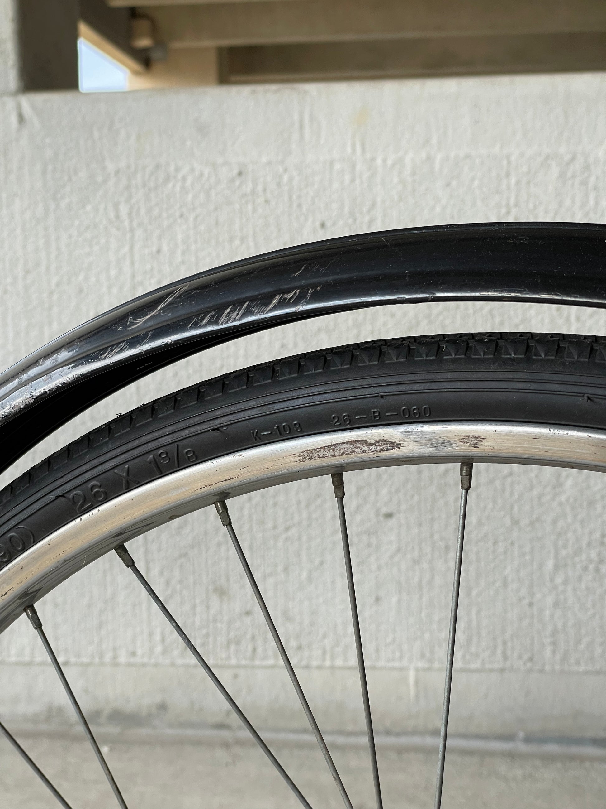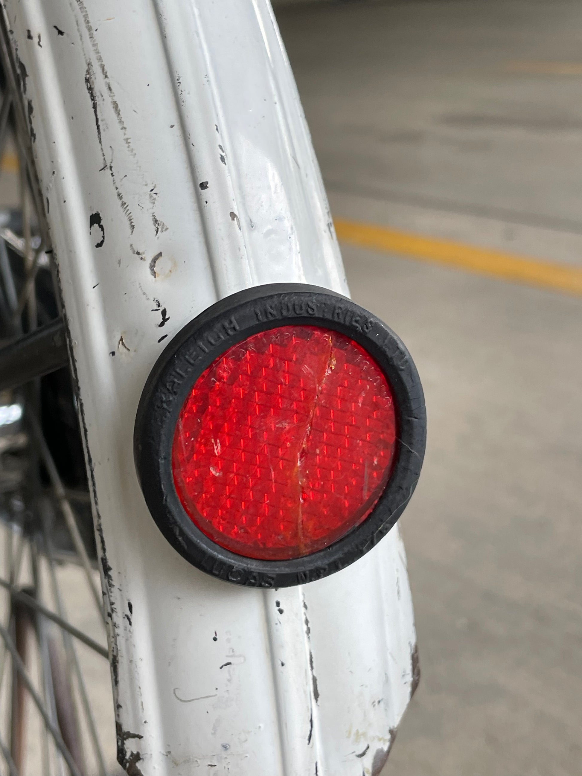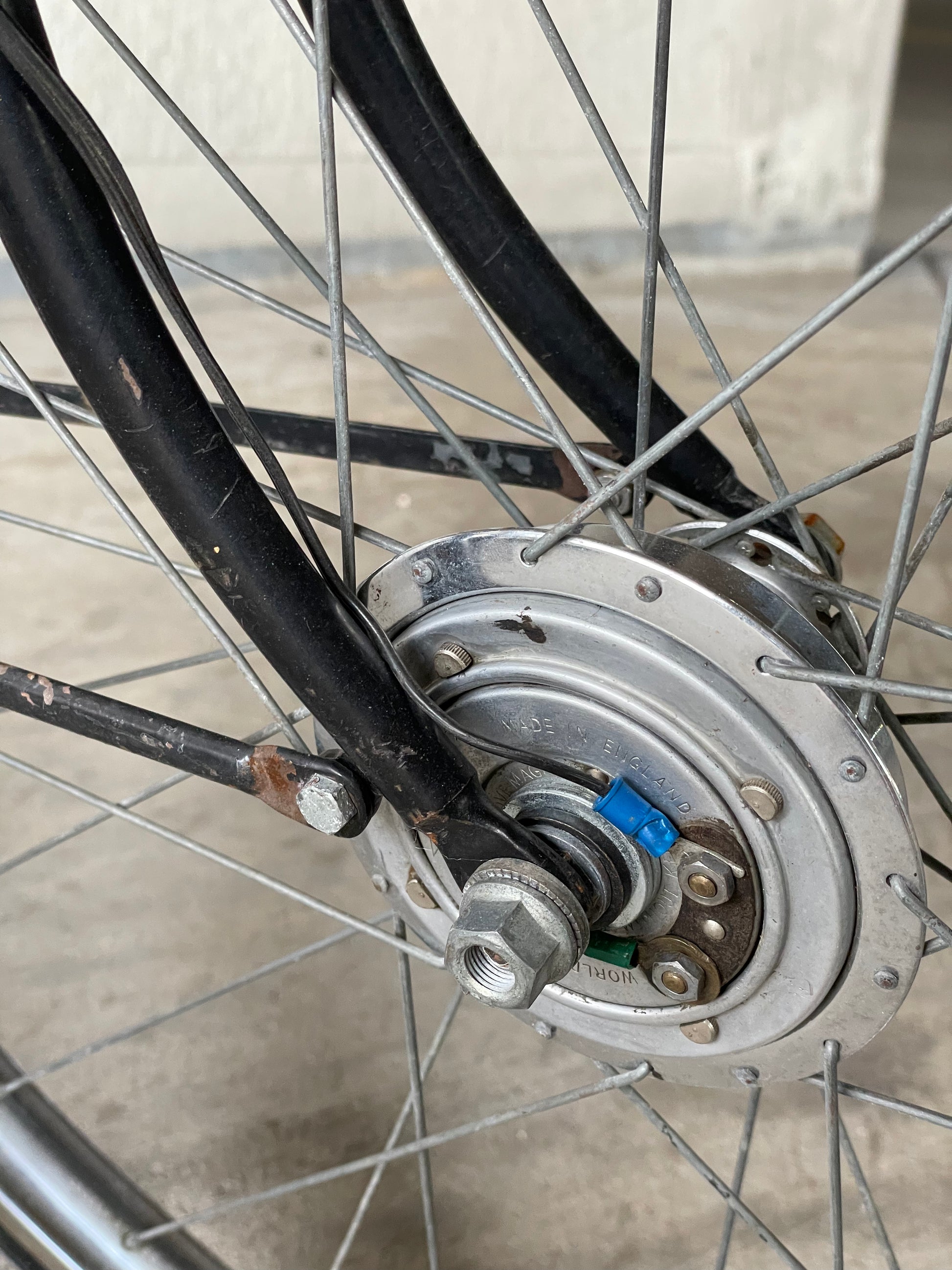 This bike shows great patina and is in overall good condition. Both the front and rear lights still work and are powered by the front dyno-hub. All of the other bits and pieces are original as to when Toni purchased the bike in 1954, except for the tires which have been replaced. There are no dents, cracks or bends in the frame. There is rust in some sections but not enough to hurt the structure of the bike. The rear reflector on the fender has a crack in it. The frame pump has a crack in the handle but is still functional. It also feels like the rear hub is a little sticky and can only grab 2 of the 3 gears. This could be fixed by spraying the inside of the hub with a little lube and maybe some compressed air. The fenders have a couple hail sized dents but nothing that stands out too much. There is also some wear on the inside of the drive side crank from rubbing on the chain protector. Finally, the rims have some corrosion on the braking surface.