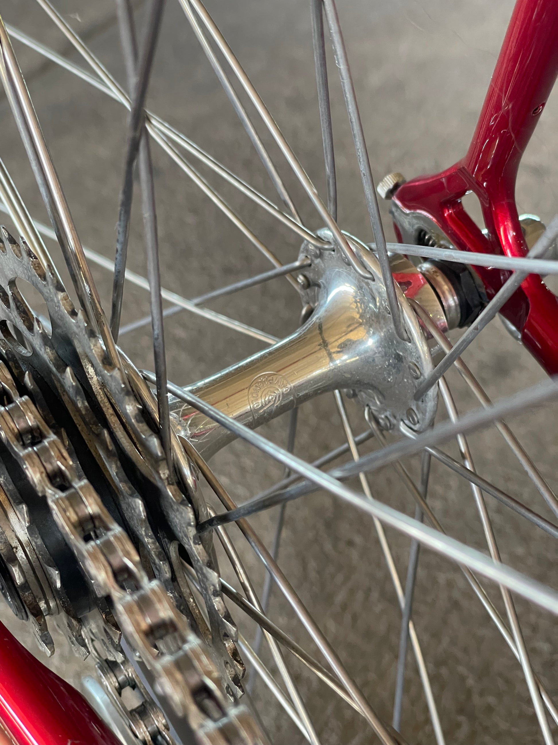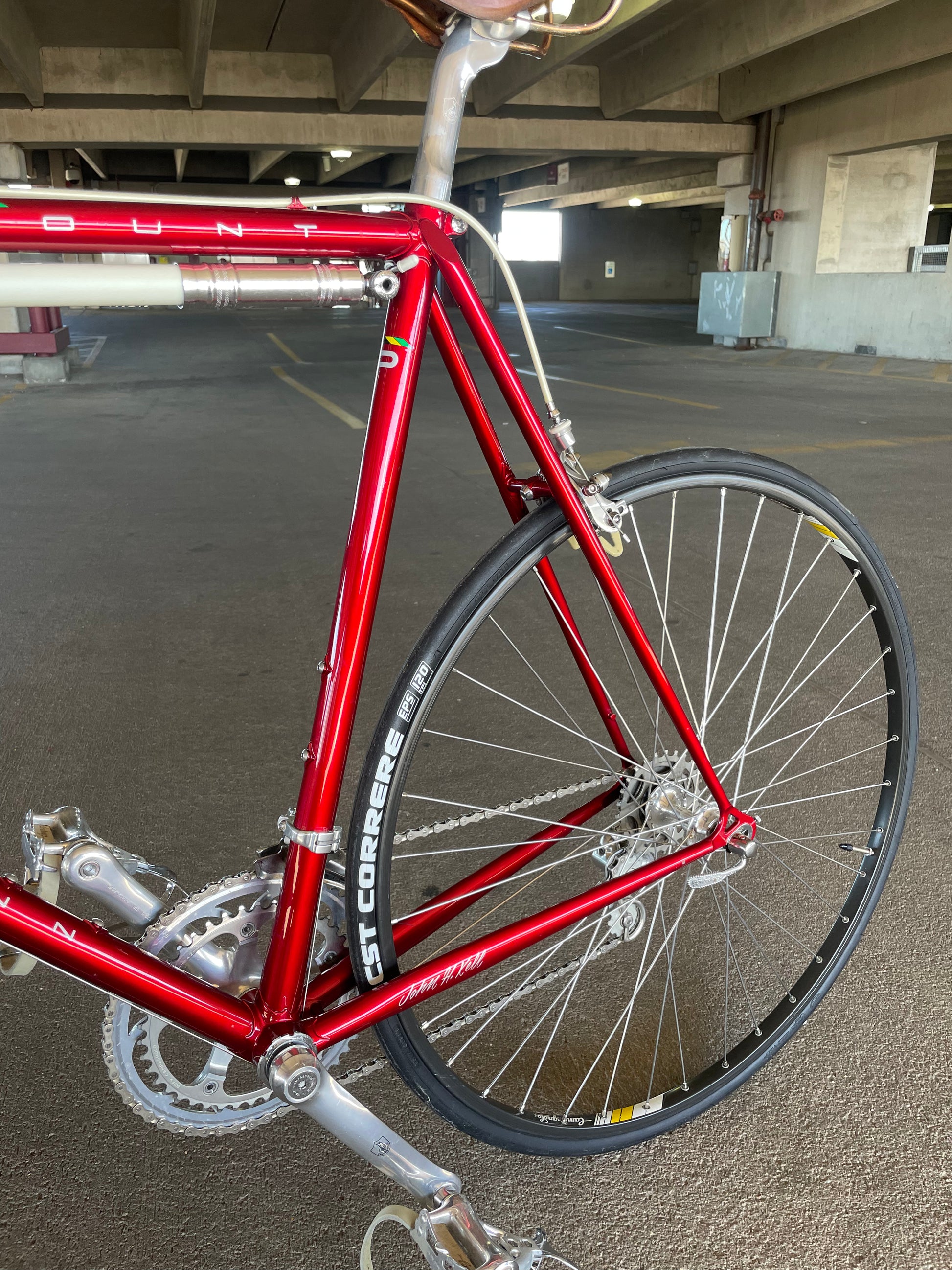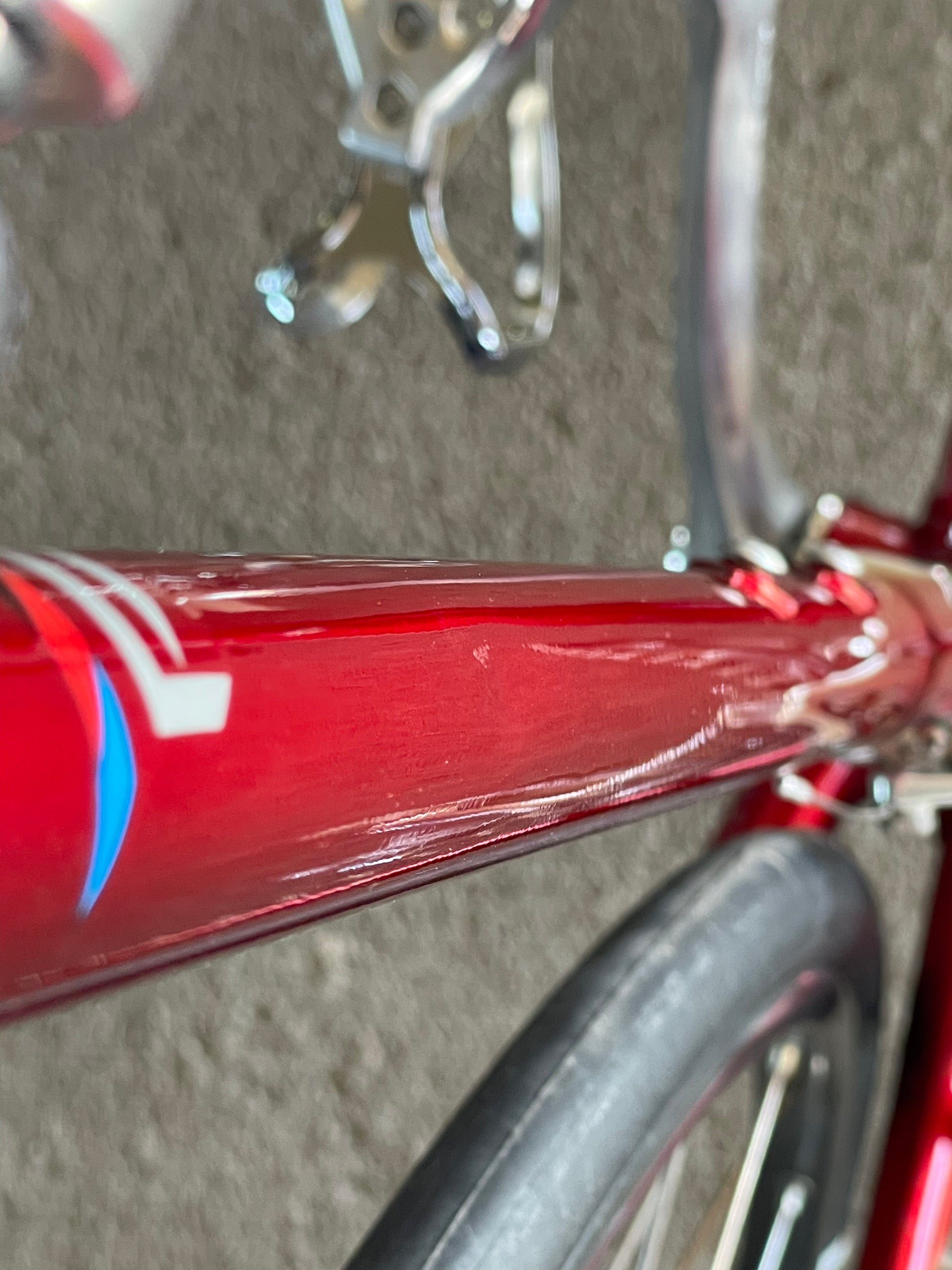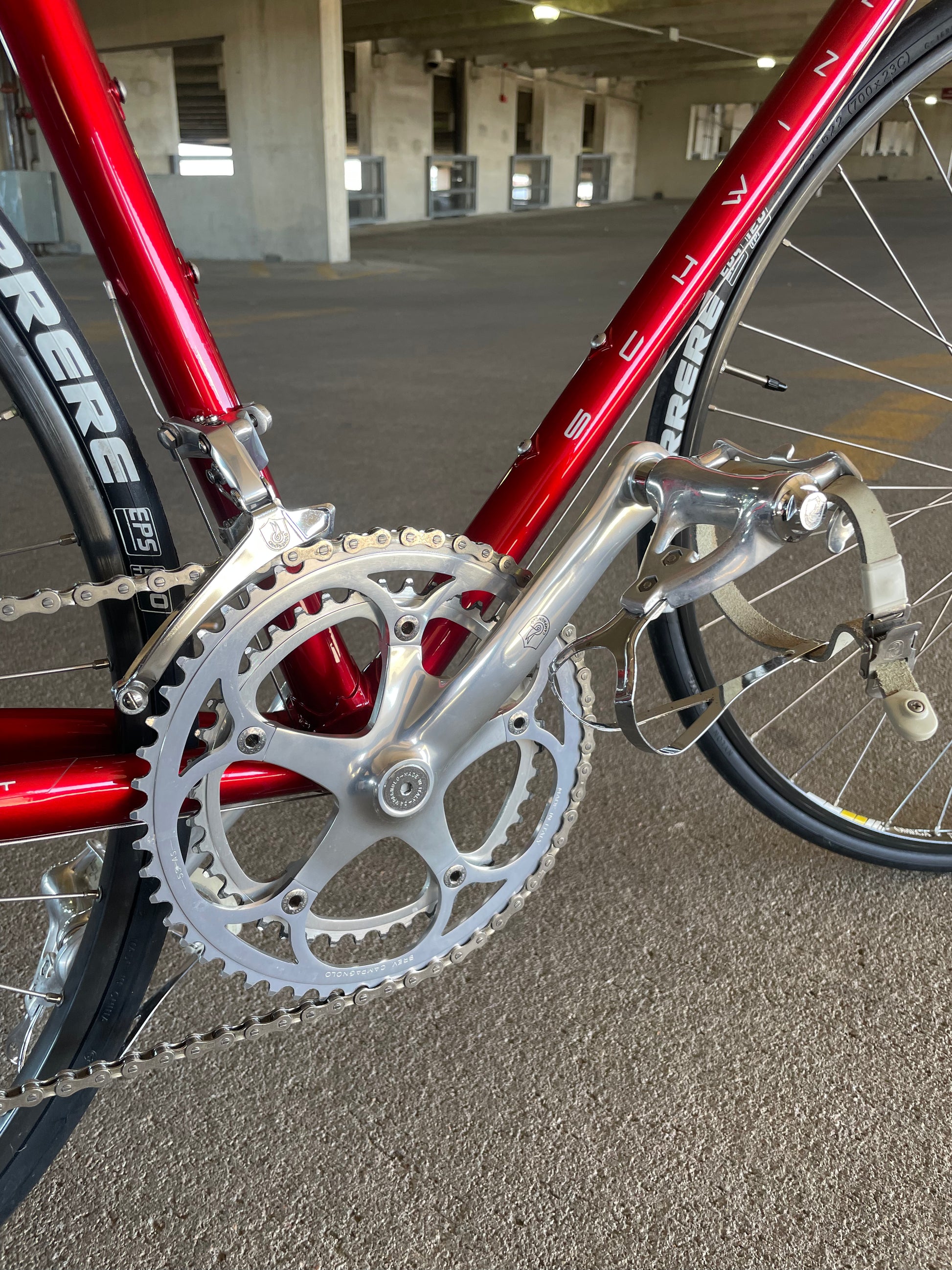 This 1989 Schwinn Paramount is simply stunning. It's in excellent condition! It was probably only ridden a few times and then was hung up in the garage. Everything on the bike is original, even down to the Cinelli bar tape. This bike is very race focused and is incredibly snappy. The deep metallic red is beautiful and contrasts well with the Campagnolo Croce d'Aune groupset. This bike is basically new, but still has some sign of use from being moved around. It has one paint chip on the non drive side chain-stay. In the right light, it also looks like it has two very small impressions in the seat tube, on both the drive and non drive side. It's very hard to see, but when you run you finger down the tube you can feel it. I tried to get good photos of that. This was also made in a time where clipless was becoming popular, so there is some toe overlap while turning with the caged pedals. Oh, and as an added bonus, it comes with some Paramount riding gloves, Paramount bottle cages, and a Paramount computer (tuns on but the screen is pixelated). Apart from that, it looks like this bike just rolled out of the Waterford factory in 1989!
