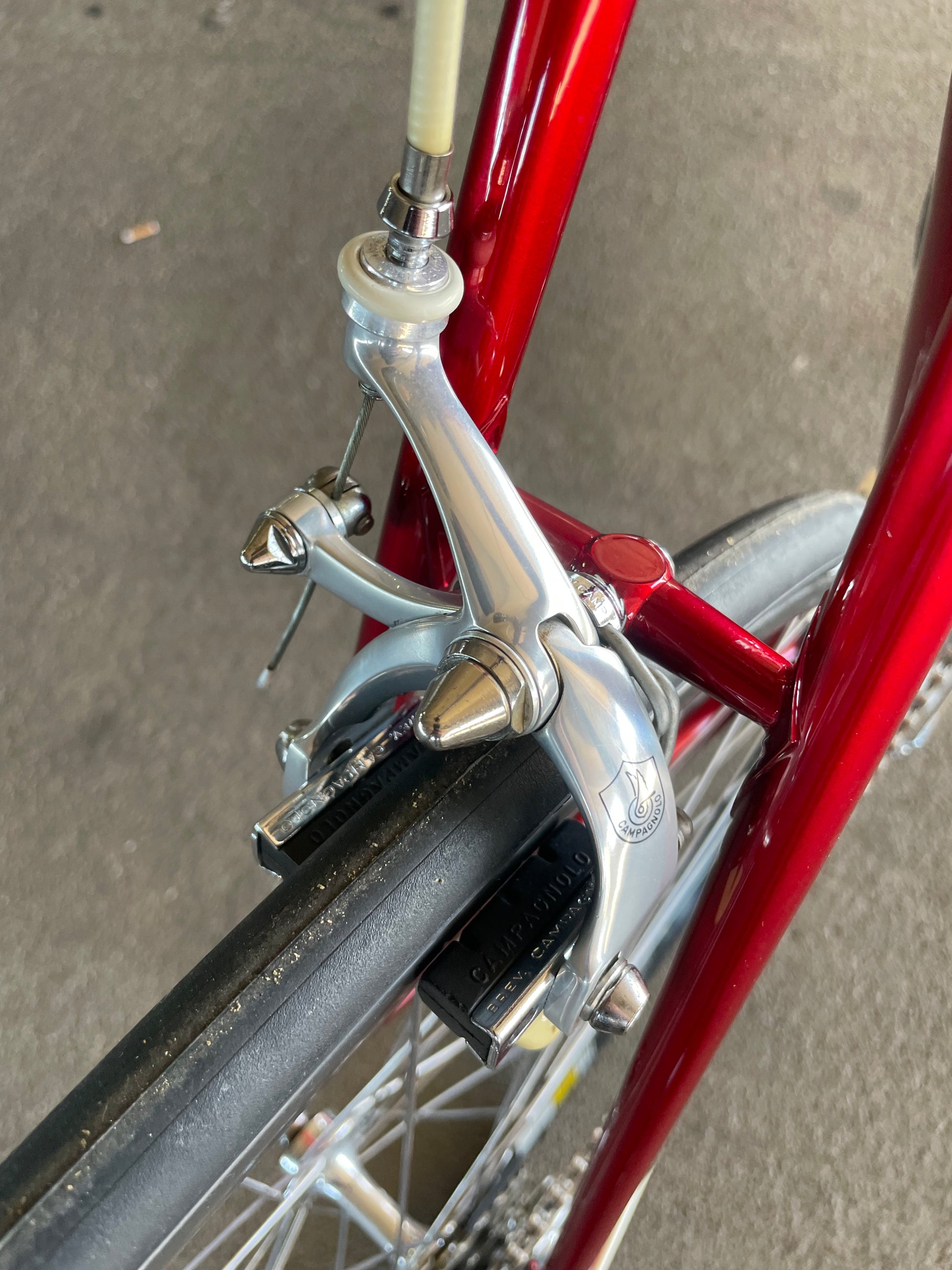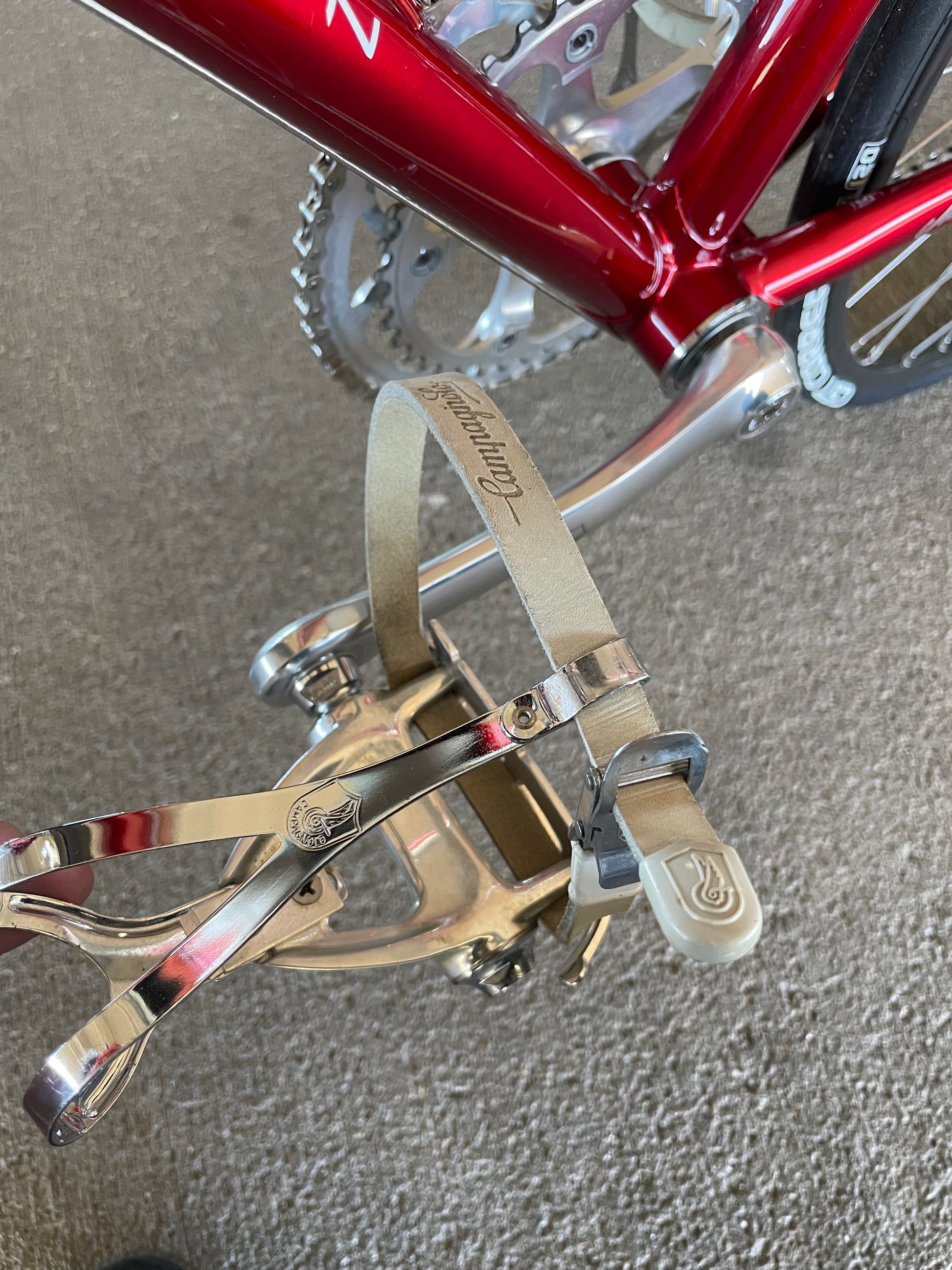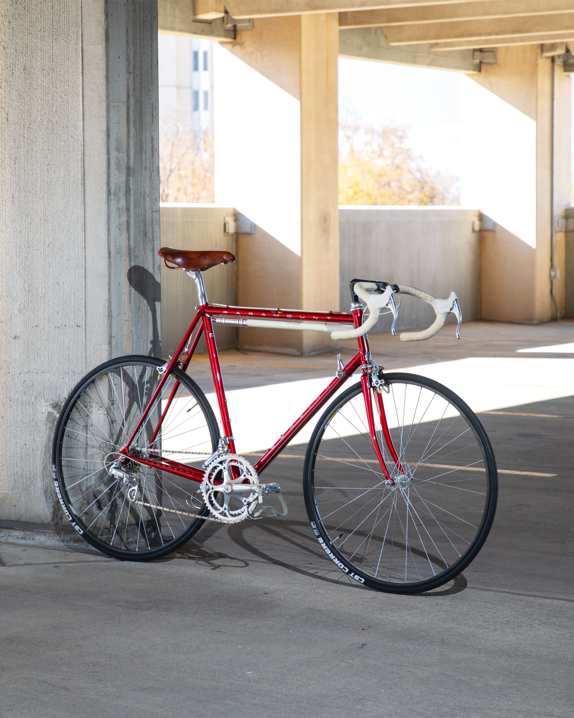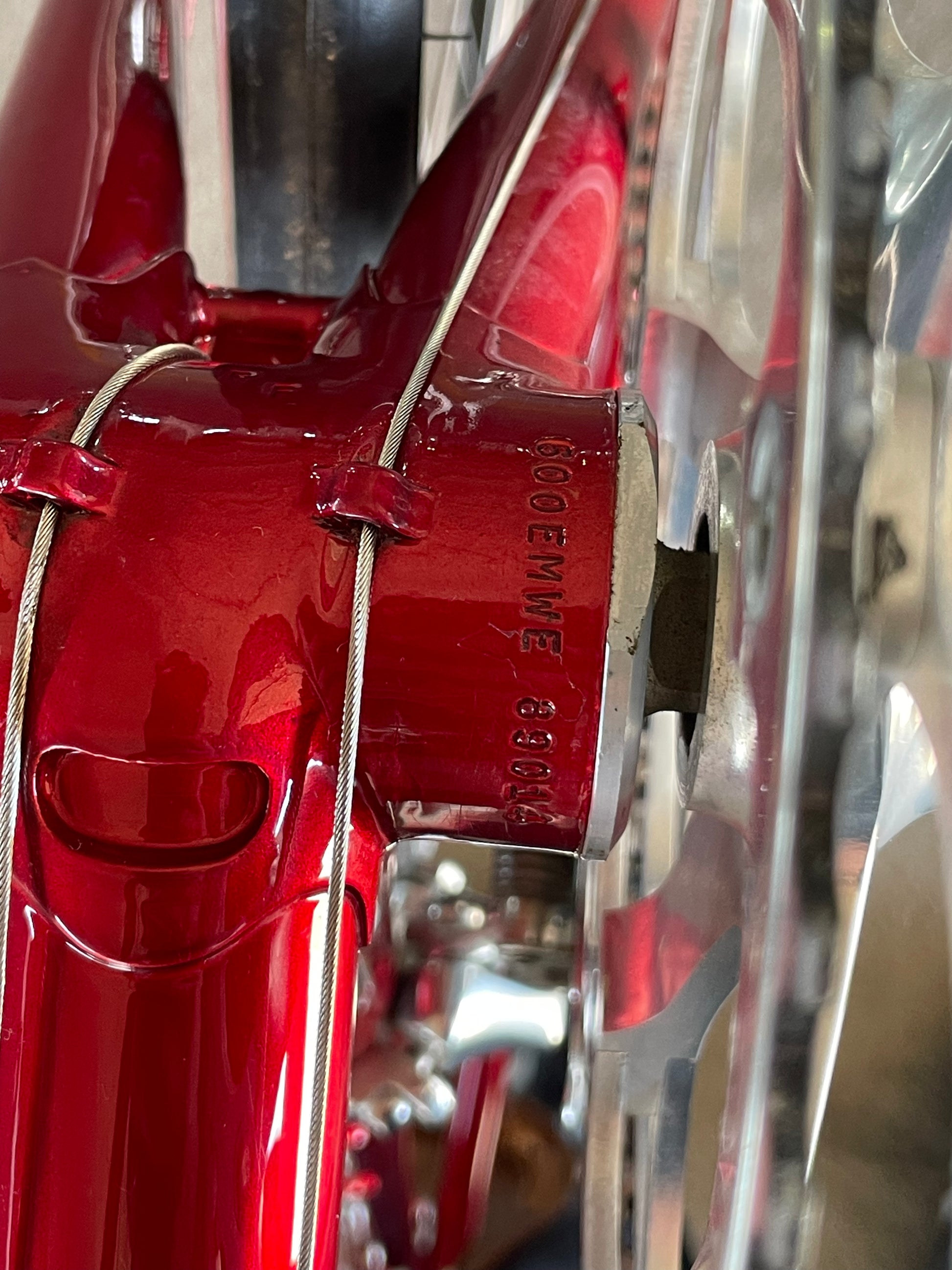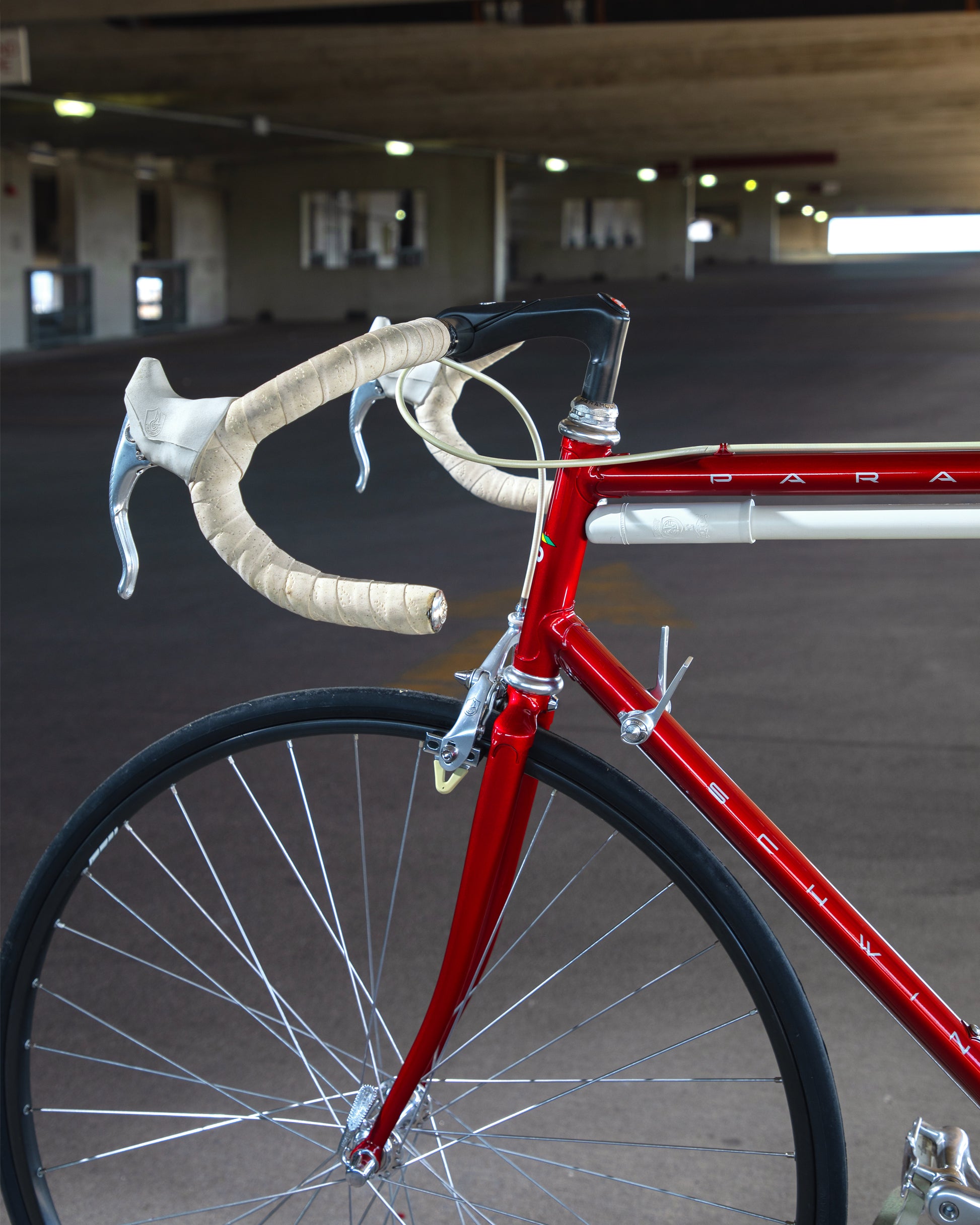 This 1989 Schwinn Paramount is simply stunning. It's in excellent condition! It was probably only ridden a few times and then was hung up in the garage. Everything on the bike is original, even down to the Cinelli bar tape. This bike is very race focused and is incredibly snappy. The deep metallic red is beautiful and contrasts well with the Campagnolo Croce d'Aune groupset. This bike is basically new, but still has some sign of use from being moved around. It has one paint chip on the non drive side chain-stay. In the right light, it also looks like it has two very small impressions in the seat tube, on both the drive and non drive side. It's very hard to see, but when you run you finger down the tube you can feel it. I tried to get good photos of that. This was also made in a time where clipless was becoming popular, so there is some toe overlap while turning with the caged pedals. Oh, and as an added bonus, it comes with some Paramount riding gloves, Paramount bottle cages, and a Paramount computer (tuns on but the screen is pixelated). Apart from that, it looks like this bike just rolled out of the Waterford factory in 1989!