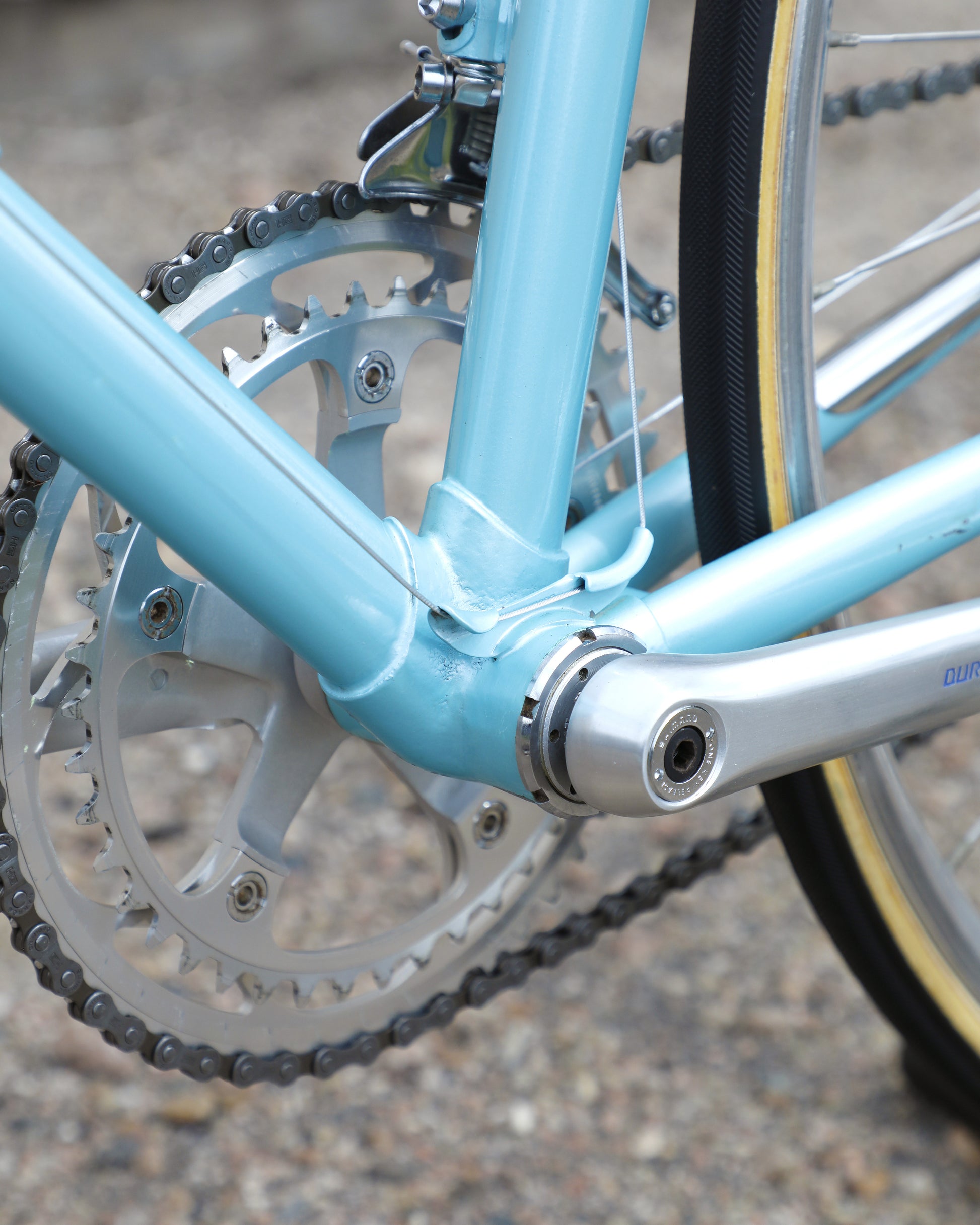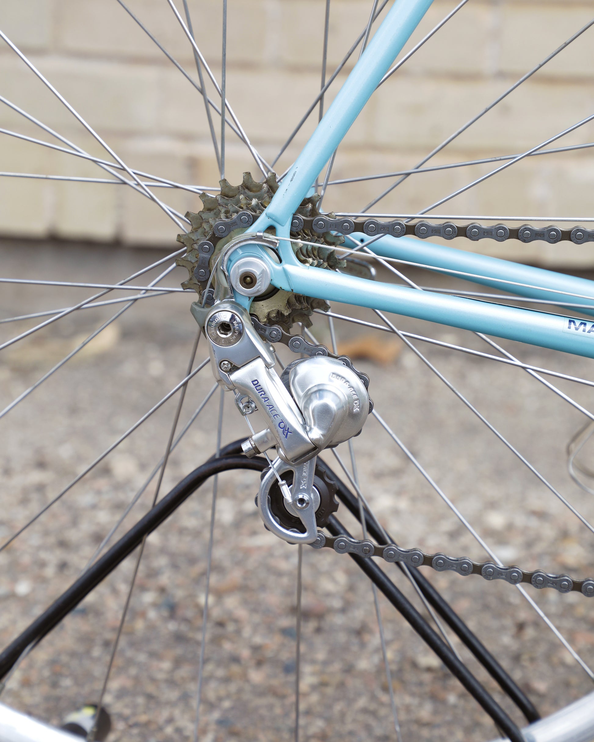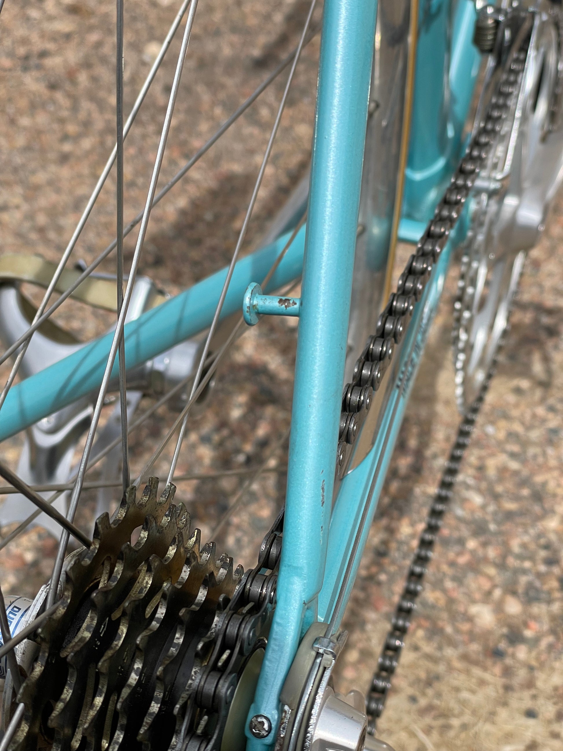 This bike is equipped with a Shimano Dura-Ace 7300 AX group that has been fully refurbished. It's a fast and well tuned in groupset. The frame is in good condition but shows sign of use. There are some marks on the crank side chain/seat stays towards the bottom. The decals show there age but no peeling or fading. There is also a small scuff in the paint on the top of the top tube. No dents, bends, or cracks anywhere in the frame.