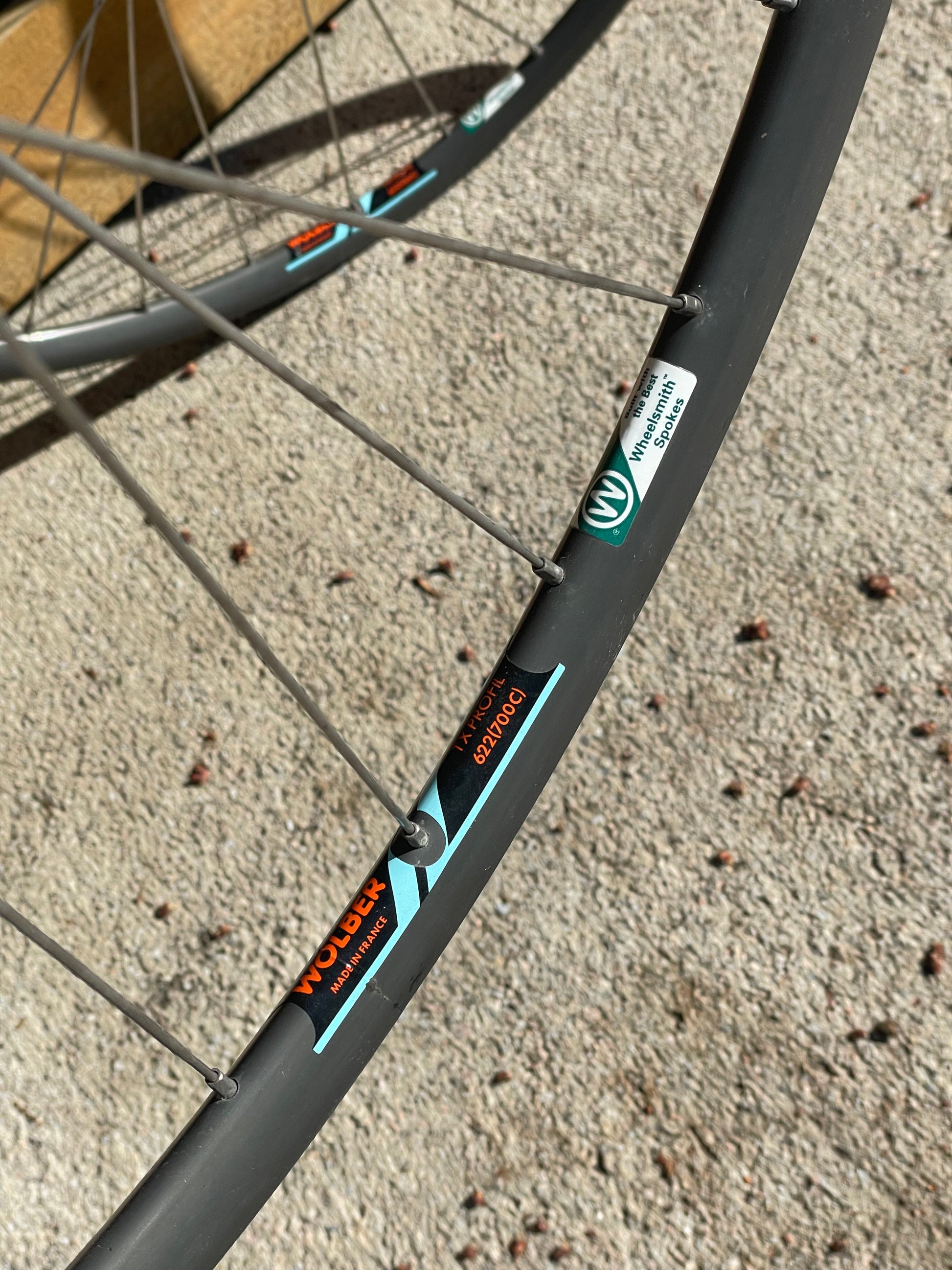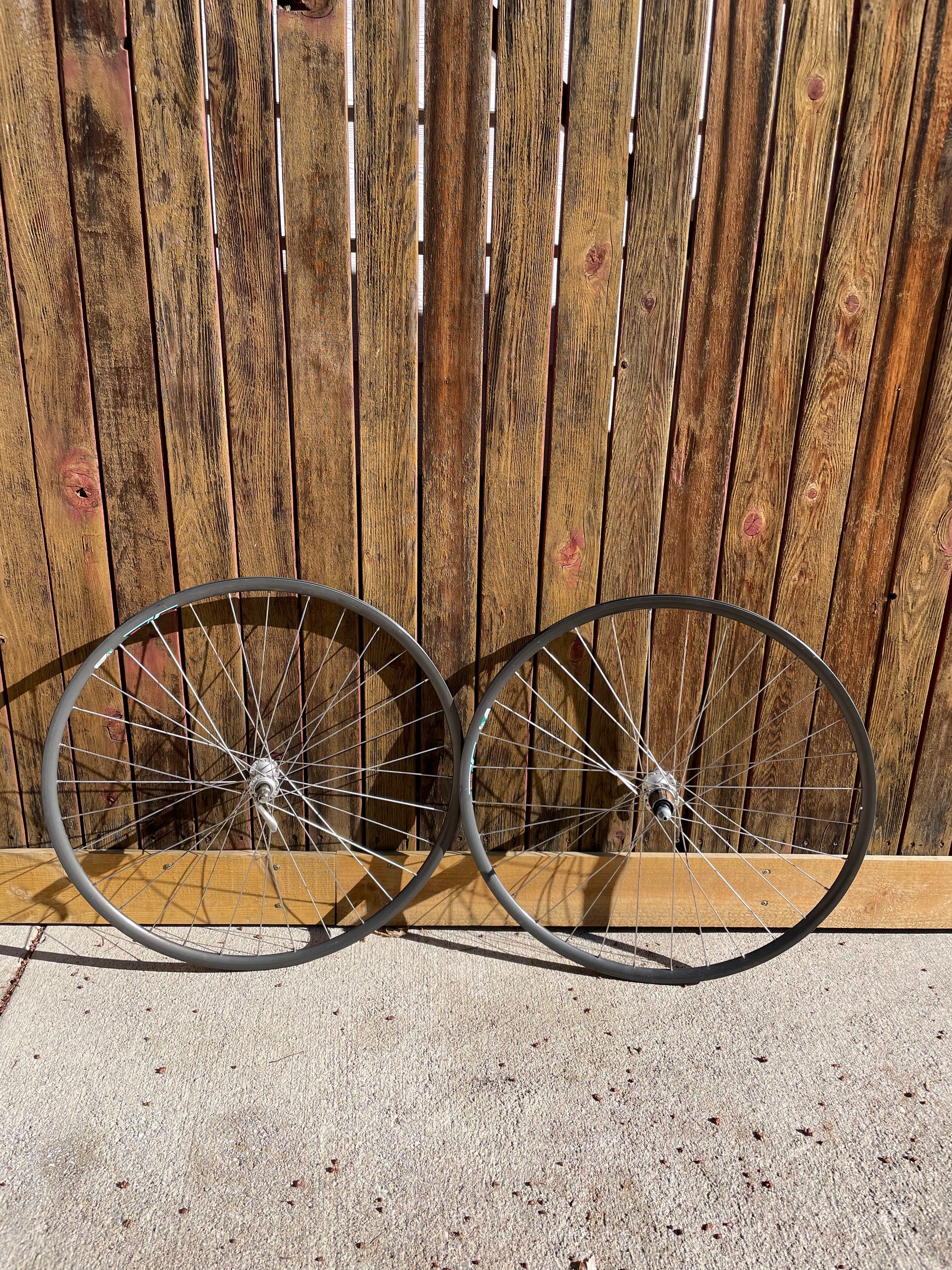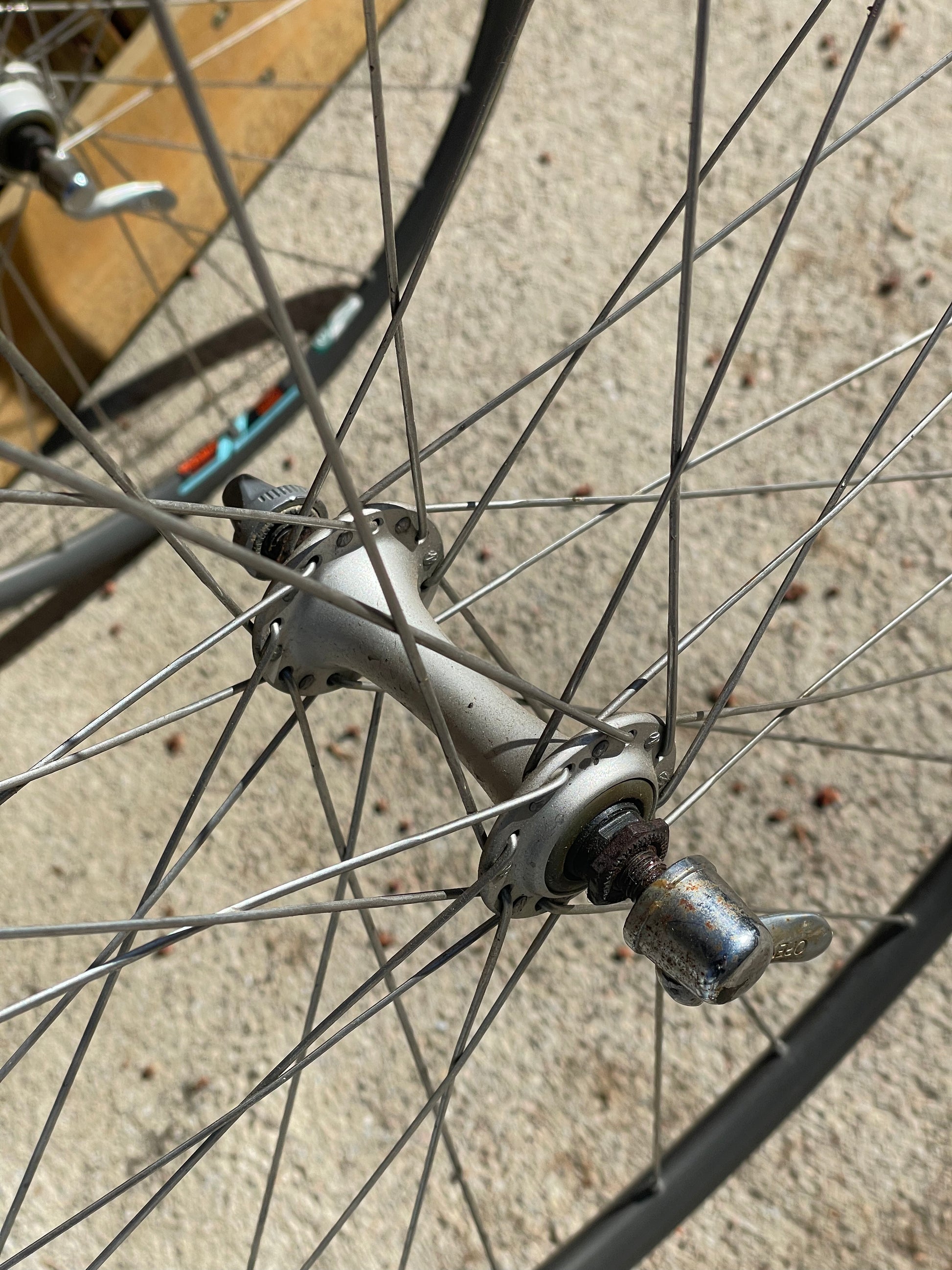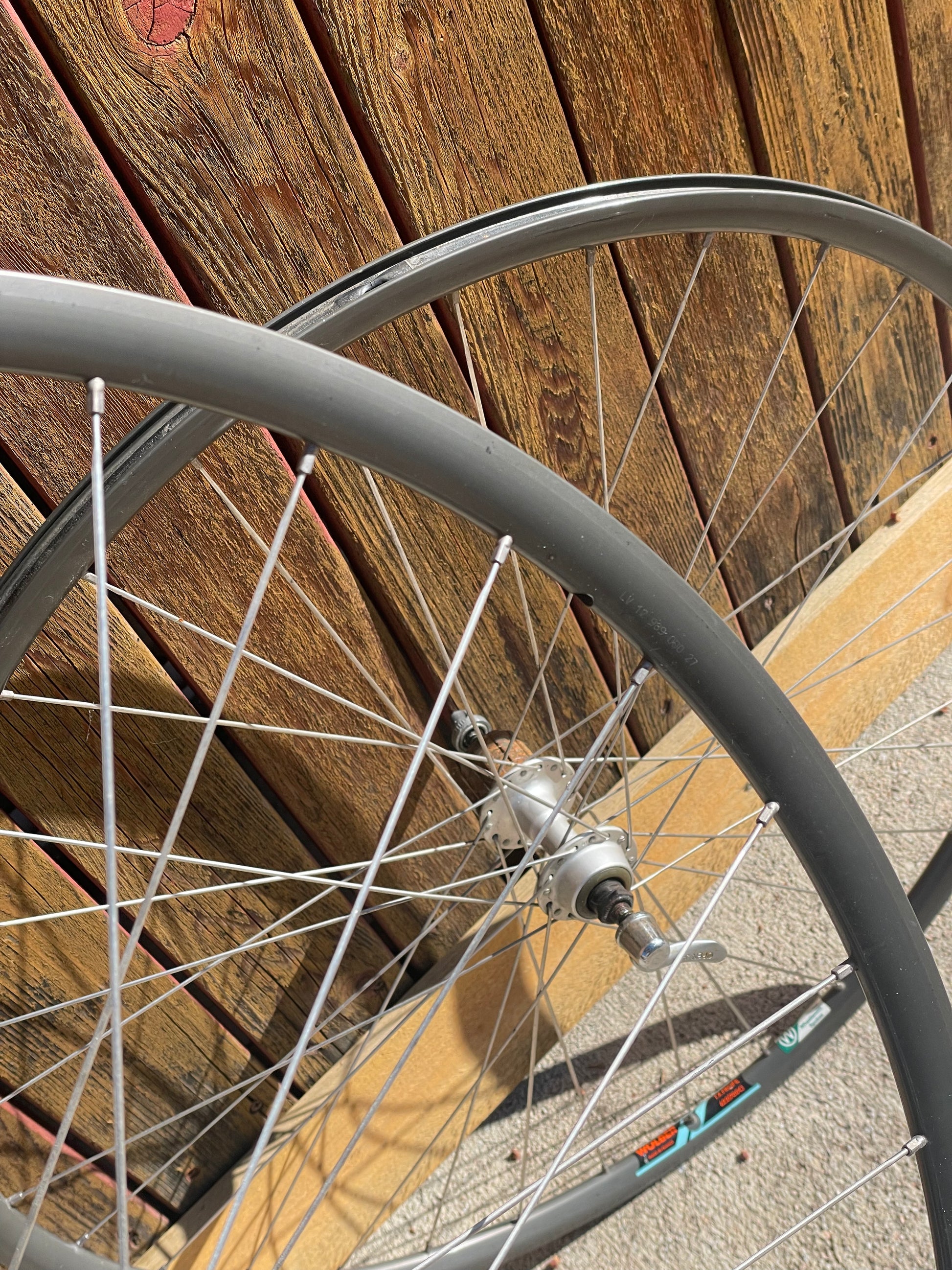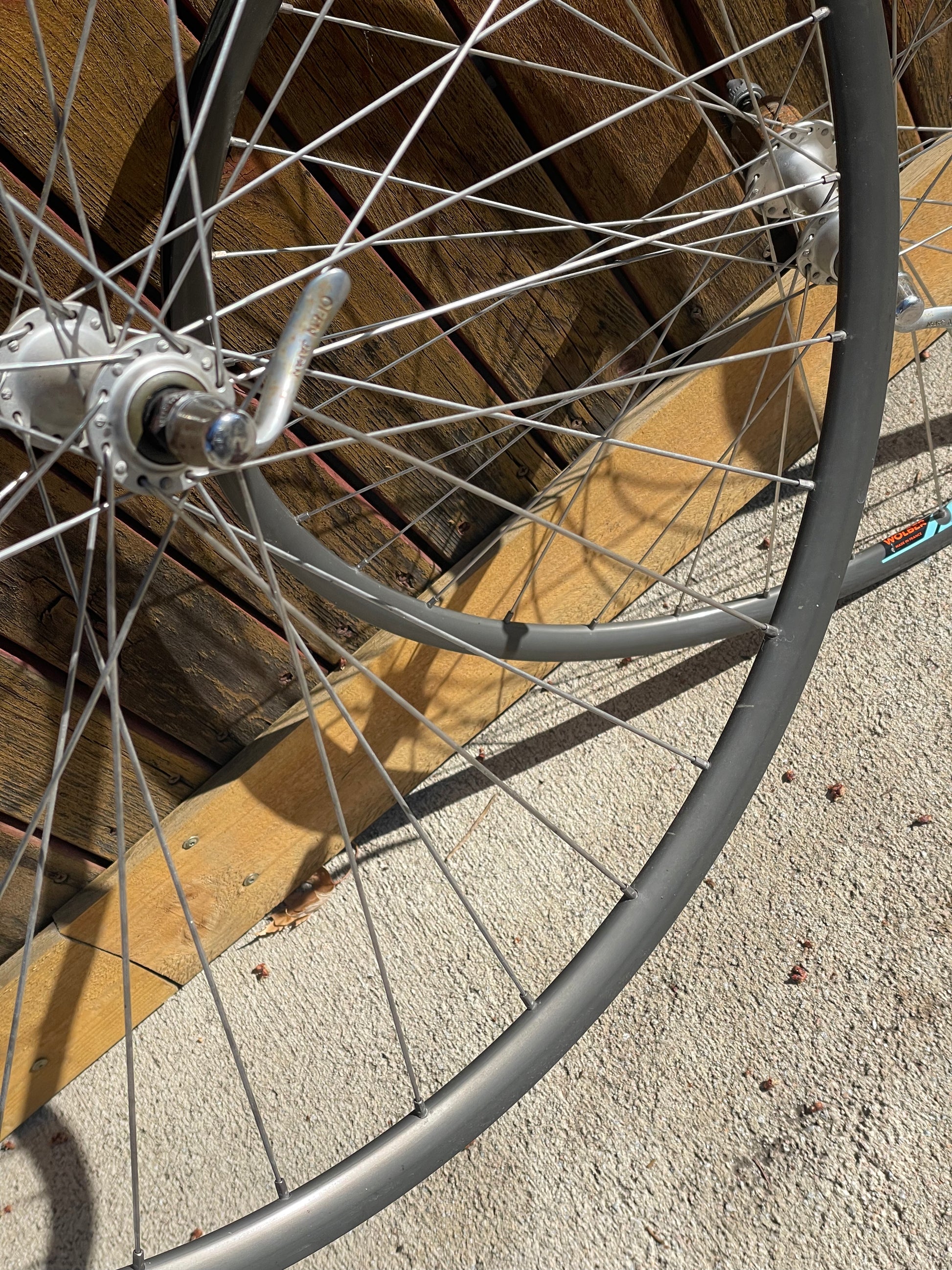 The Araya Aero wheels show sign of use. There are some small inward and outward facing dents in both the front and rear wheel. This is why I'm including a set of Wolber/Shimano 105 7spd wheels so that one can display the bike with the stock Araya wheels laced to the AX hubs and then when it's time to go for a ride, they can swap the Wolbers on and enjoy the bike! The tires have not been glued on to the Araya rims. The hubs also feel sticky, especially the rear.