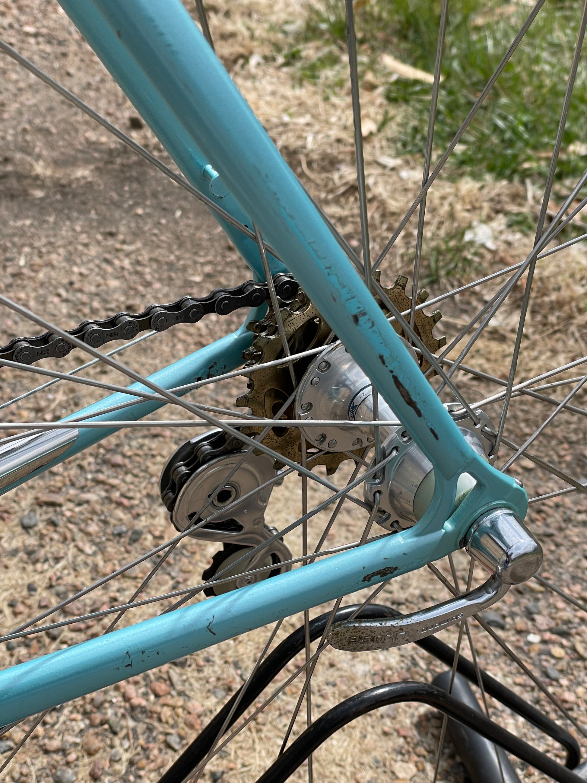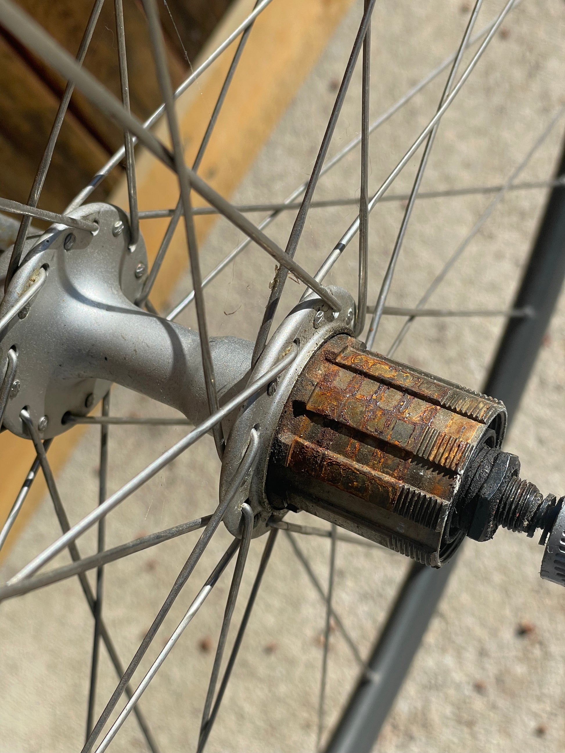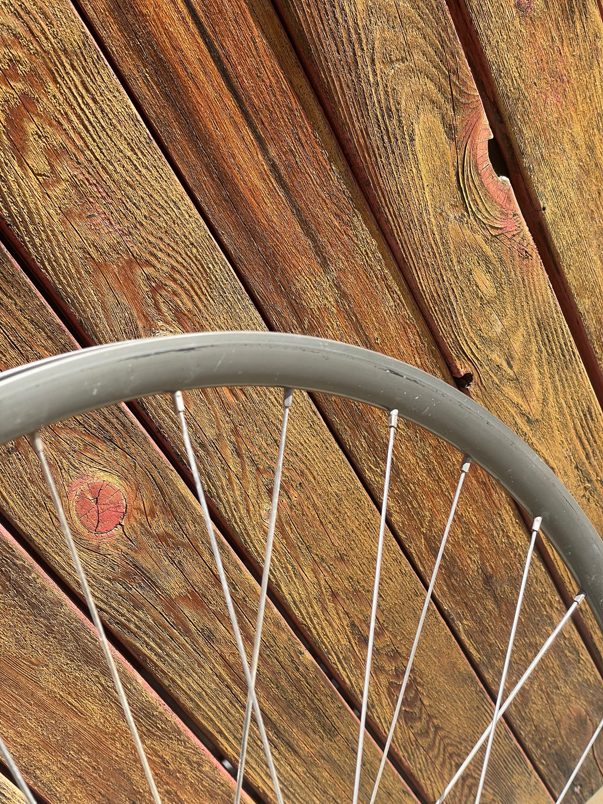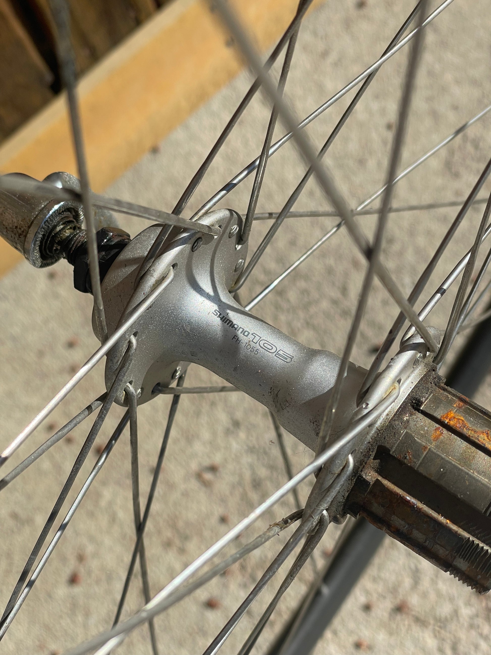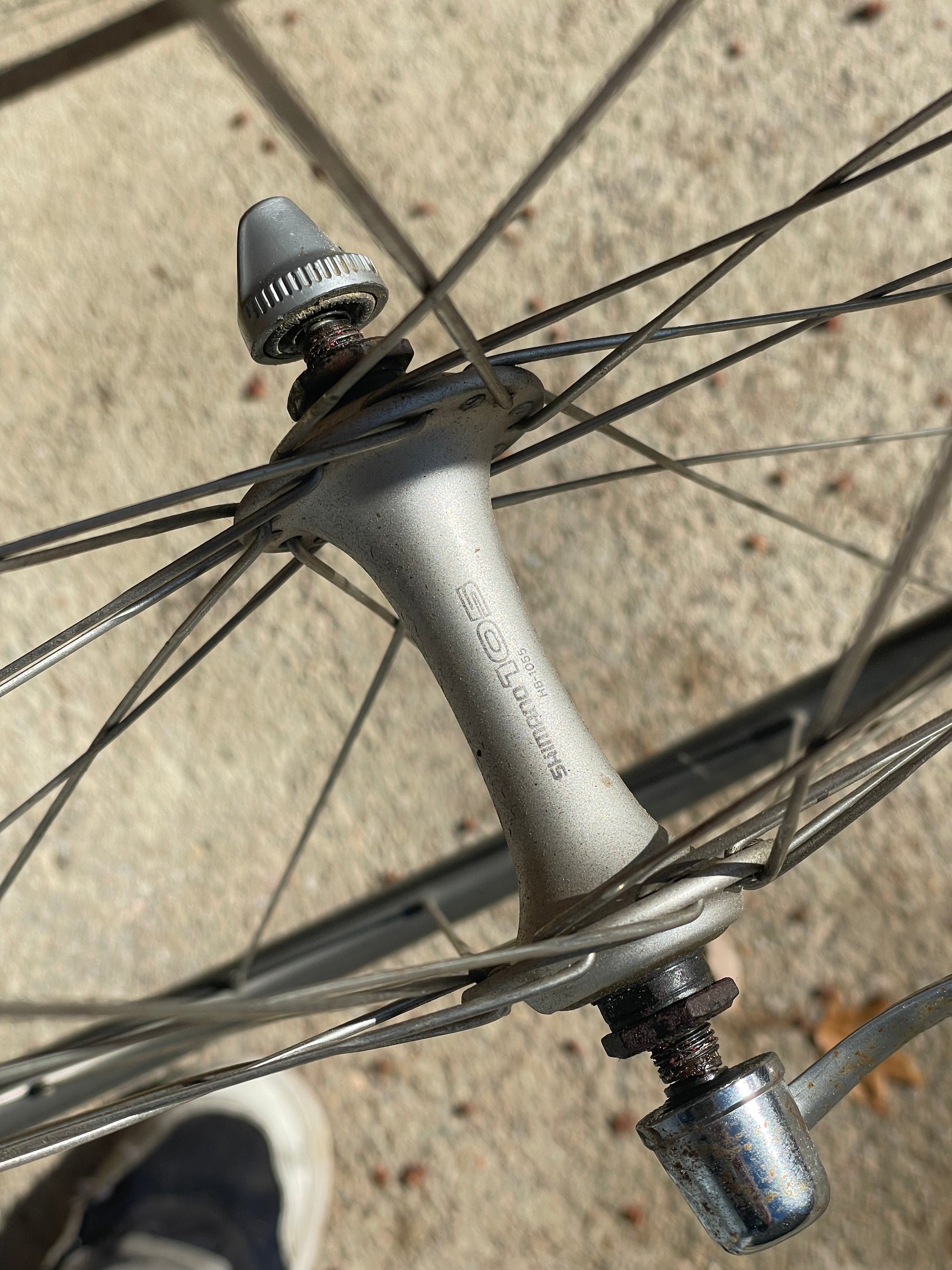 The Araya Aero wheels show sign of use. There are some small inward and outward facing dents in both the front and rear wheel. This is why I'm including a set of Wolber/Shimano 105 7spd wheels so that one can display the bike with the stock Araya wheels laced to the AX hubs and then when it's time to go for a ride, they can swap the Wolbers on and enjoy the bike! The tires have not been glued on to the Araya rims. The hubs also feel sticky, especially the rear.