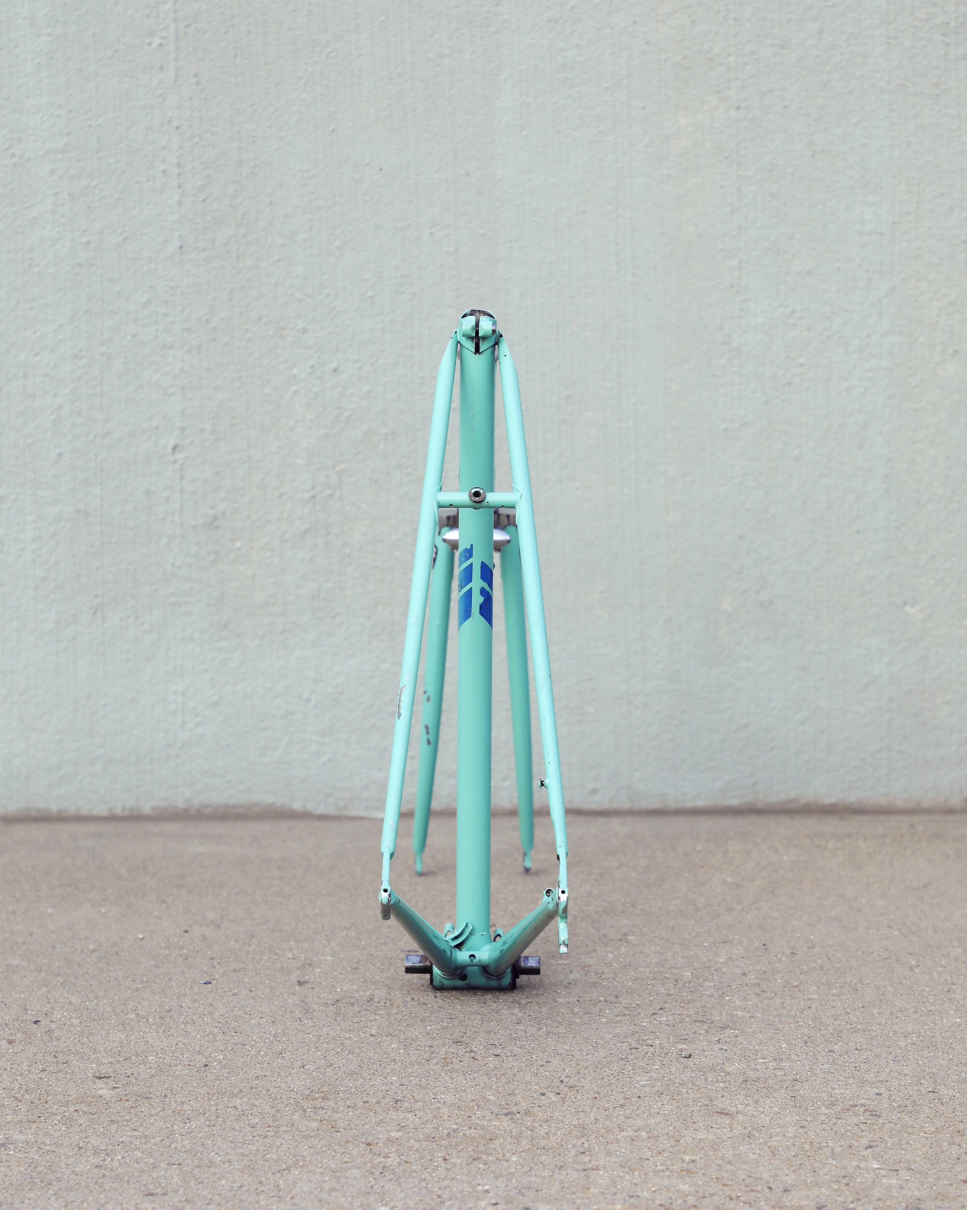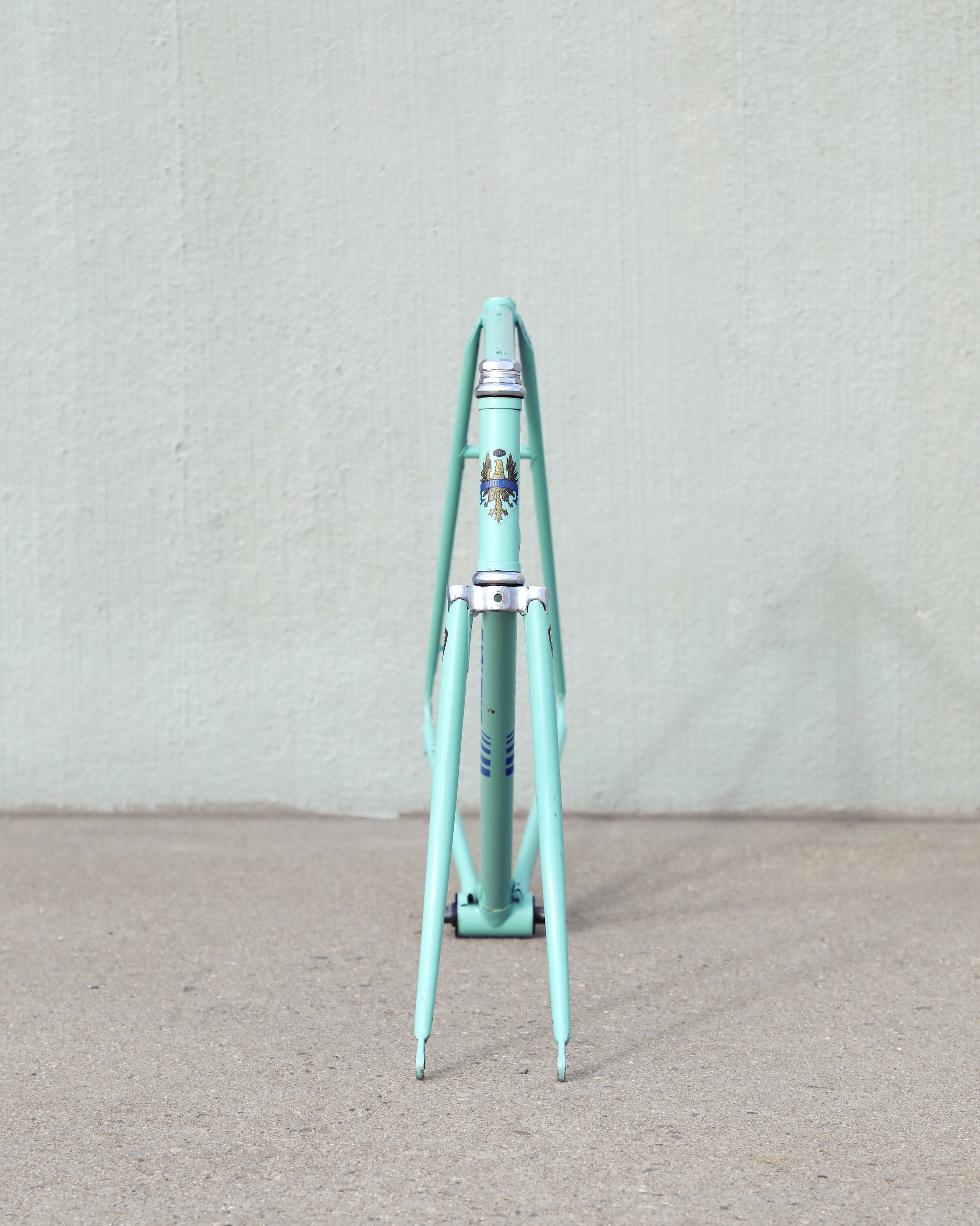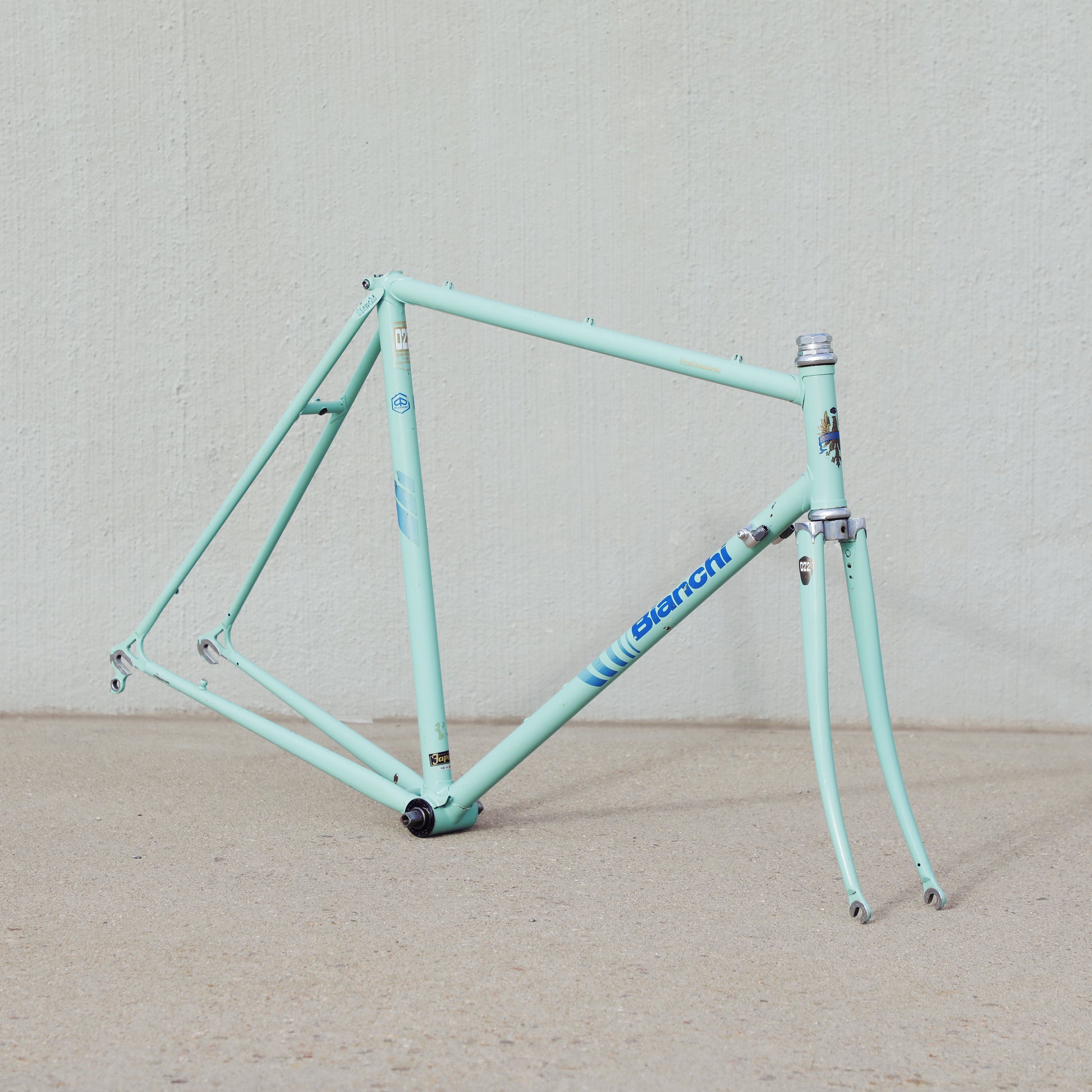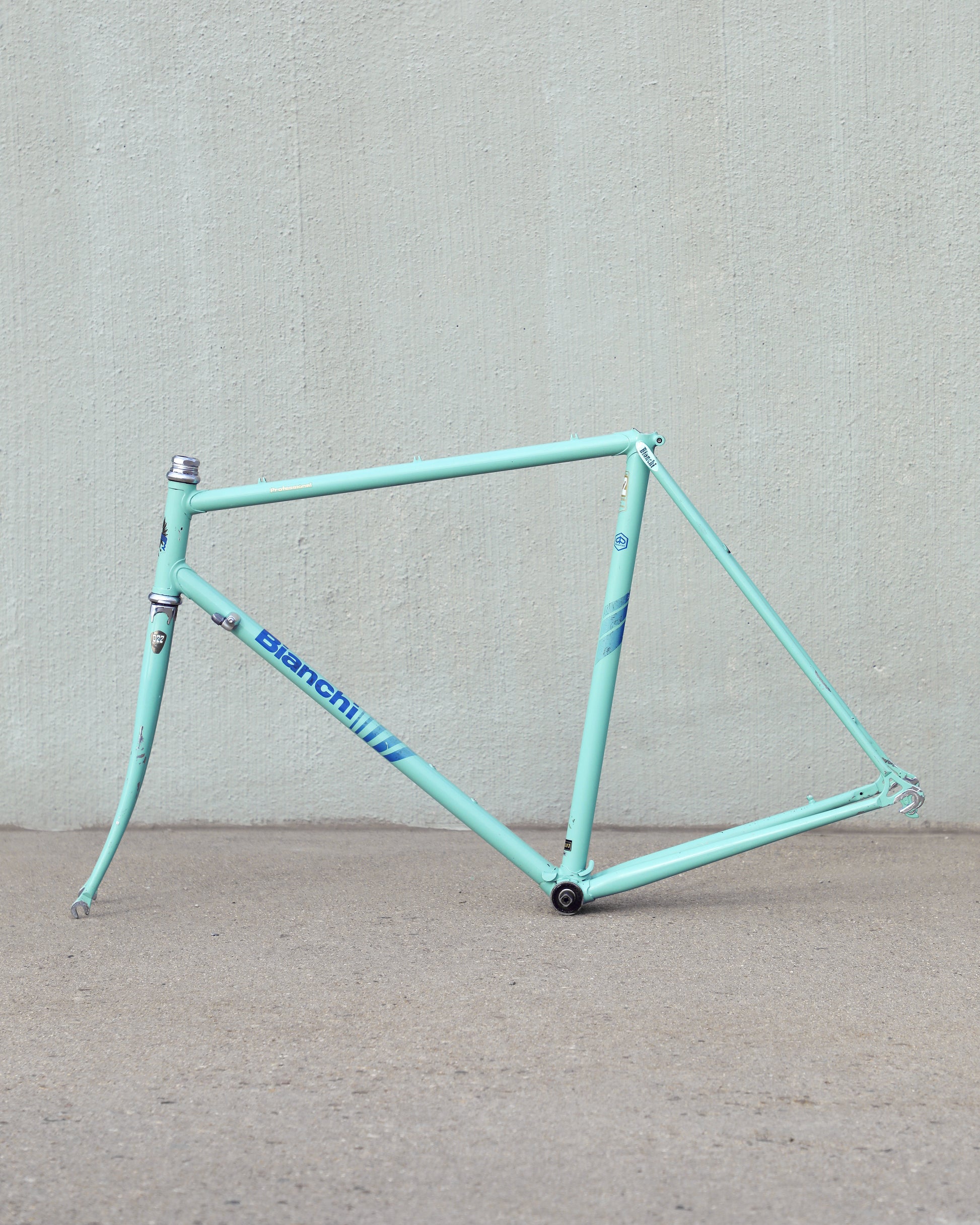 This vintage Bianchi Professional frameset is in good condition but shows sign of use. The Professional was second in line to the Specialissima and came in two different colors - Celeste and Amethyst - this one being finished in Celeste. The frame is made with 022 Ishiwata double butted tubes. Many high end steel bikes at the time were made with Ishiwata tubing, including the RB series from Bridgestone. This frame was also made in Japan so it's no wonder they decided to construct them out of Ishiwata tubes. It's a great looking frame and will surely turn heads on the road!
