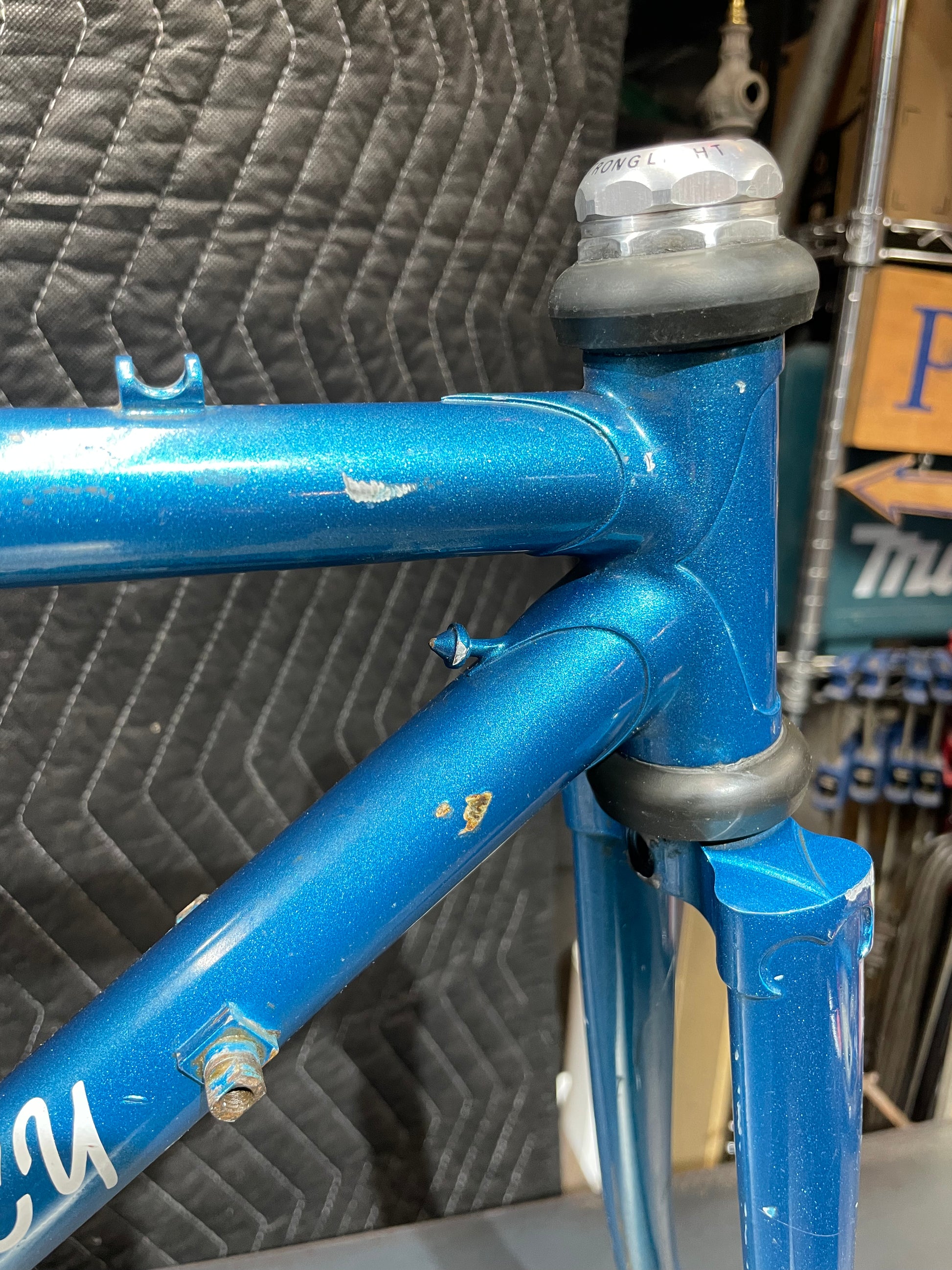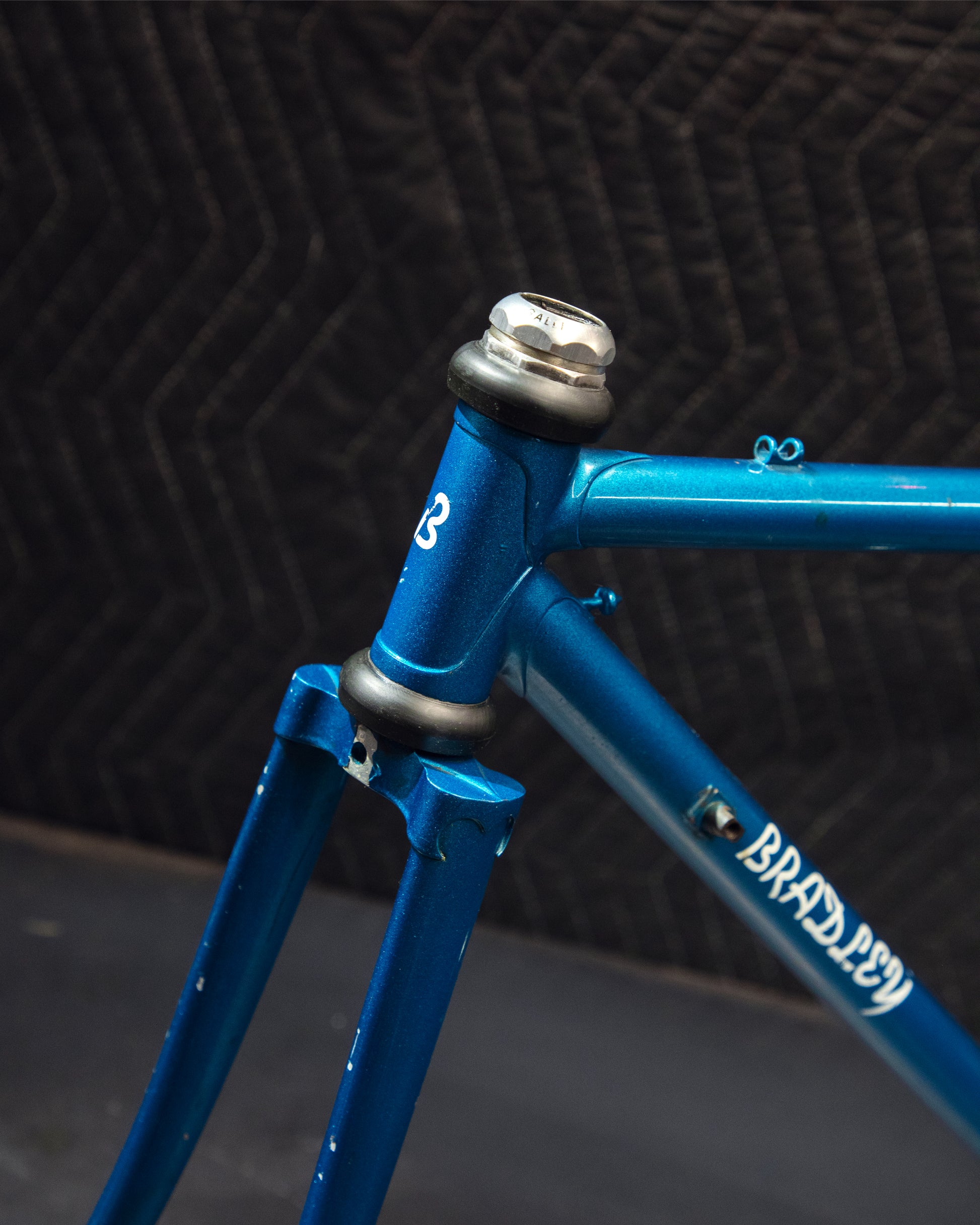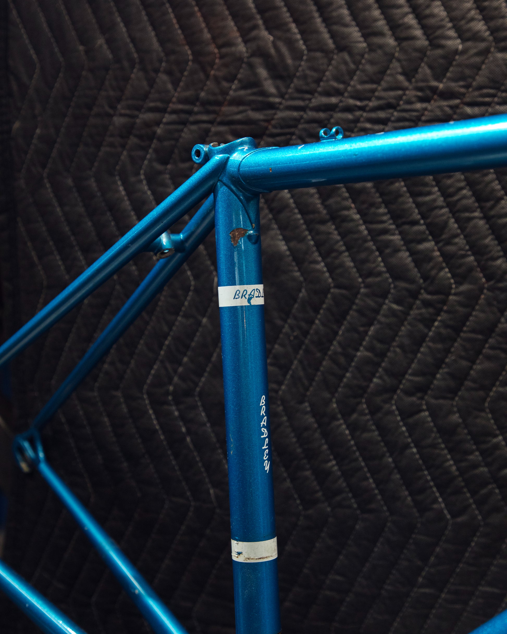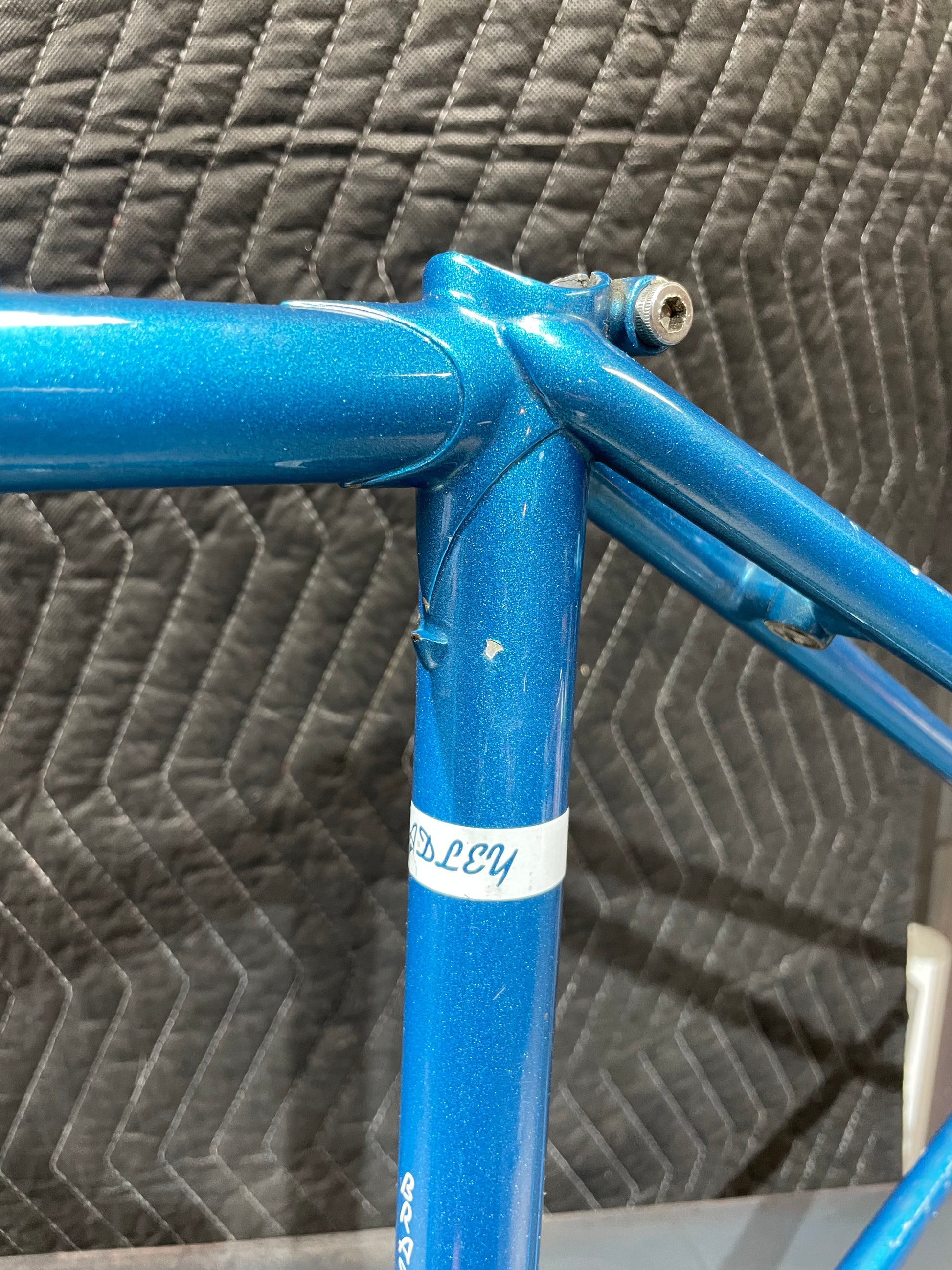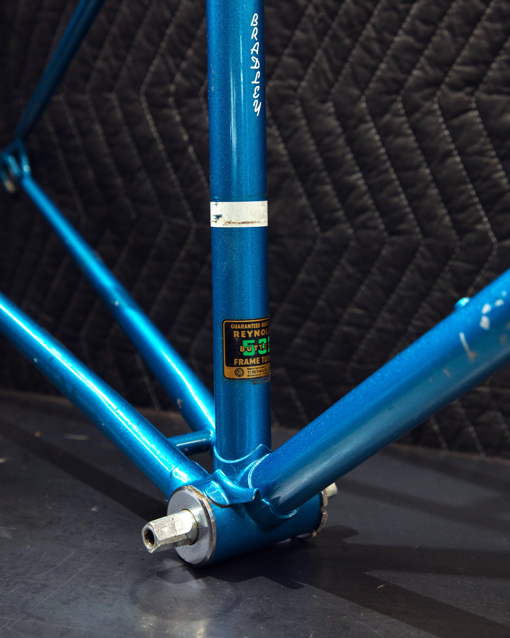 Not much could be found online about this Bradley frame. It's made with Reynolds 531 and had mostly Stronglight components. Gipiemme dropouts with overall great lines and overall craftsmanship. Comes with Stronglight headset and bottom bracket - both could use some fresh grease! No dents, bends, or cracks. Has a a decent amount of paint chips.