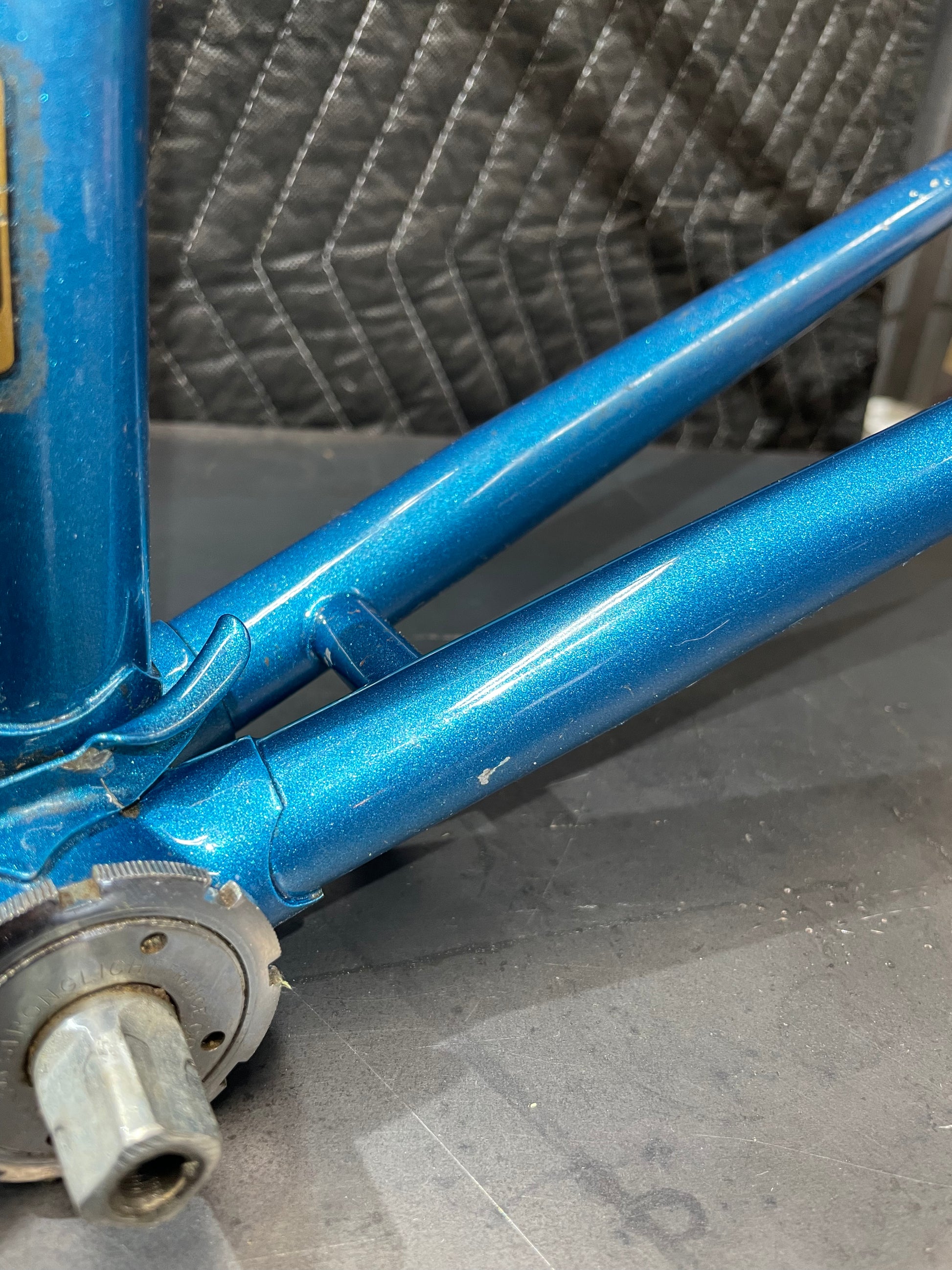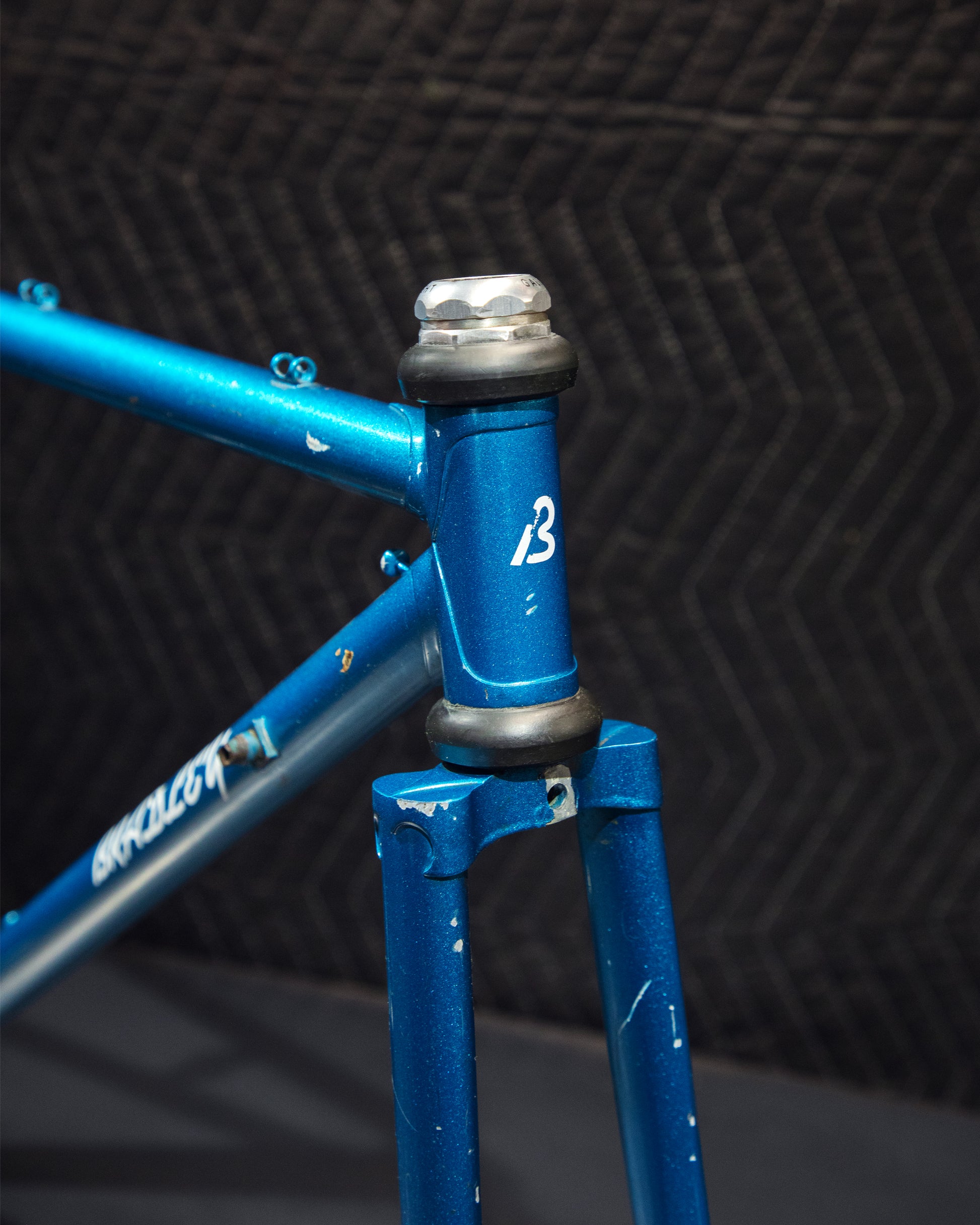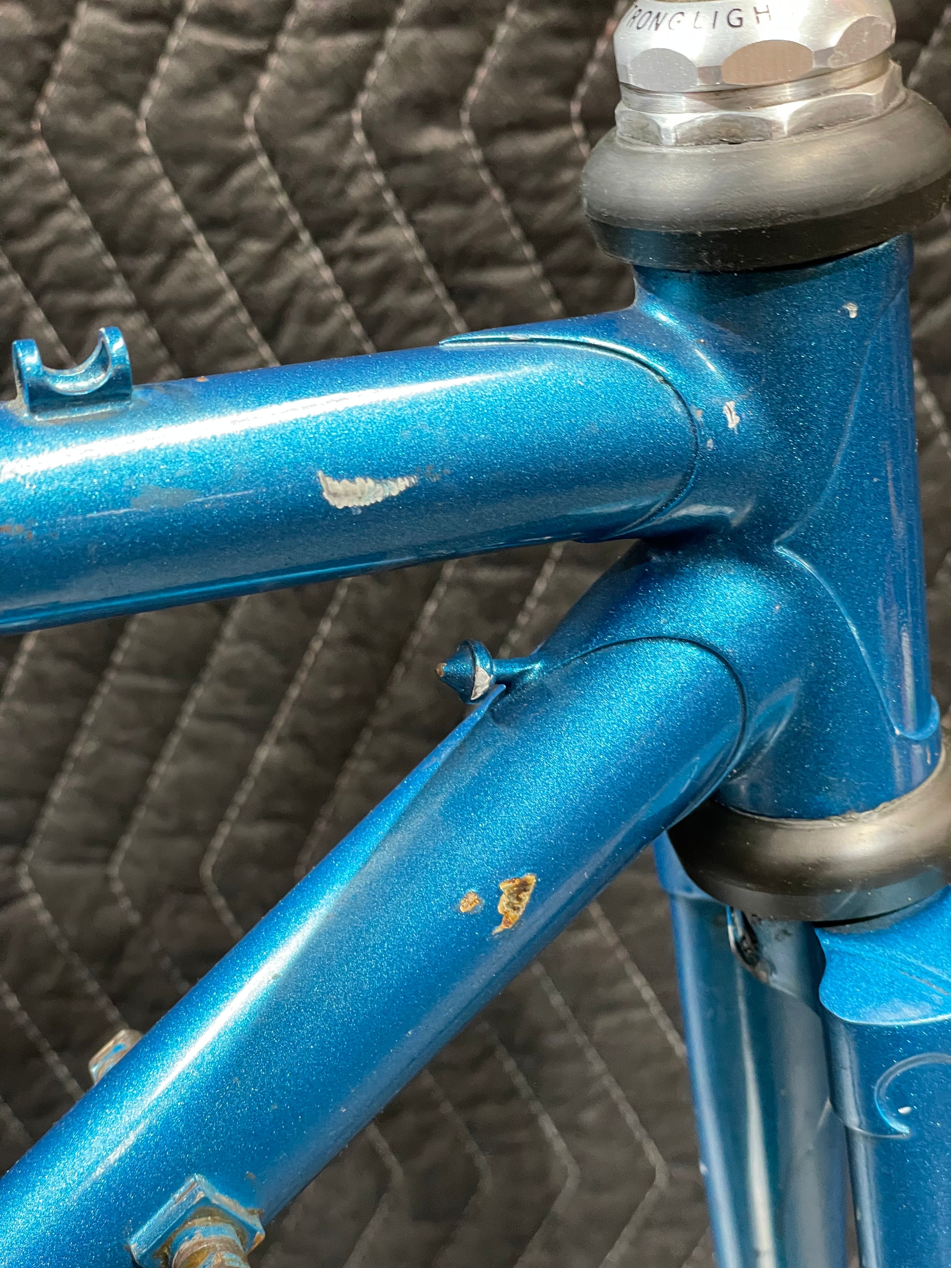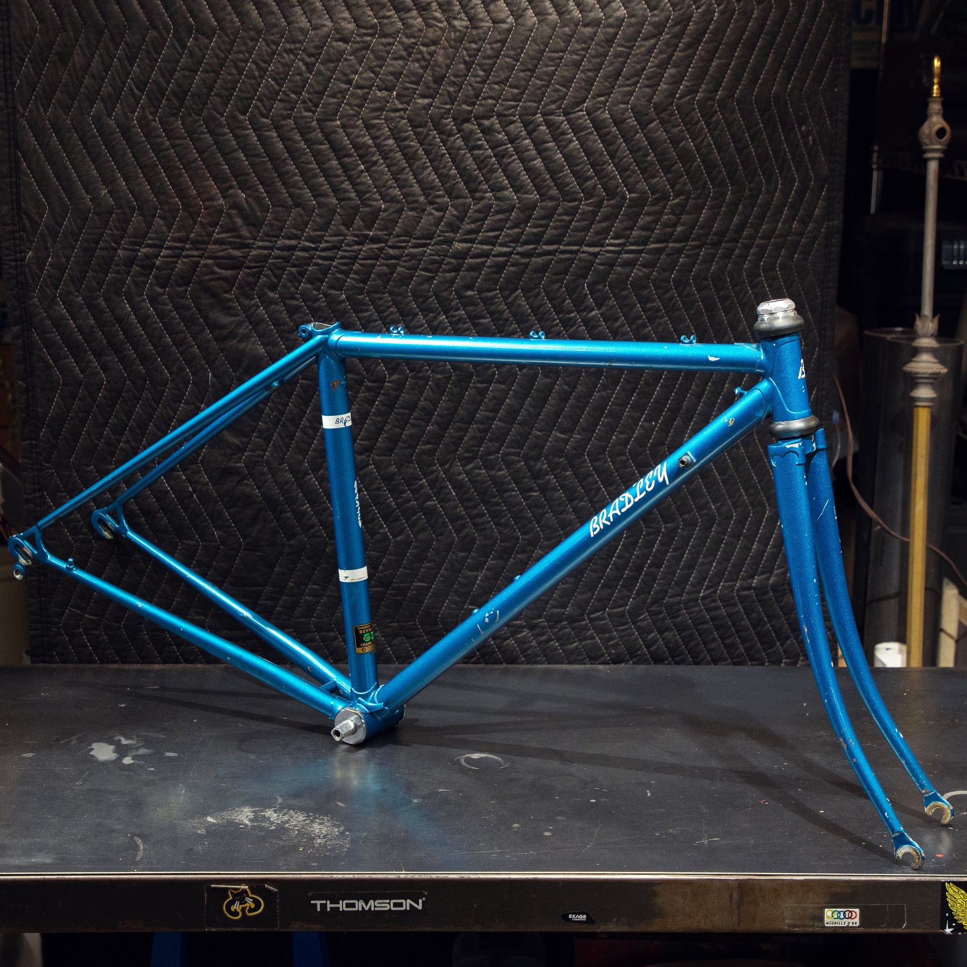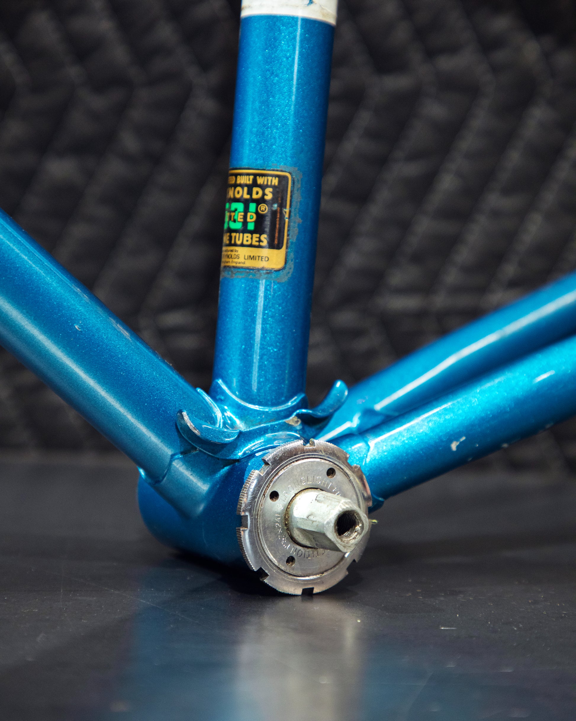Not much could be found online about this Bradley frame. It's made with Reynolds 531 and had mostly Stronglight components. Gipiemme dropouts with overall great lines and overall craftsmanship. Comes with Stronglight headset and bottom bracket - both could use some fresh grease! No dents, bends, or cracks. Has a a decent amount of paint chips.