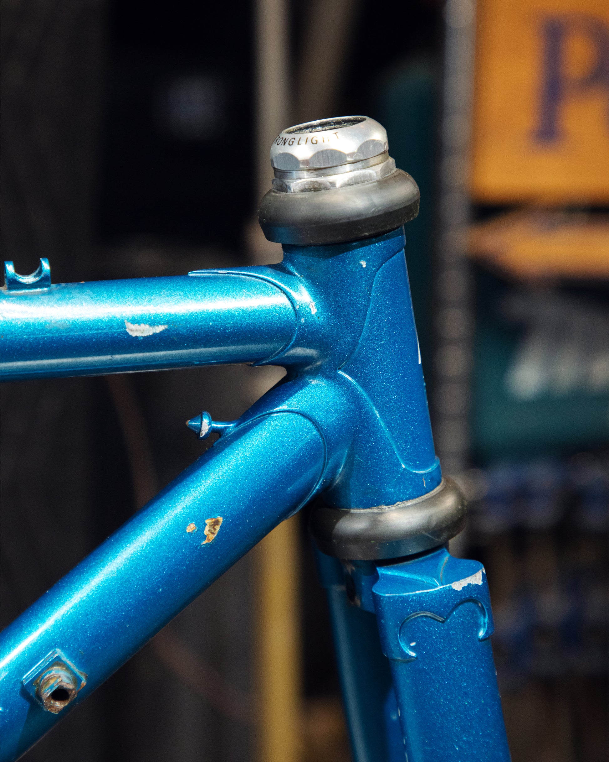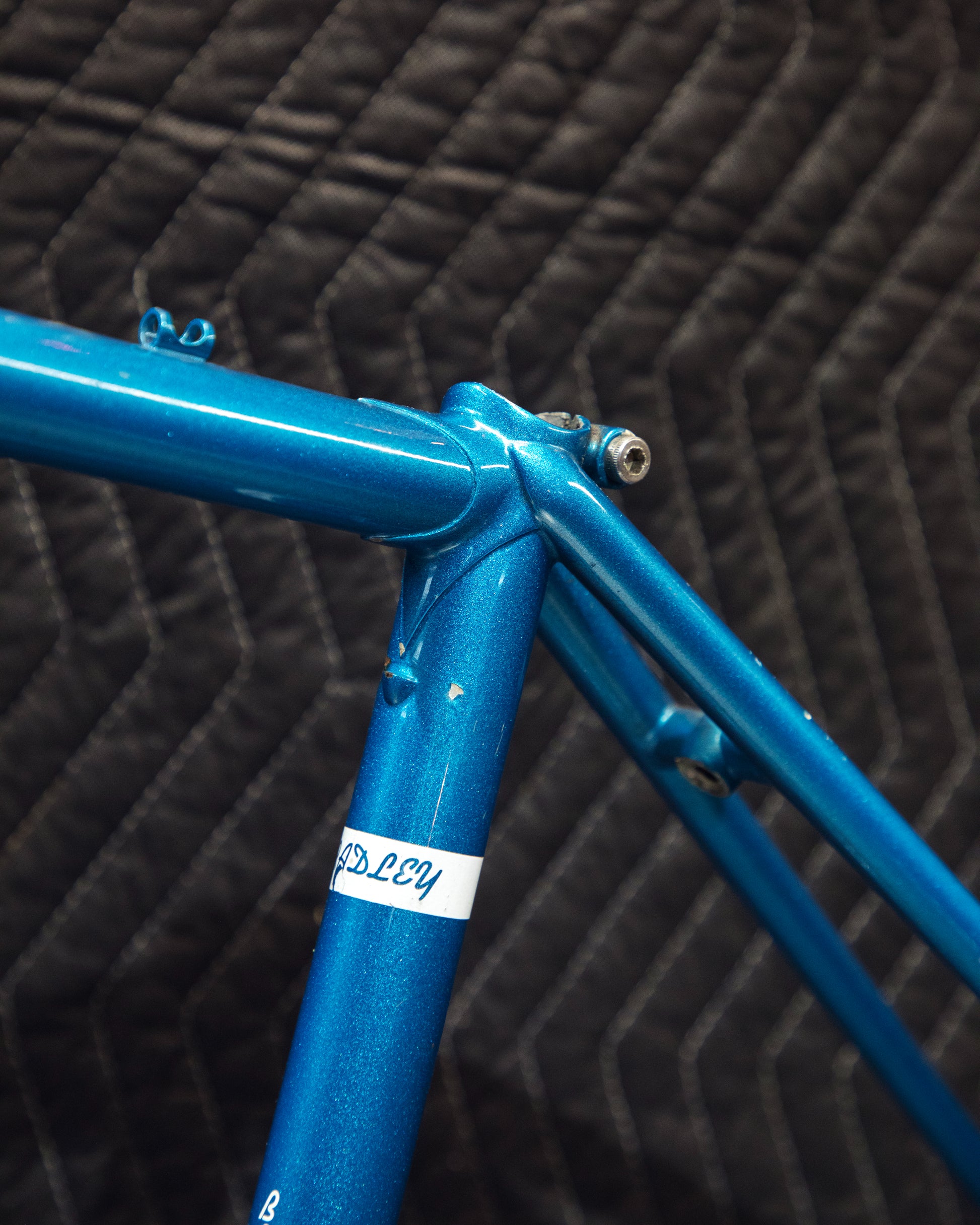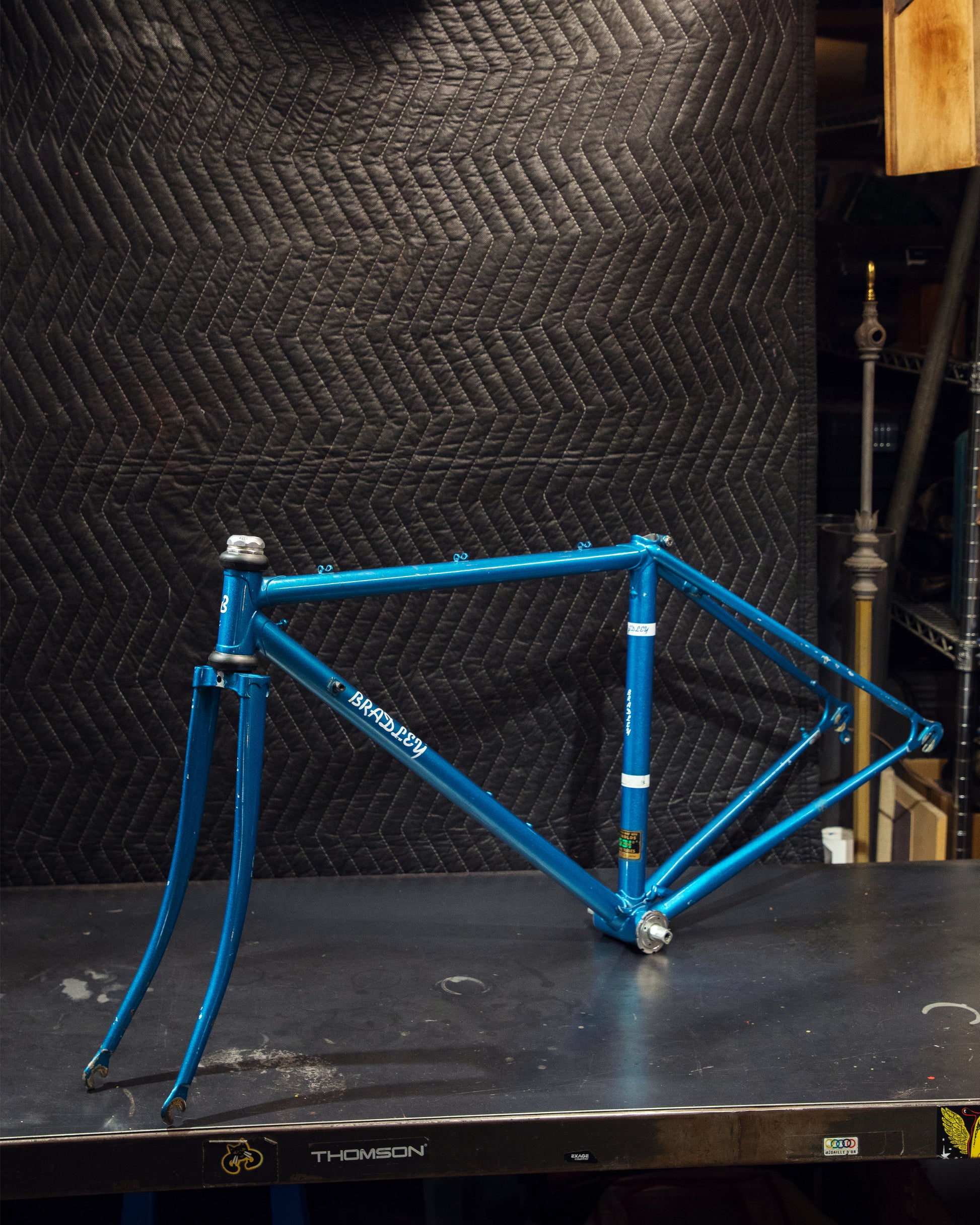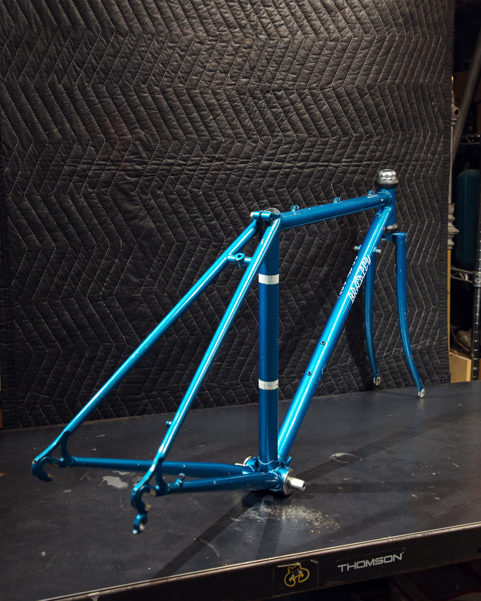 Not much could be found online about this Bradley frame. It's made with Reynolds 531 and had mostly Stronglight components. Gipiemme dropouts with overall great lines and overall craftsmanship. Comes with Stronglight headset and bottom bracket - both could use some fresh grease! No dents, bends, or cracks. Has a a decent amount of paint chips.