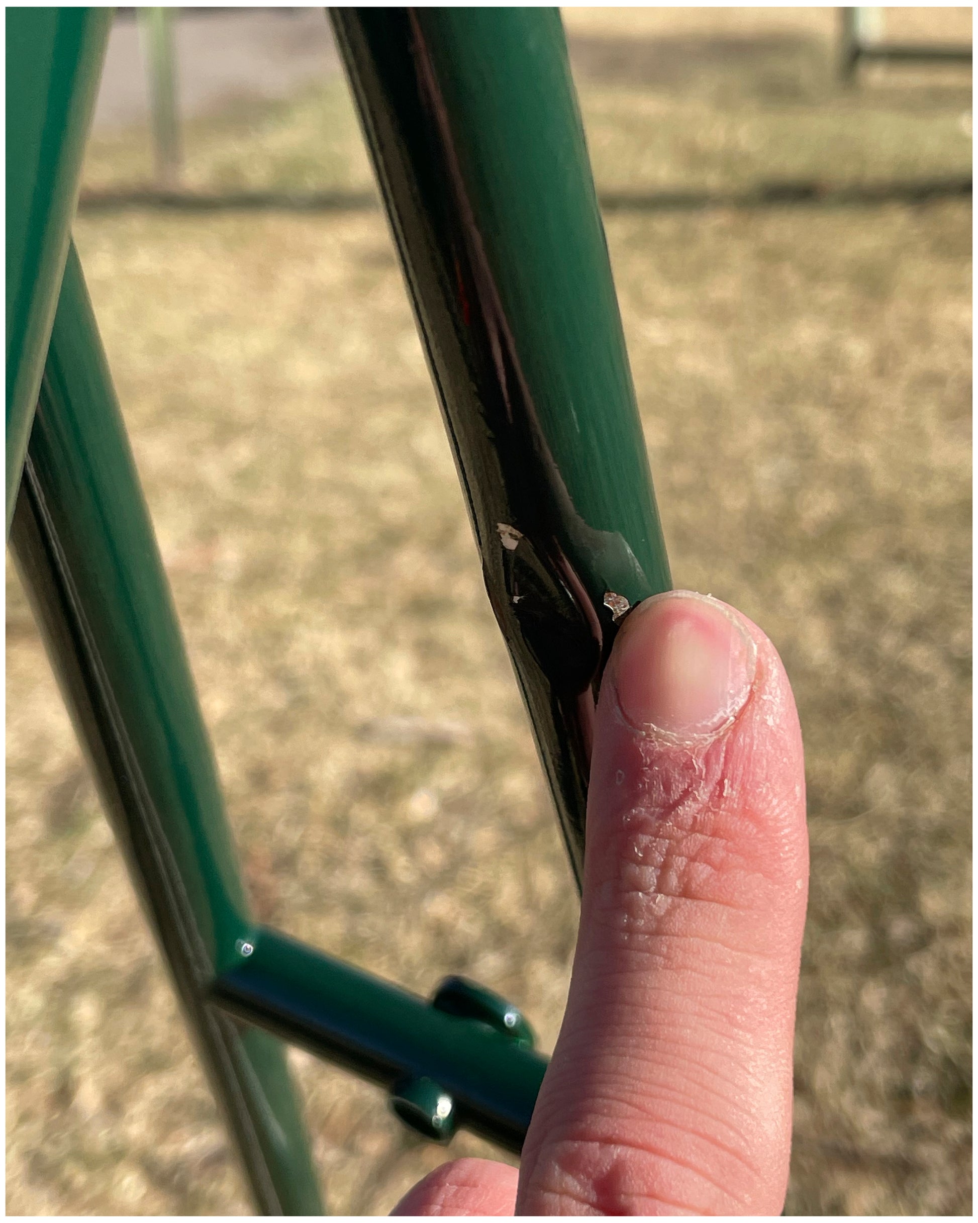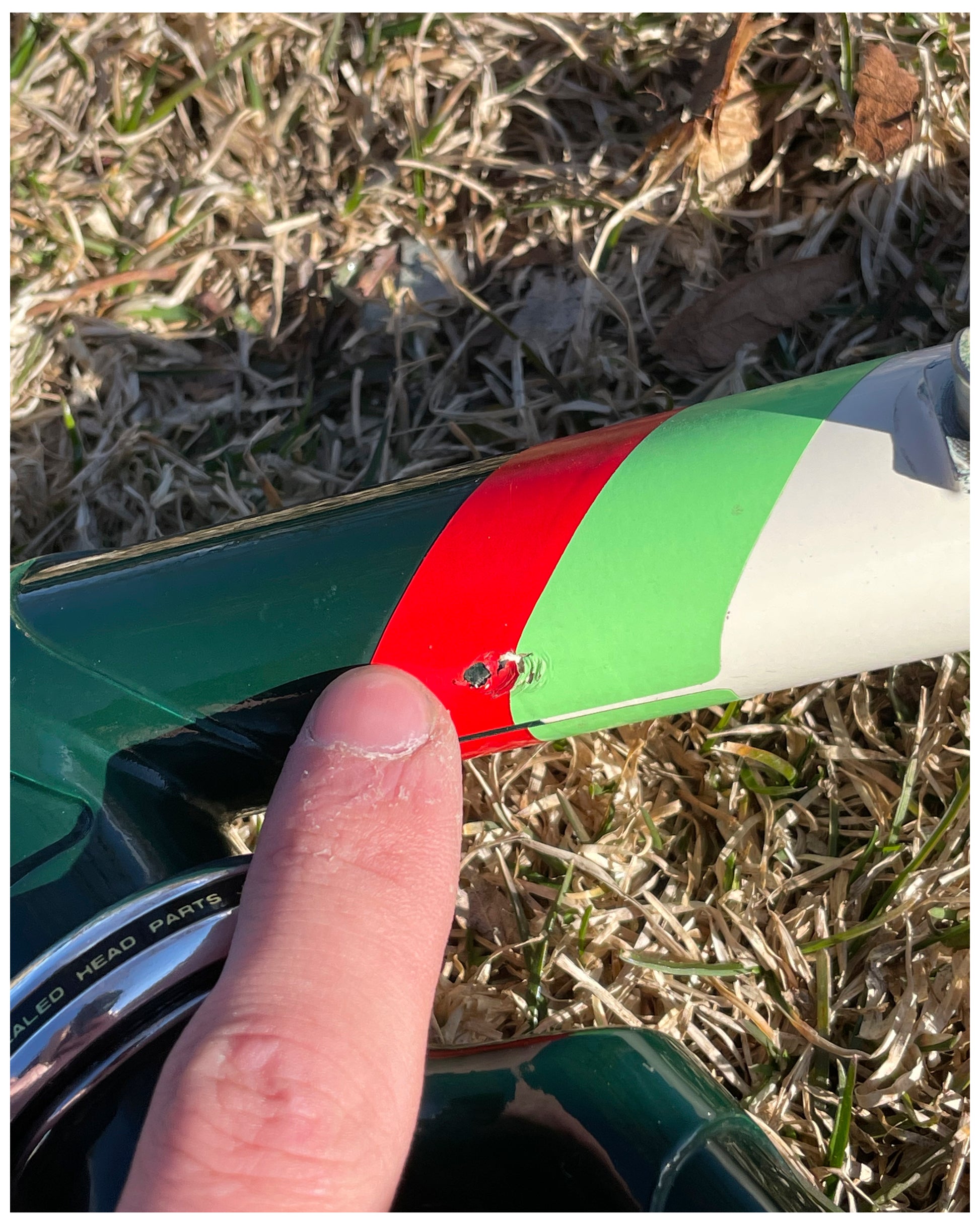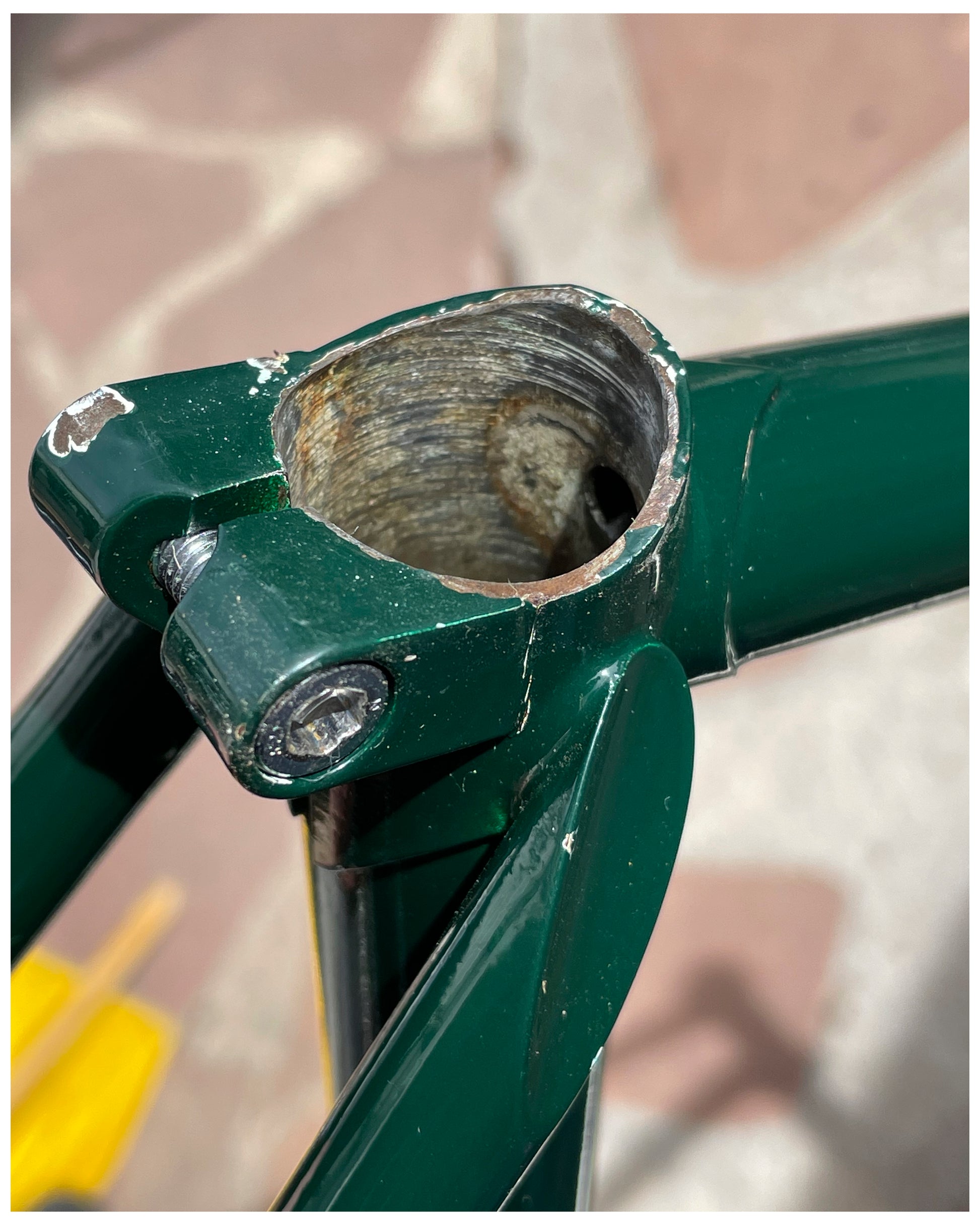 Unfortunately, this frame has a dent on the non-drive side seat stay towards the binder bolt. There is also an indentation on the bottom bracket shell, but hasn't compromised structure or the threads. The decals have also seen better days. Please look at all photos closely, as I've highlighted these issues. Original headset was refurbished and ready to go! No bottom bracket.