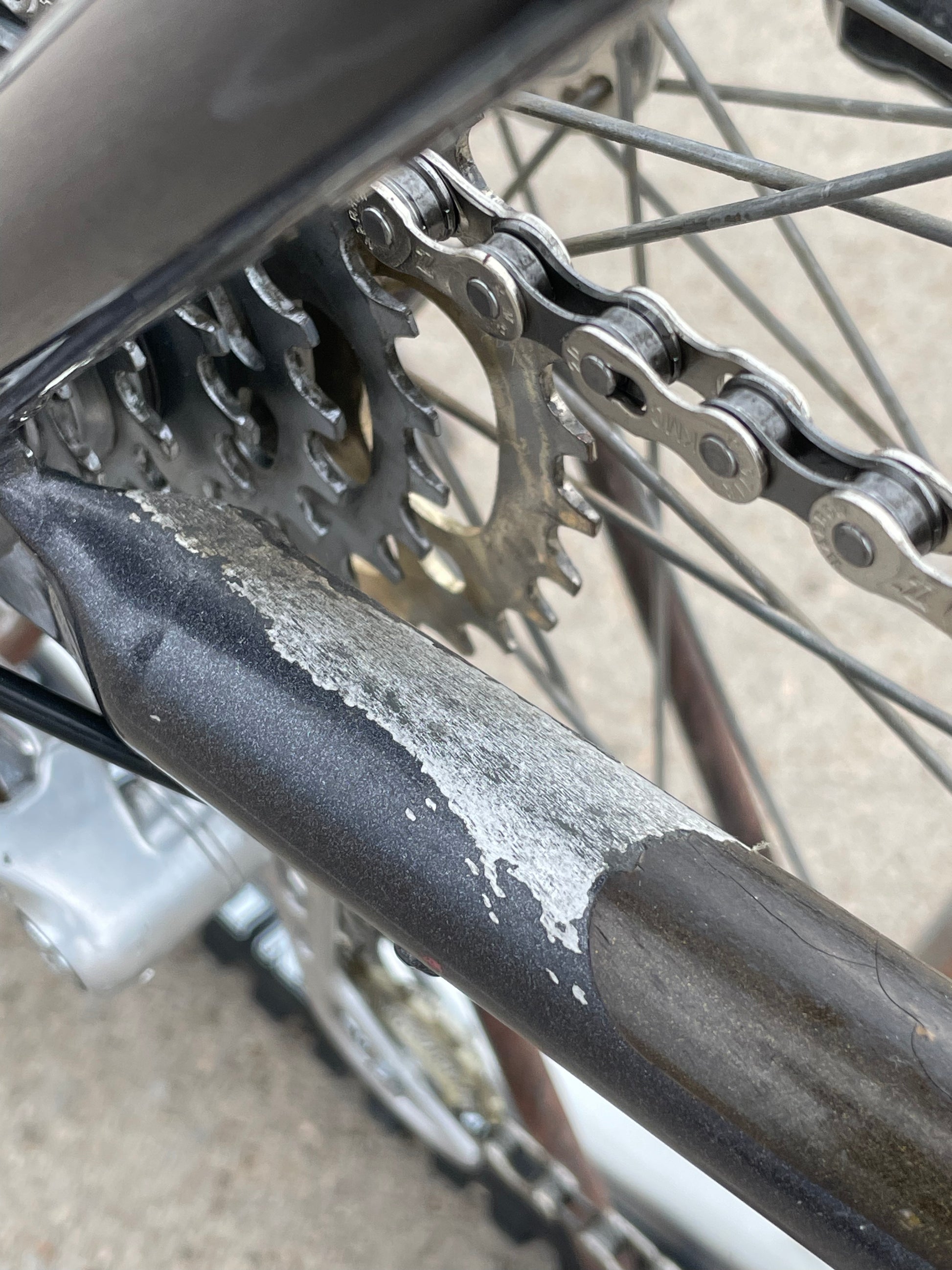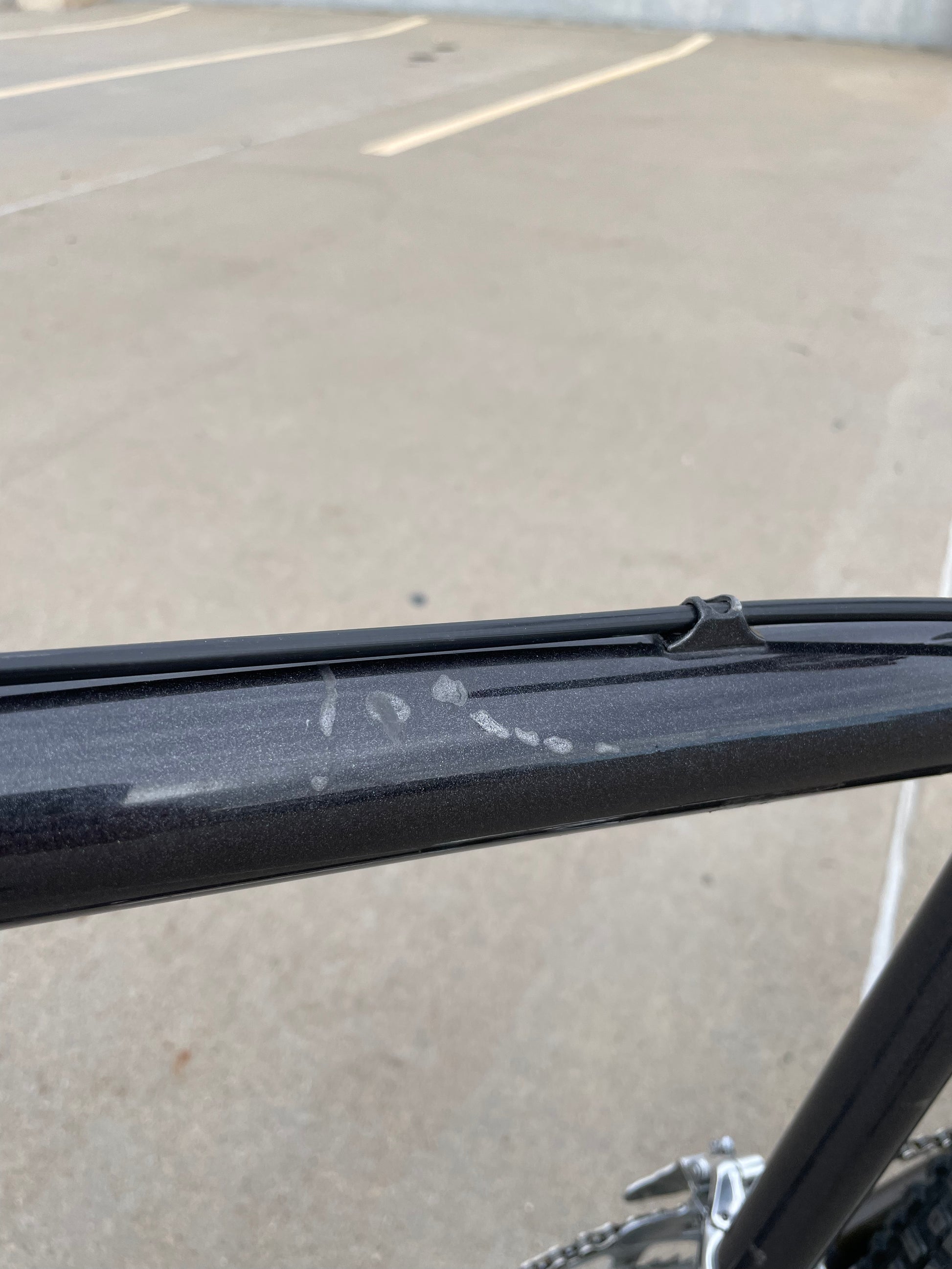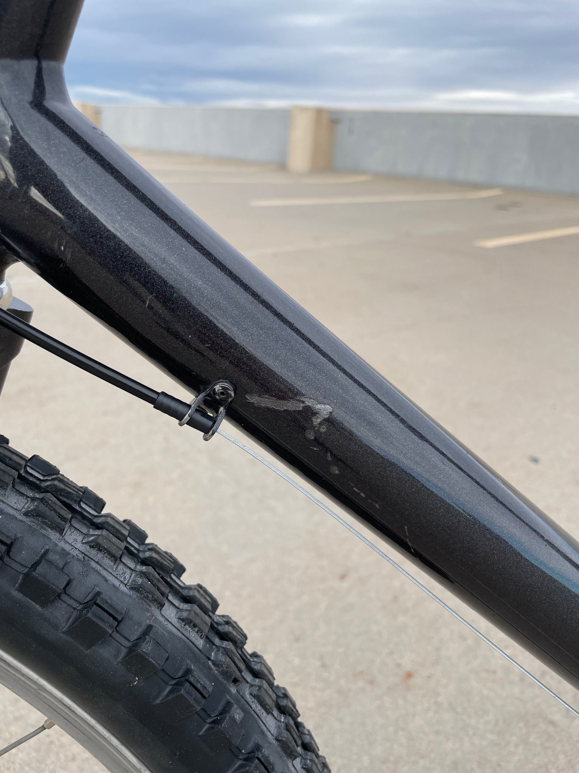 This bike shows sign of use but is in good condition. There are some paint scratches that have been roughly touched up on the frame and some areas on the fork that were sprayed over. No dents, bends, or cracks. The first loop on the first cable guide on the top tube has broken off. The tires are brand new. The rear wheel does slightly rub on the frame sometimes as this is the max tire size this bike can run. The drivetrain has been given a very good clean and reinstalled with new cables/housing. A new chain has also been installed.