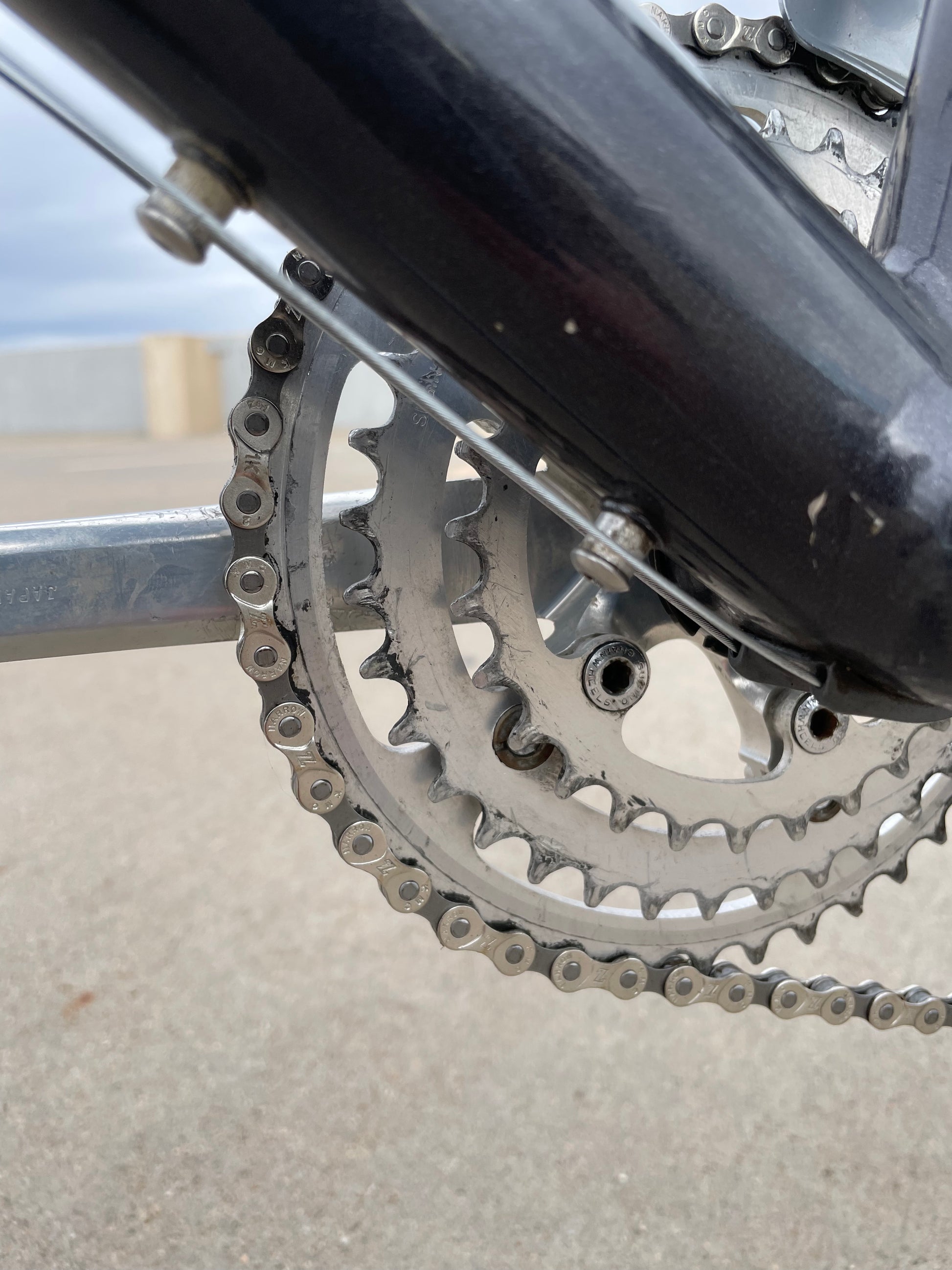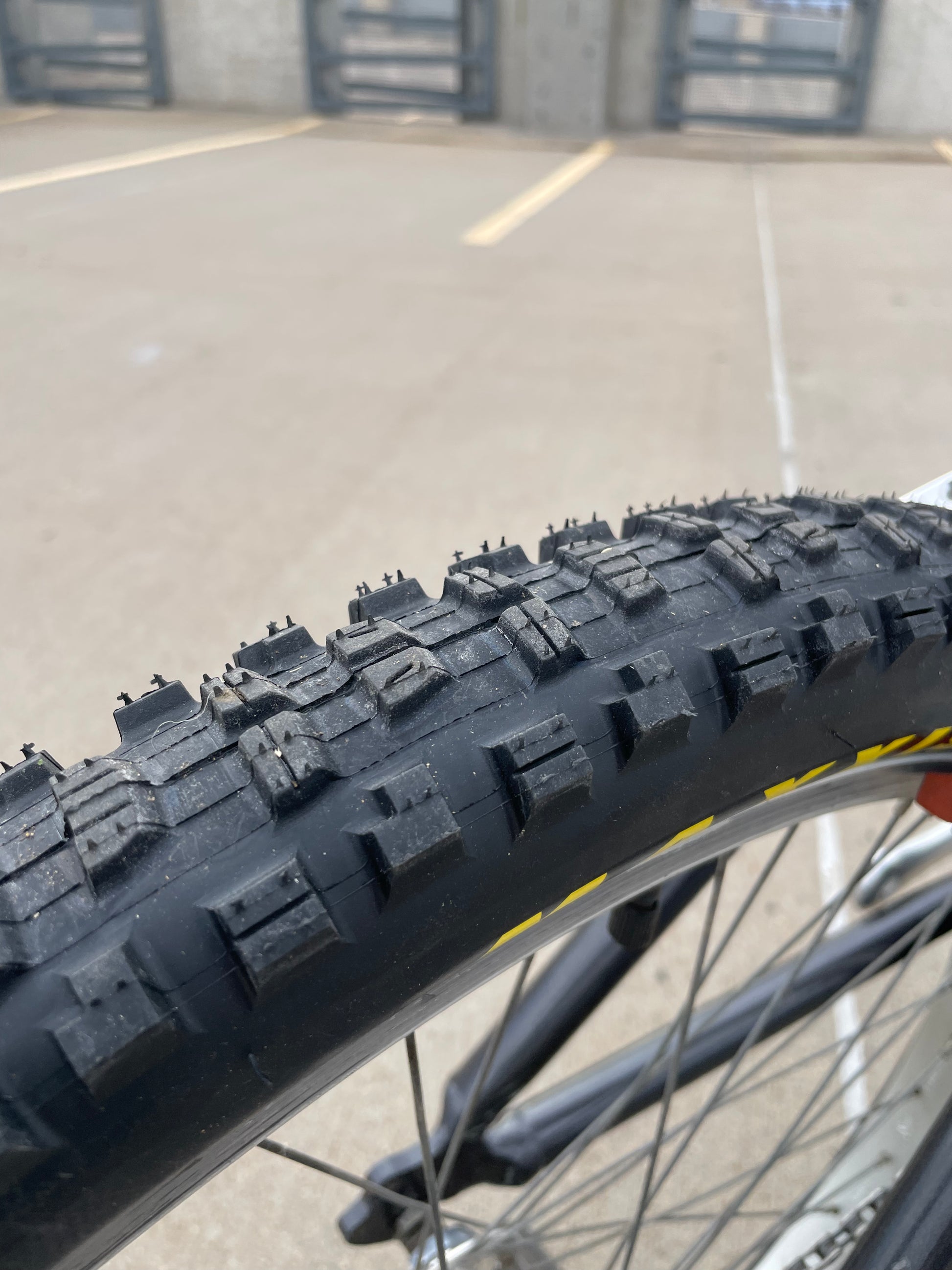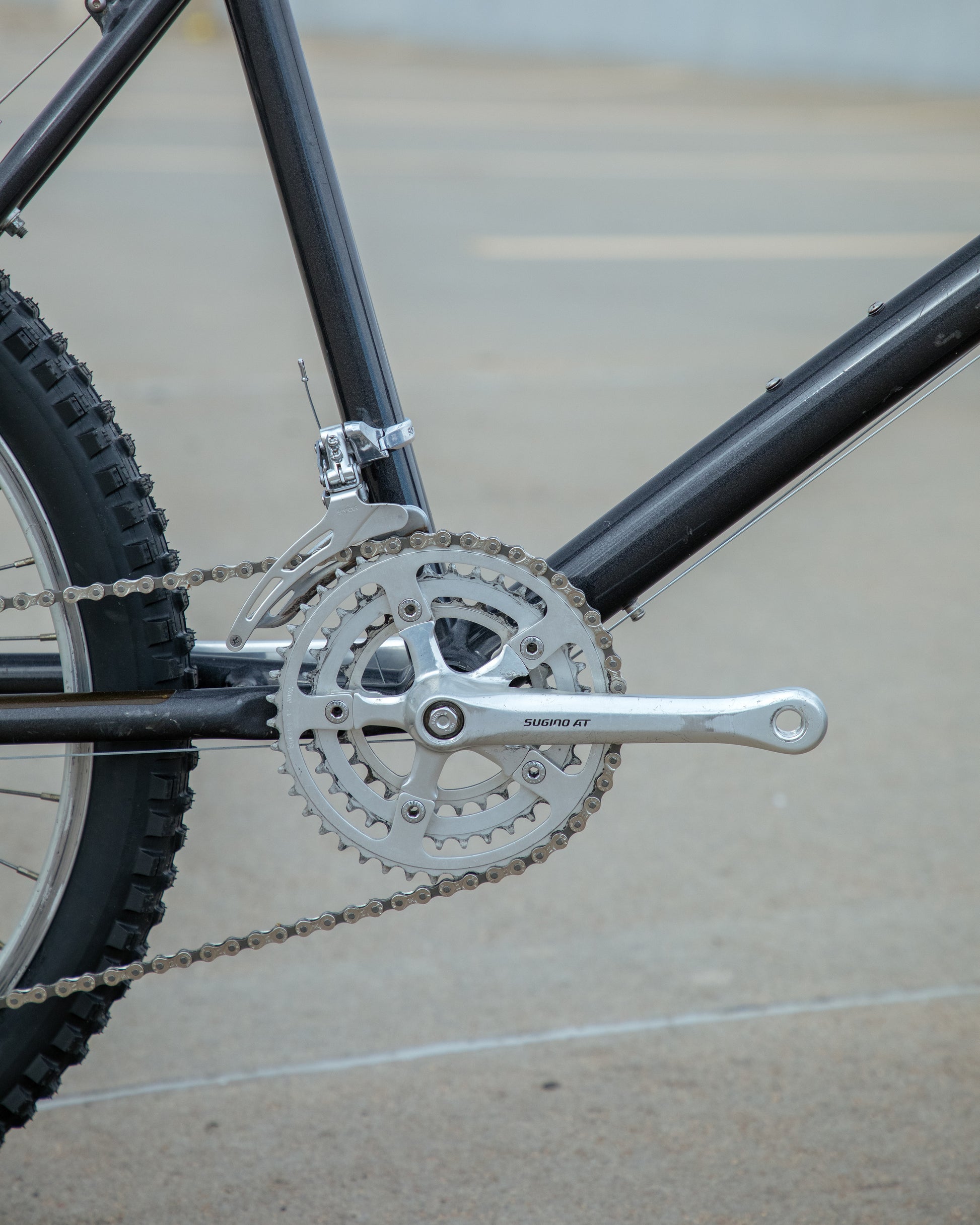 This bike shows sign of use but is in good condition. There are some paint scratches that have been roughly touched up on the frame and some areas on the fork that were sprayed over. No dents, bends, or cracks. The first loop on the first cable guide on the top tube has broken off. The tires are brand new. The rear wheel does slightly rub on the frame sometimes as this is the max tire size this bike can run. The drivetrain has been given a very good clean and reinstalled with new cables/housing. A new chain has also been installed.