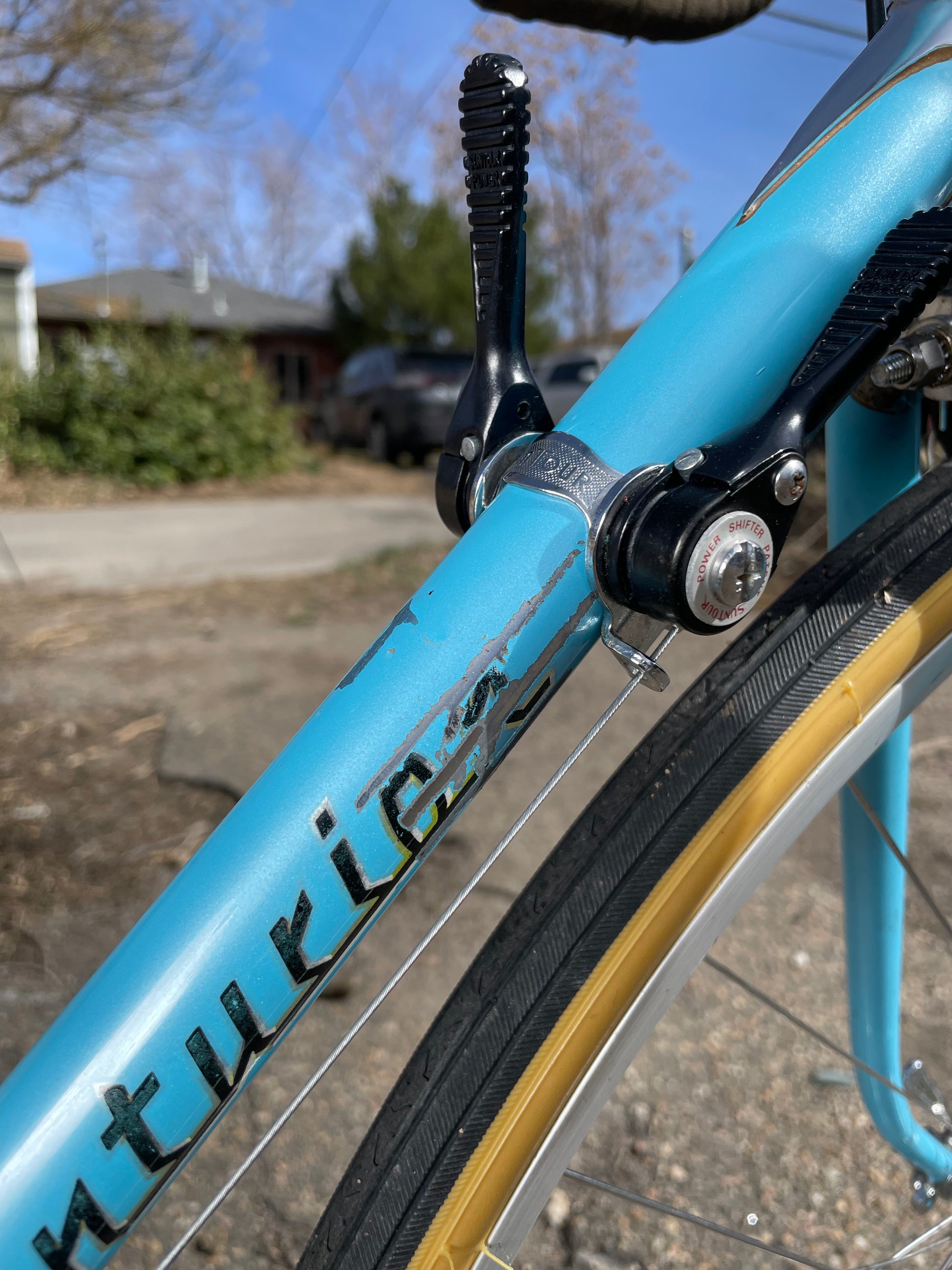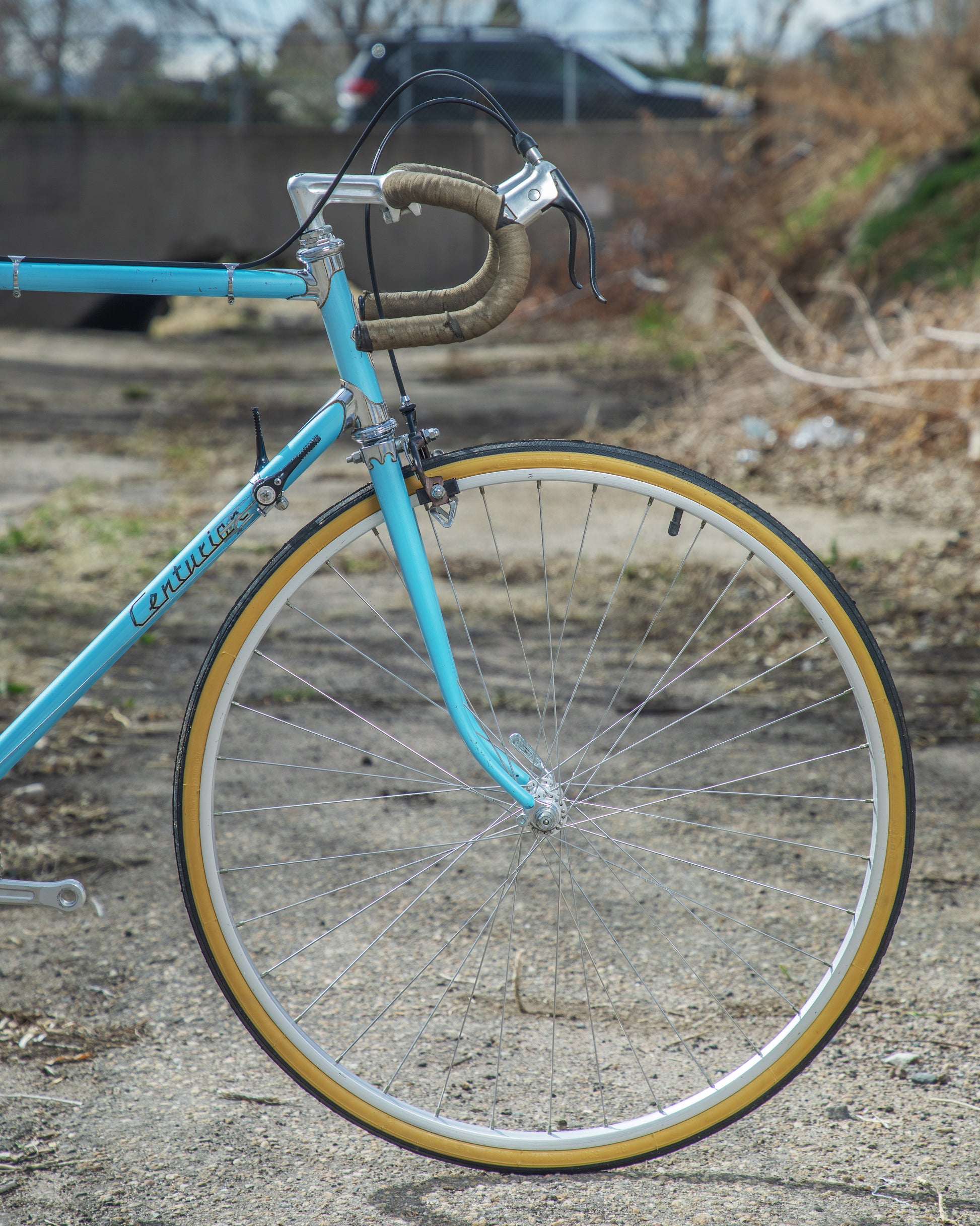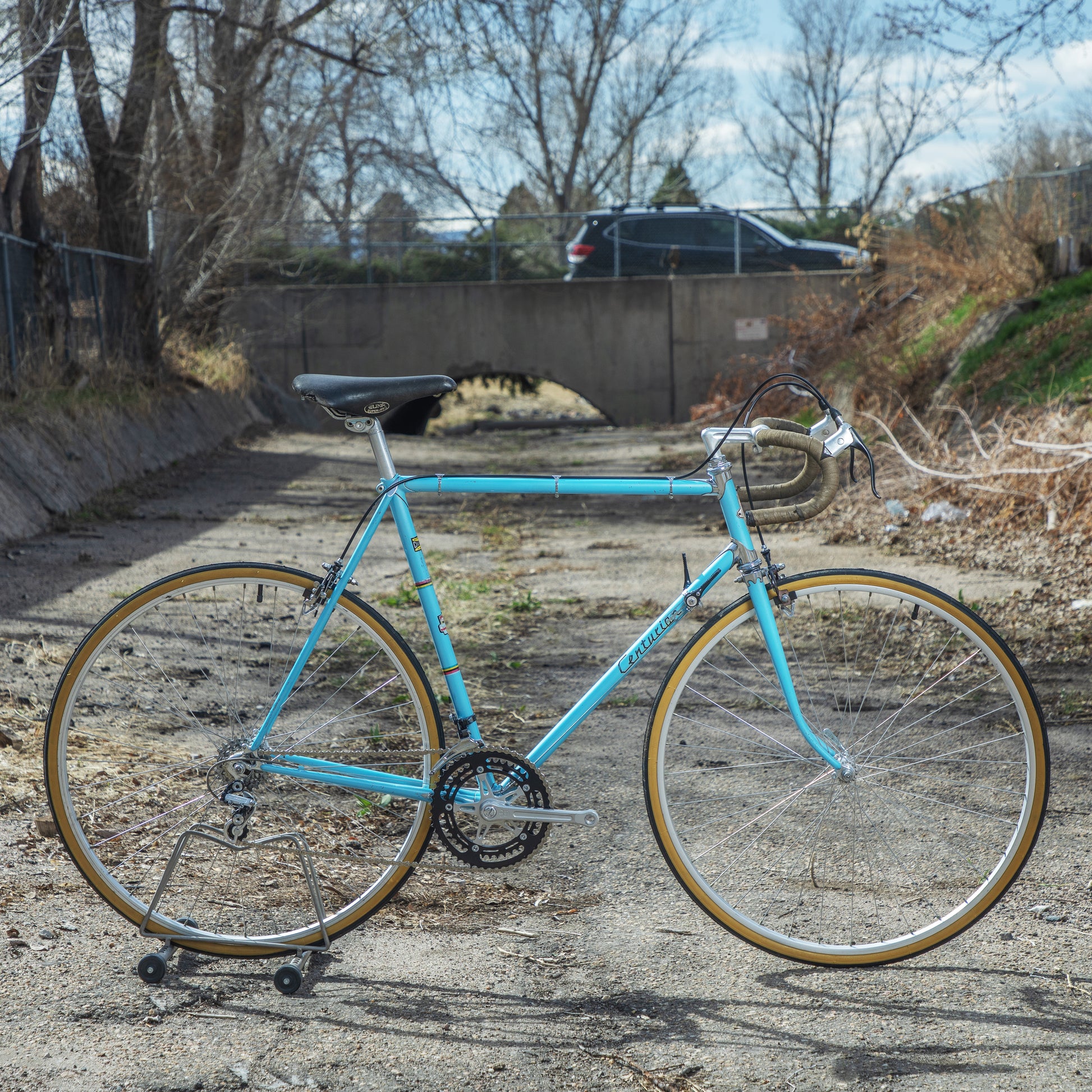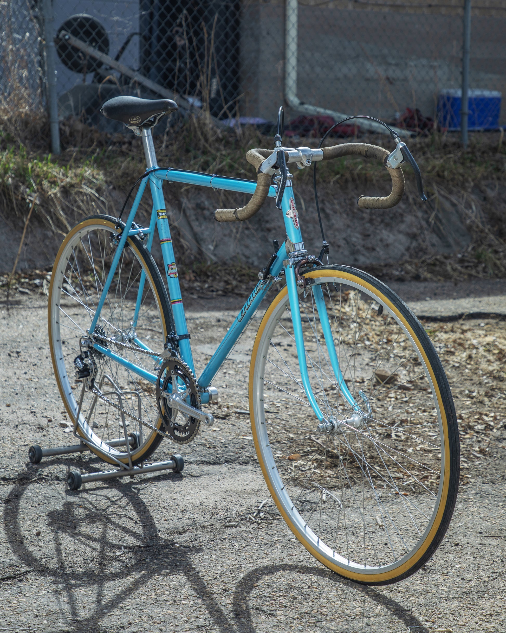 This Centurion Semi Professional is a beautiful bike! The metallic light blue with the chrome work is an elite combination. It takes on a totally different look when the sun catches it. It's in good condition but shows it's age. There are some paint chips here and there but no dents, bends, or cracks. The headset and bottom bracket were serviced and all parts were removed, cleaned, and then carefully reinstalled. I liked the look of the worn cloth bar tape so I decided to leave it alone. New shift and brake cables/housing have been installed. It has some cheaper, used tires on it but I didn't want to throw them away just for the sake of getting new ones. It was a well loved bike and is looking for a new loving home.