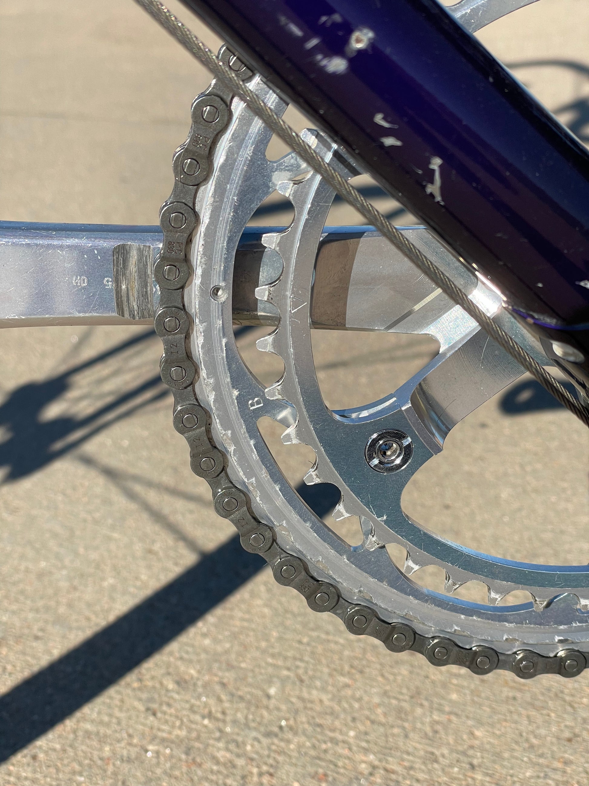 This bike is in ok condition. It shows sign of use. There are some paint chips and scratches scattered throughout the frame. Most of which can be found on the top tube. There is also a small, dime sized dent in the top tube. No cracks or bends in the frame. The components also show sign of use but everything works properly. A new chain was the only thing it needed. There also appears to be a small error in the bar tape. Please check out all of the photos to get a better understanding as to the condition of this bike.
