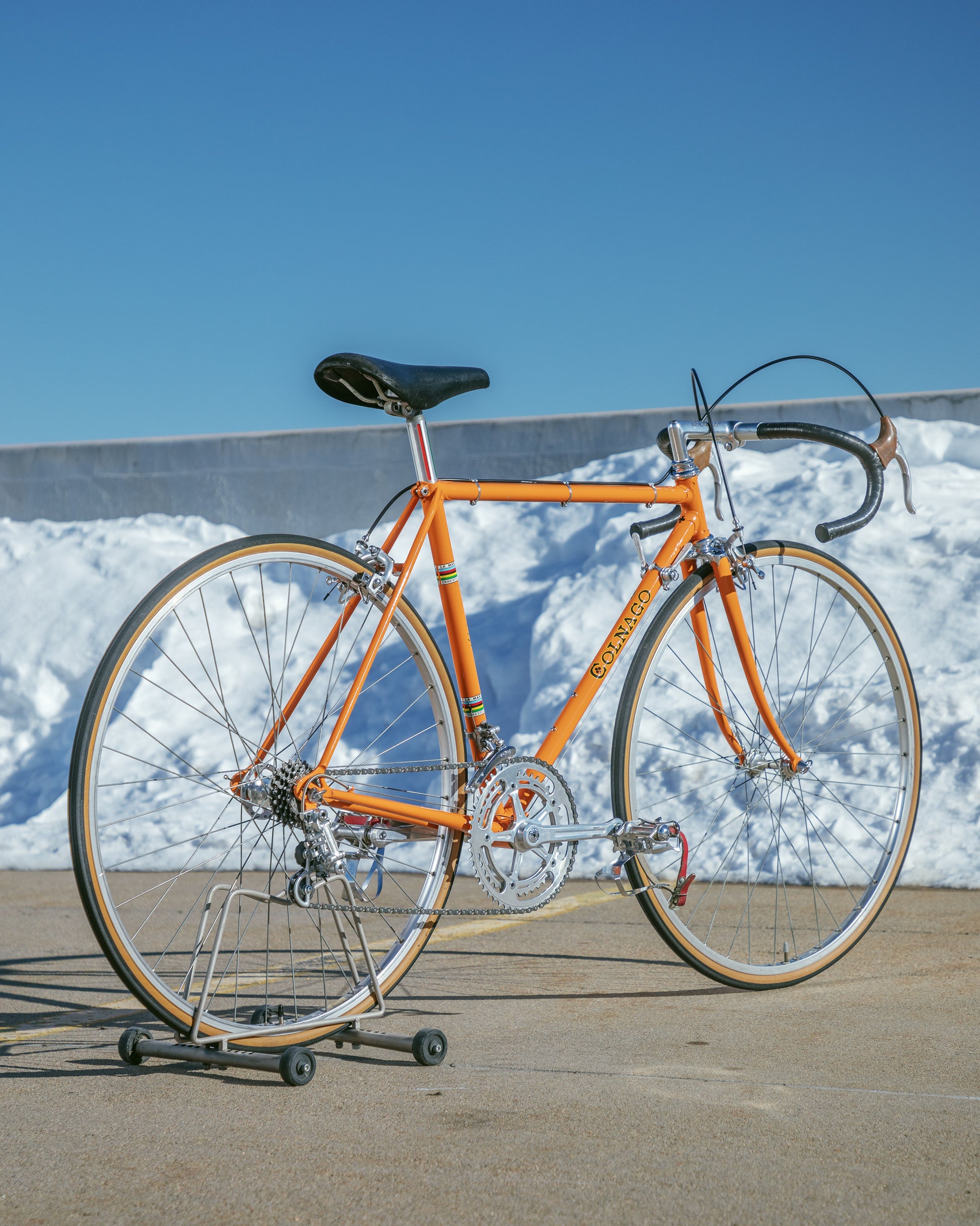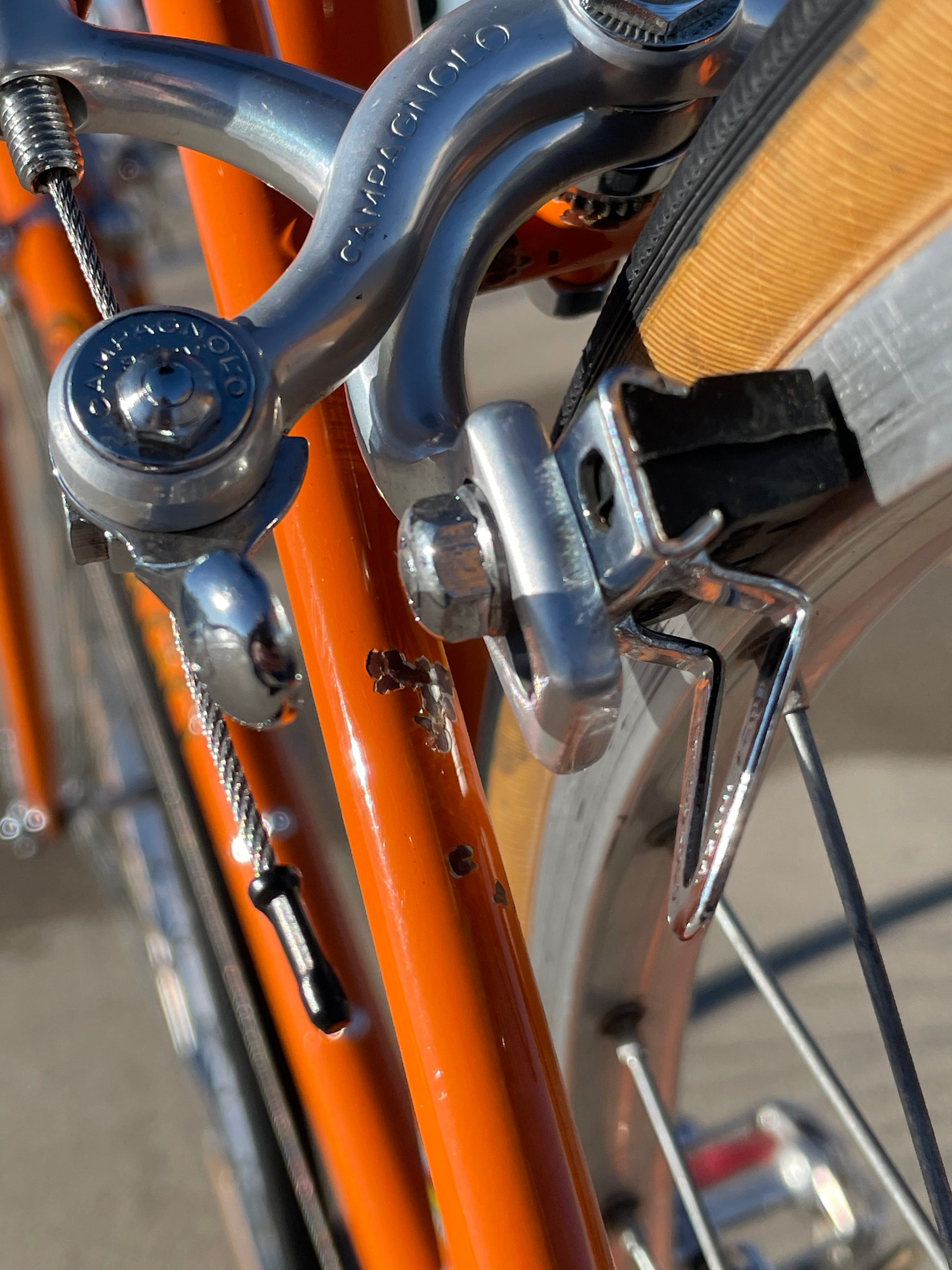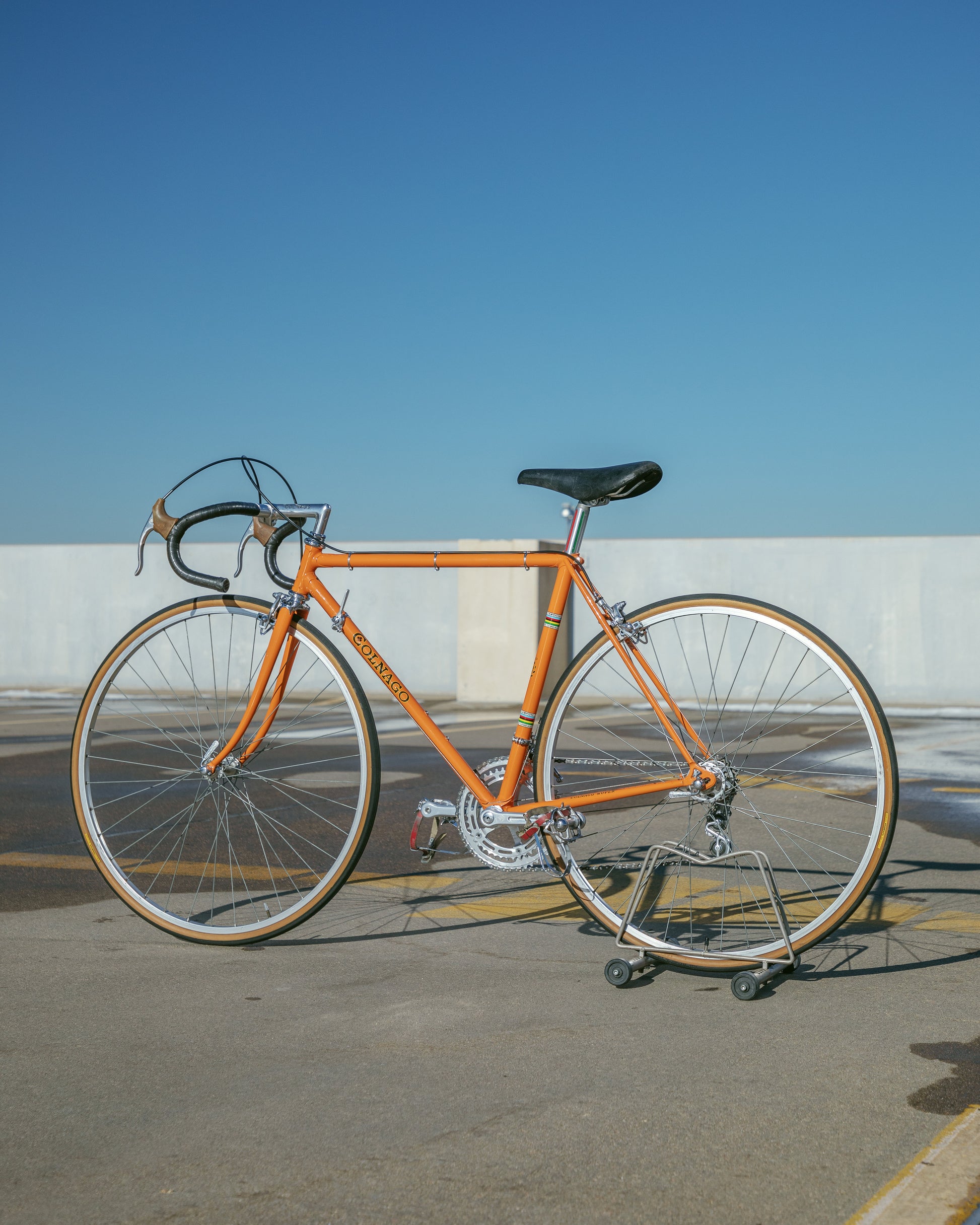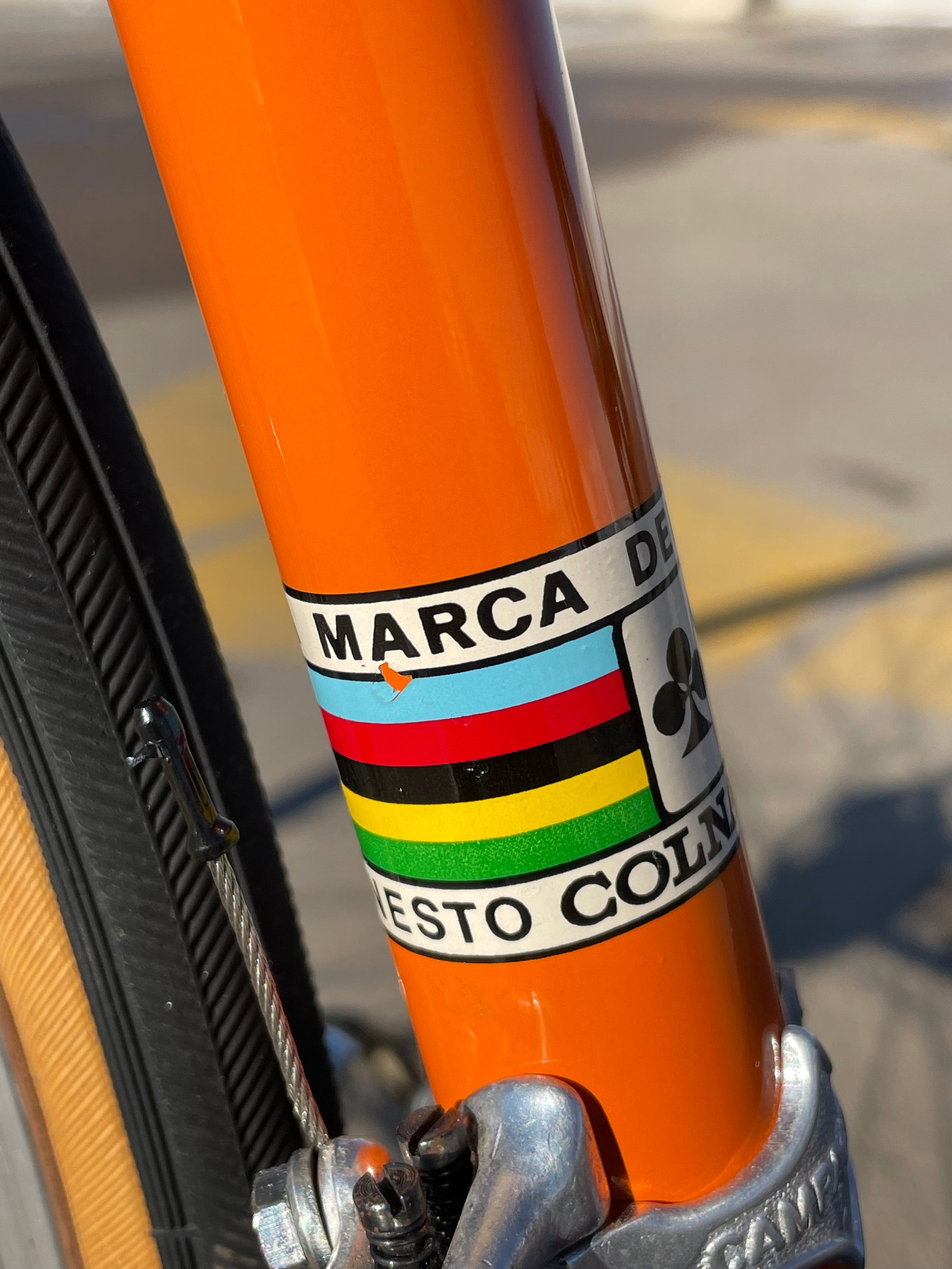 This 1973 Colnago Super is as good as it gets. It's finished in a beautiful "Molteni," orange and comes equipped with a complete Campagnolo Nuovo groupset. This bike is in incredible condition and has been fully refurbished. The frame was cleaned and polished and both the headset and bottom bracket were rebuilt. Vintage braided brake and shift cables have been installed with new housing. The Benotto bar tape is original and has some scuffs in areas but was also given a deep clean. The original hoods also have some scuffs and one has a small tear, but in good condition considering the material its made from and how old it is. The non-drive crank arm pedal threads also had to be re-threaded. You can see the work that was done but it can be screwed in with just hand strength now. The Campagnolo seatpost and 3ttt stem are pantographed with the Colnago logo. The bars are old logo Cinelli and the saddle is also Cinelli. All parts were ultrasonic cleaned and carefully reinstalled.