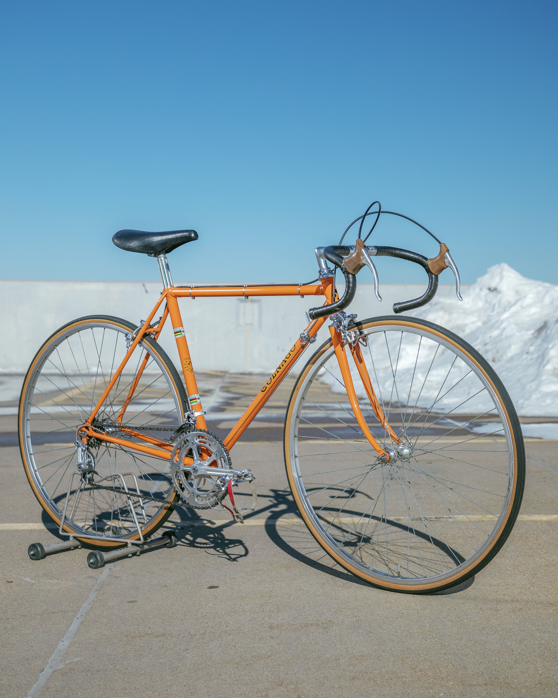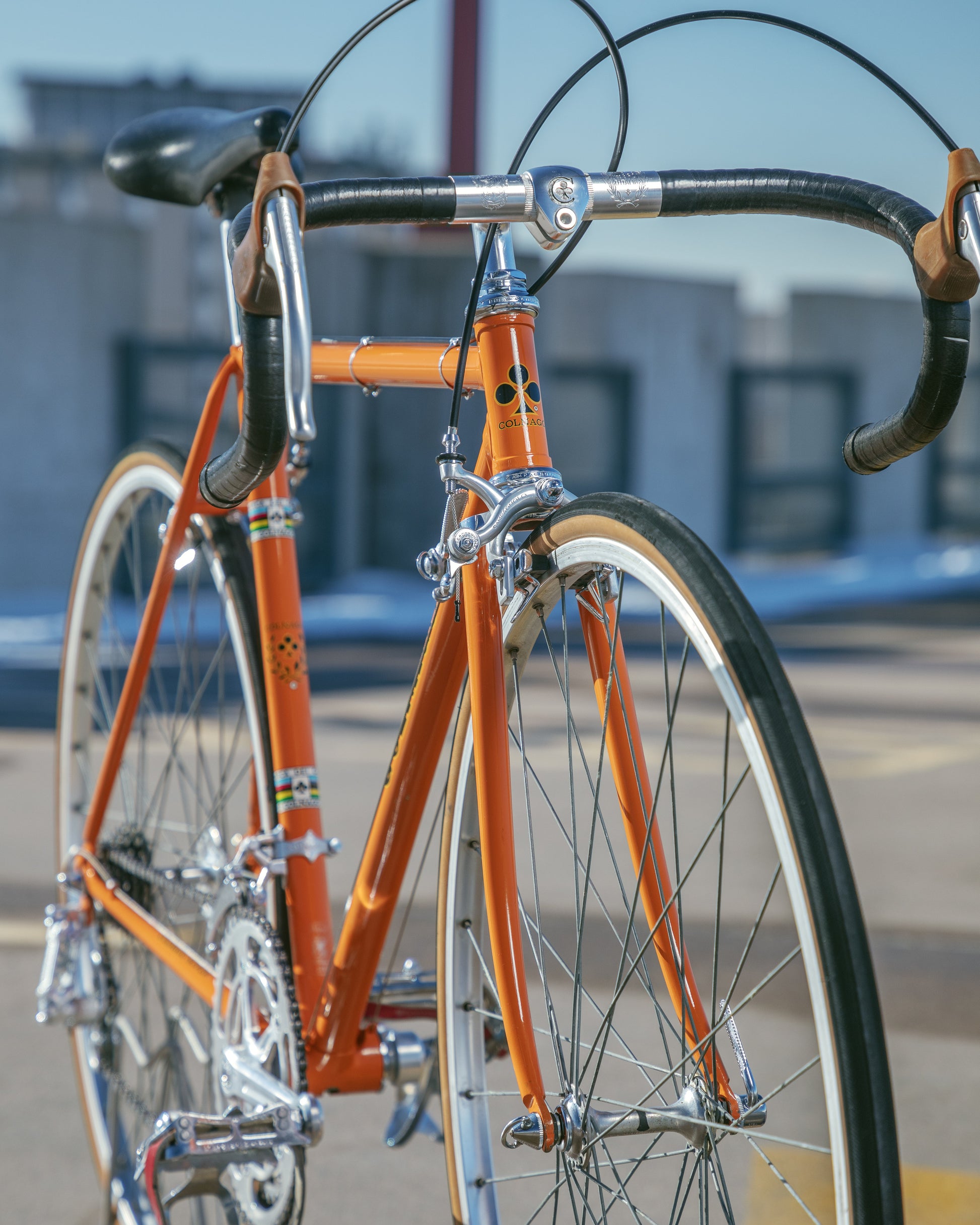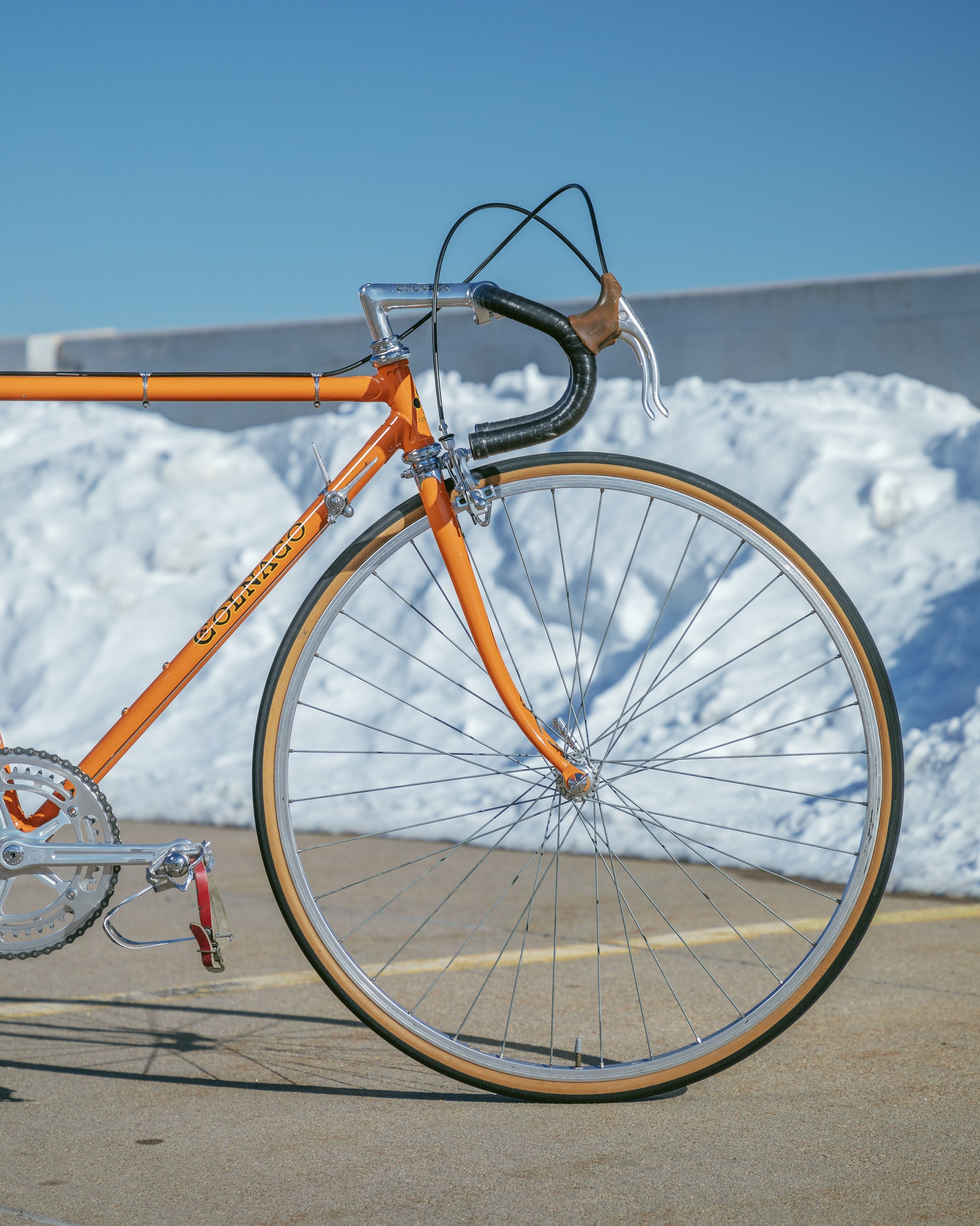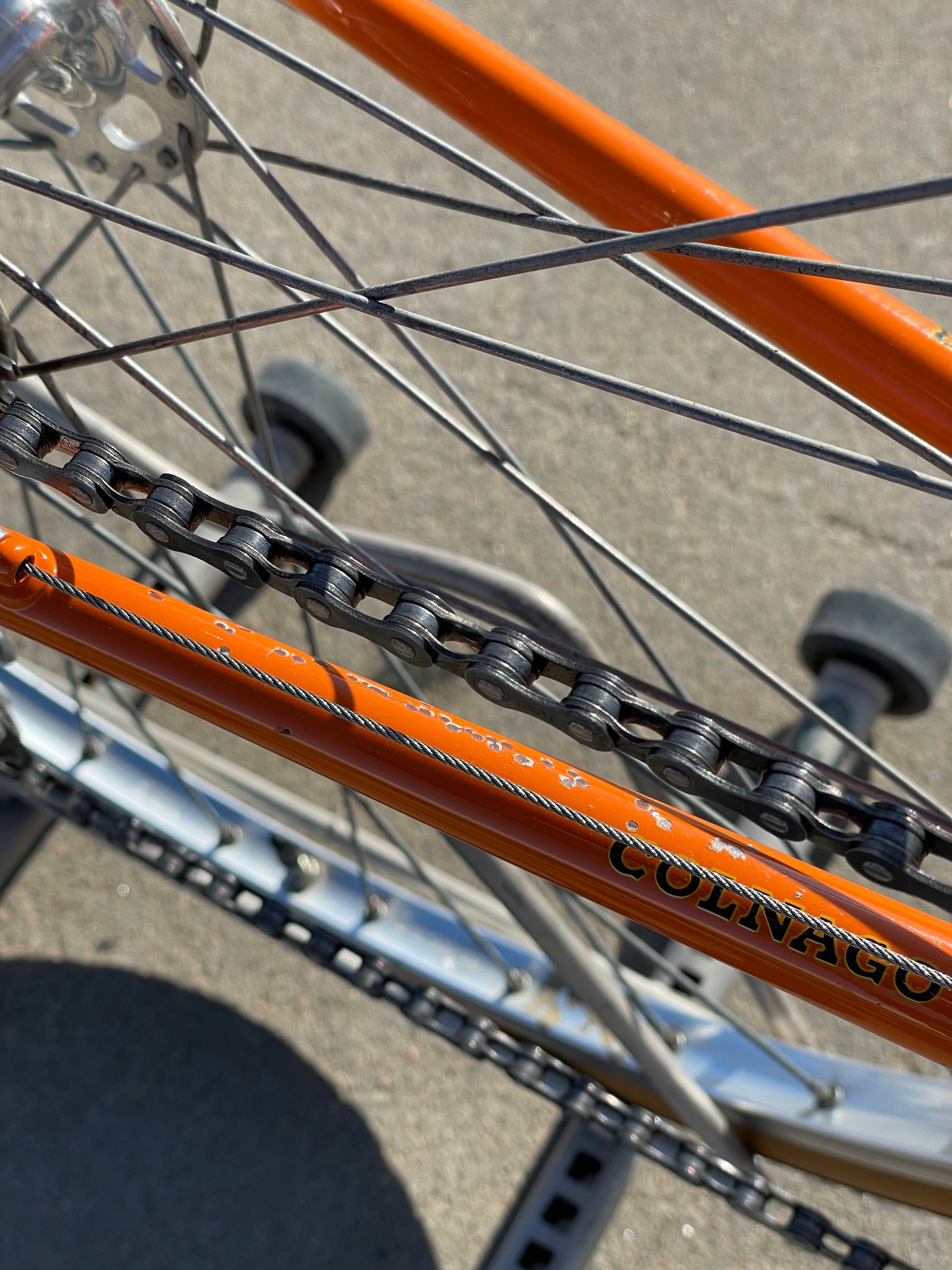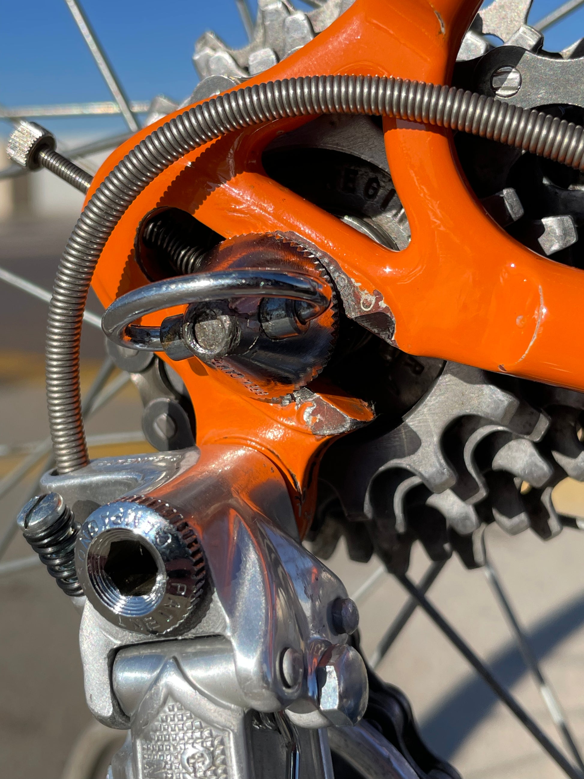 This 1973 Colnago Super is as good as it gets. It's finished in a beautiful "Molteni," orange and comes equipped with a complete Campagnolo Nuovo groupset. This bike is in incredible condition and has been fully refurbished. The frame was cleaned and polished and both the headset and bottom bracket were rebuilt. Vintage braided brake and shift cables have been installed with new housing. The Benotto bar tape is original and has some scuffs in areas but was also given a deep clean. The original hoods also have some scuffs and one has a small tear, but in good condition considering the material its made from and how old it is. The non-drive crank arm pedal threads also had to be re-threaded. You can see the work that was done but it can be screwed in with just hand strength now. The Campagnolo seatpost and 3ttt stem are pantographed with the Colnago logo. The bars are old logo Cinelli and the saddle is also Cinelli. All parts were ultrasonic cleaned and carefully reinstalled.