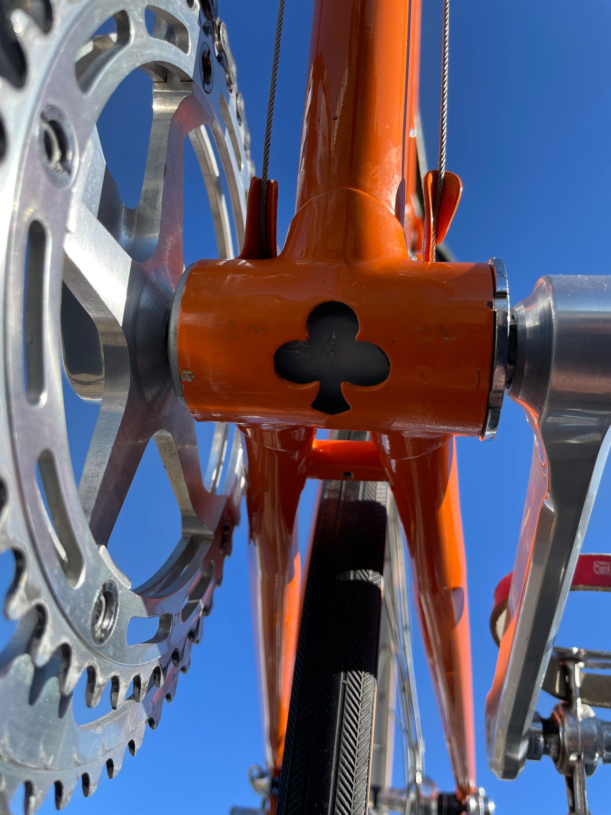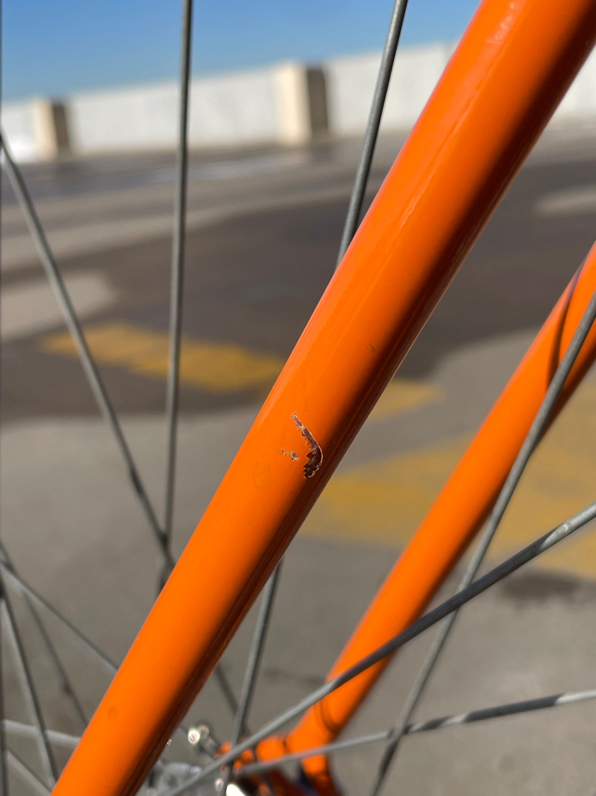 The frame has a few paint chips here and there, most notably around the rear brake (the brake does a very good job at hiding these chips). No dents, bends, or cracks. Original decals and paint! This bike is STUNNING and RARE! Own a piece of art history.