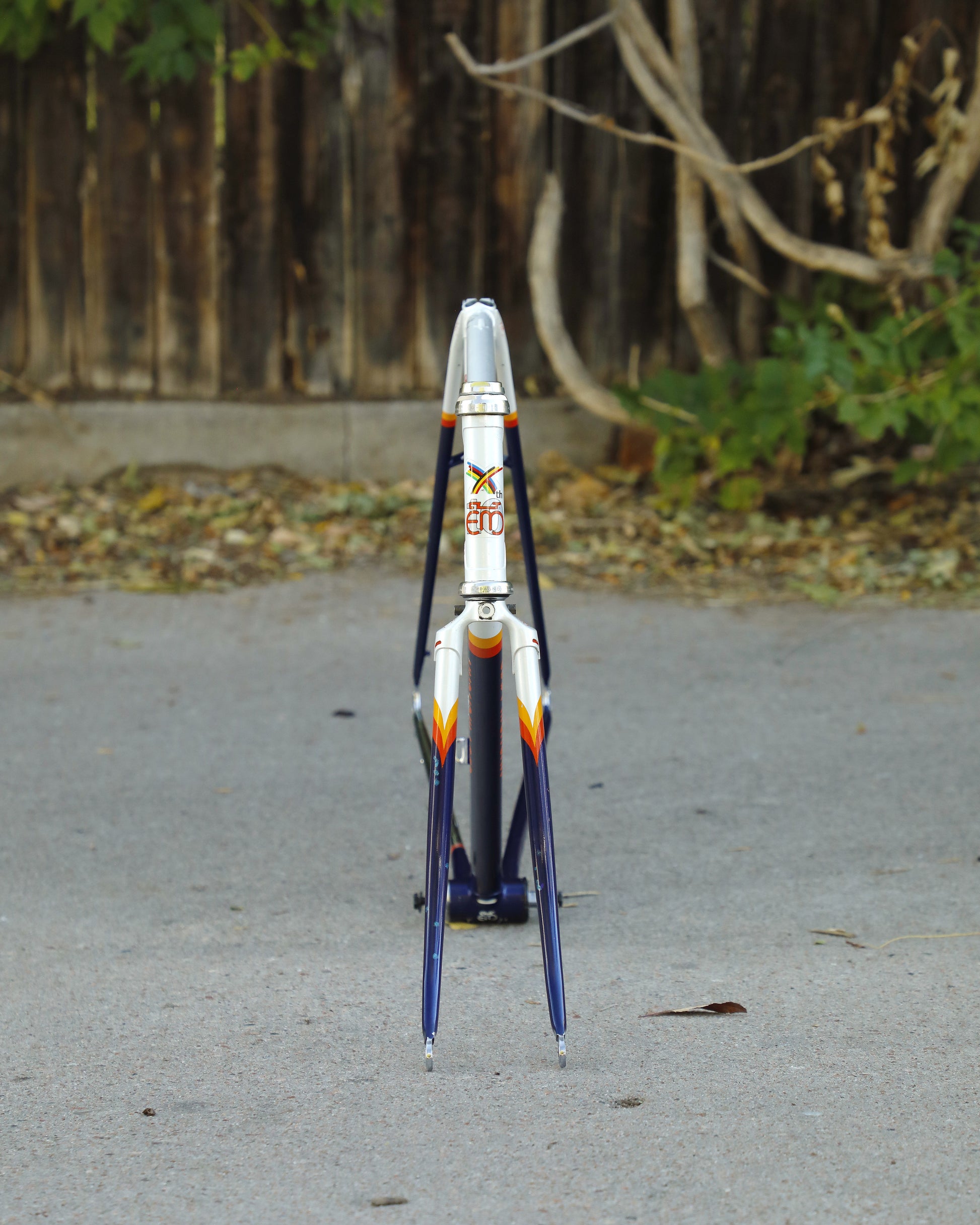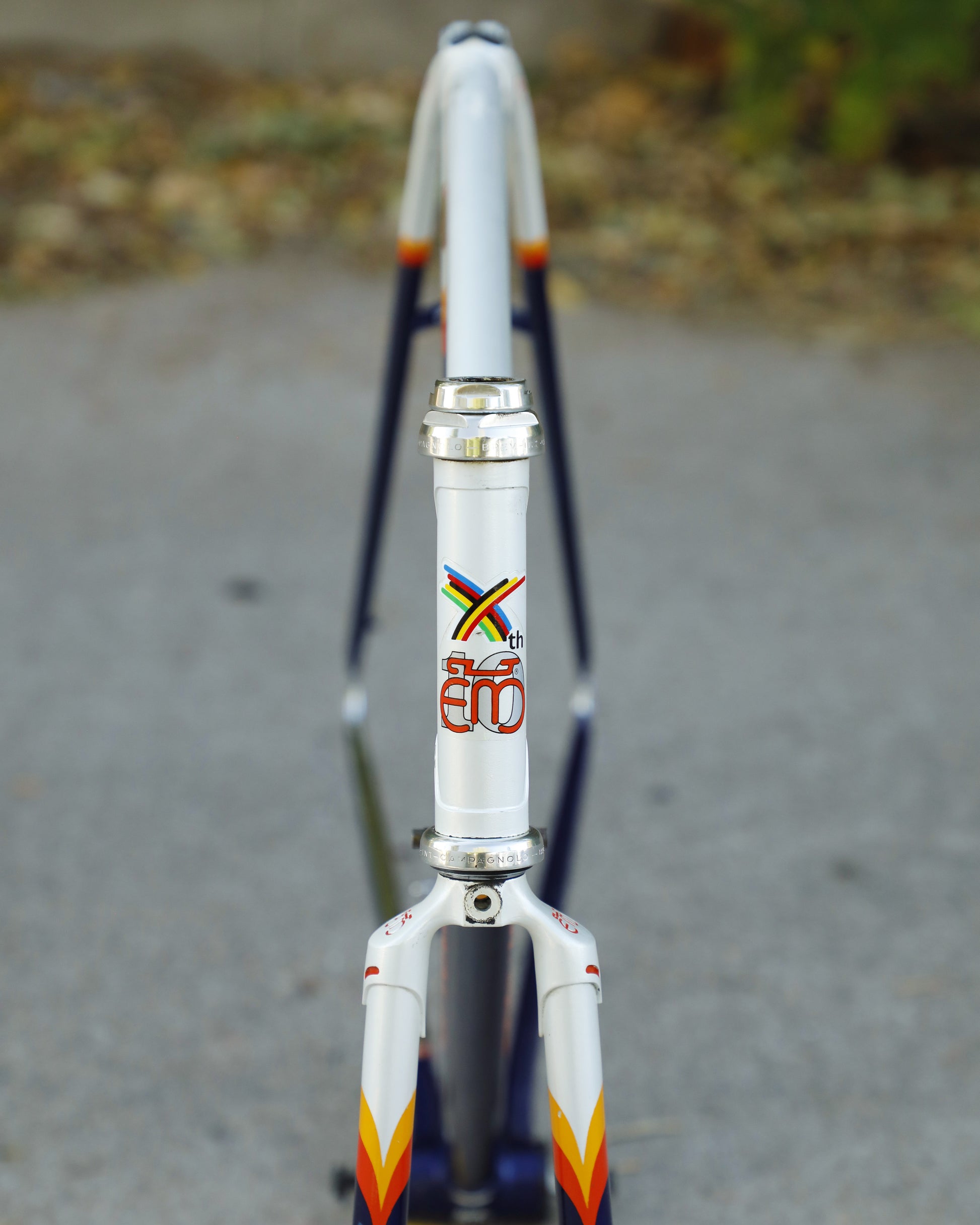 This Eddy Merckx 10th Anniversary road frame is finished with an eye popping array of colors and has an incredible amount of aura. This frame celebrates Merckx's 10th year as a bicycle company. This frame is made with Columbus SLX tubing, arguably the most popular tube set for racers at the time. It's in good condition but shows sign of use. No dents, bends, or cracks. There are a few chips in the paint, but nothing substantial. Please see all photos to get a better understanding as to the condition this bike is in.