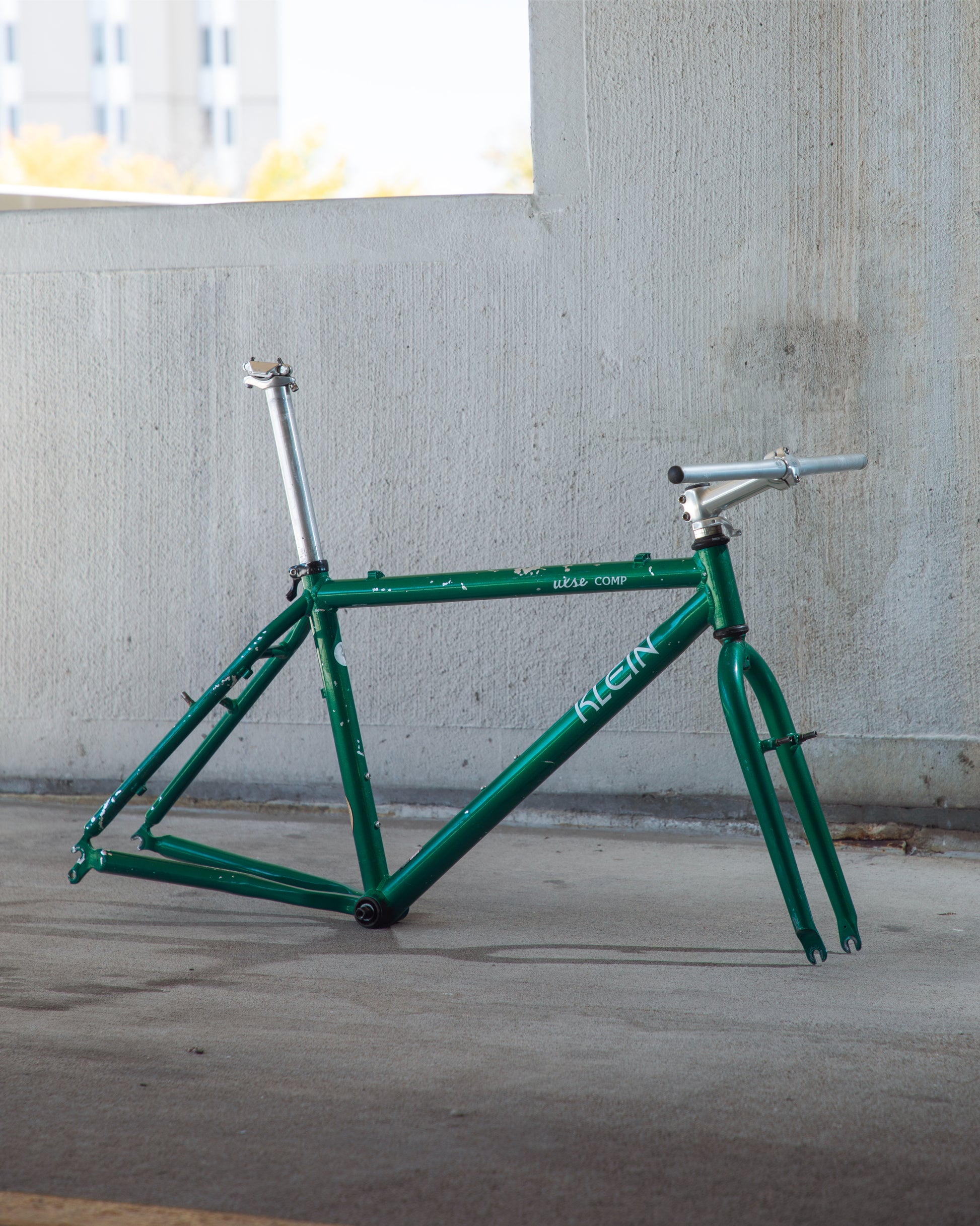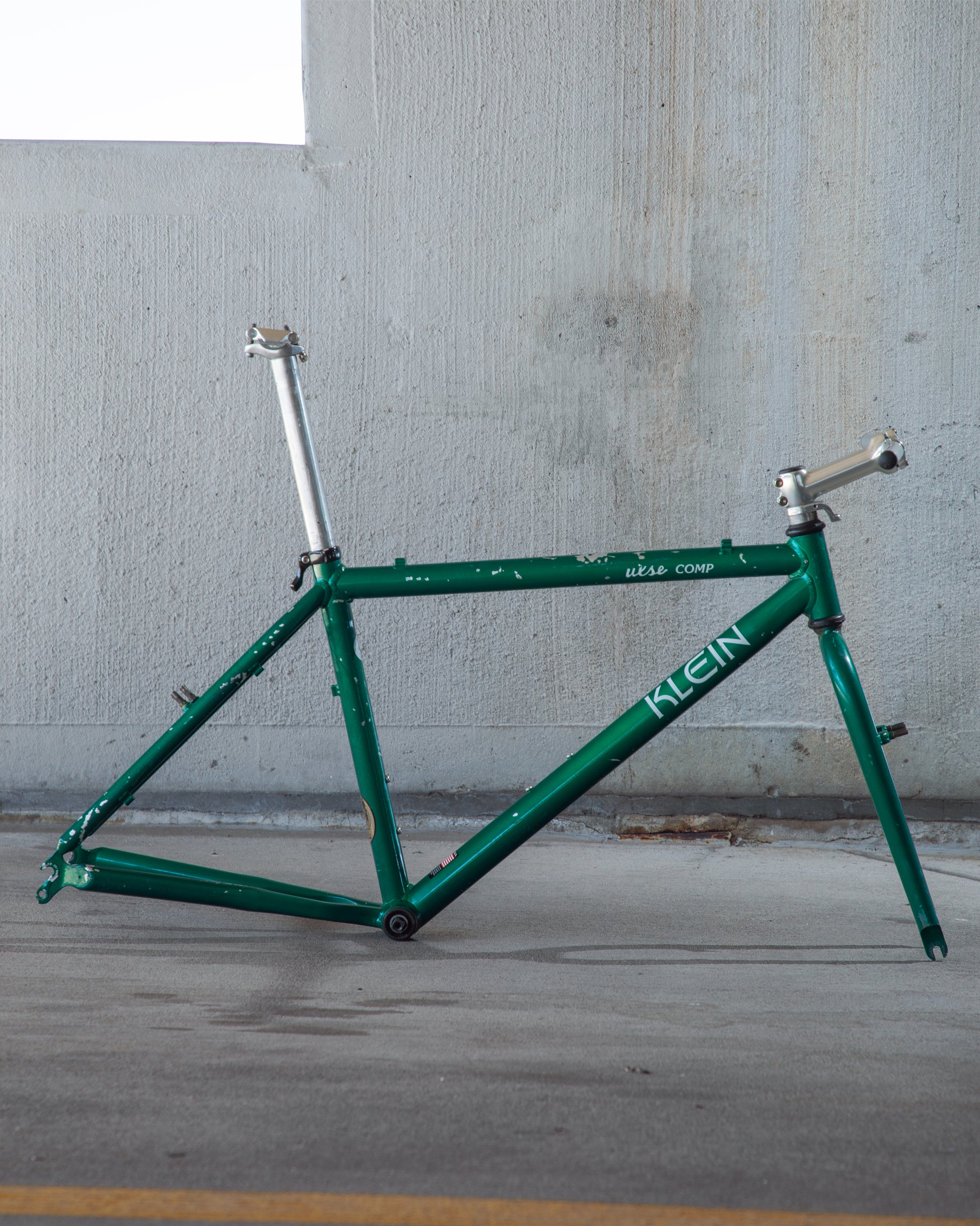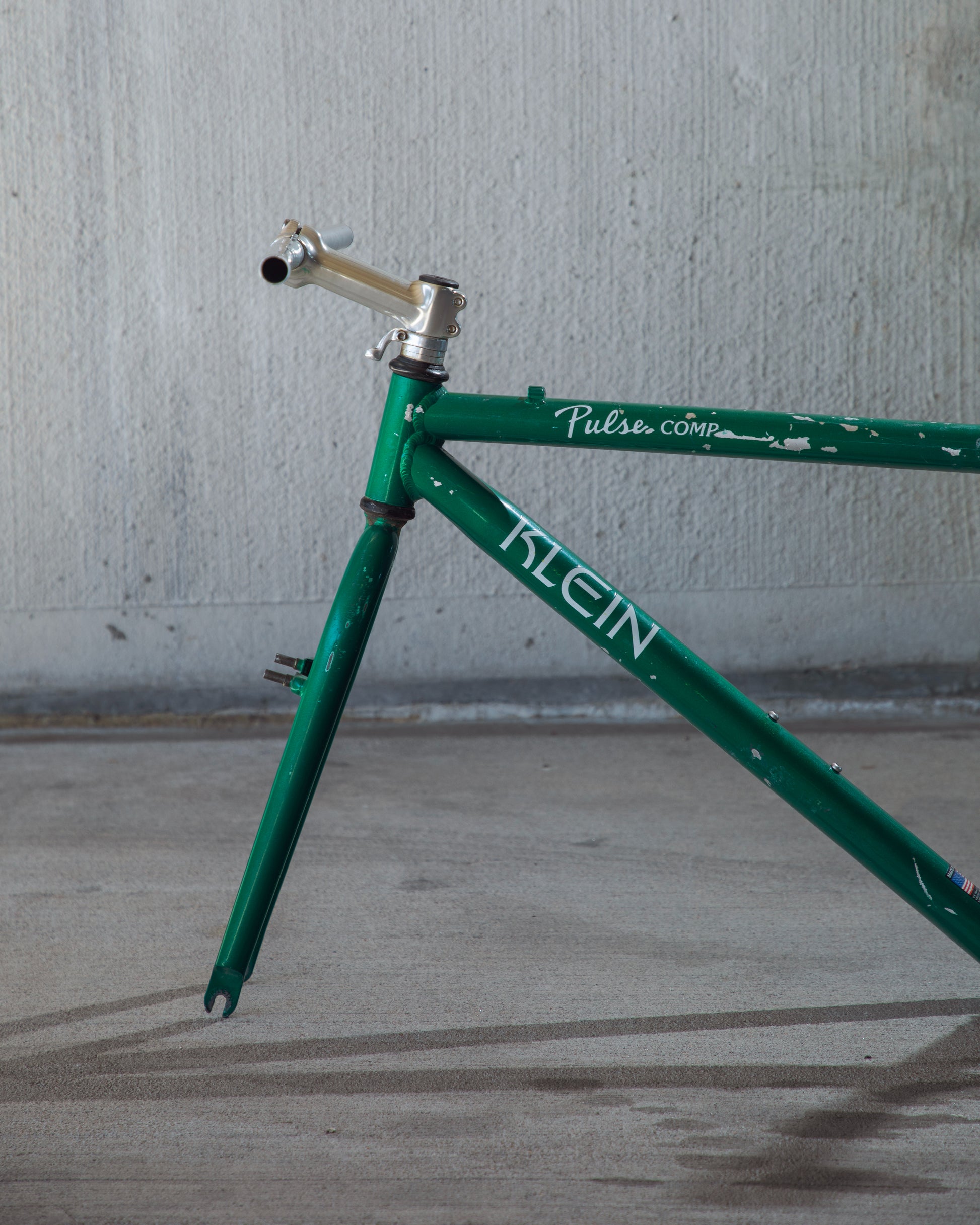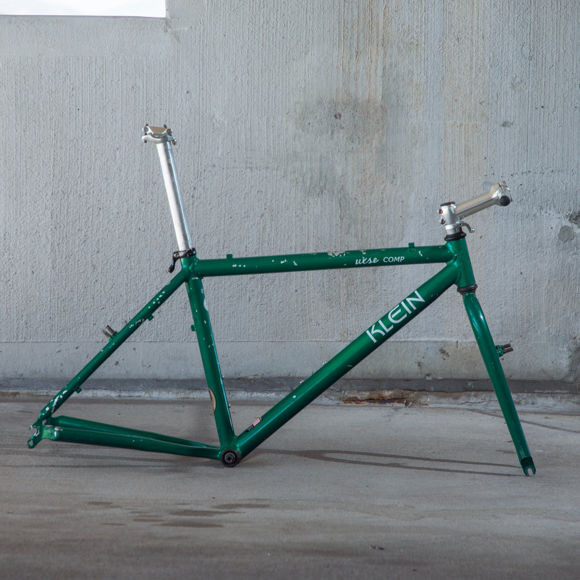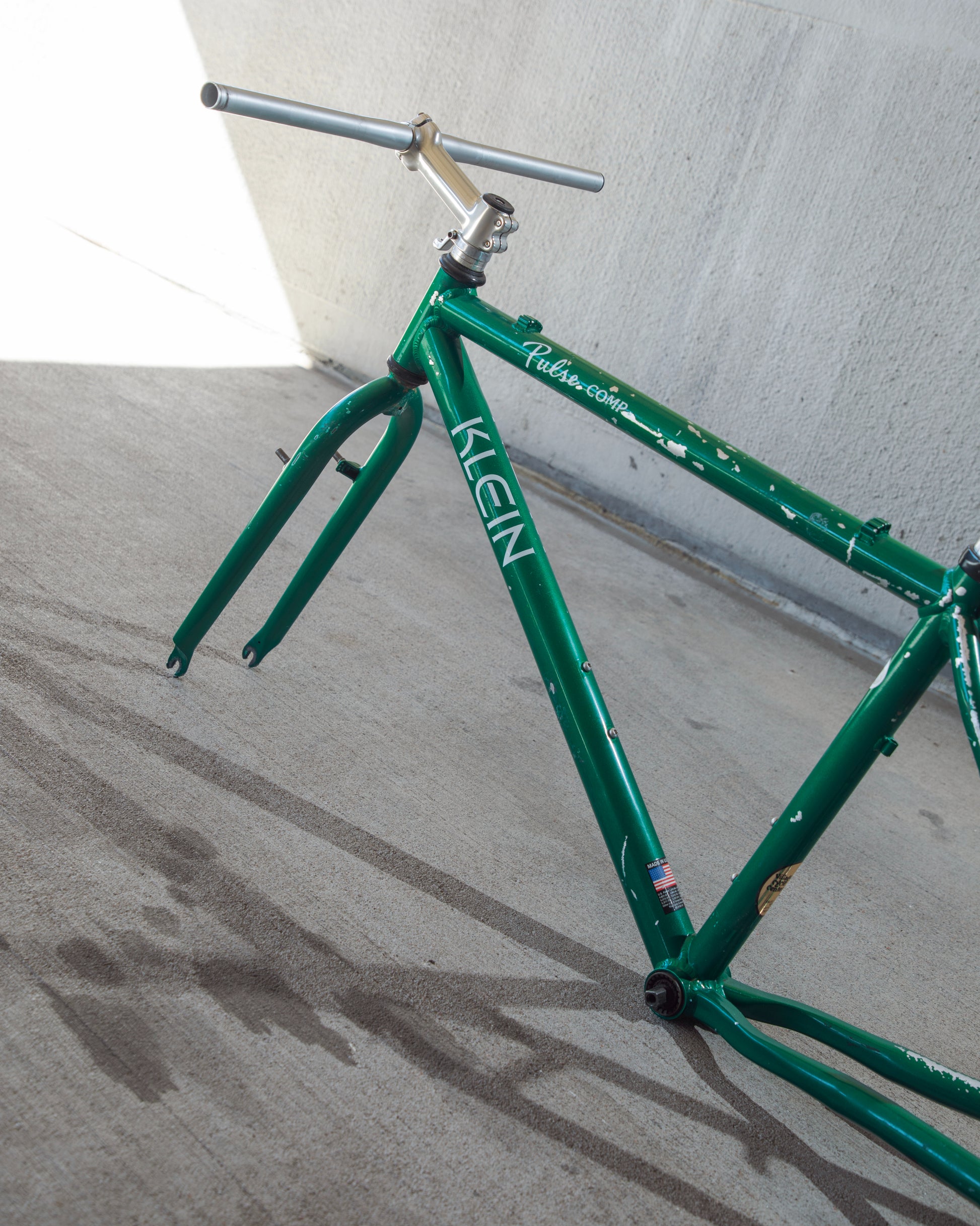Beat, battered, bruised, but not broken. This Klein Pulse Comp has seen its fair share of trail, but no dents, bends, or cracks. The paint is all chipped up throughout the frame. The bones are good! Keep it as is or repaint it! Comes with seatpost, bottom bracket, headset, stem, and handlebar. Both the headset and bottom bracket could use some fresh grease as they both feel tight. Lots of directions you can go building this up! Just needs some love. The frame is stamped as a 20" or size medium.