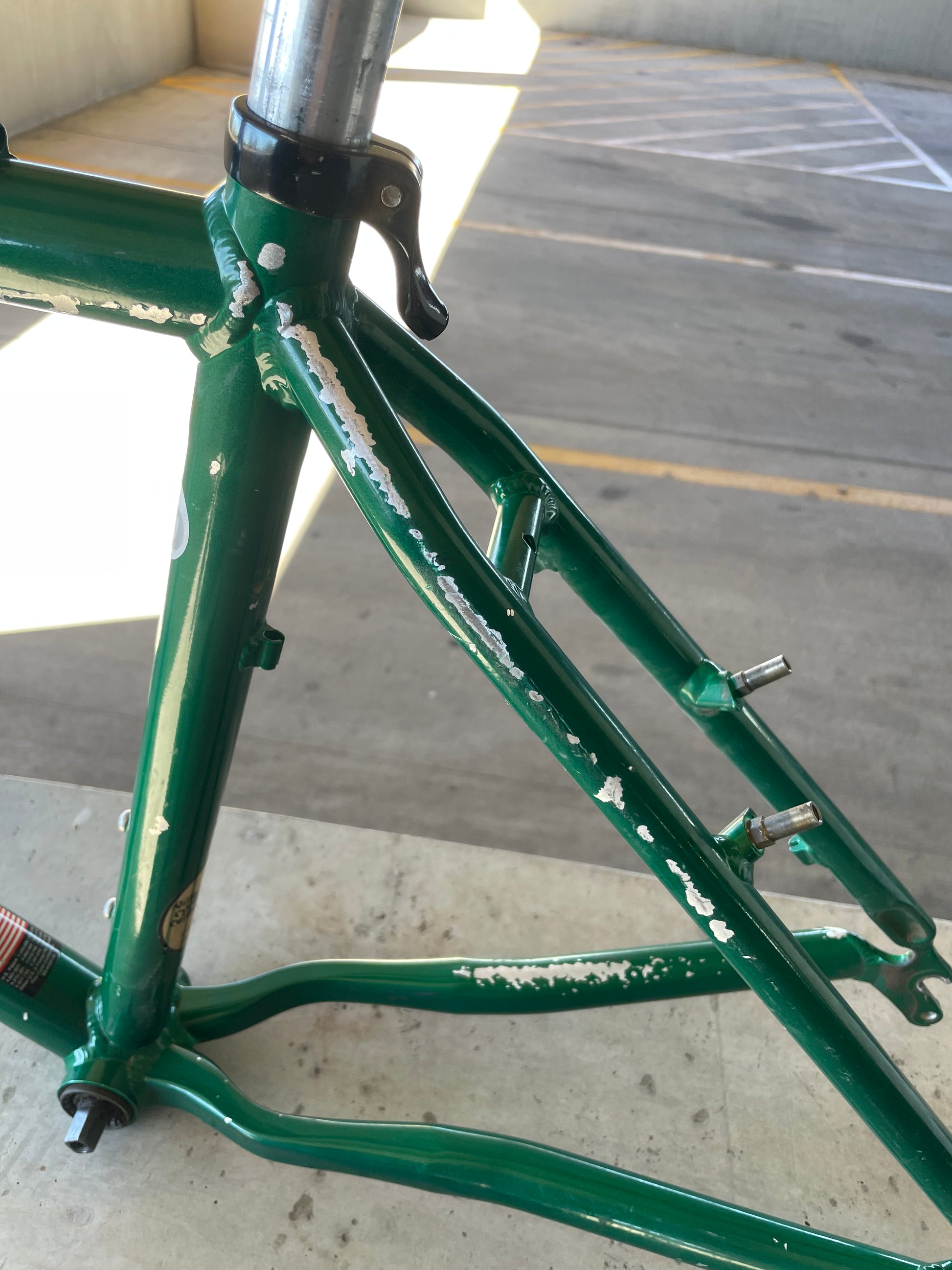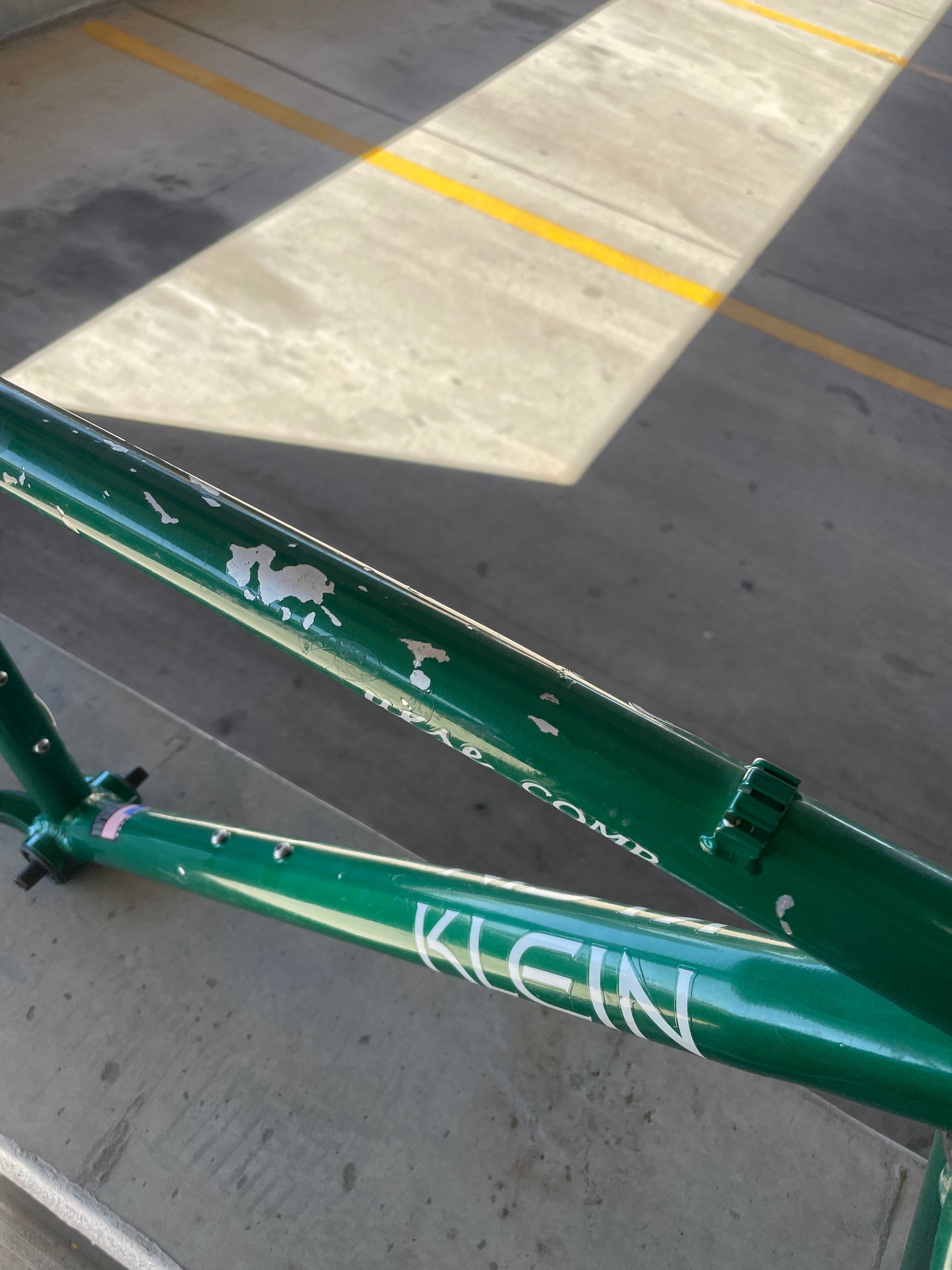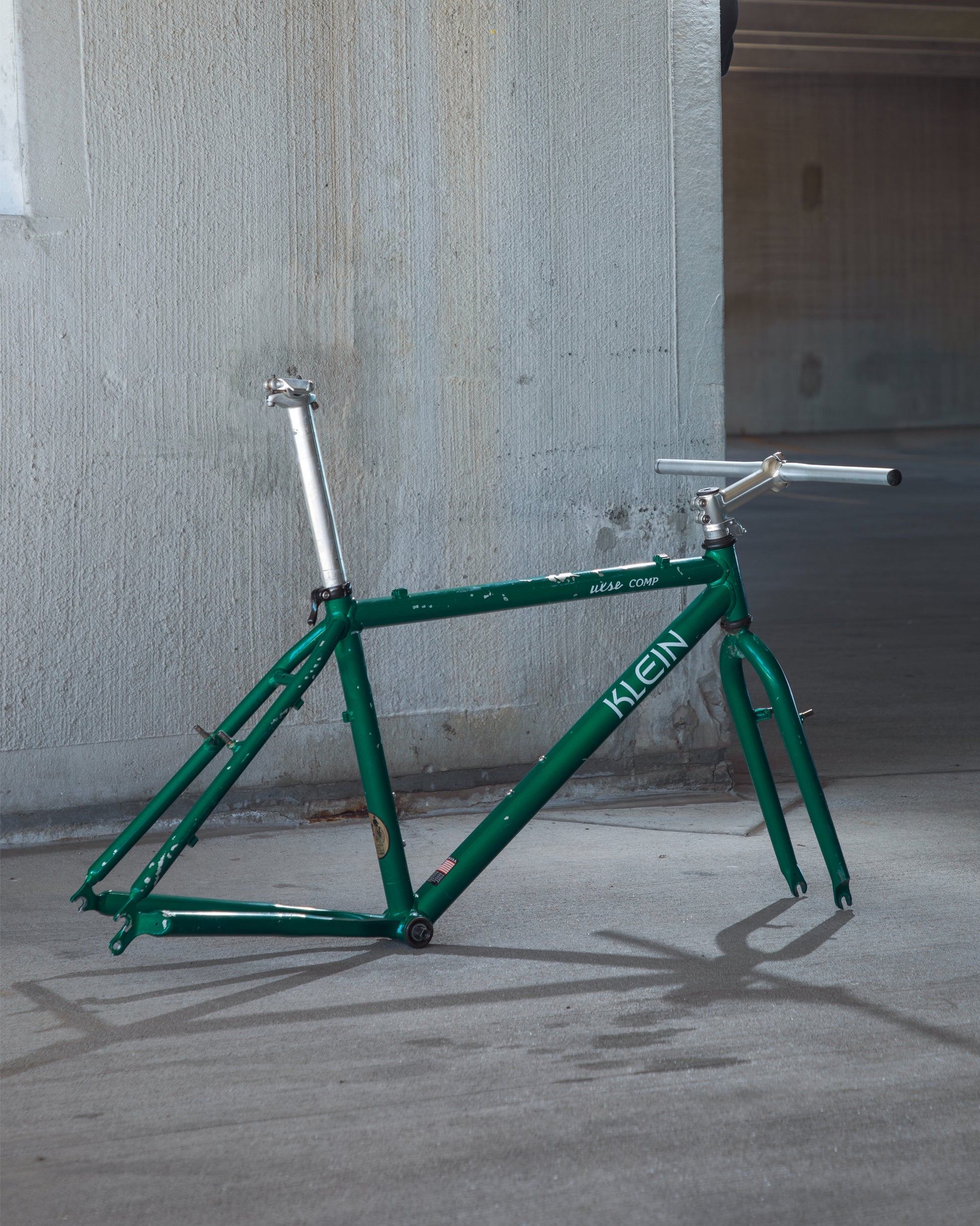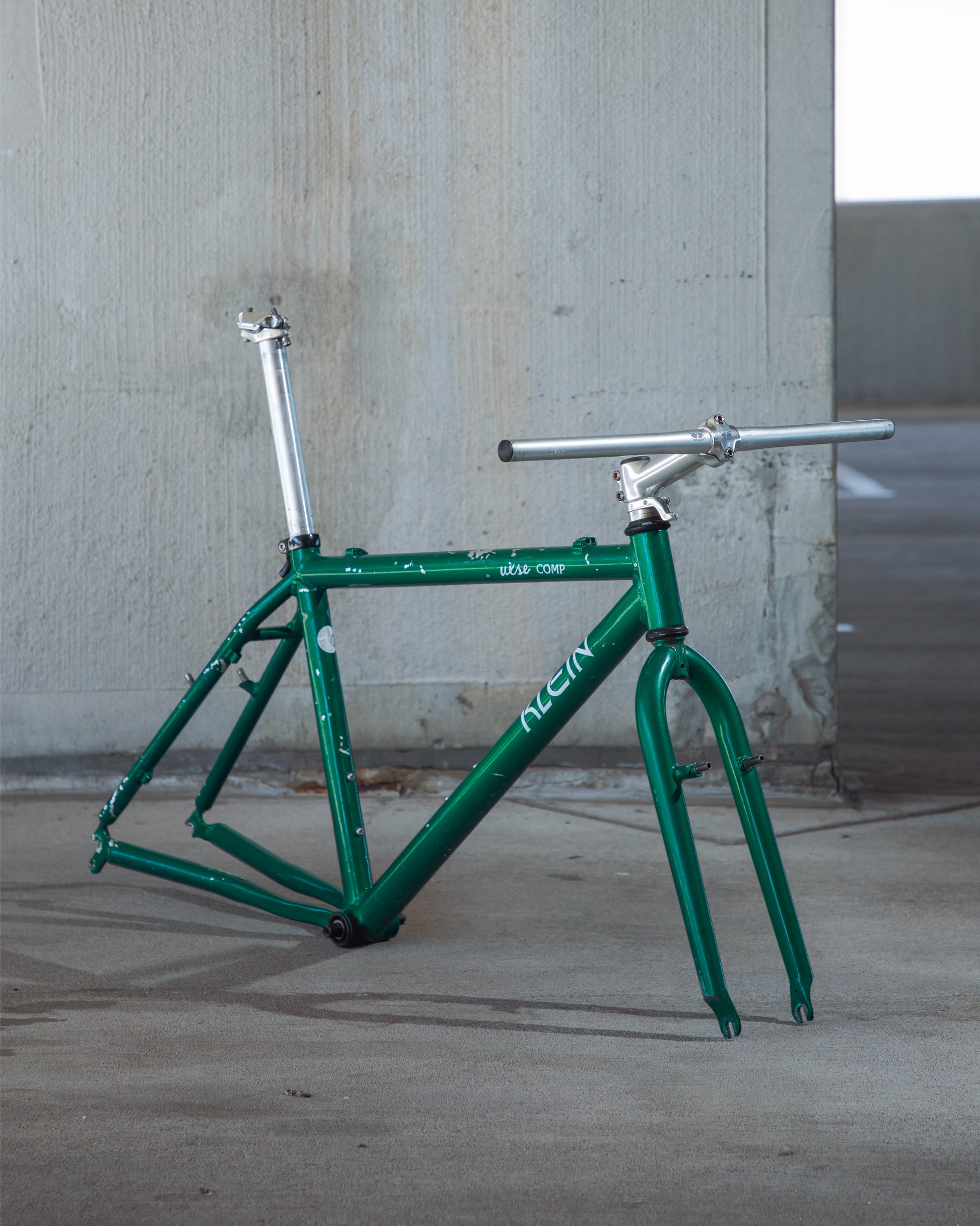 Beat, battered, bruised, but not broken. This Klein Pulse Comp has seen its fair share of trail, but no dents, bends, or cracks. The paint is all chipped up throughout the frame. The bones are good! Keep it as is or repaint it! Comes with seatpost, bottom bracket, headset, stem, and handlebar. Both the headset and bottom bracket could use some fresh grease as they both feel tight. Lots of directions you can go building this up! Just needs some love. The frame is stamped as a 20" or size medium.