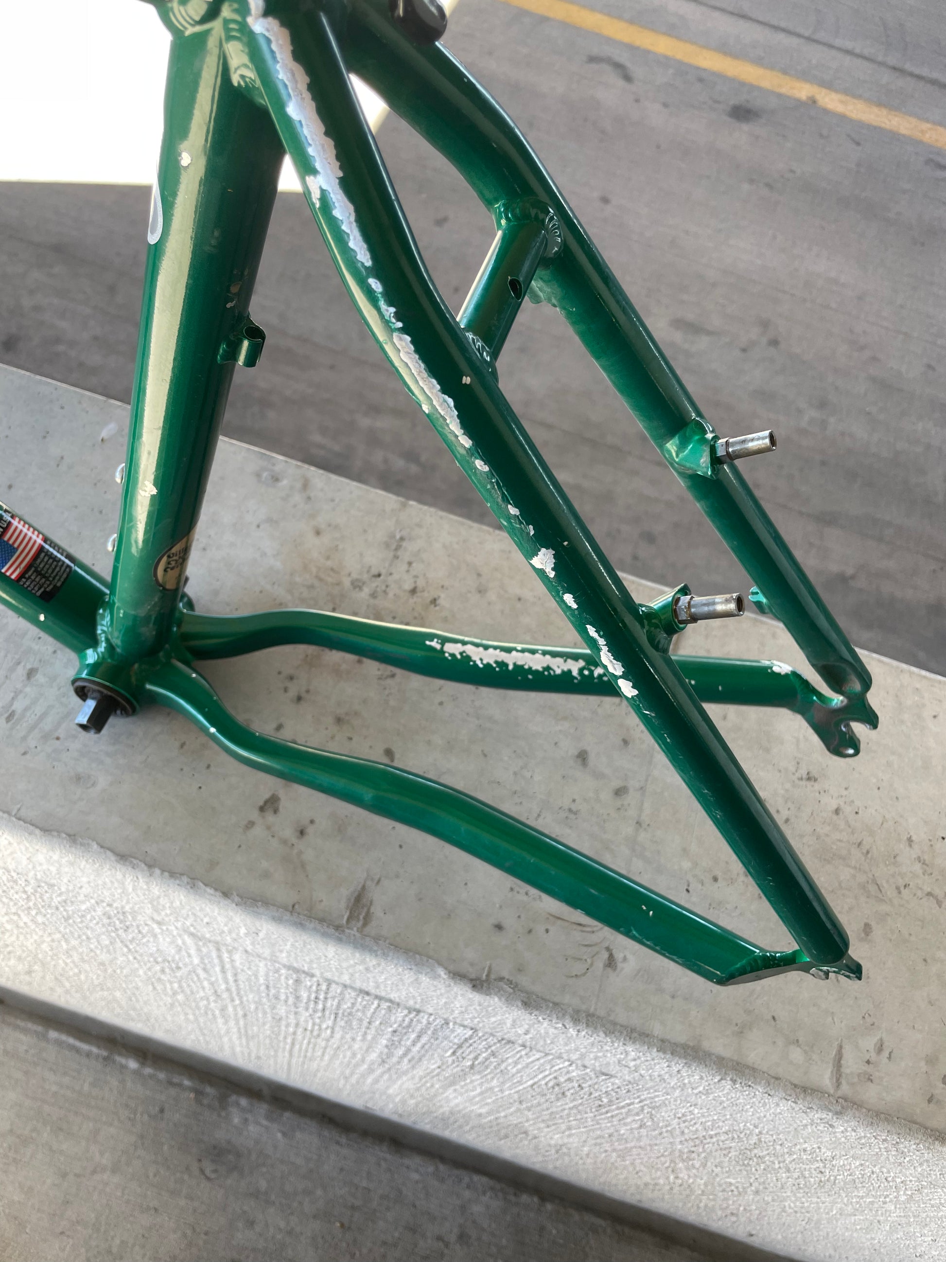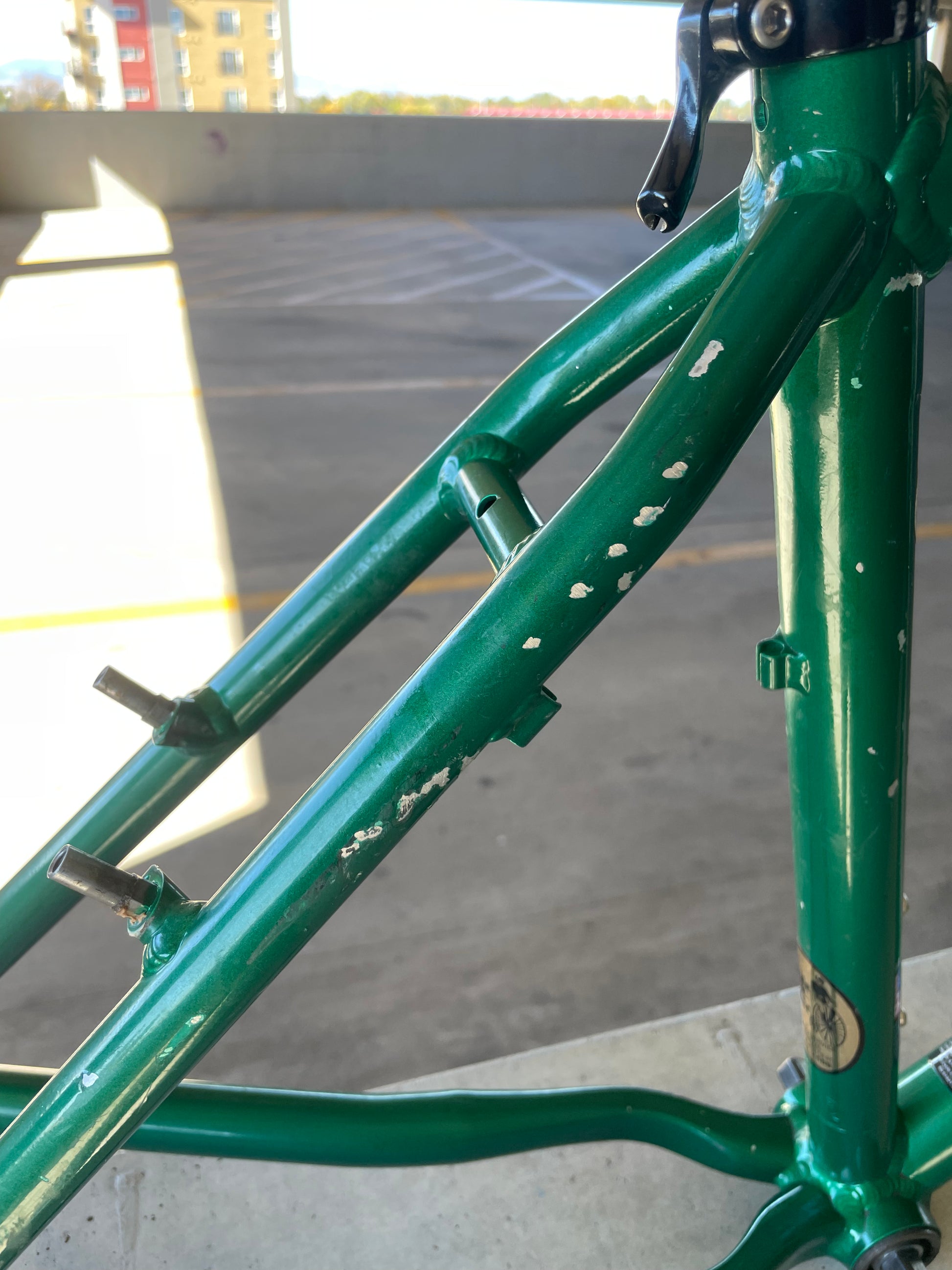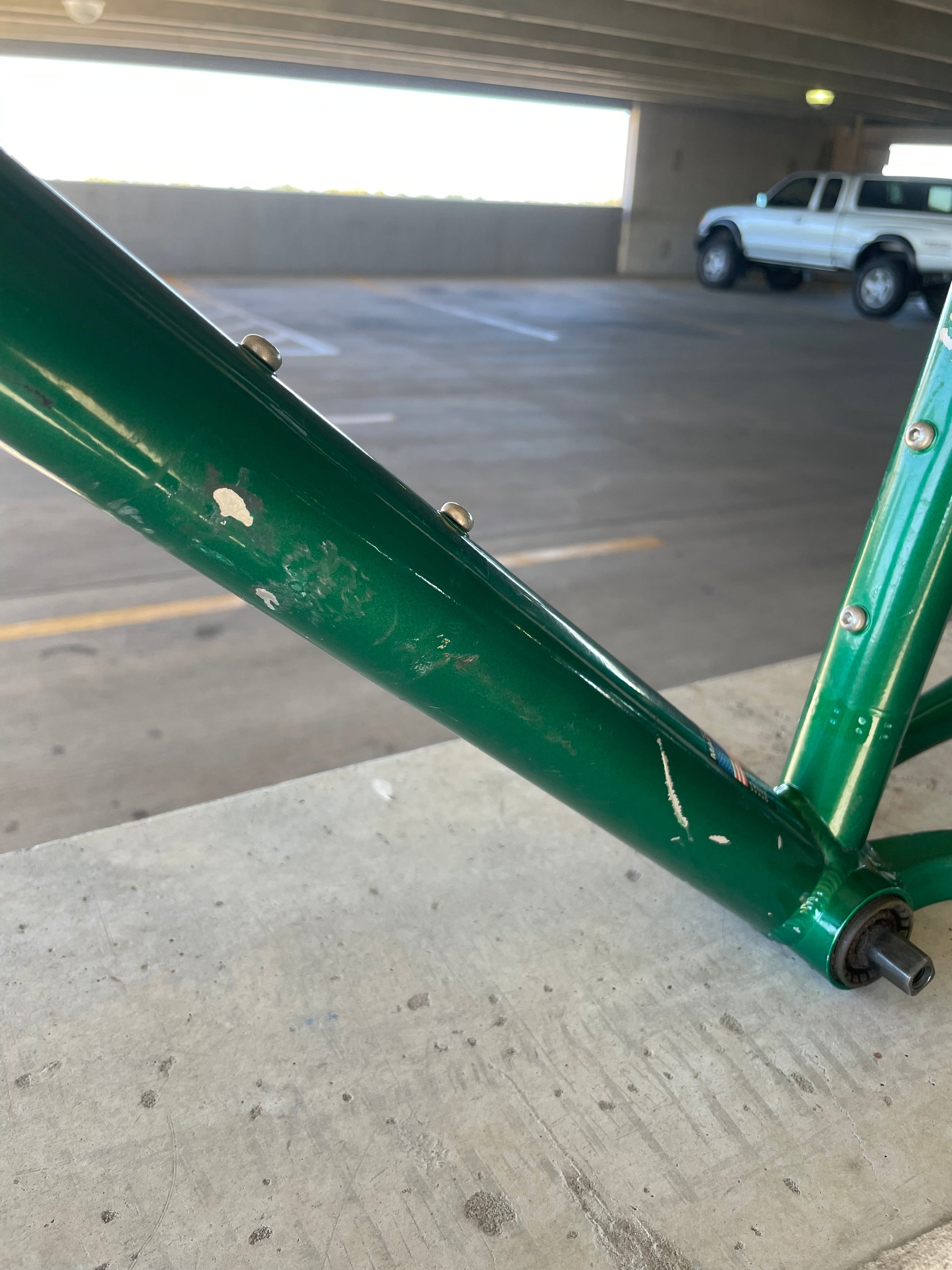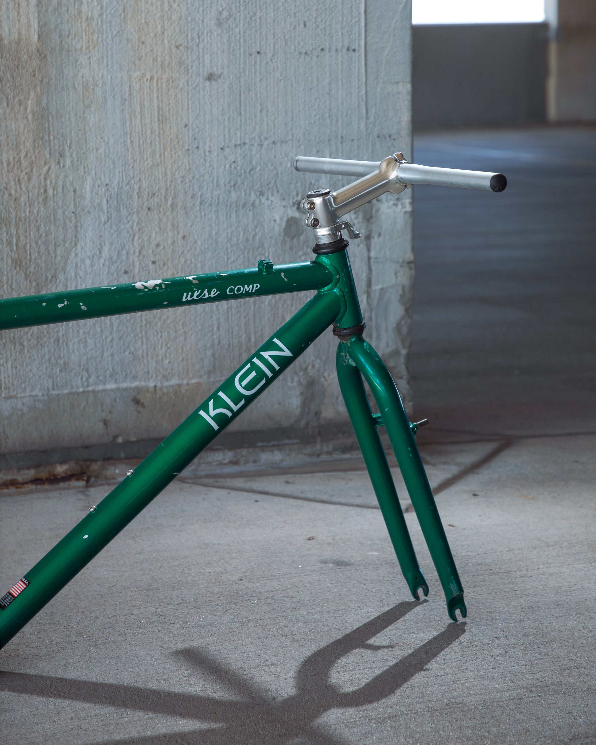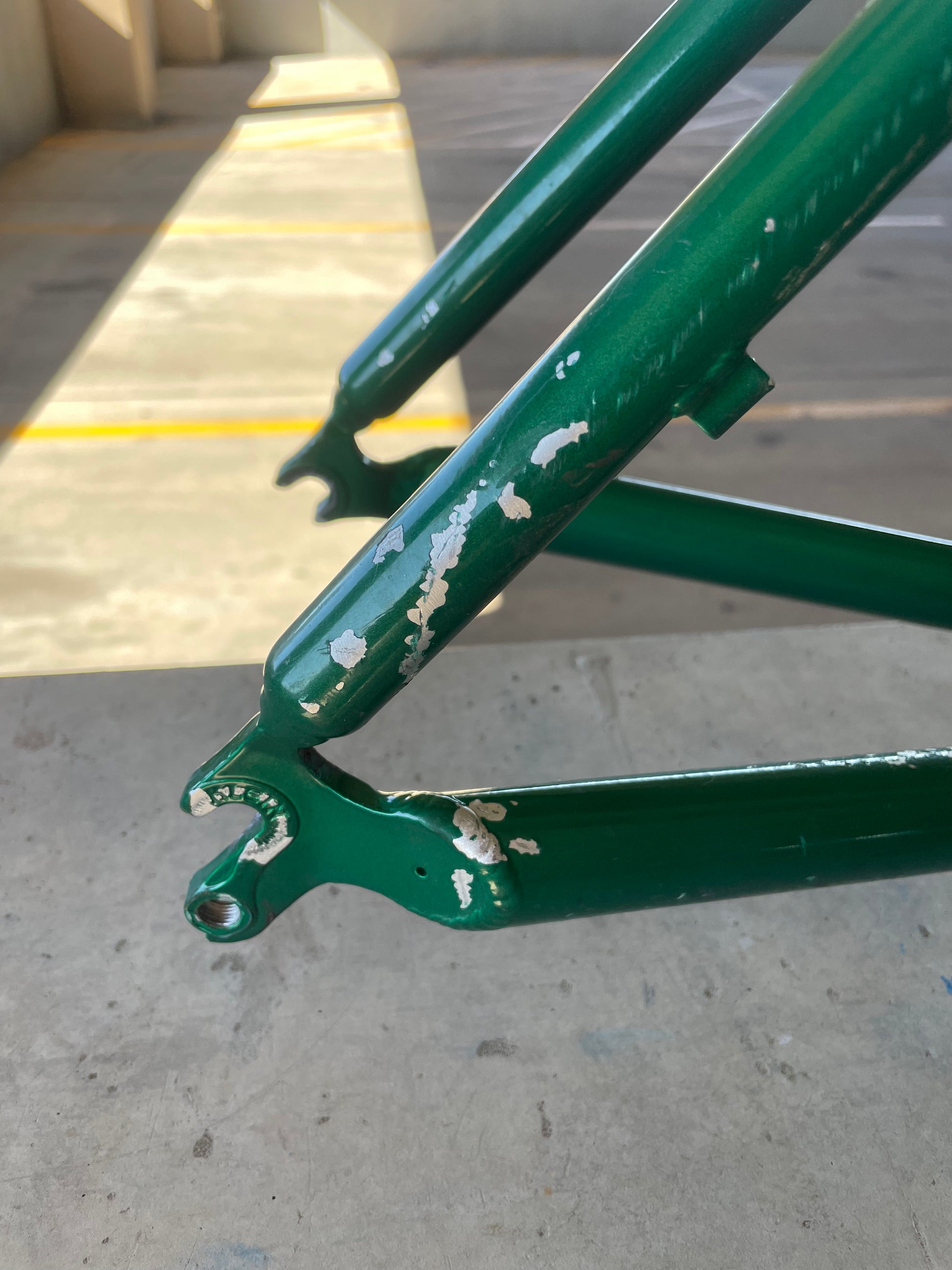 Beat, battered, bruised, but not broken. This Klein Pulse Comp has seen its fair share of trail, but no dents, bends, or cracks. The paint is all chipped up throughout the frame. The bones are good! Keep it as is or repaint it! Comes with seatpost, bottom bracket, headset, stem, and handlebar. Both the headset and bottom bracket could use some fresh grease as they both feel tight. Lots of directions you can go building this up! Just needs some love. The frame is stamped as a 20" or size medium.