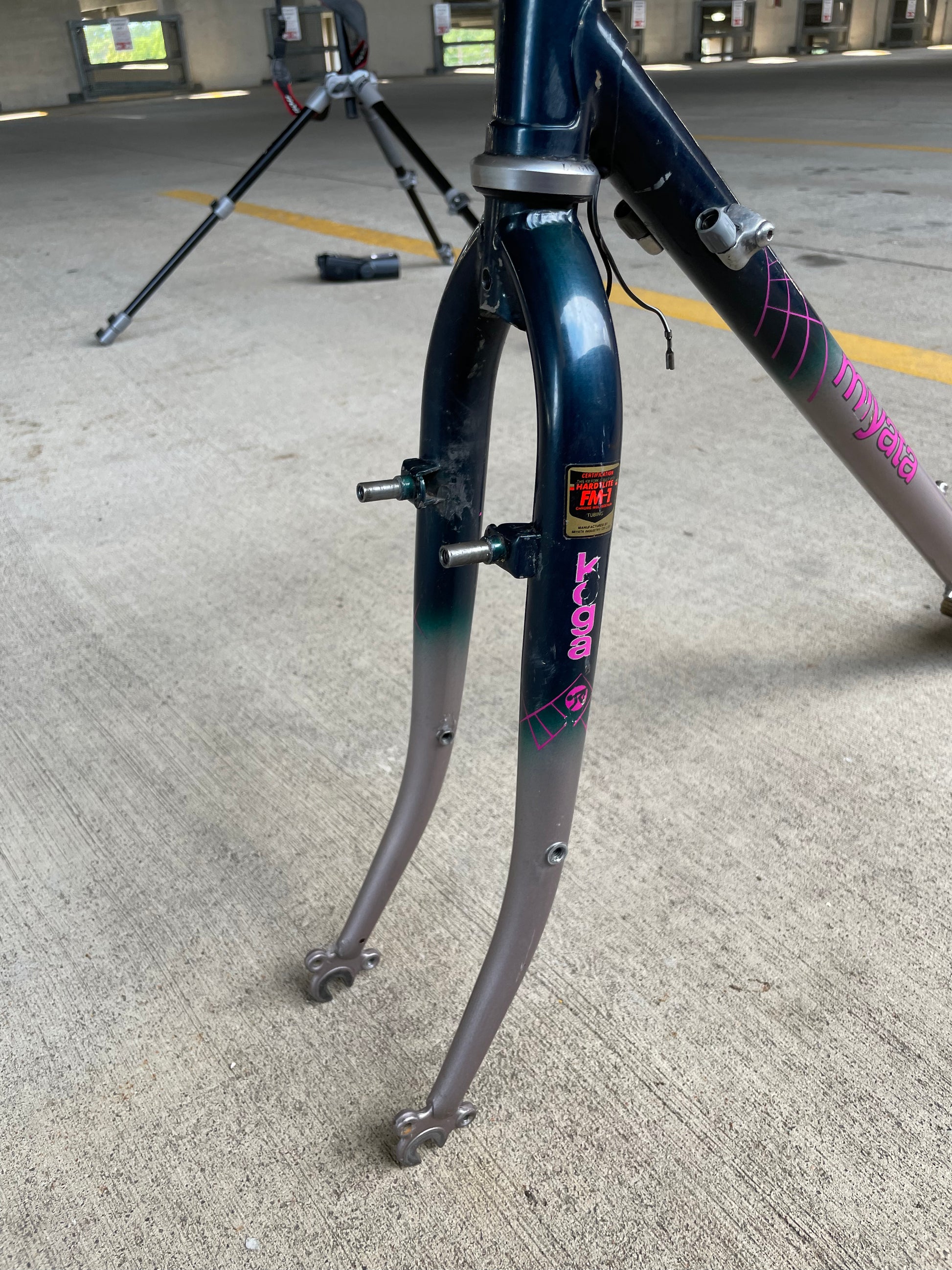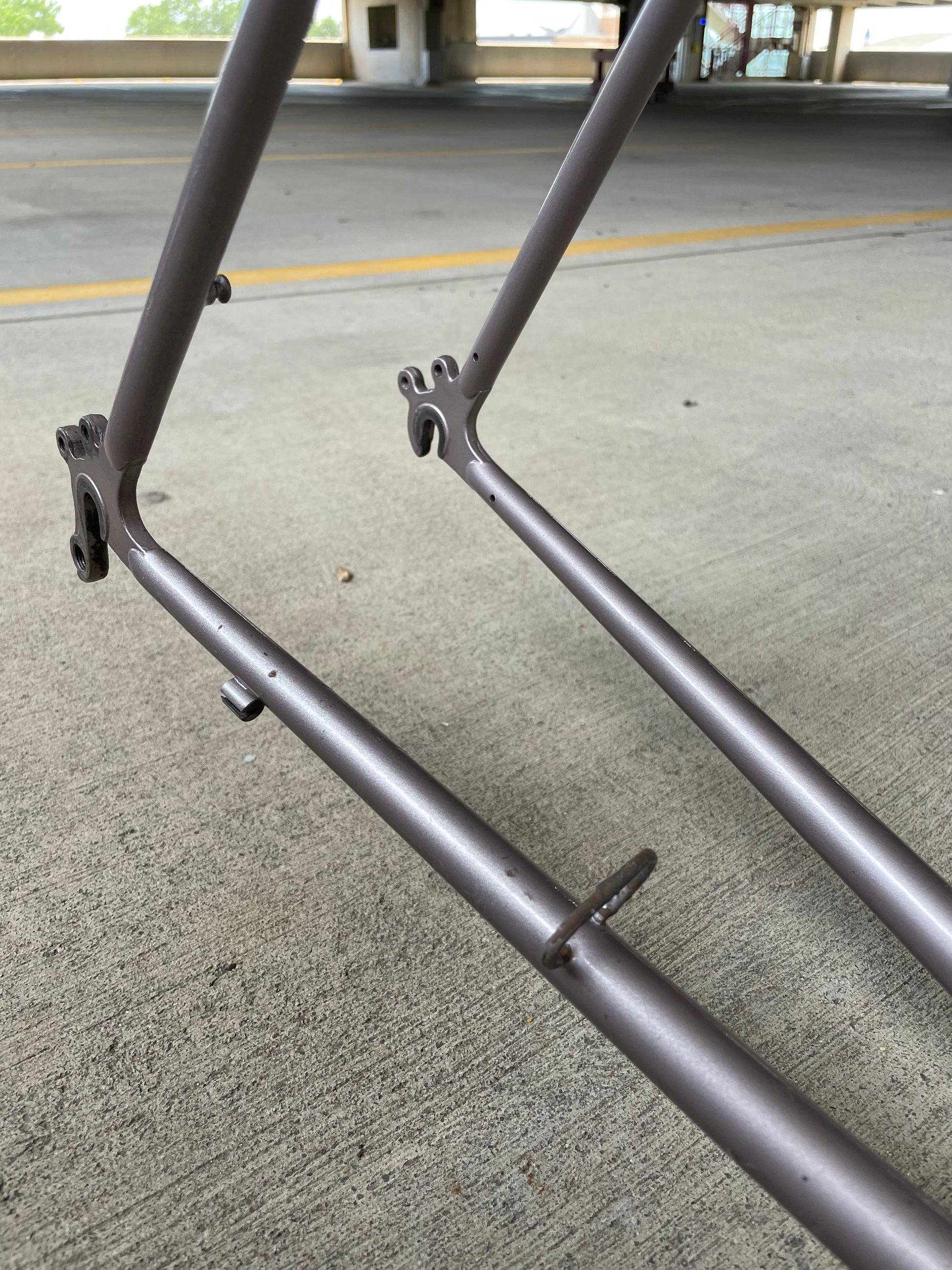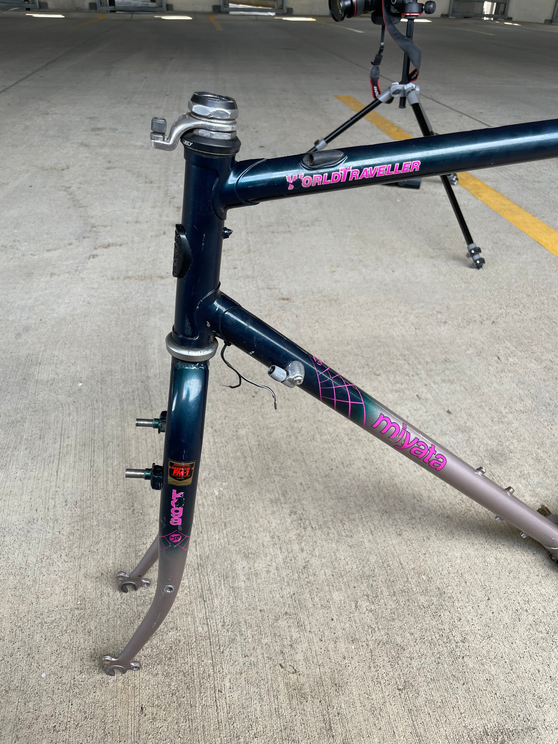 The World Traveller was one of the best touring bikes on the market in the early 90's. It has mounts for both racks and fenders. 3 bottle cage mounts. Routing for a front light and finally, a mount for a third shifter on the seat tube (do with that what you will). It's very versatile, even compared to todays standards. It's in good condition bit shows sign of use. The paint is chipping in areas. No dents or cracks. It was given a very quick clean but could use a deeper one. Neither headset or bottom bracket have been inspected. Front end shows paint cracking around lugs. Please see all photos to get a better understanding as to the condition this frame is in.