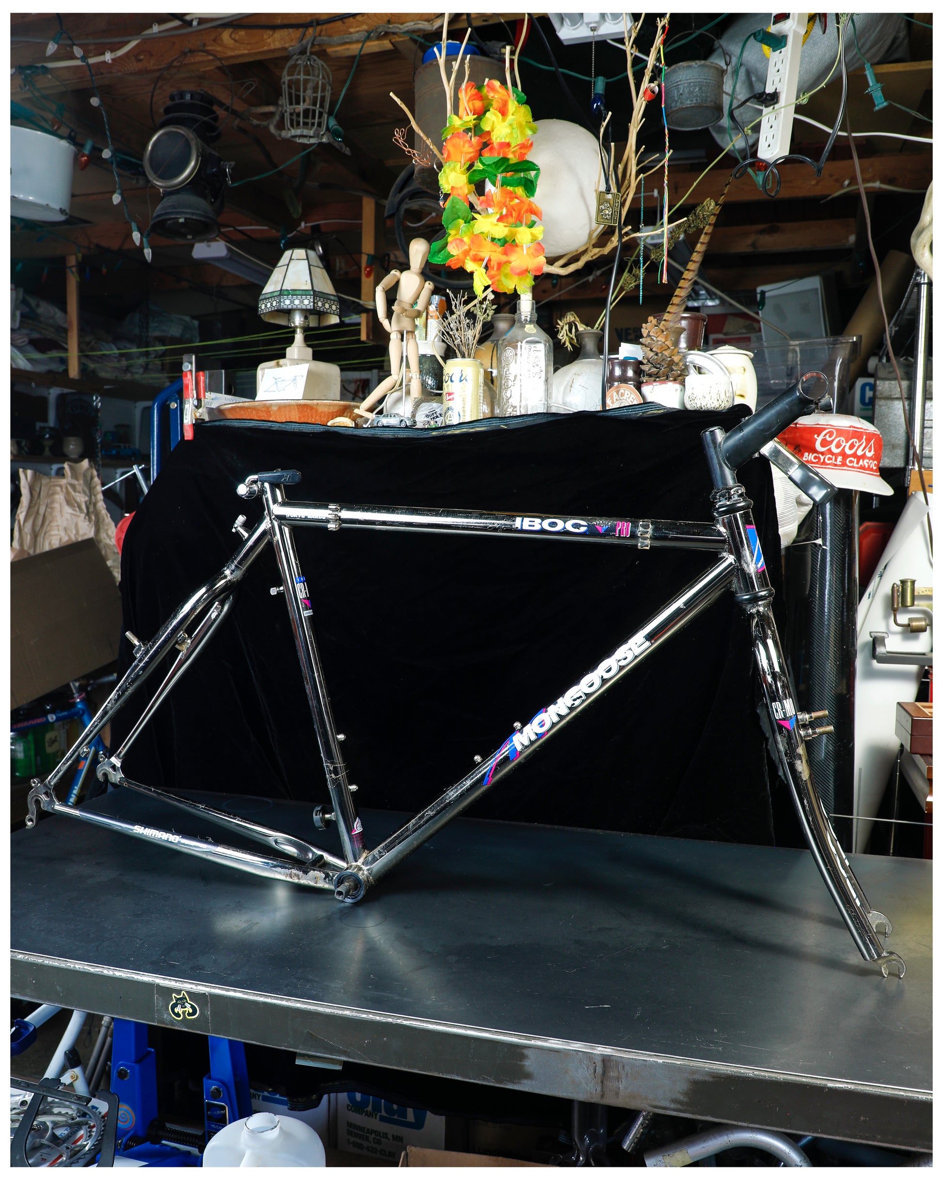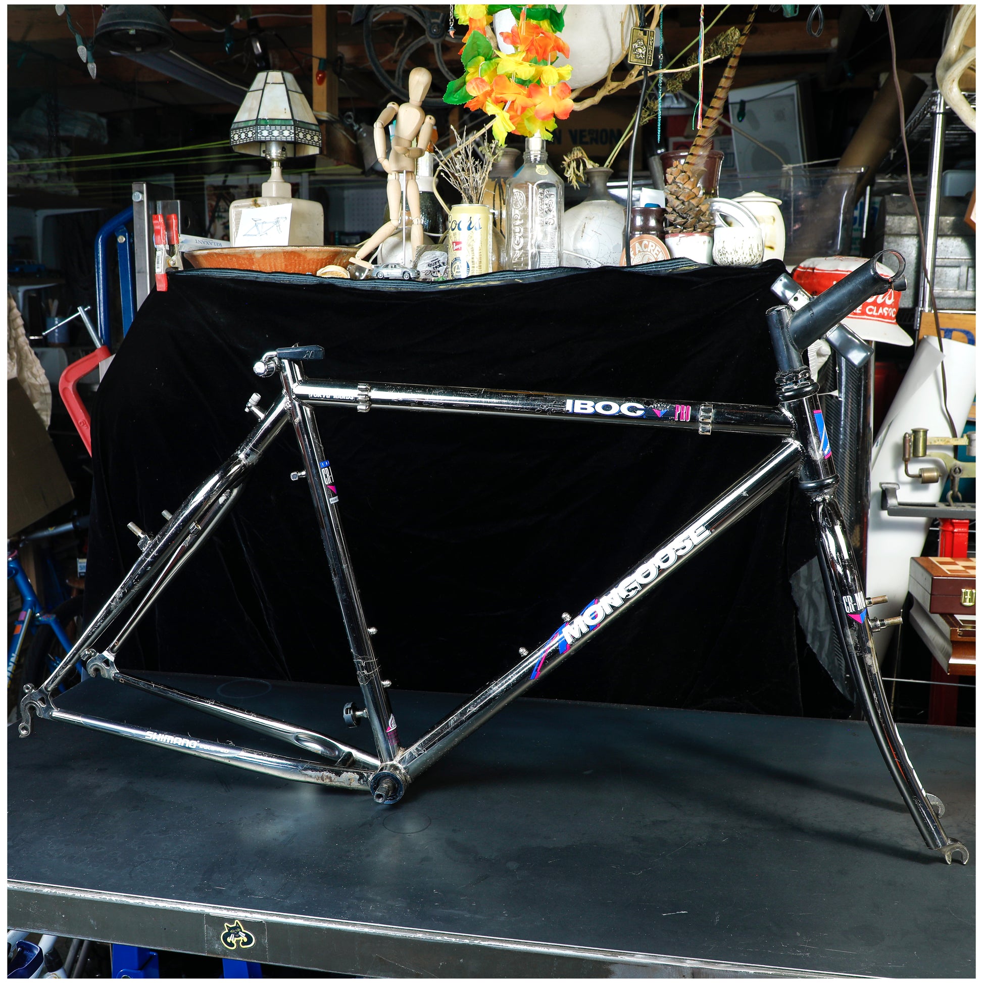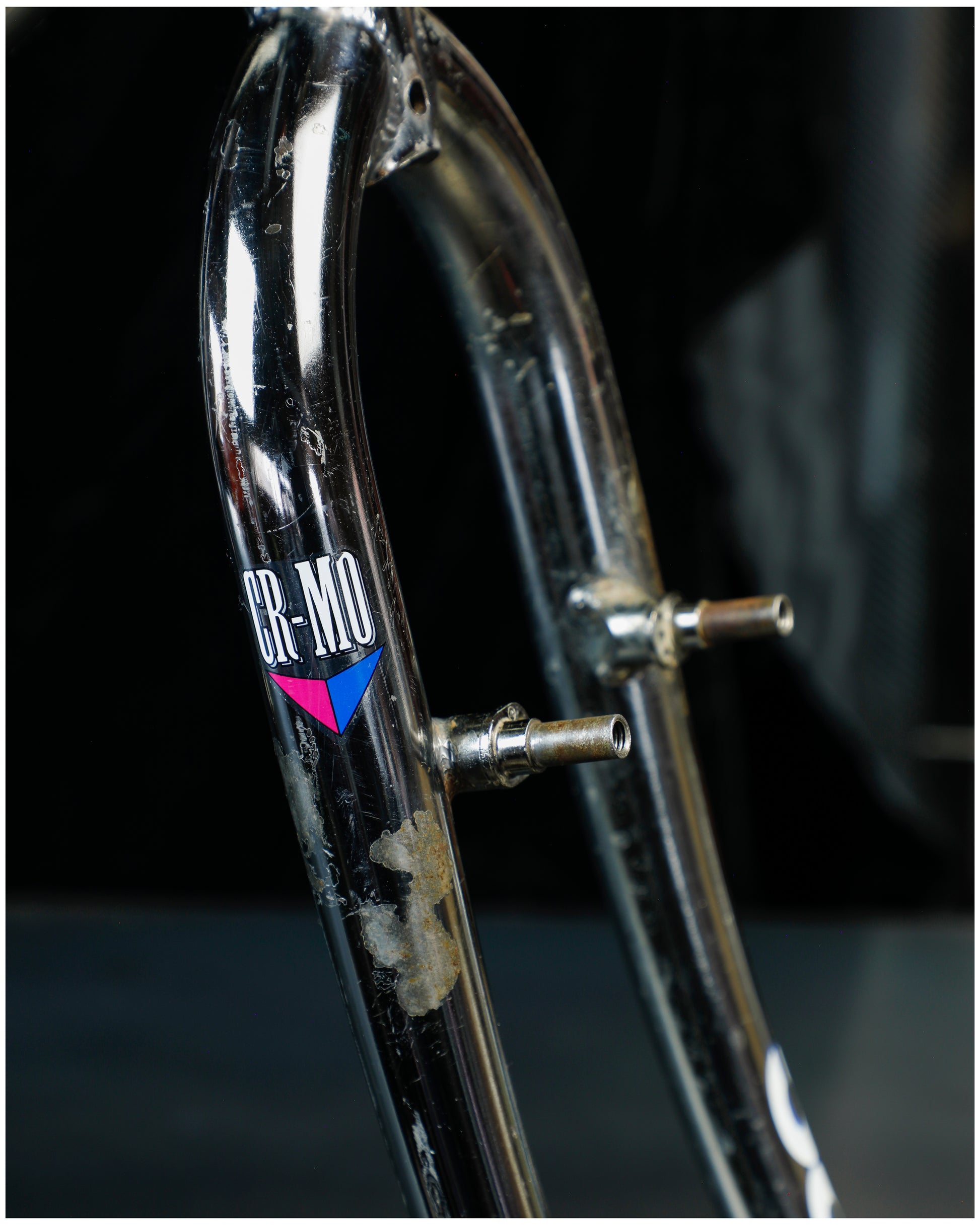 This 26" mtb frame is quite the sight to behold! The smoked chrome is very unique. That paired with the color splash from the logos will surely turn some heads on the trail. The frame shows sign of use, with scratches throughout. The decals are in pretty good shape. There are no dents or cracks in the frame. The headset also shows wear but was given a good clean and rebuild. The bottom bracket cup on the left (non drive) side has some damage - the outer lip is broken off. I was still able to get a tool in and clean the bb as well as the bb shell. The stem is 110mm and is included!