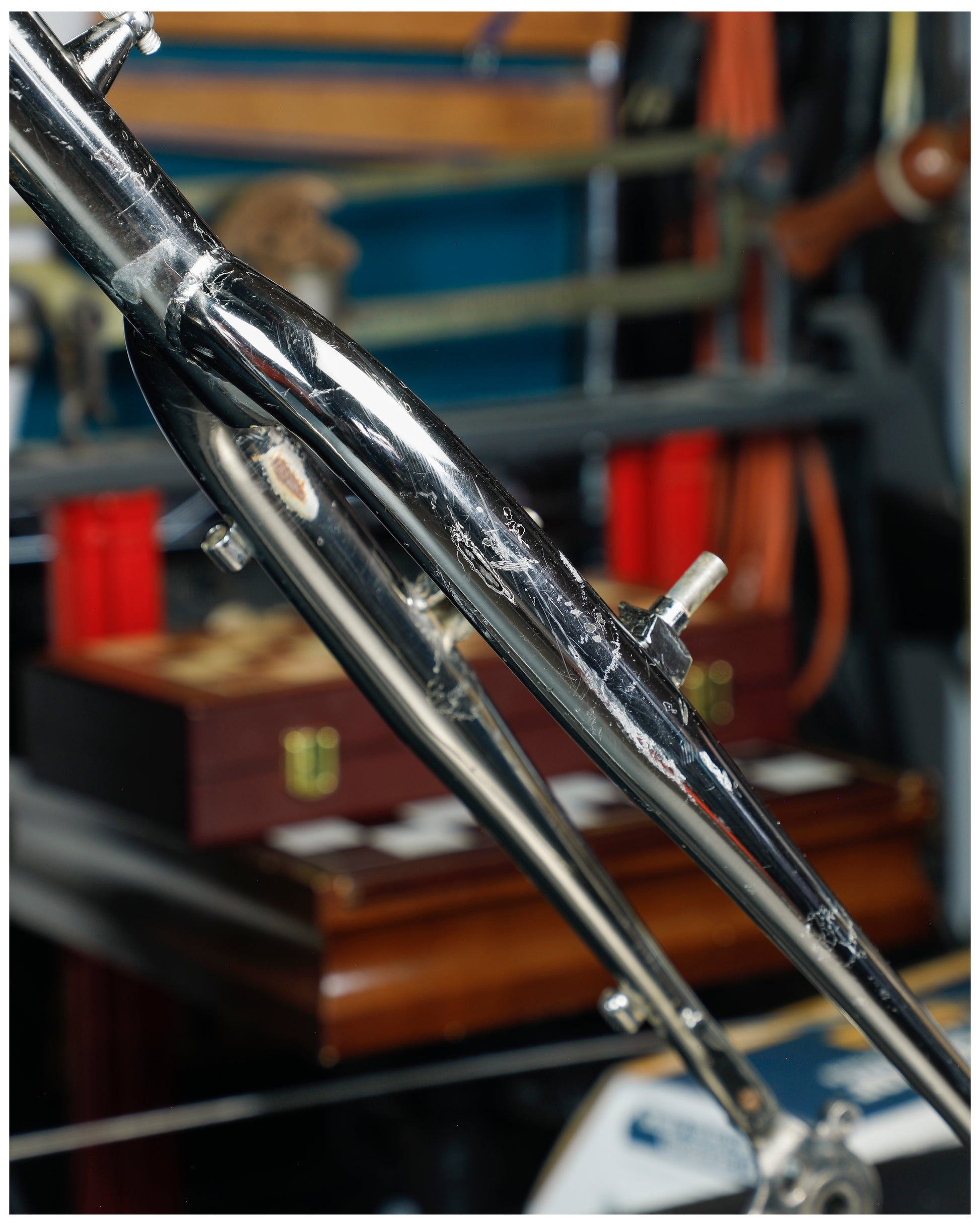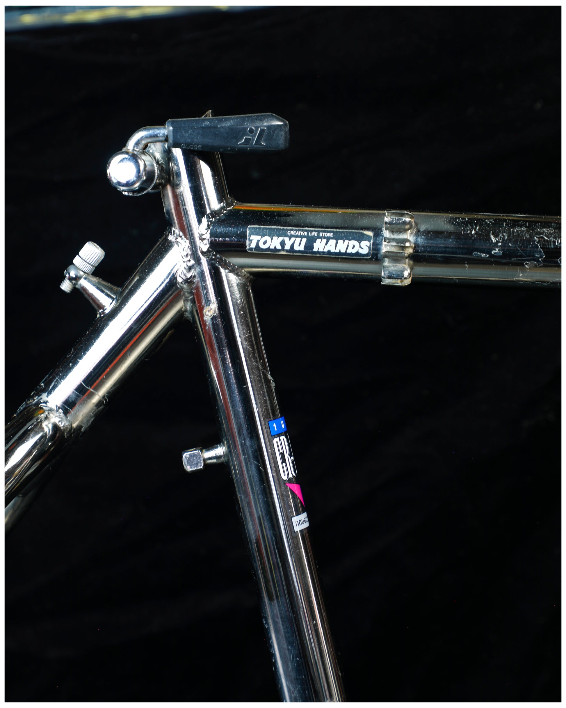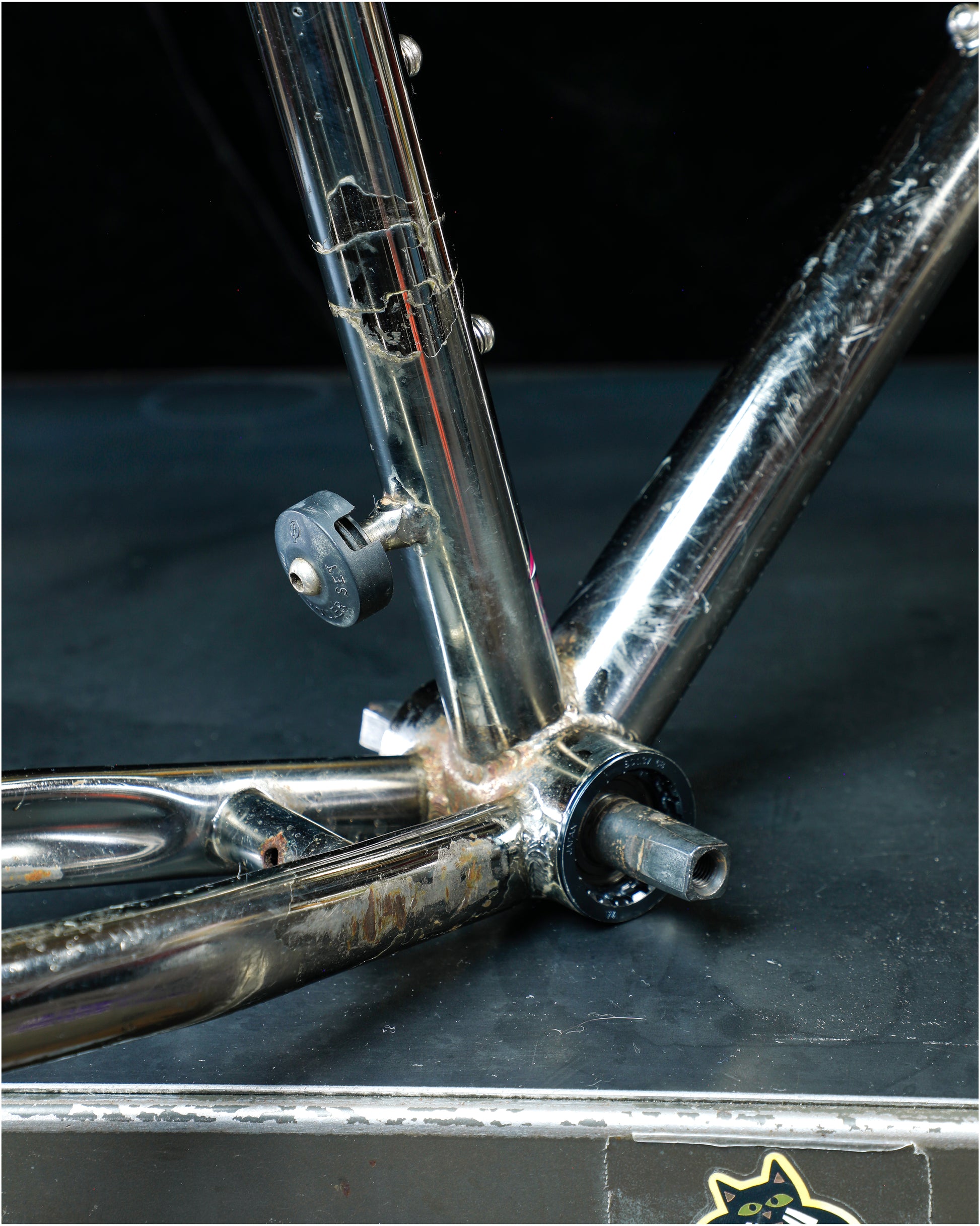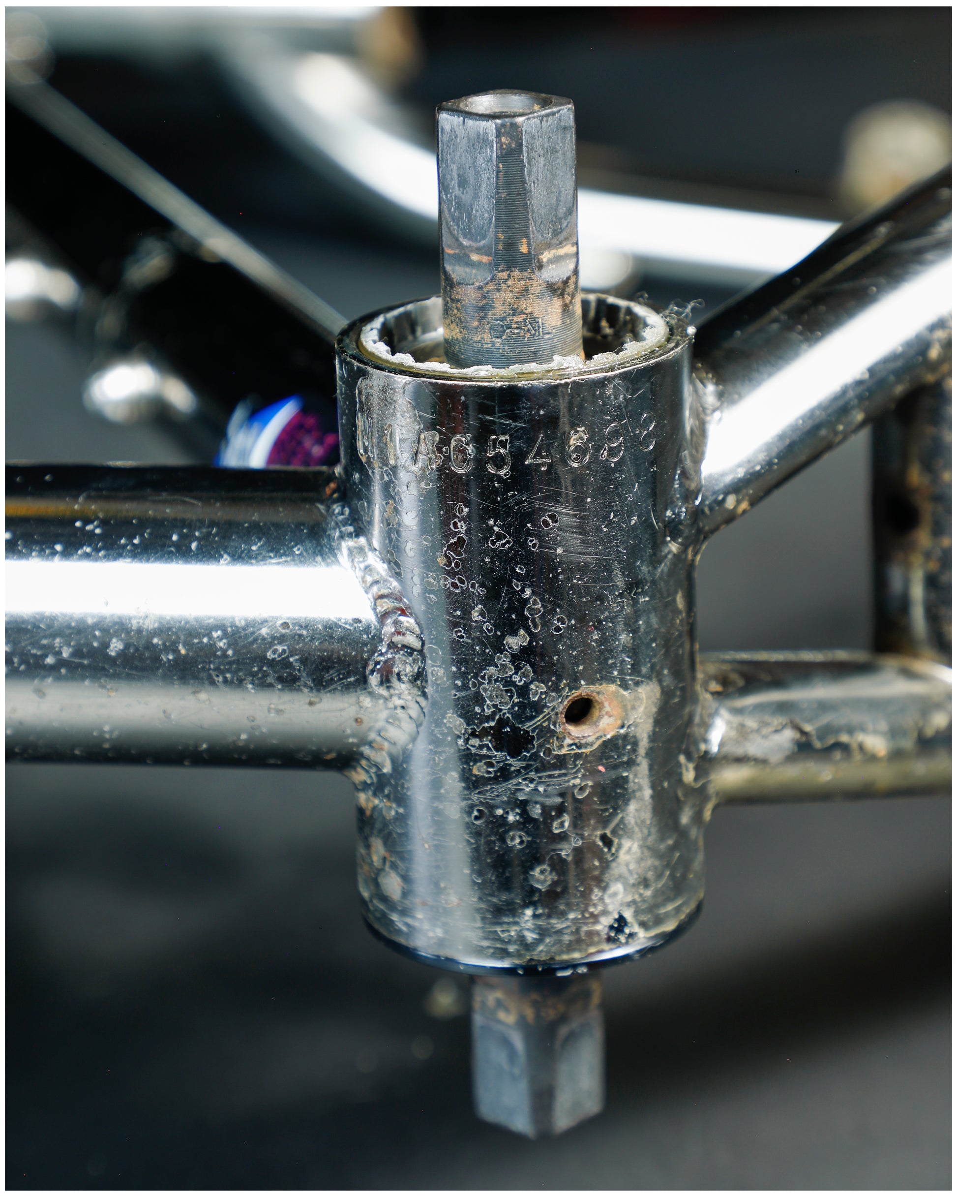 This 26" mtb frame is quite the sight to behold! The smoked chrome is very unique. That paired with the color splash from the logos will surely turn some heads on the trail. The frame shows sign of use, with scratches throughout. The decals are in pretty good shape. There are no dents or cracks in the frame. The headset also shows wear but was given a good clean and rebuild. The bottom bracket cup on the left (non drive) side has some damage - the outer lip is broken off. I was still able to get a tool in and clean the bb as well as the bb shell. The stem is 110mm and is included!