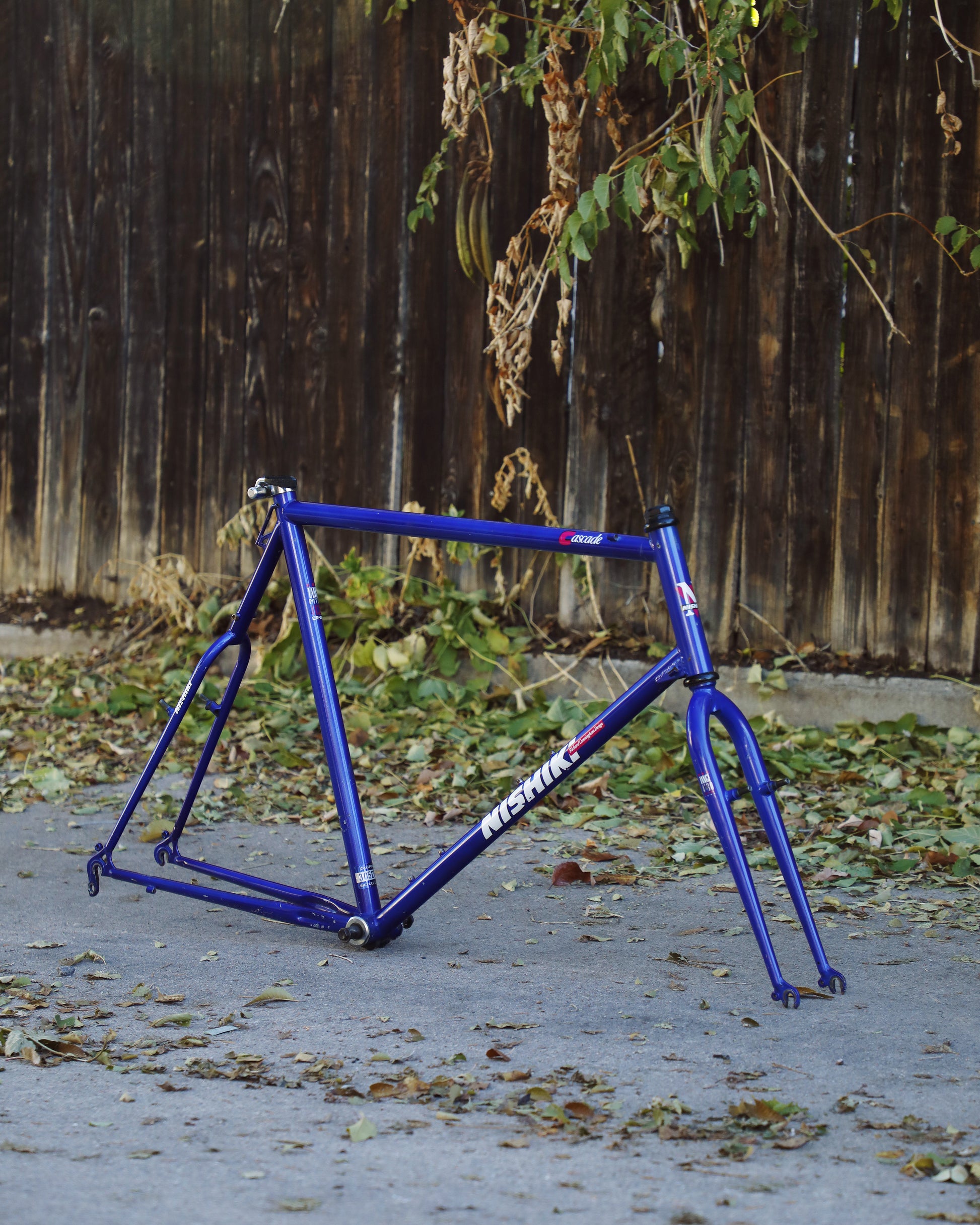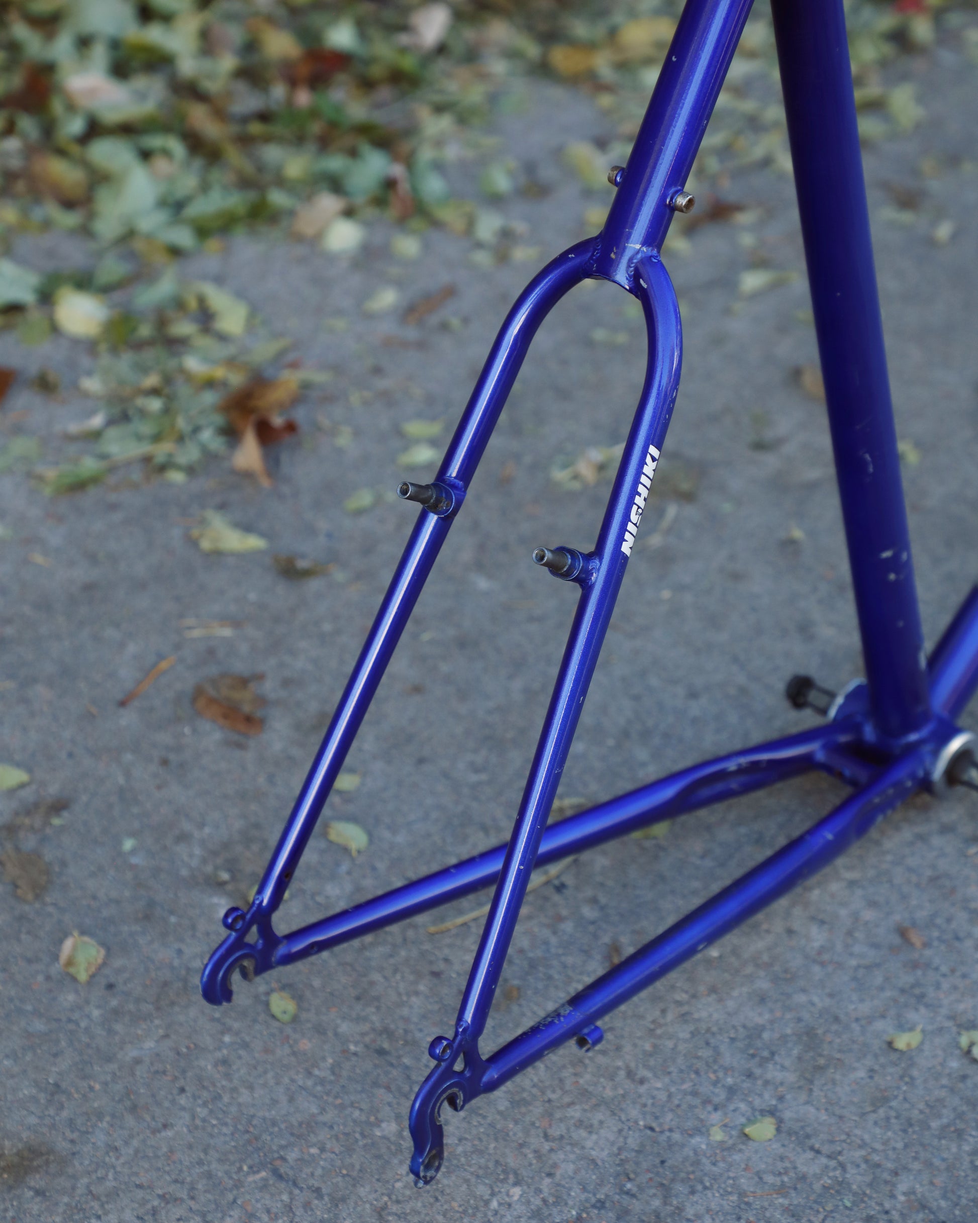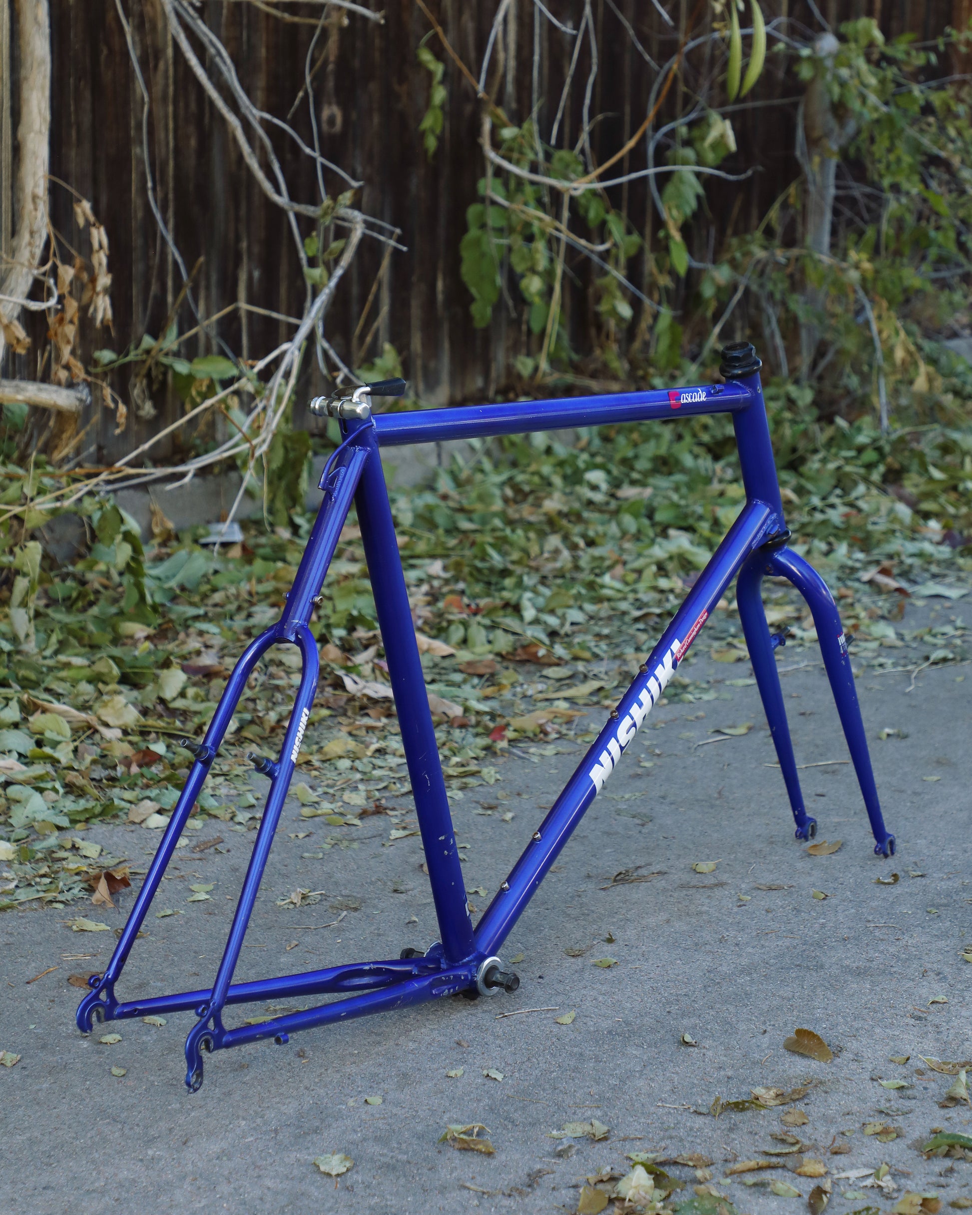 This rather large Nishiki Cascade frame is in good condition but shows sign of use. There are some paint chips here and there, but no dents, bends, or cracks. The rear triangle is an awesome design that looks a lot different compared to other mountain bikes of the time. The headset and bottom bracket have not been rebuilt but feel ok. Lot of different directions one could take on this build.