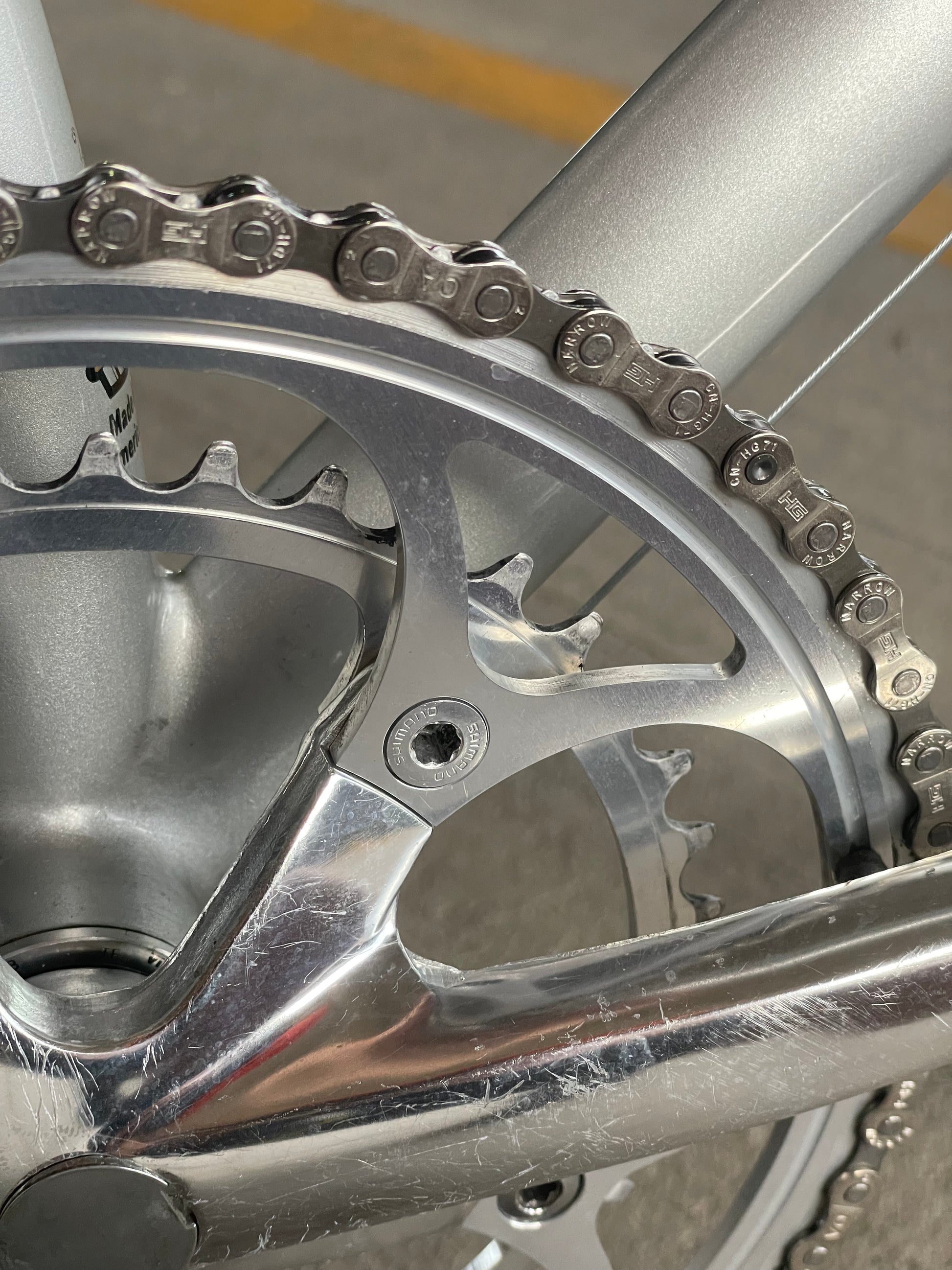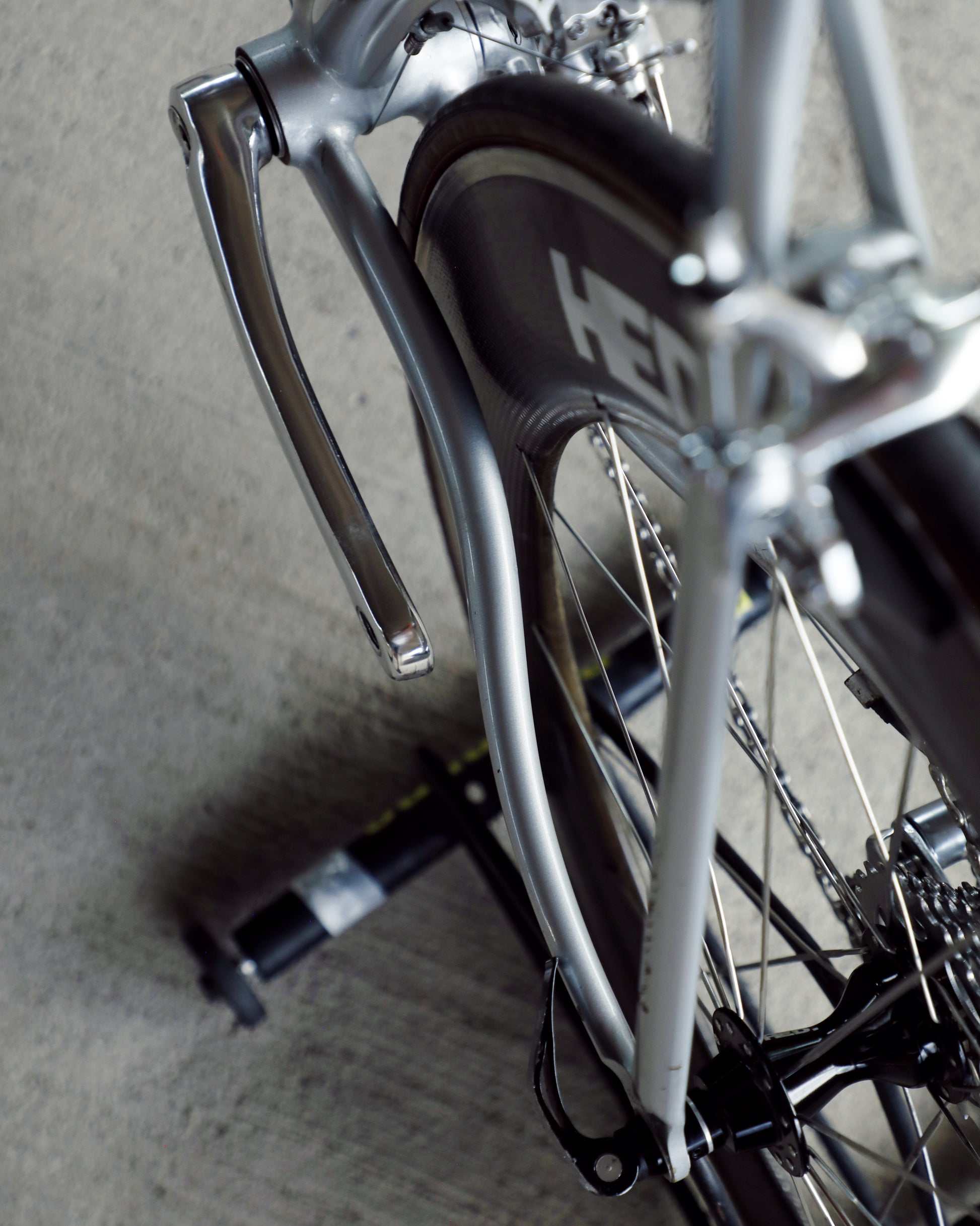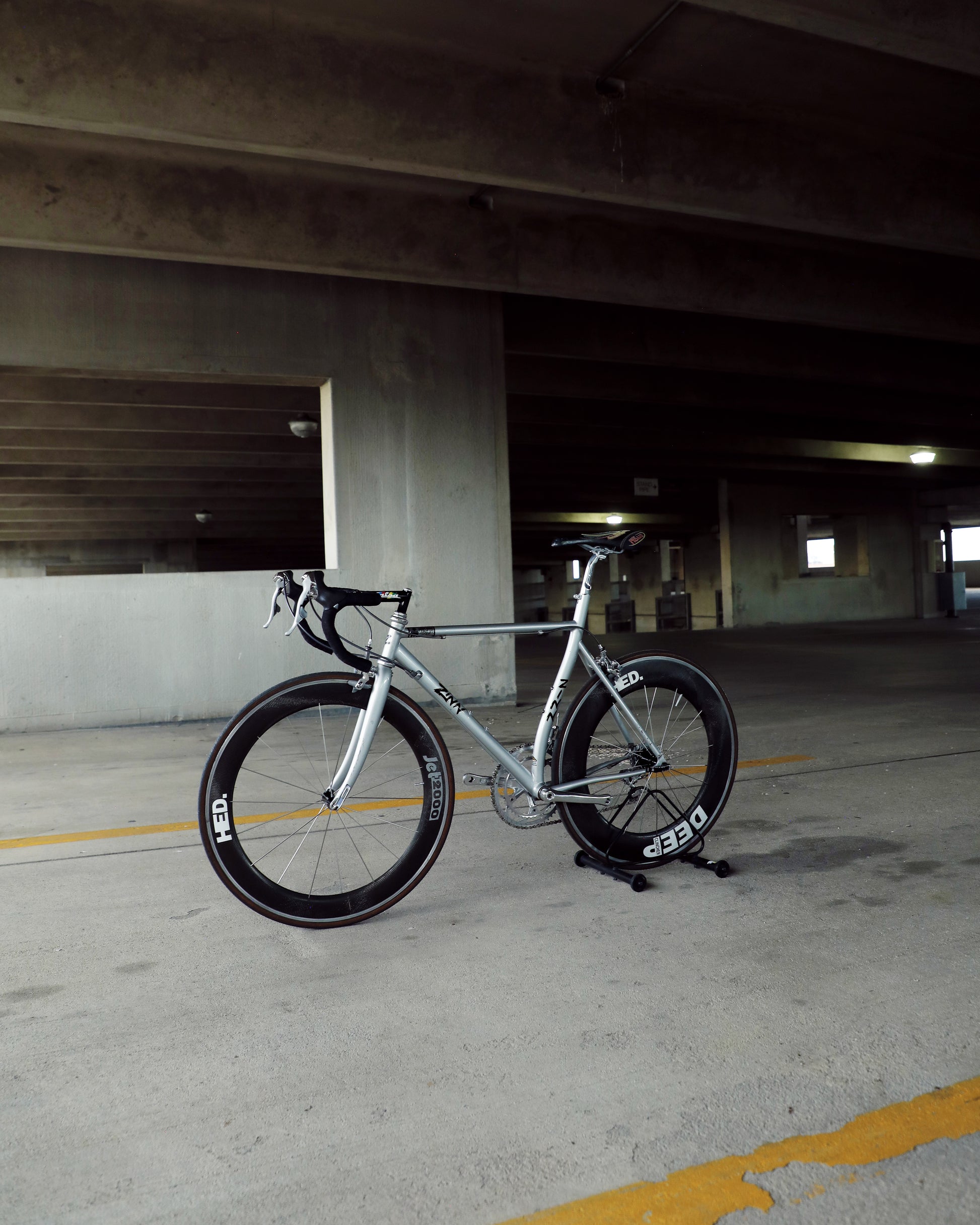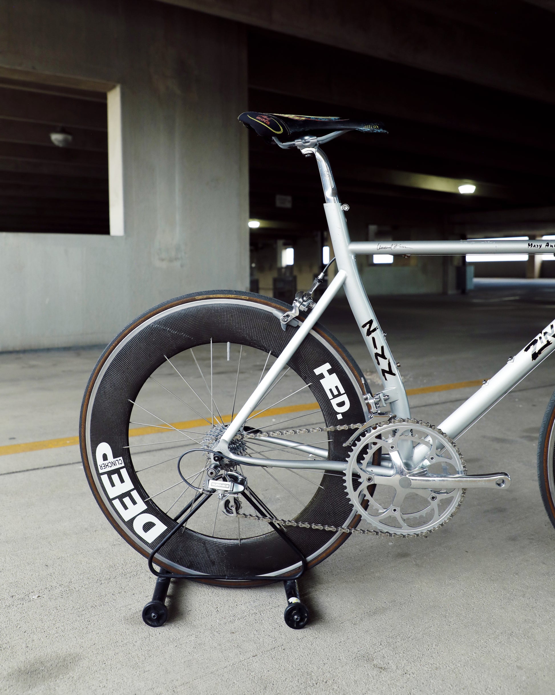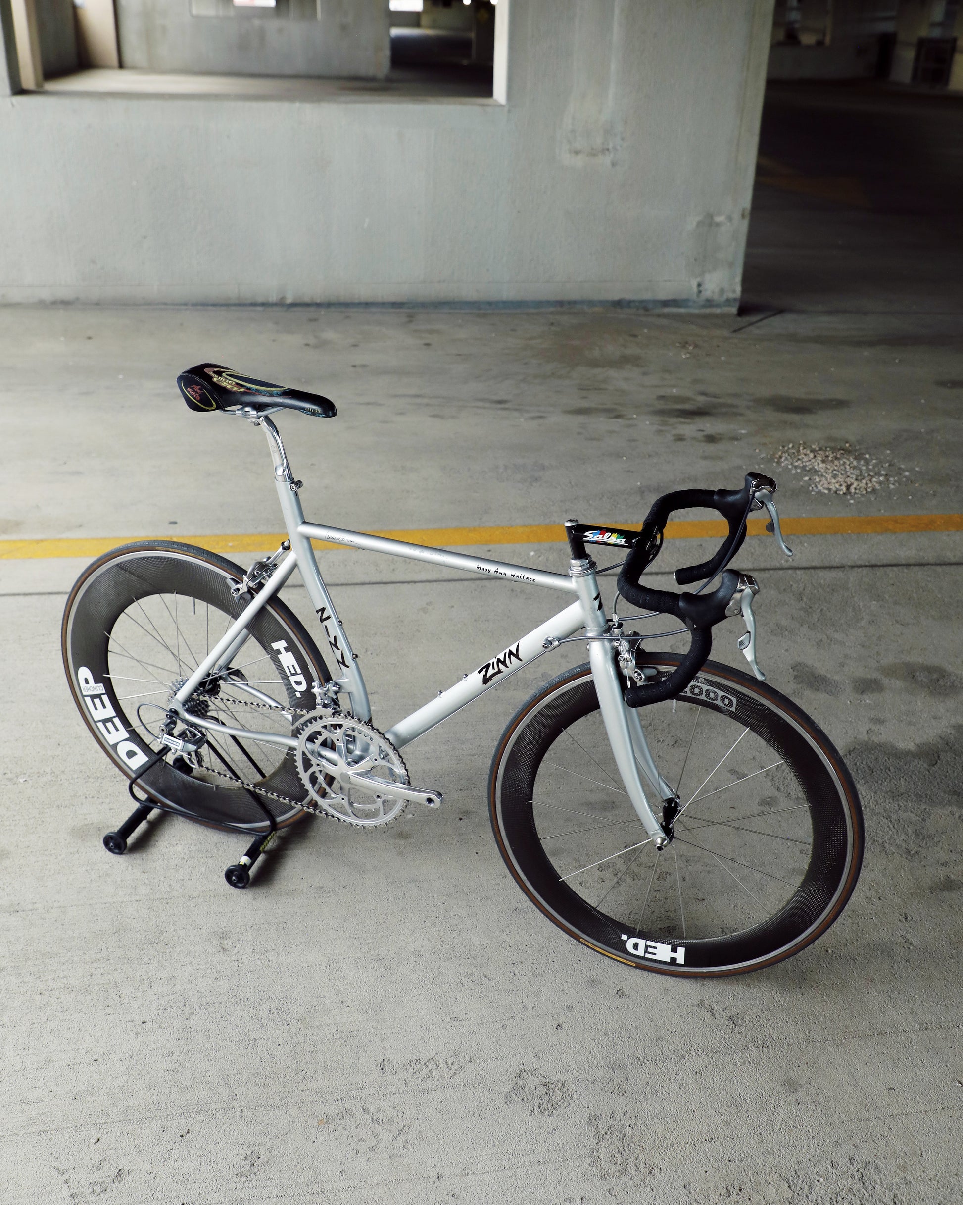 The gorgeous Zinn Triathlon bike comes incredibly well equipped and is a fast bike, even by today's standards. It was built in the late 90's by Zinn in the USA. Zinn is known for making bikes for people on the taller end, so it's rare to see such a small bike like this from the American company. It has an almost complete Dura-Ace groupset with a Campy seatpost, Salsa stem, and CPI cransket. The deep dish HED wheels really ties everything together.