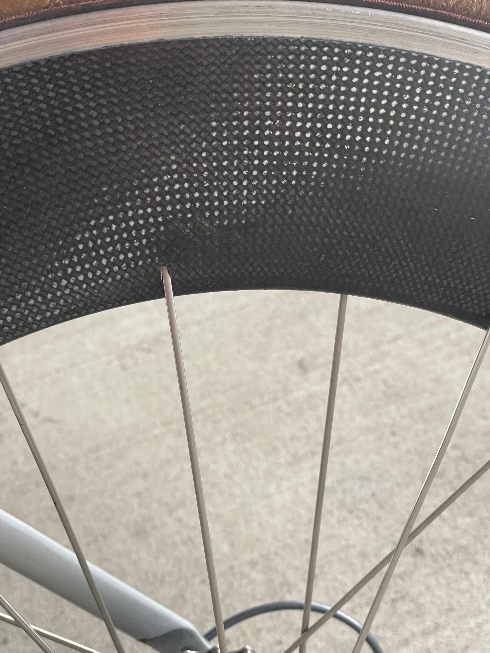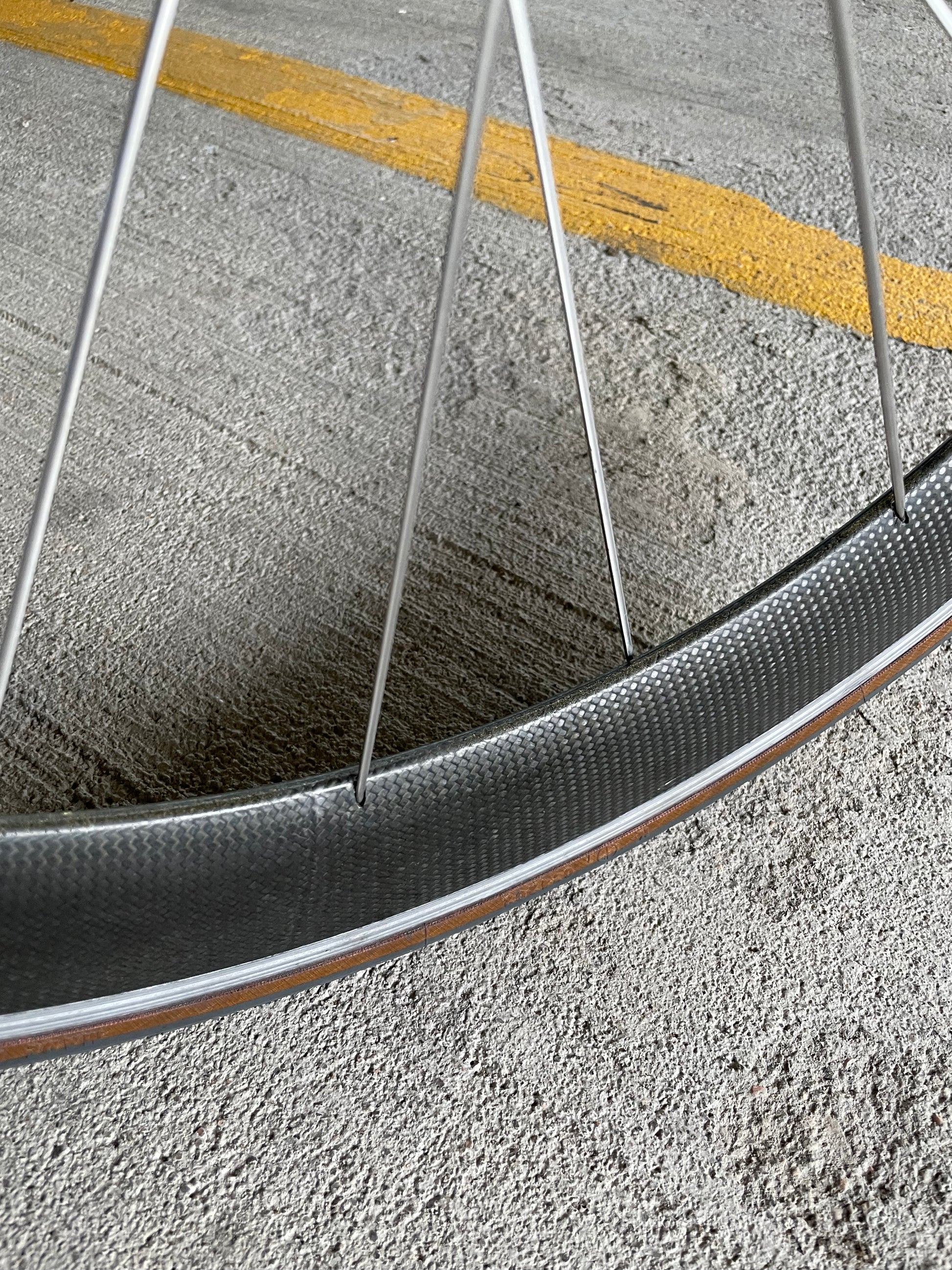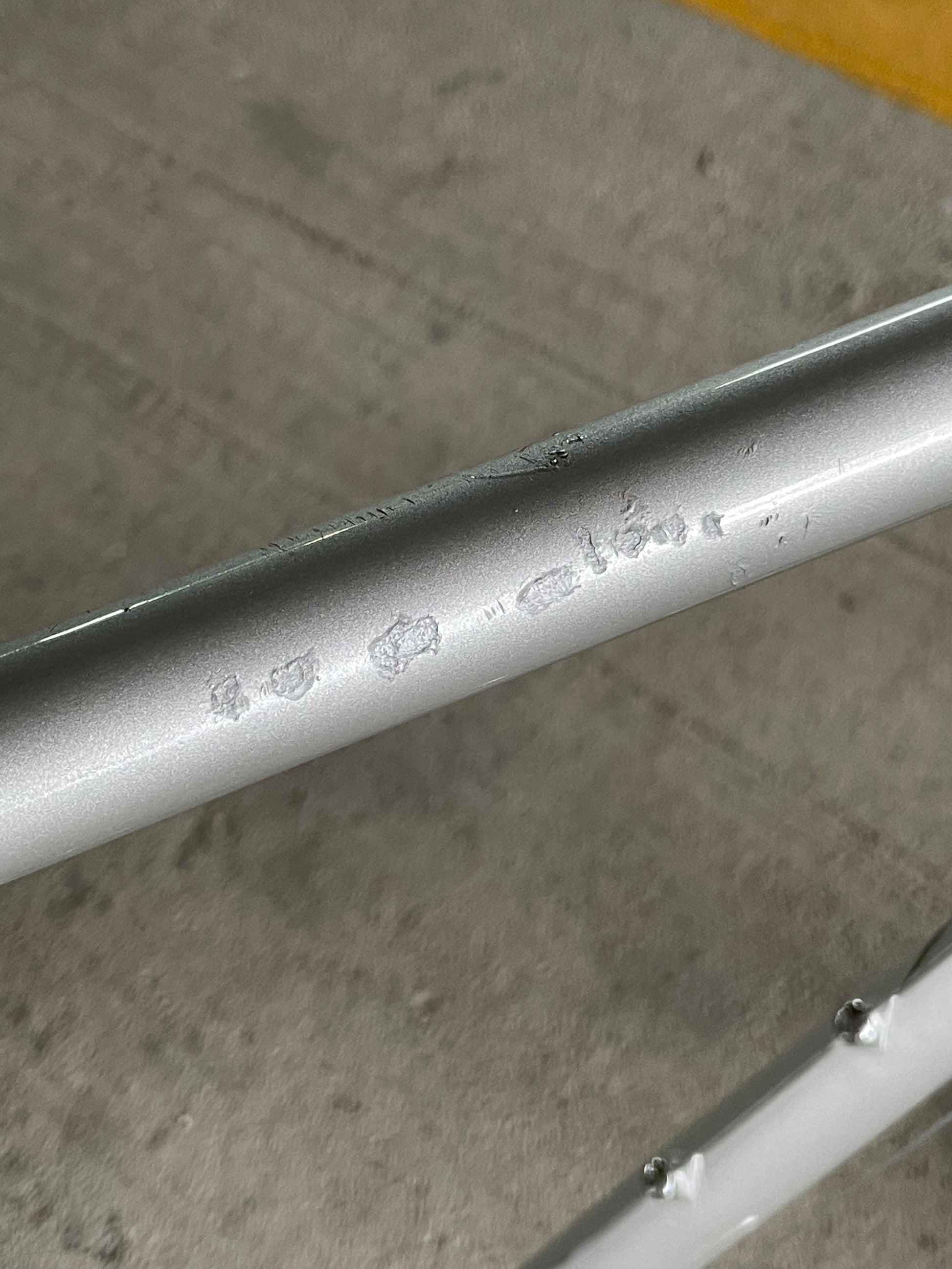 Although this bike is in good condition, it does show sign of use. There is small bubbling on the wheels where tho spokes come out but they are not cracked or damaged. There were also some chips on the frame but those were filled in with touch up paint. No dents, bends, or cracks! Please see all photos to get a better understanding as to the condition of this bike.