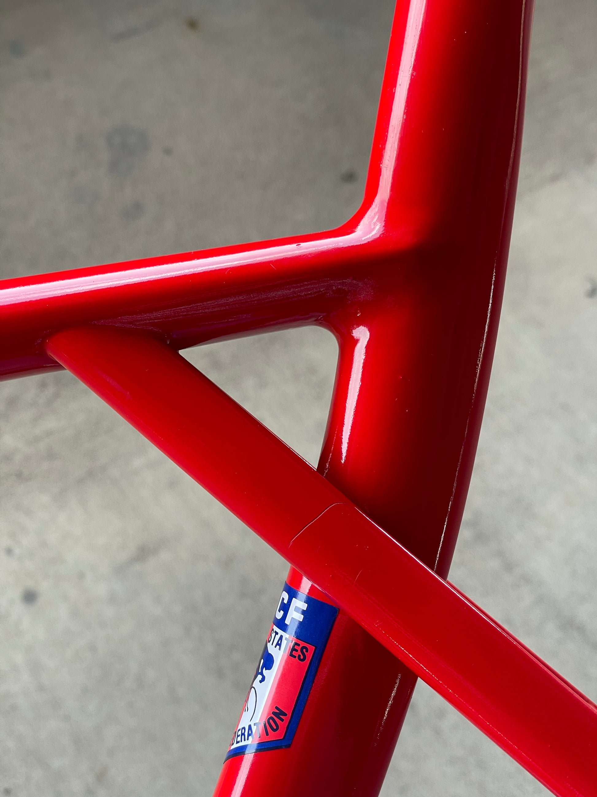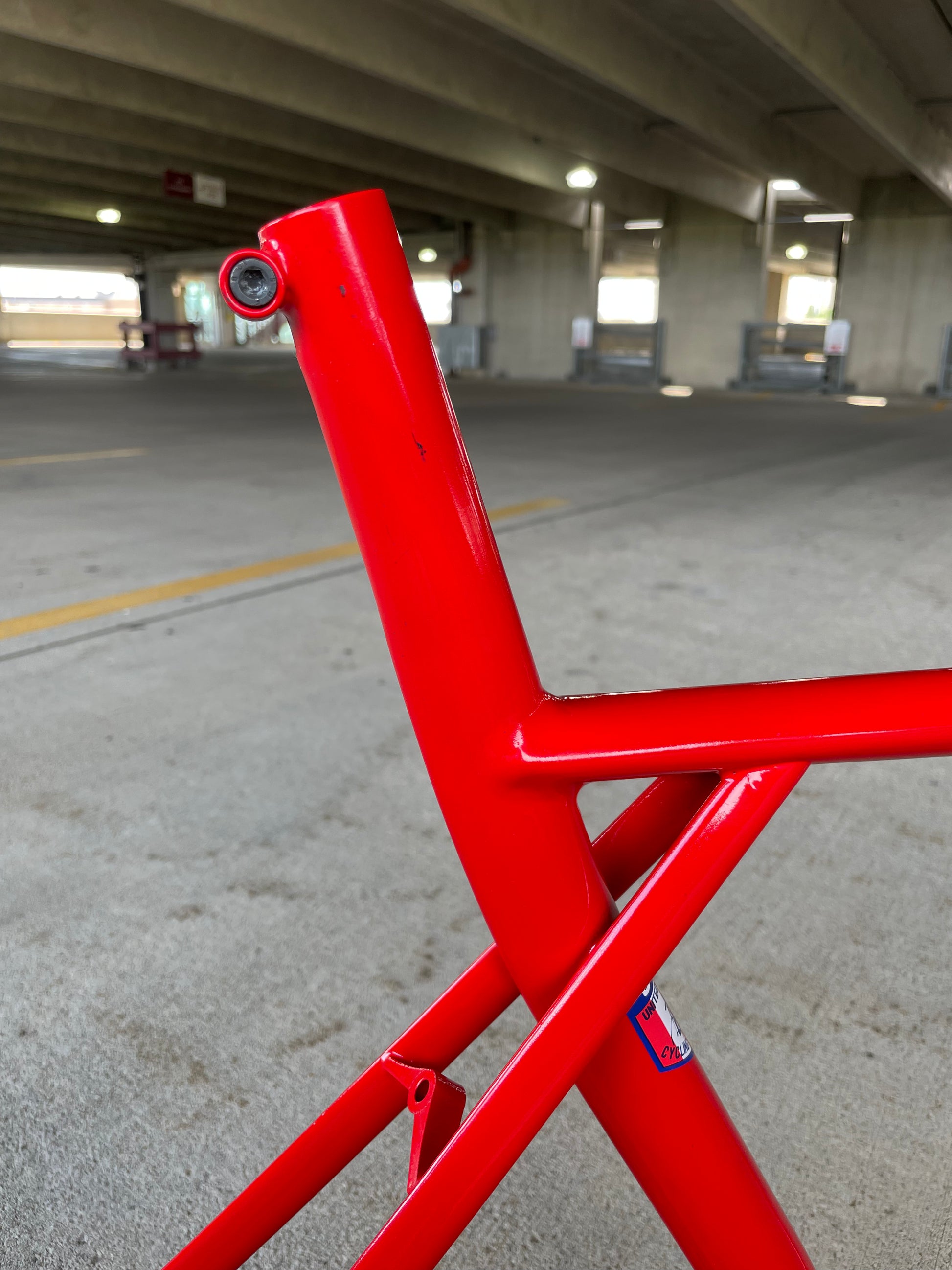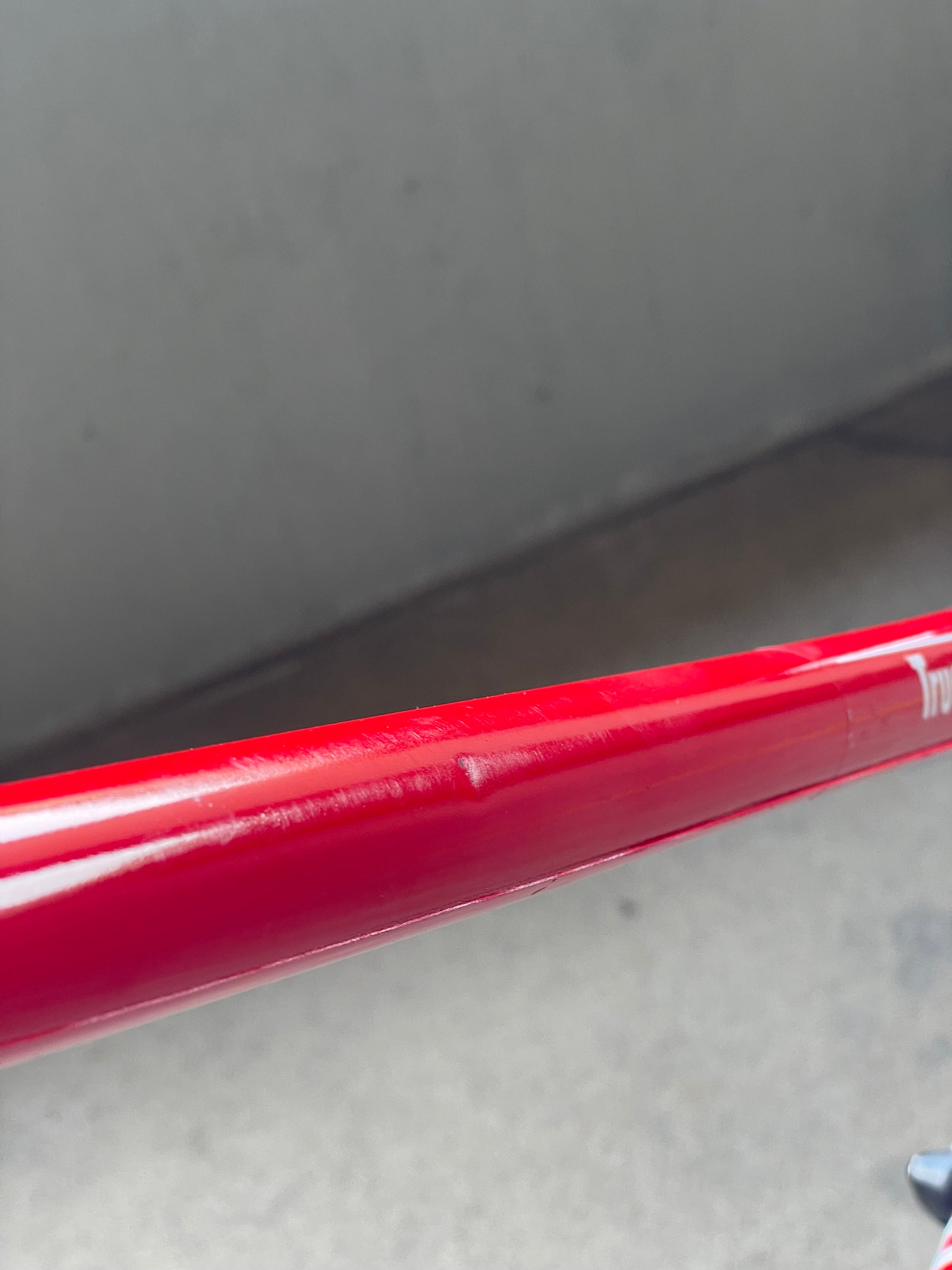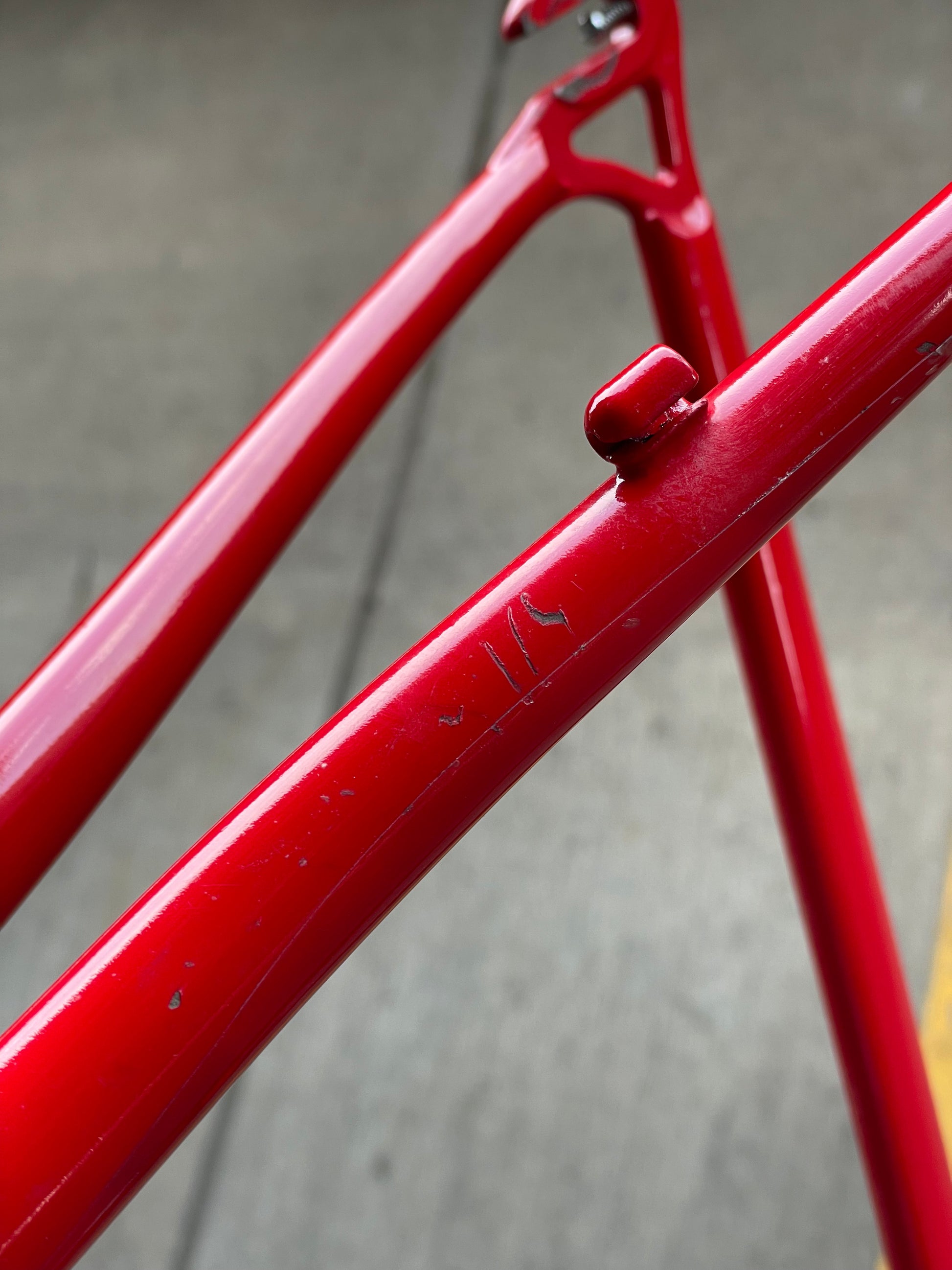 This frame is in very good condition, but shows sign of use. It has just a handful of imperfections in the paint. It also has a small dent in the top tube (see photo). Apart from that, no cracks, bend, or any other issues that would compromise the frame.