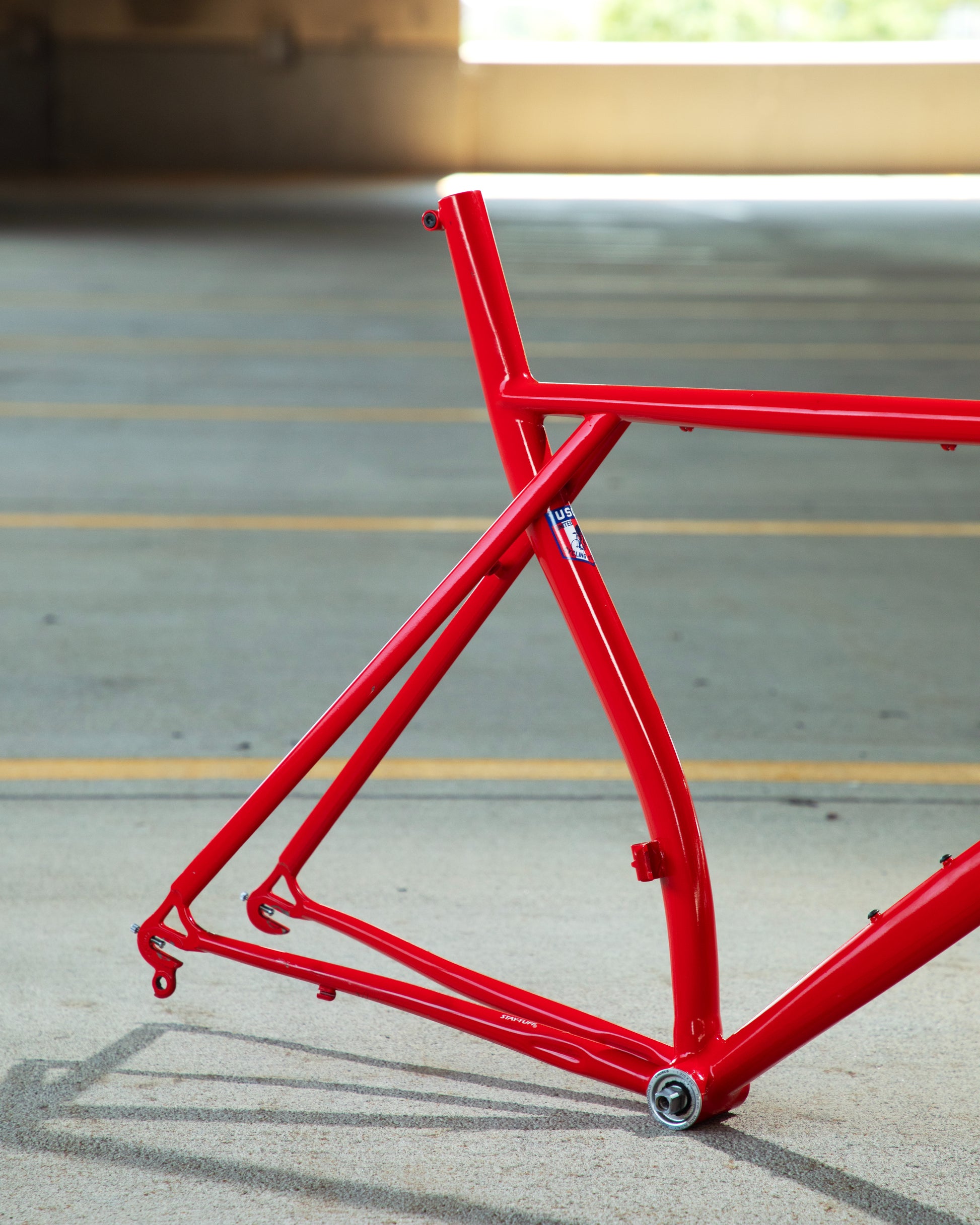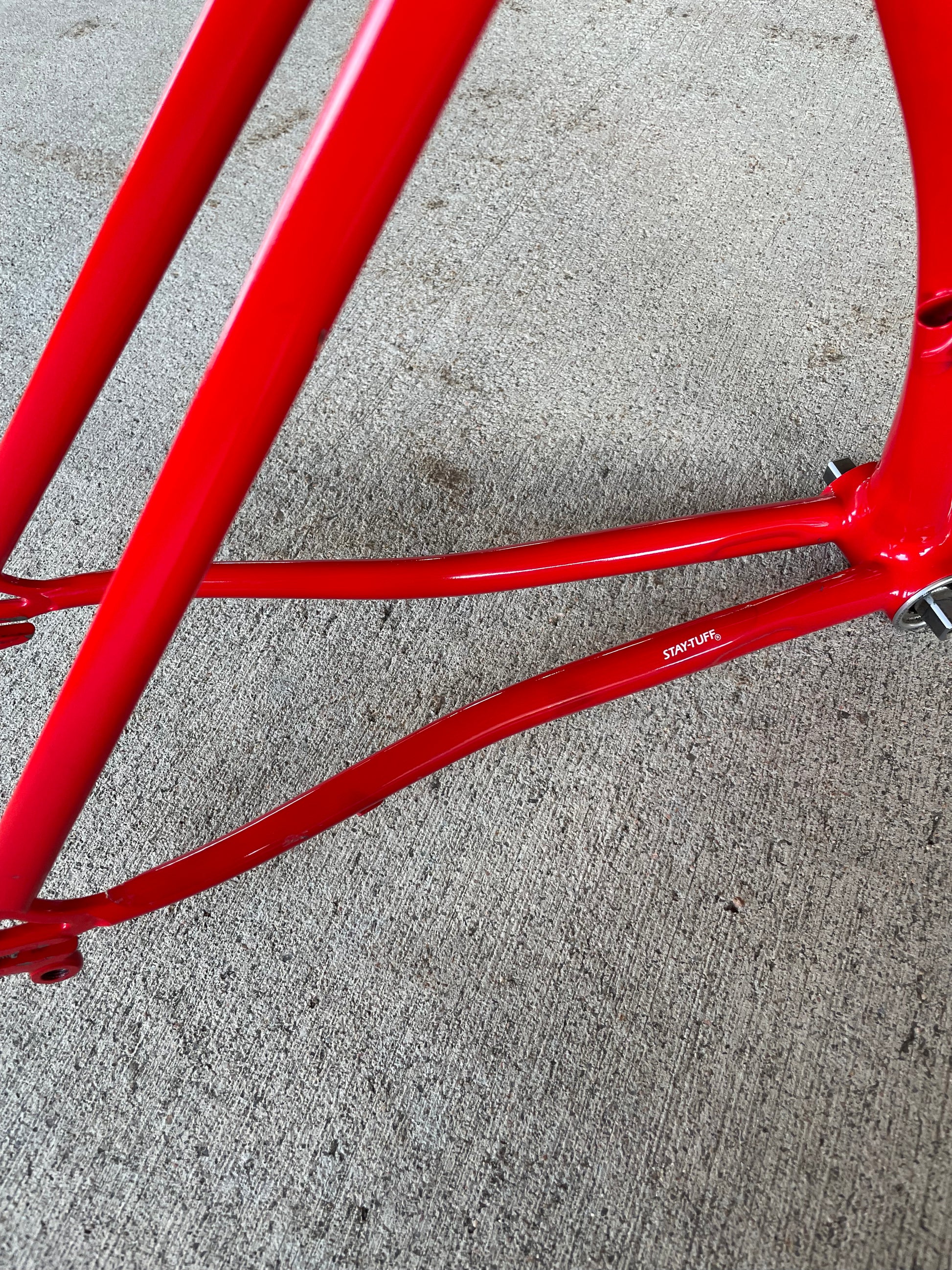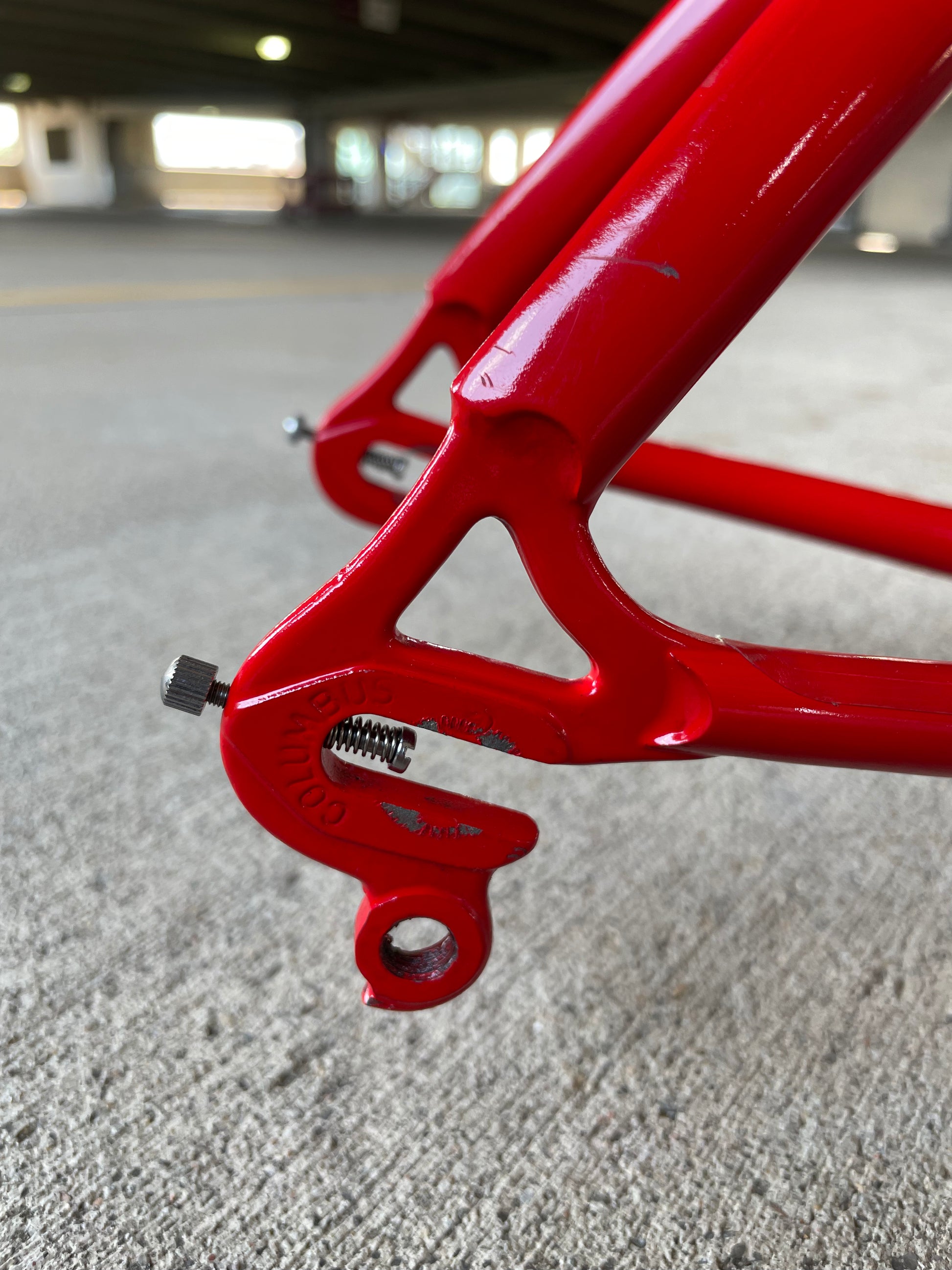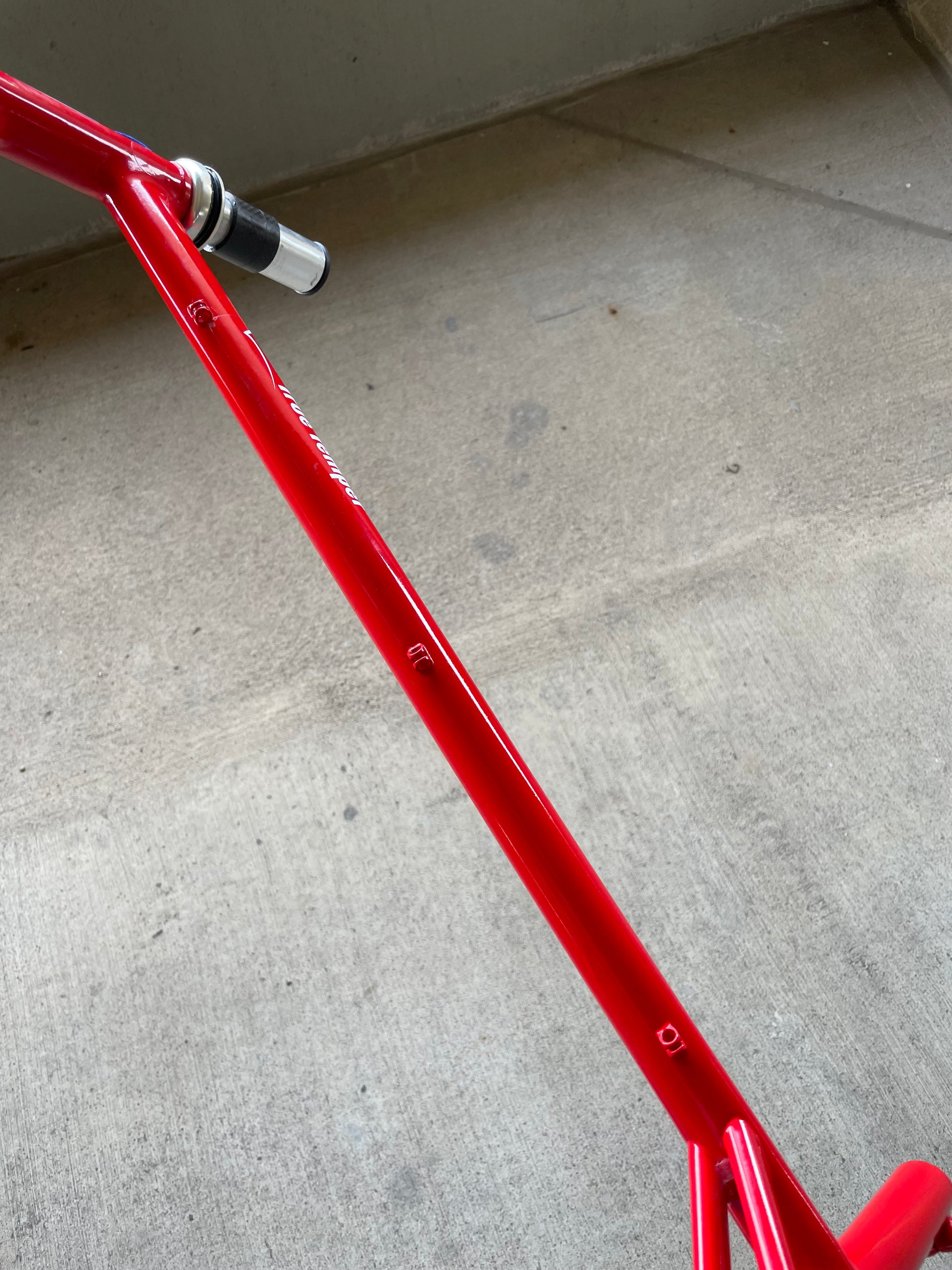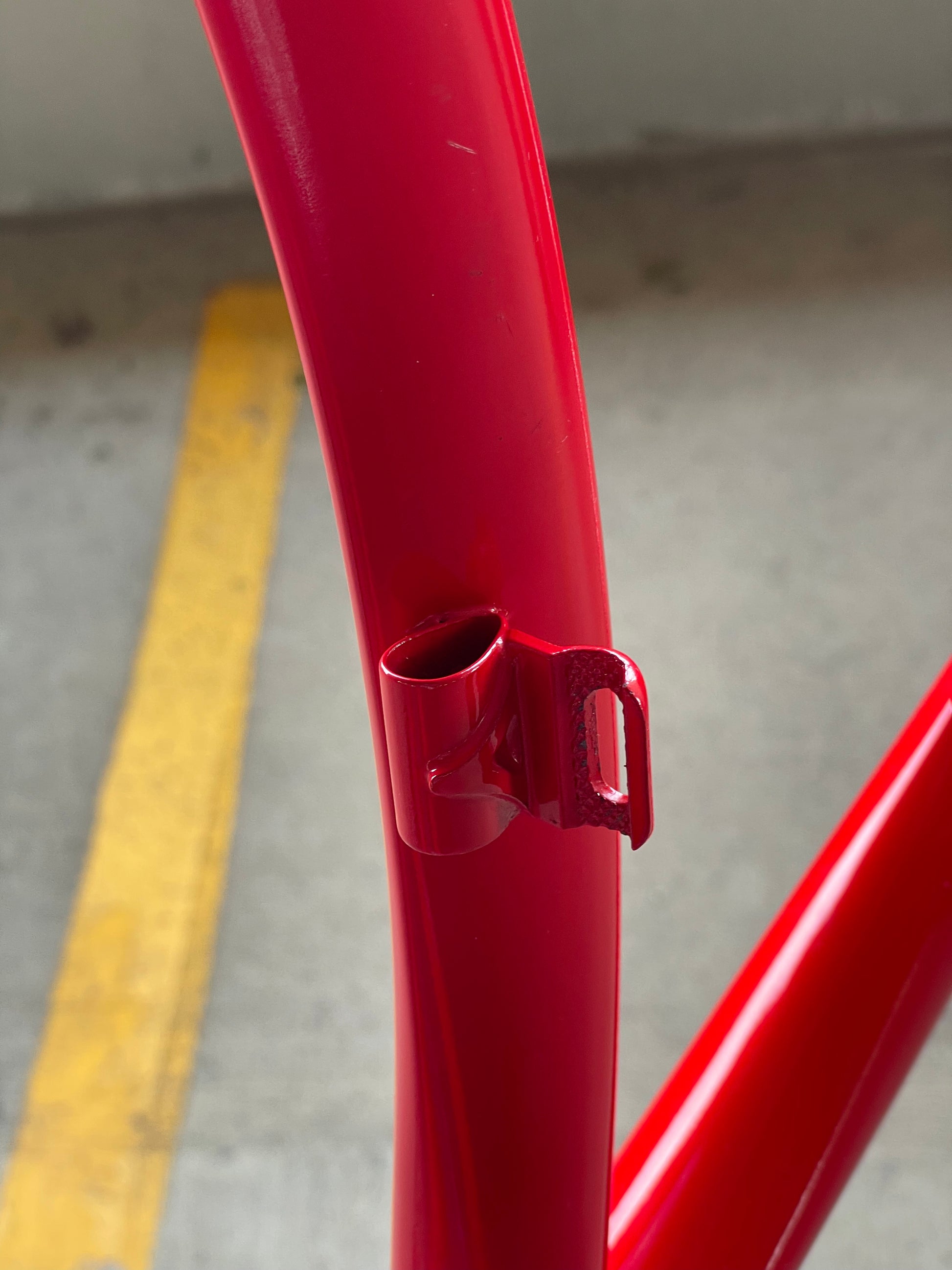This frame is in very good condition, but shows sign of use. It has just a handful of imperfections in the paint. It also has a small dent in the top tube (see photo). Apart from that, no cracks, bend, or any other issues that would compromise the frame.