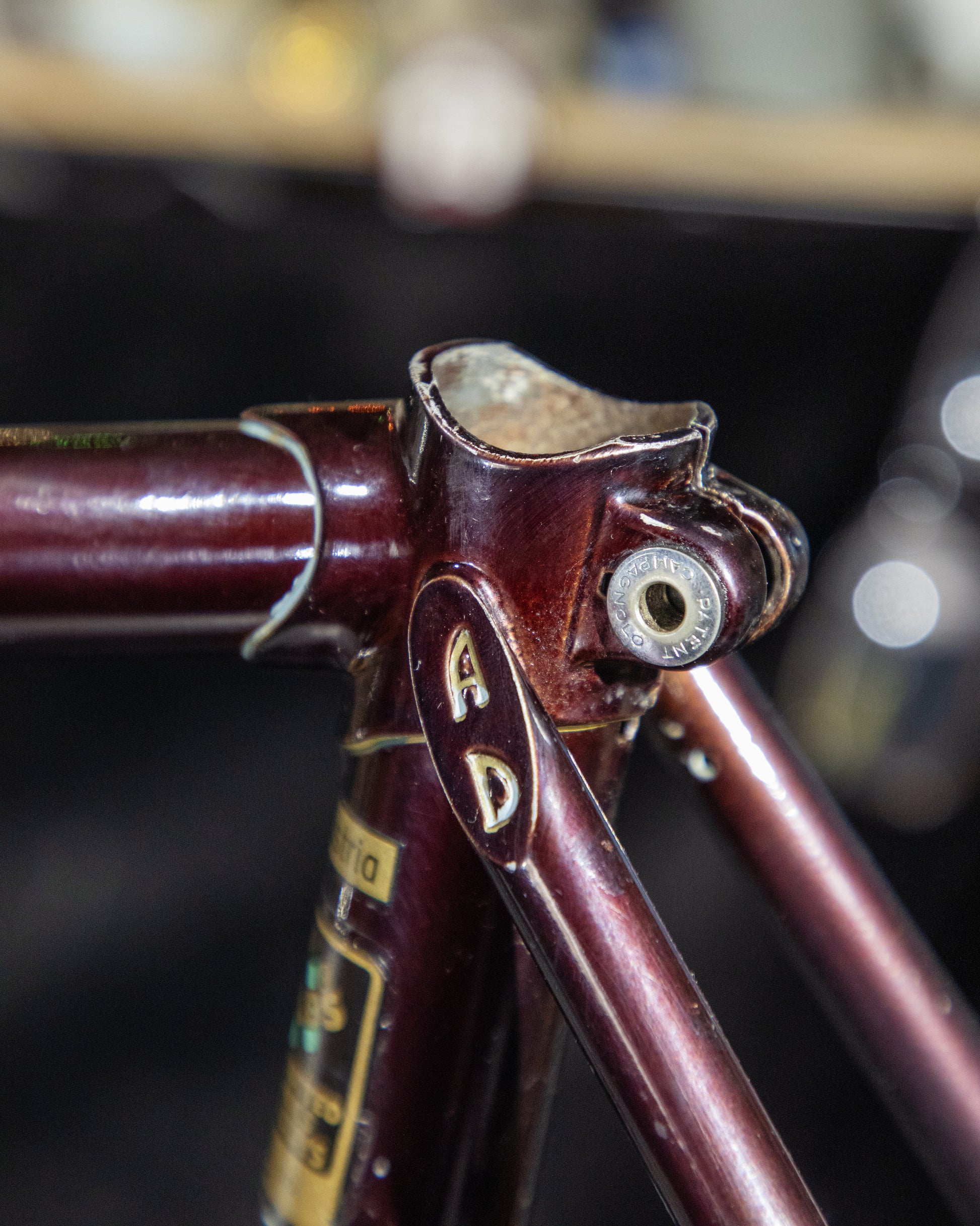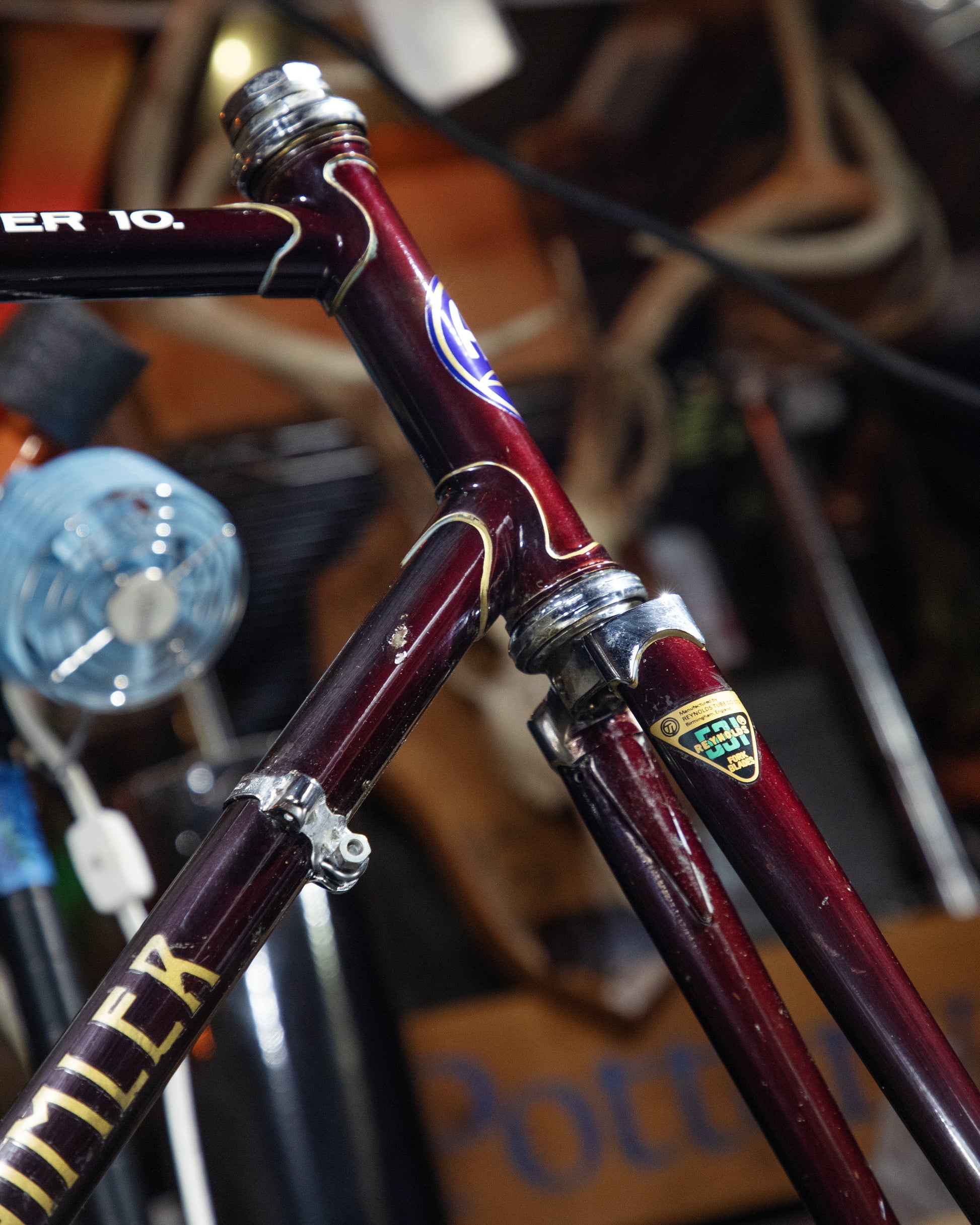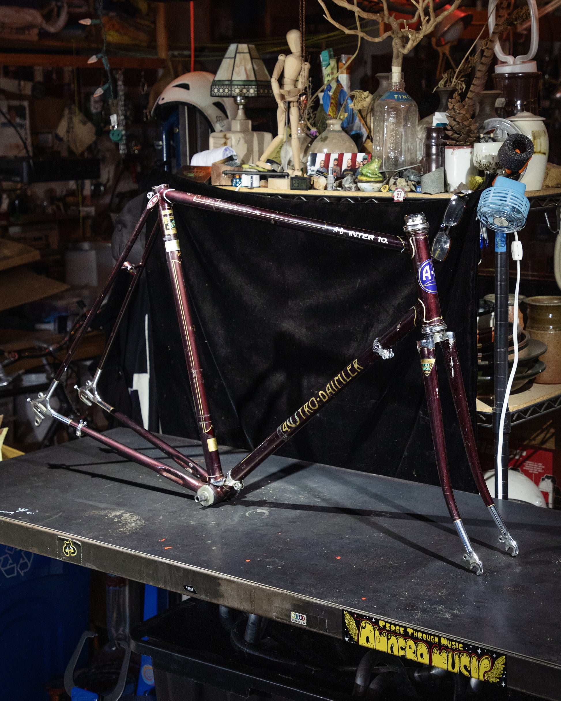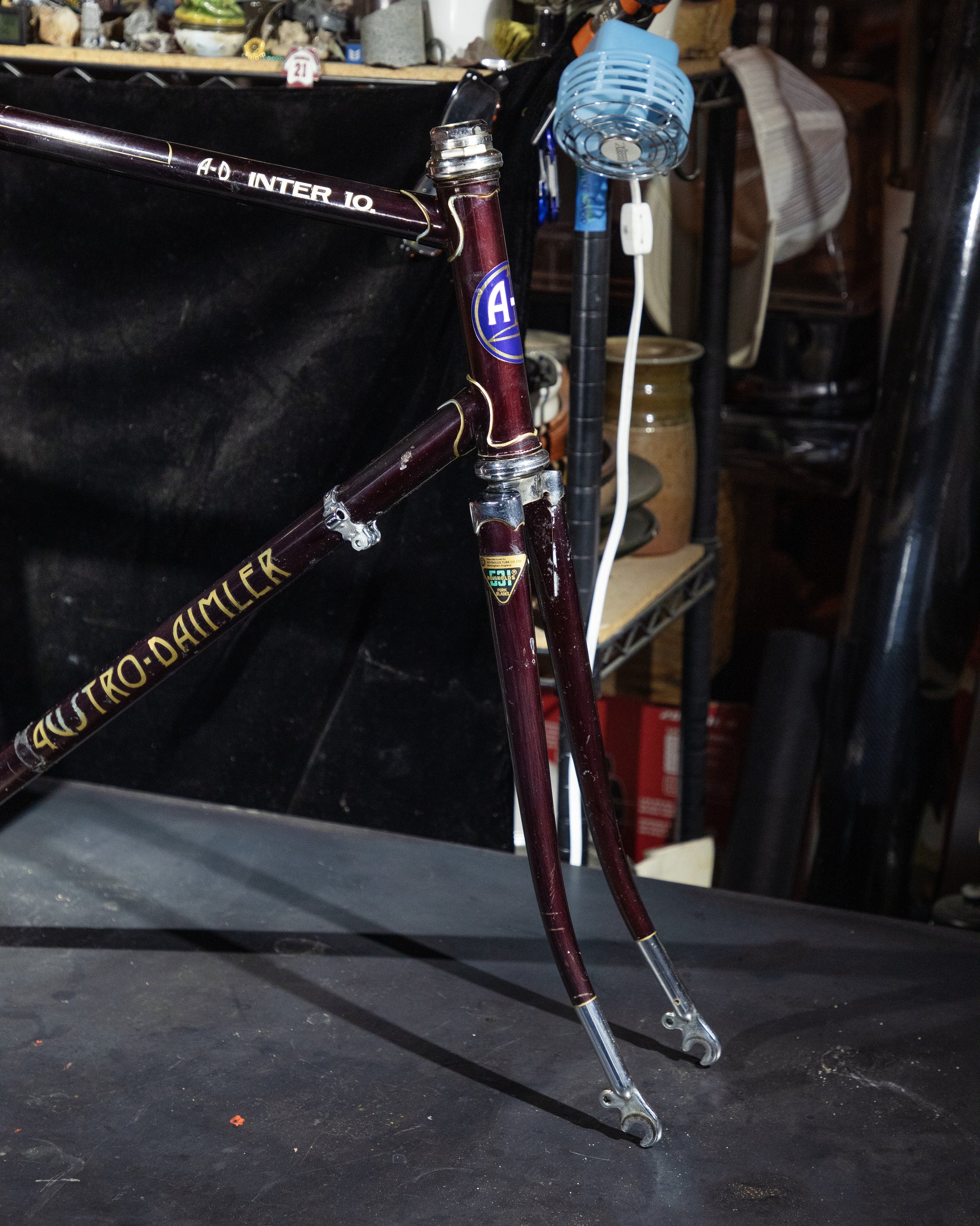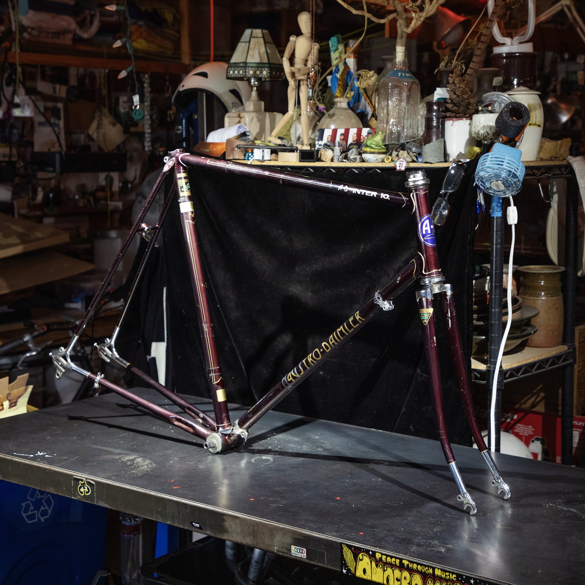 This Austro Daimler Inter 10 is made with Reynolds 531 tubing and is finished in a beautiful, root beer brown. It also features hand painted gold pin striping that ties everything together nicely. This frame is in good condition, but shows sign of use. There are paint chips and paint fade but no dents, bends, or cracks. There also appears to be some rust on the top of the top tube. The bottom bracket and headset feel like they could use some fresh grease as well. It's a great ride!