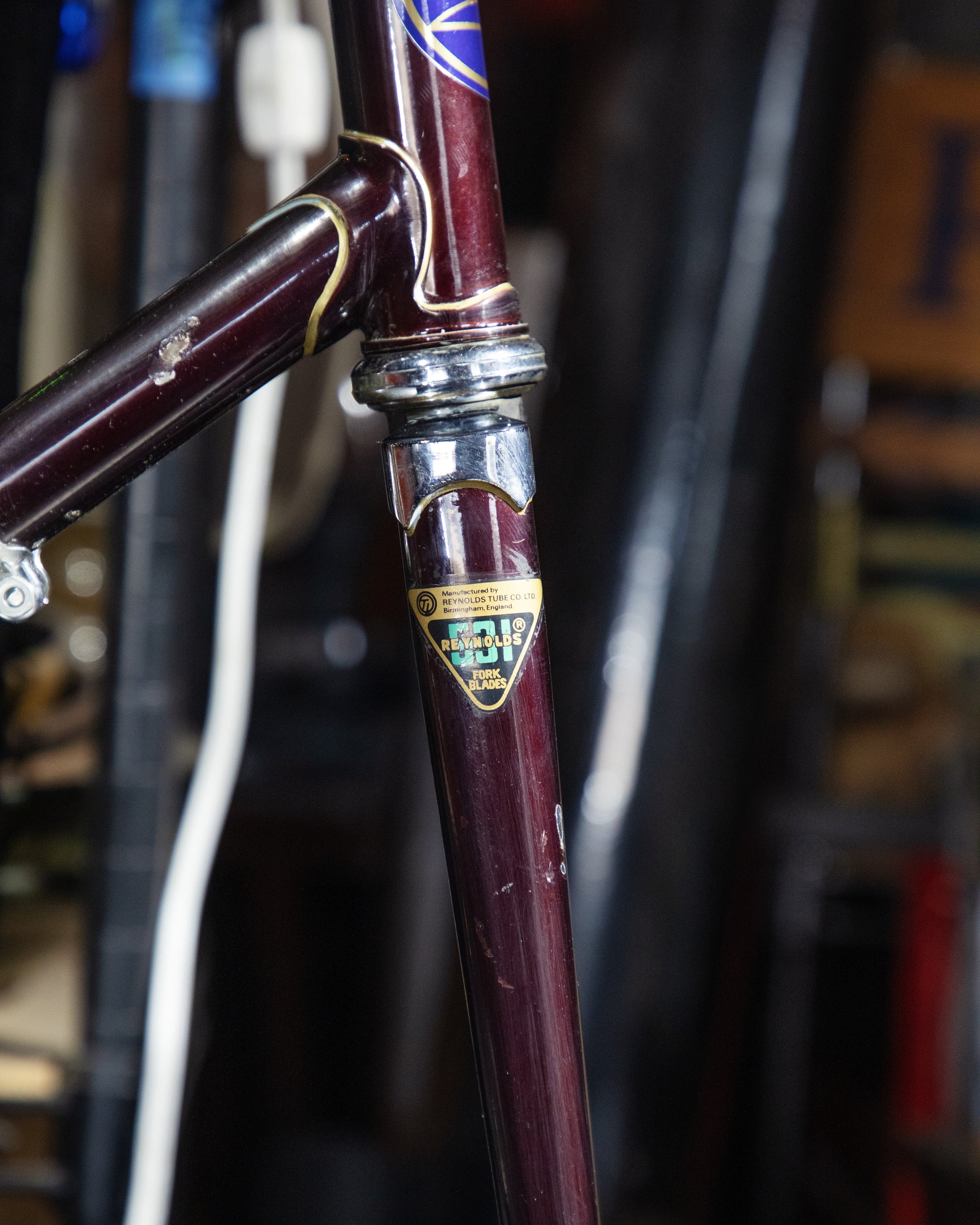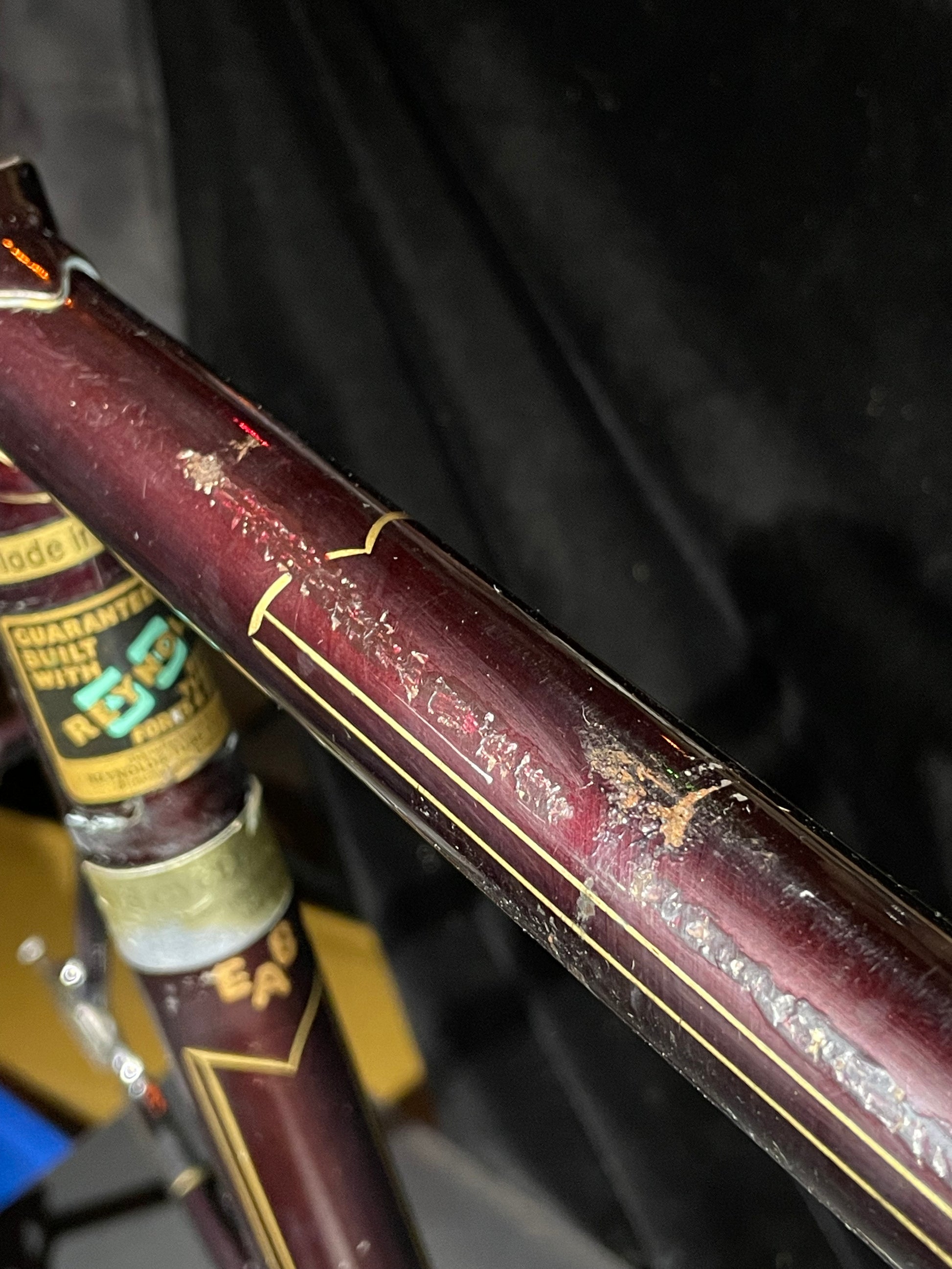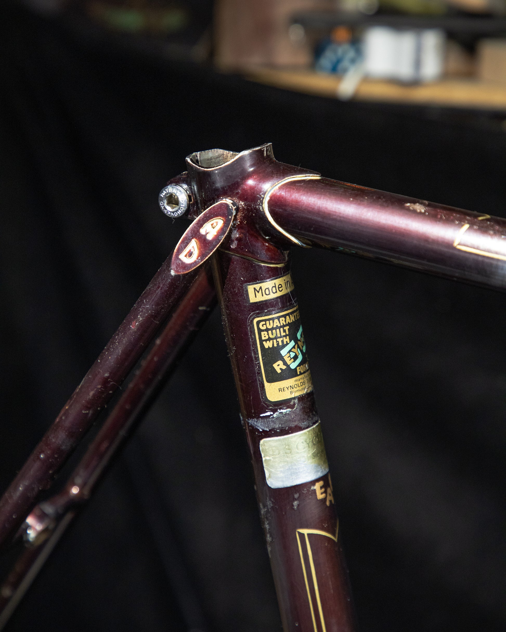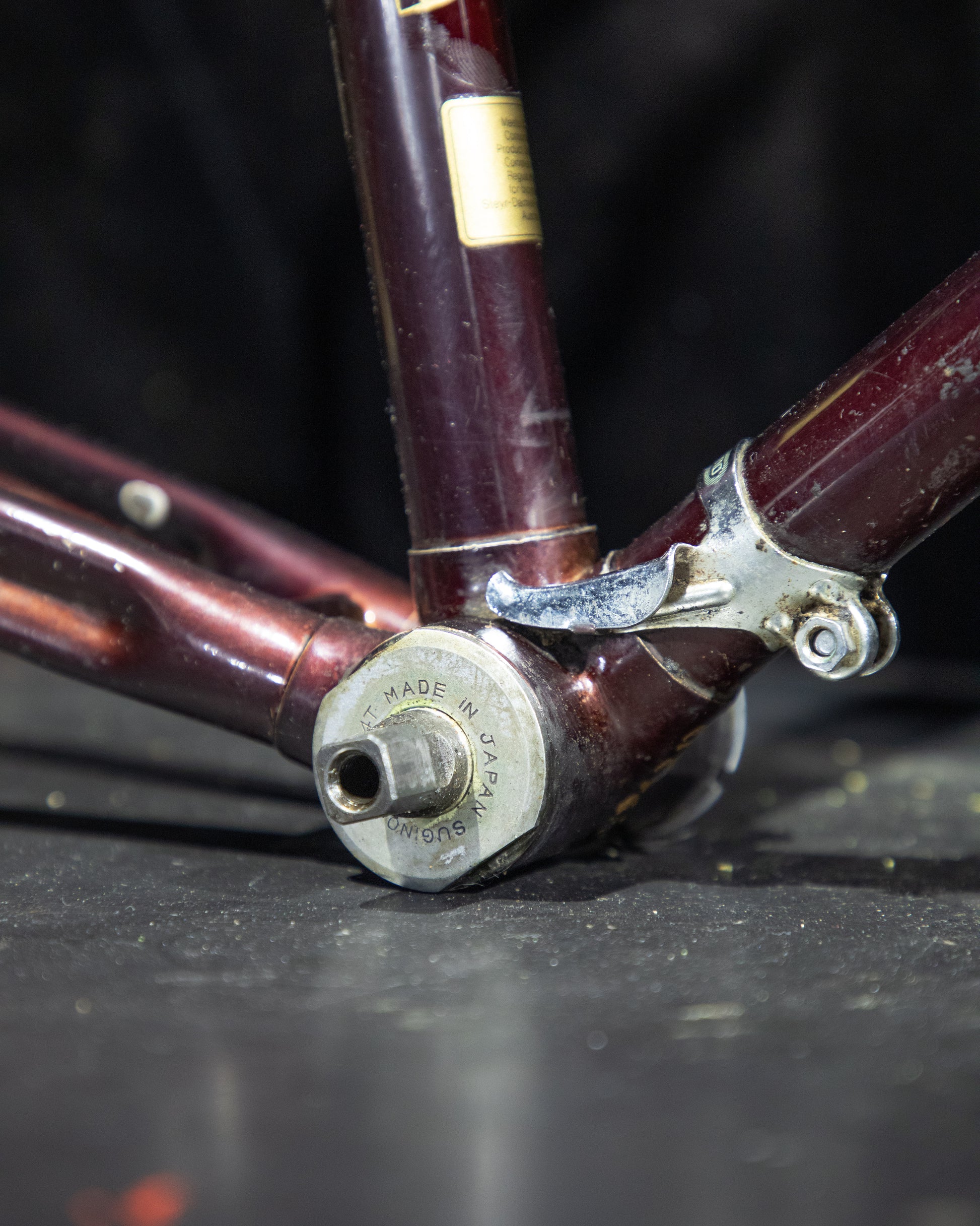 This Austro Daimler Inter 10 is made with Reynolds 531 tubing and is finished in a beautiful, root beer brown. It also features hand painted gold pin striping that ties everything together nicely. This frame is in good condition, but shows sign of use. There are paint chips and paint fade but no dents, bends, or cracks. There also appears to be some rust on the top of the top tube. The bottom bracket and headset feel like they could use some fresh grease as well. It's a great ride!
