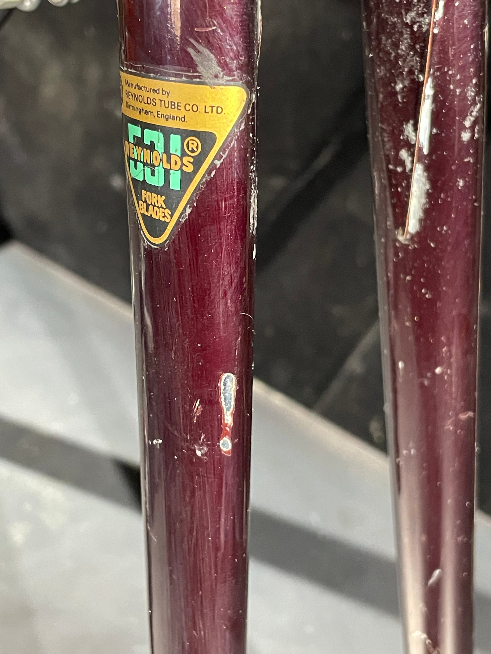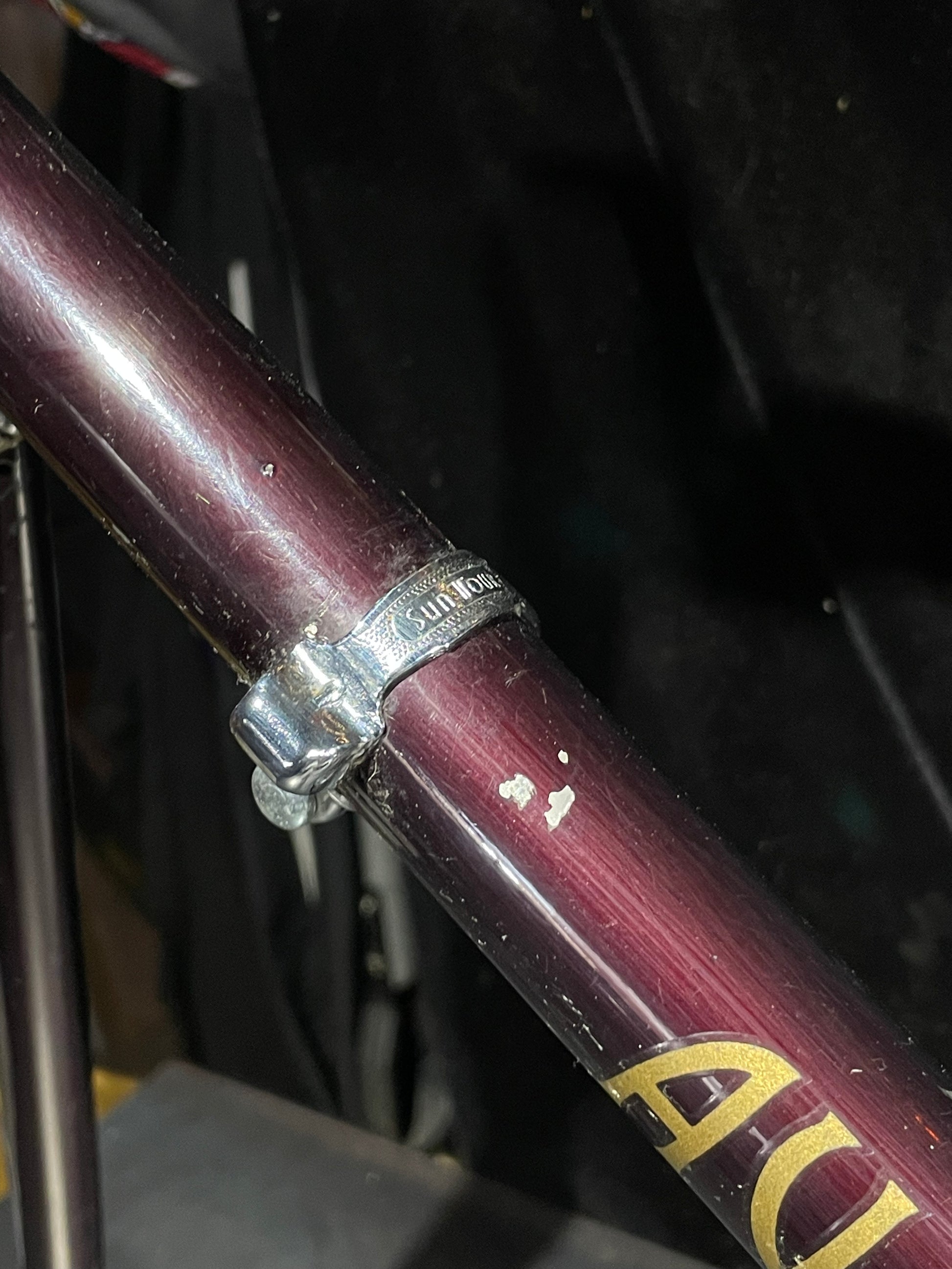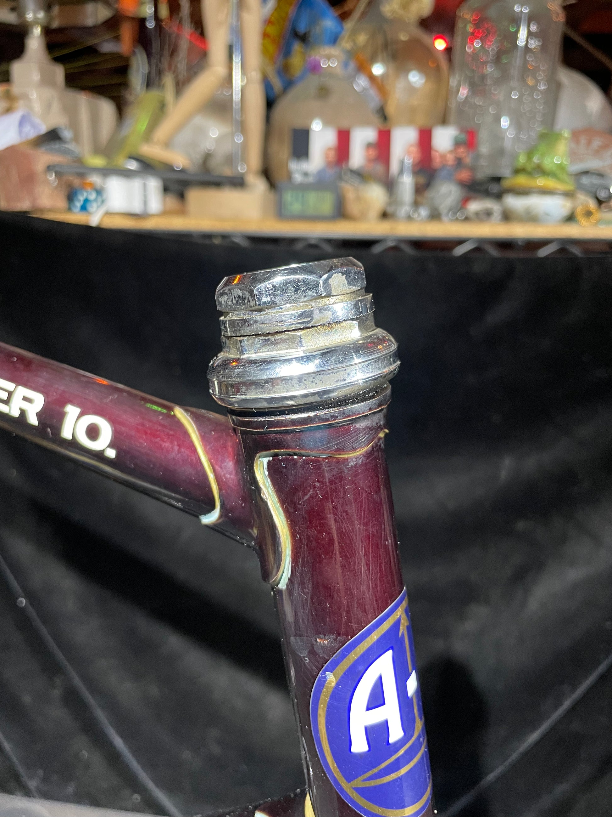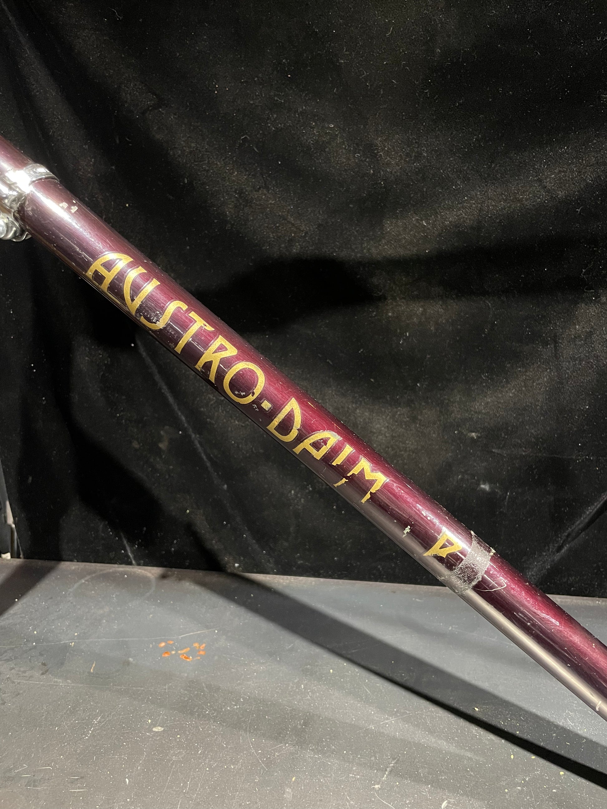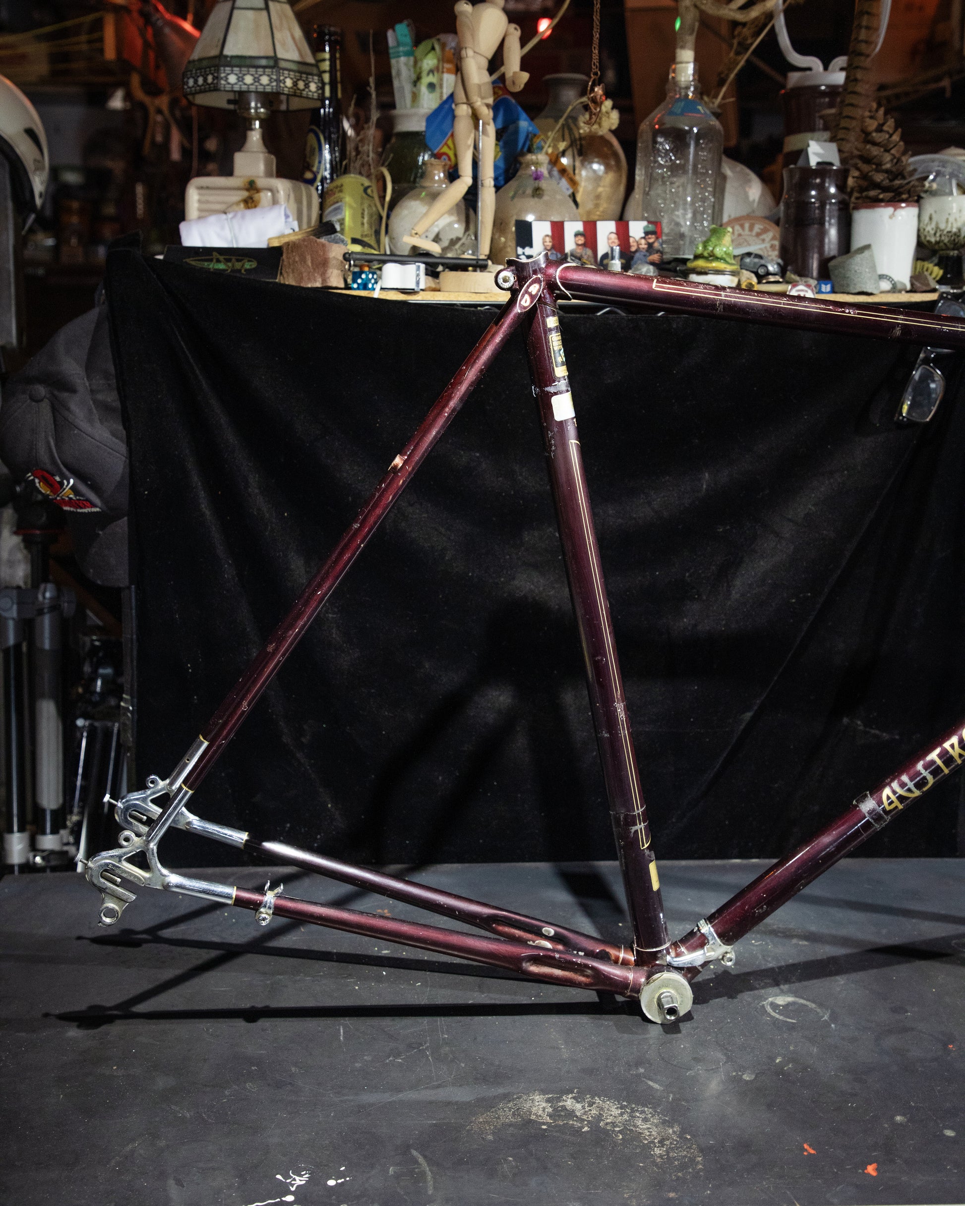 This Austro Daimler Inter 10 is made with Reynolds 531 tubing and is finished in a beautiful, root beer brown. It also features hand painted gold pin striping that ties everything together nicely. This frame is in good condition, but shows sign of use. There are paint chips and paint fade but no dents, bends, or cracks. There also appears to be some rust on the top of the top tube. The bottom bracket and headset feel like they could use some fresh grease as well. It's a great ride!
