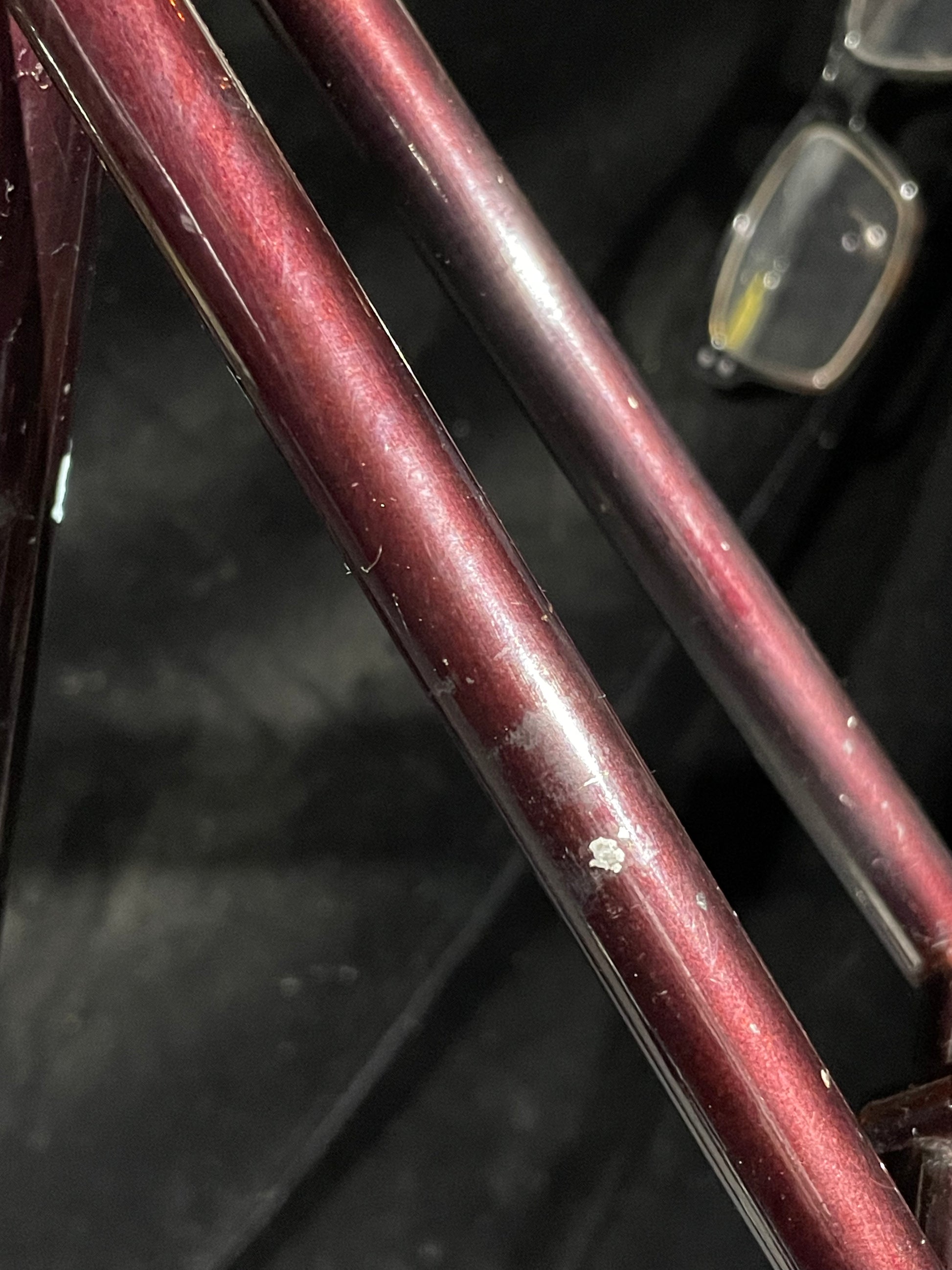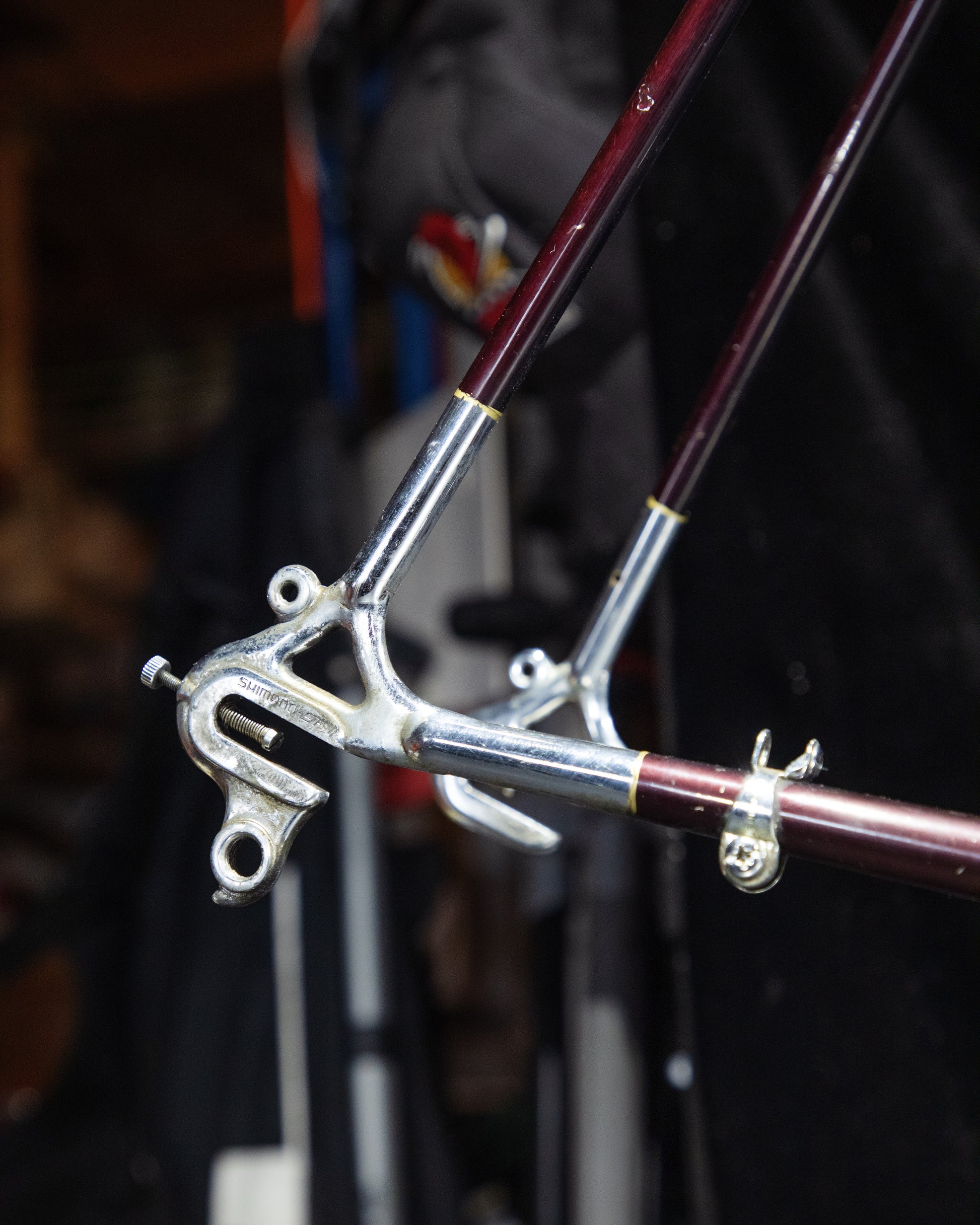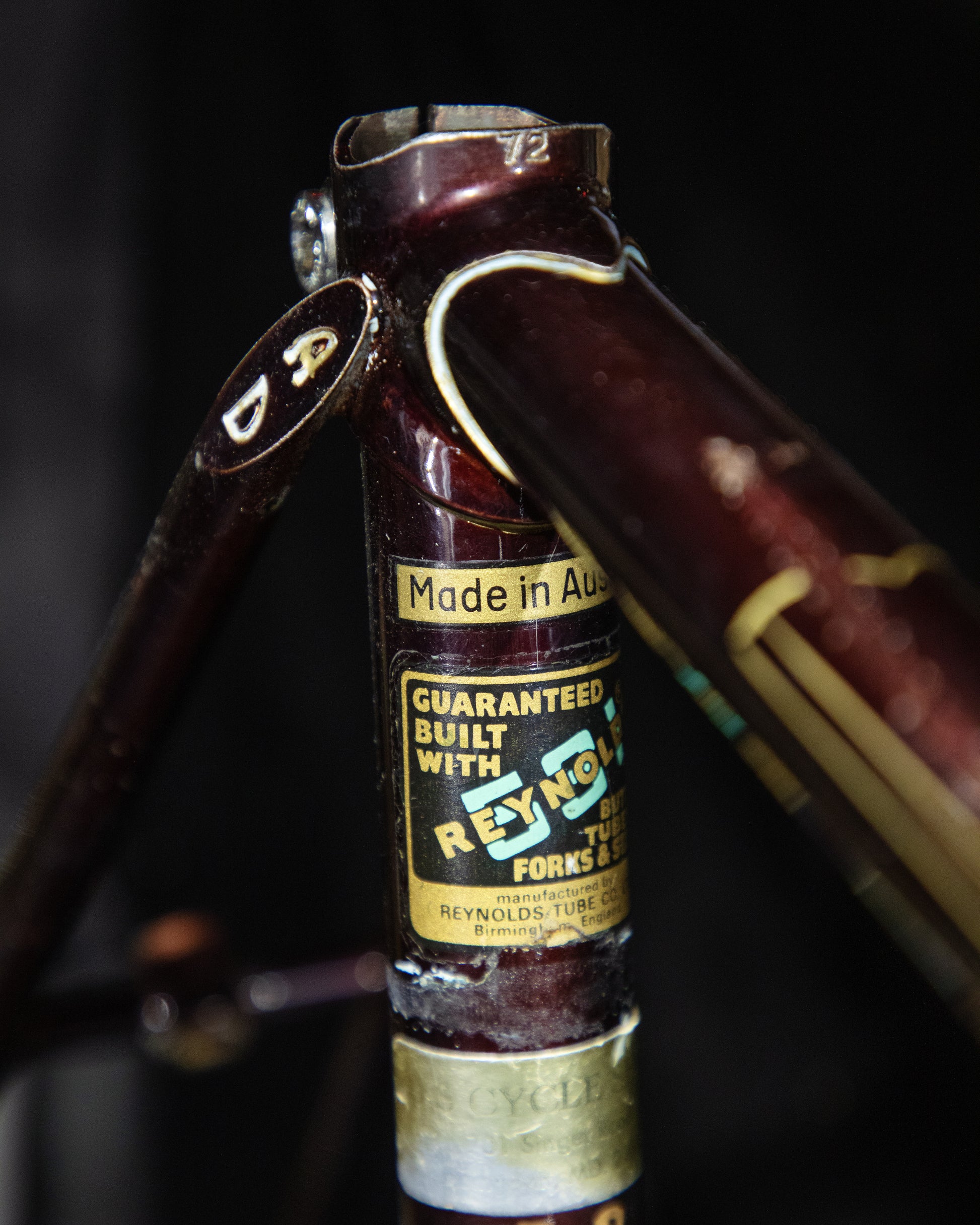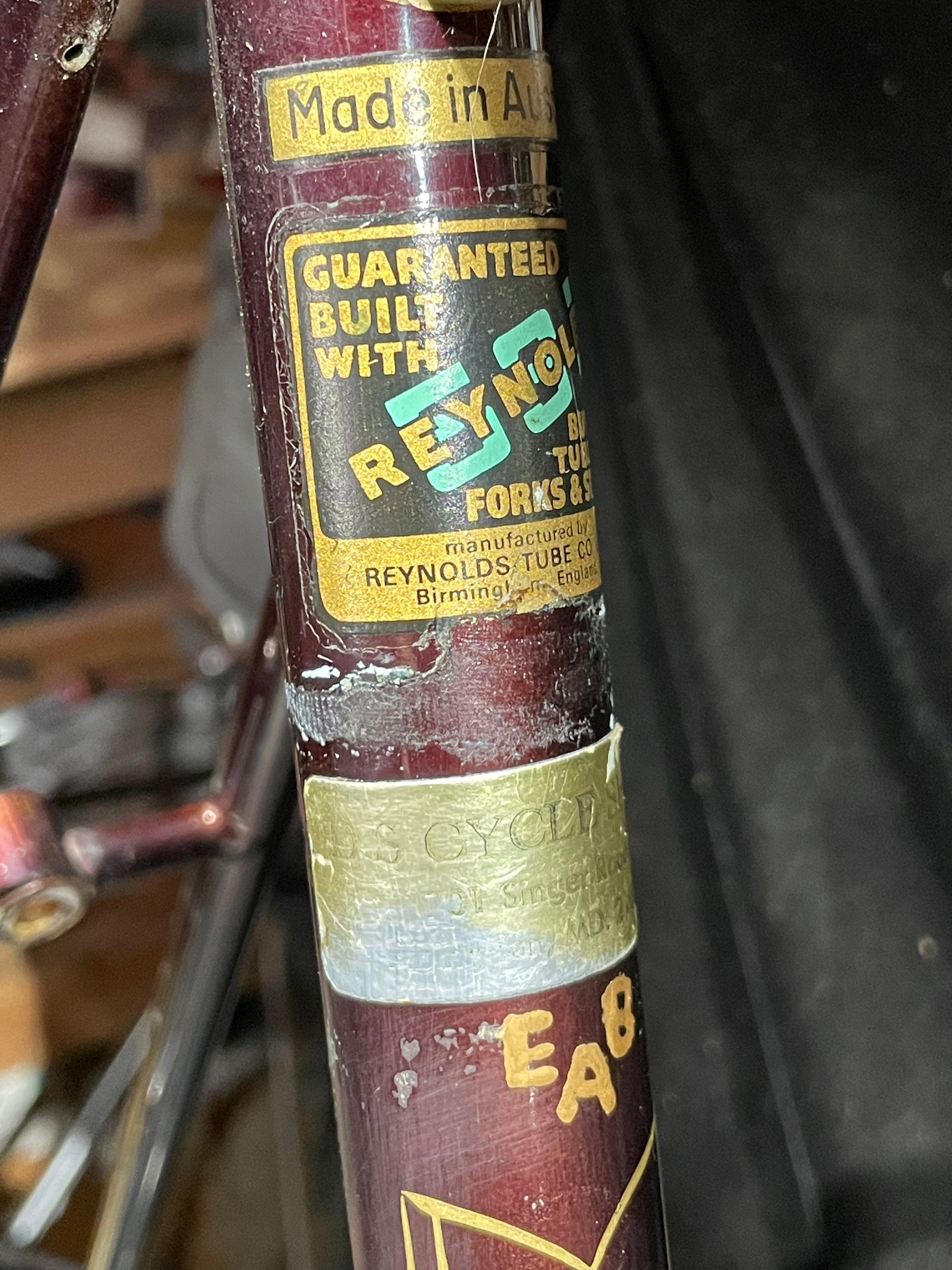 This Austro Daimler Inter 10 is made with Reynolds 531 tubing and is finished in a beautiful, root beer brown. It also features hand painted gold pin striping that ties everything together nicely. This frame is in good condition, but shows sign of use. There are paint chips and paint fade but no dents, bends, or cracks. There also appears to be some rust on the top of the top tube. The bottom bracket and headset feel like they could use some fresh grease as well. It's a great ride!