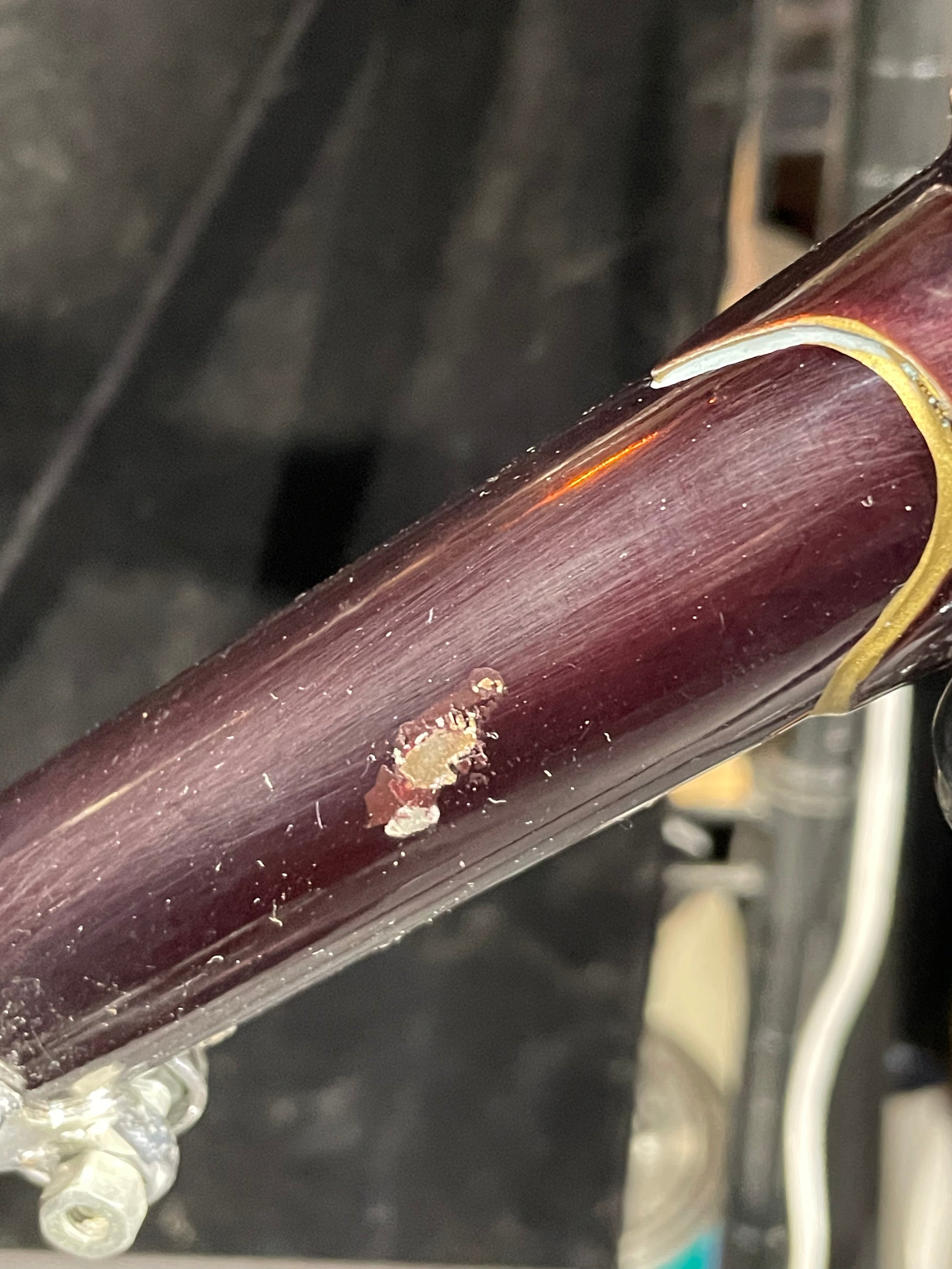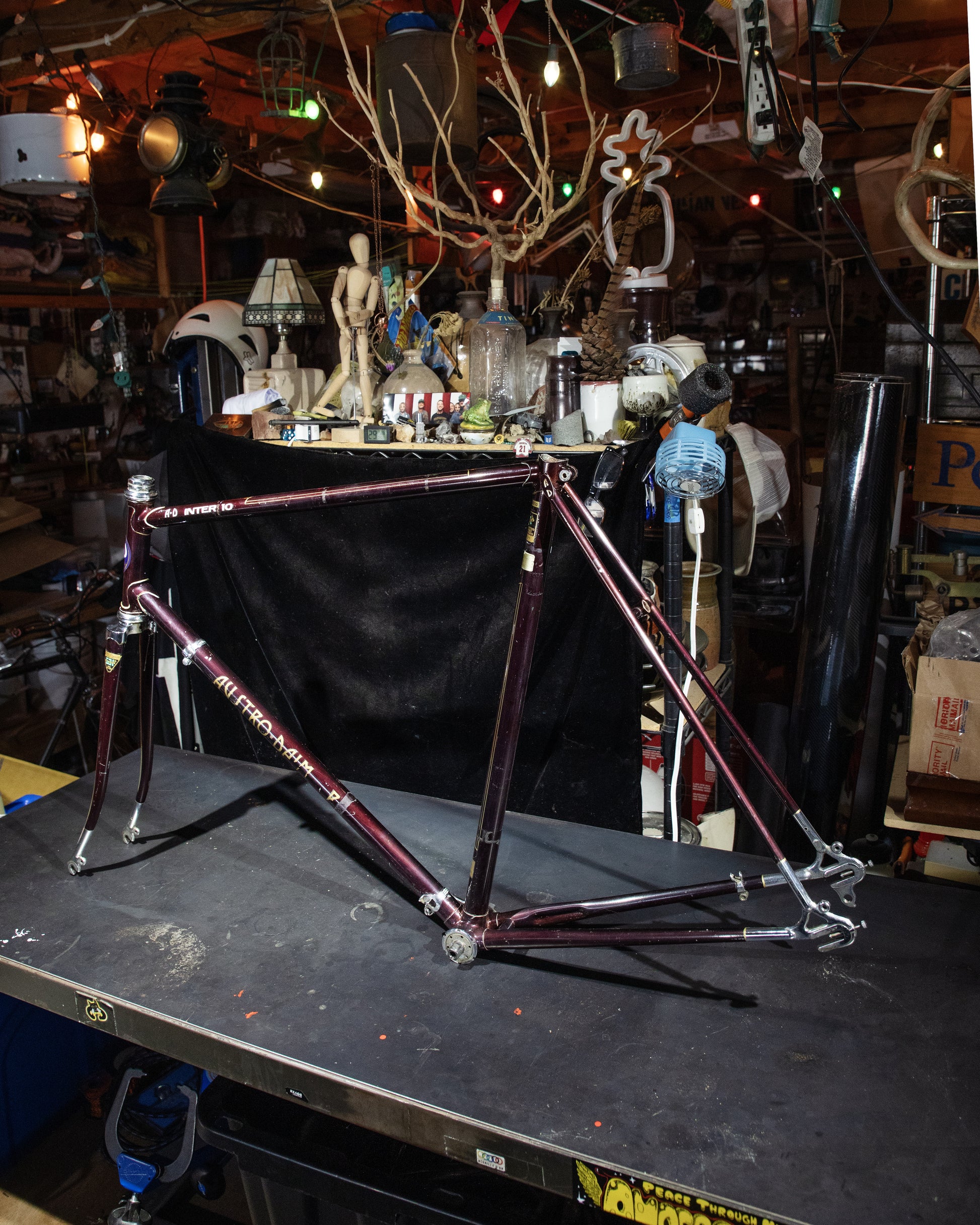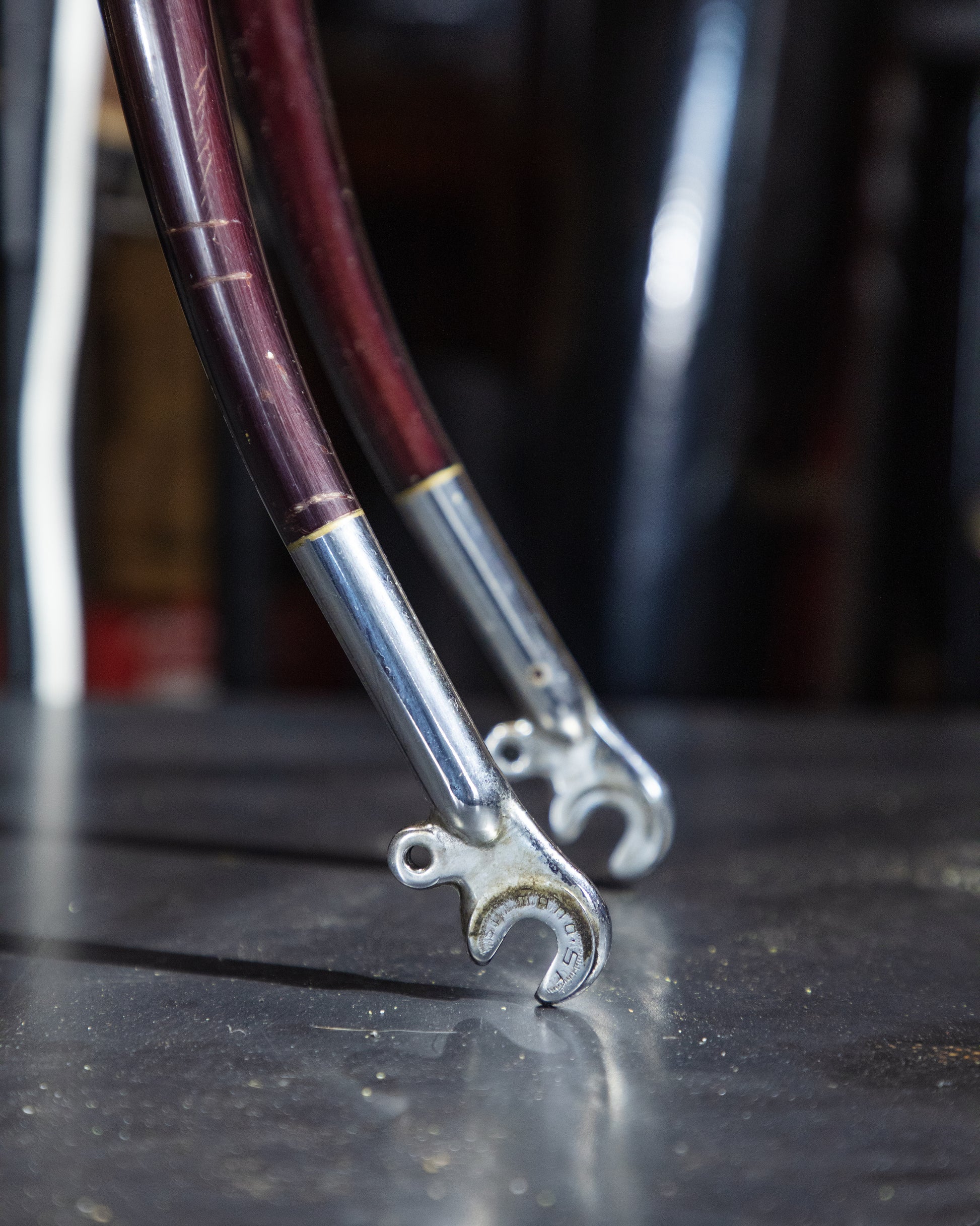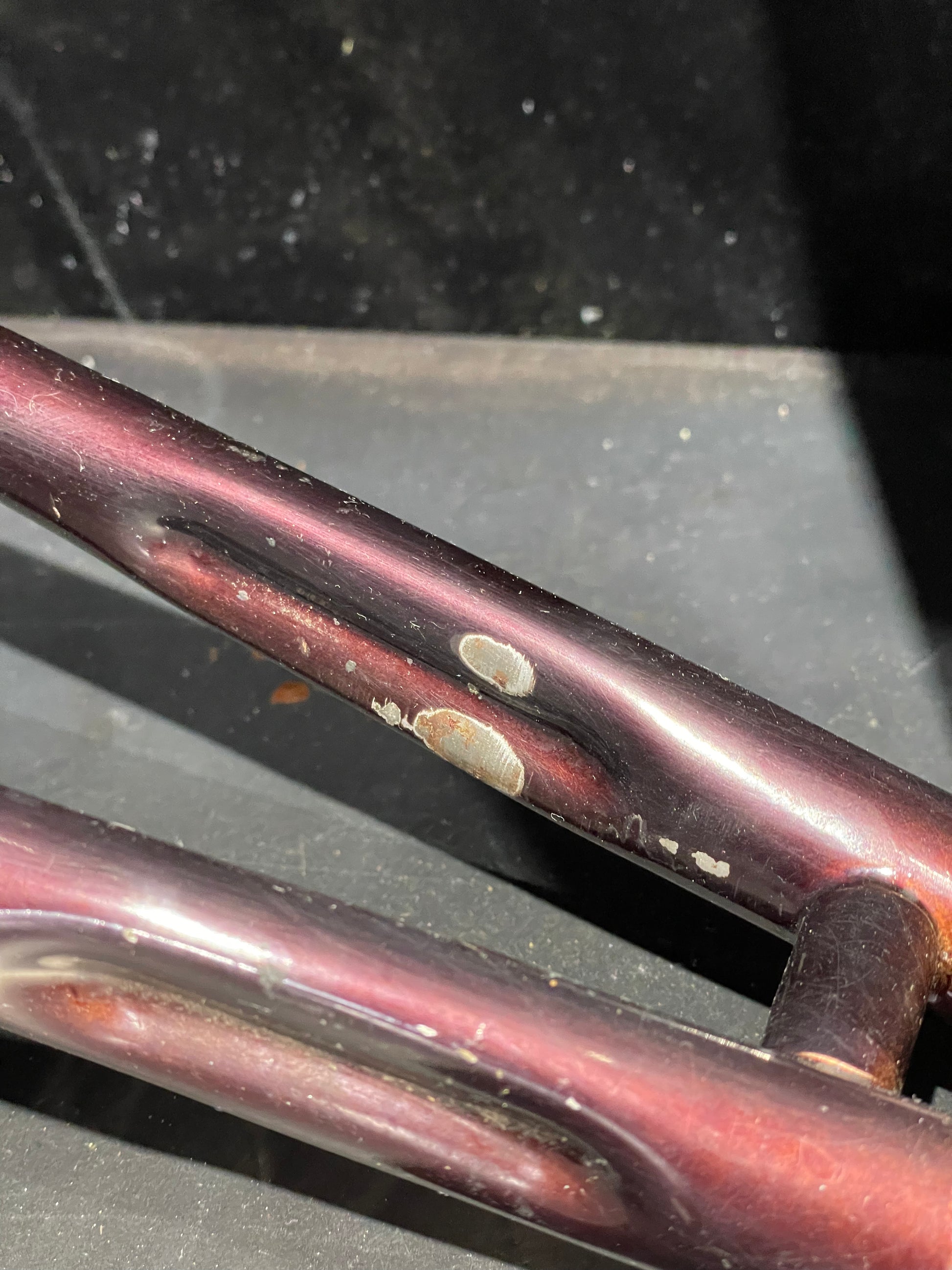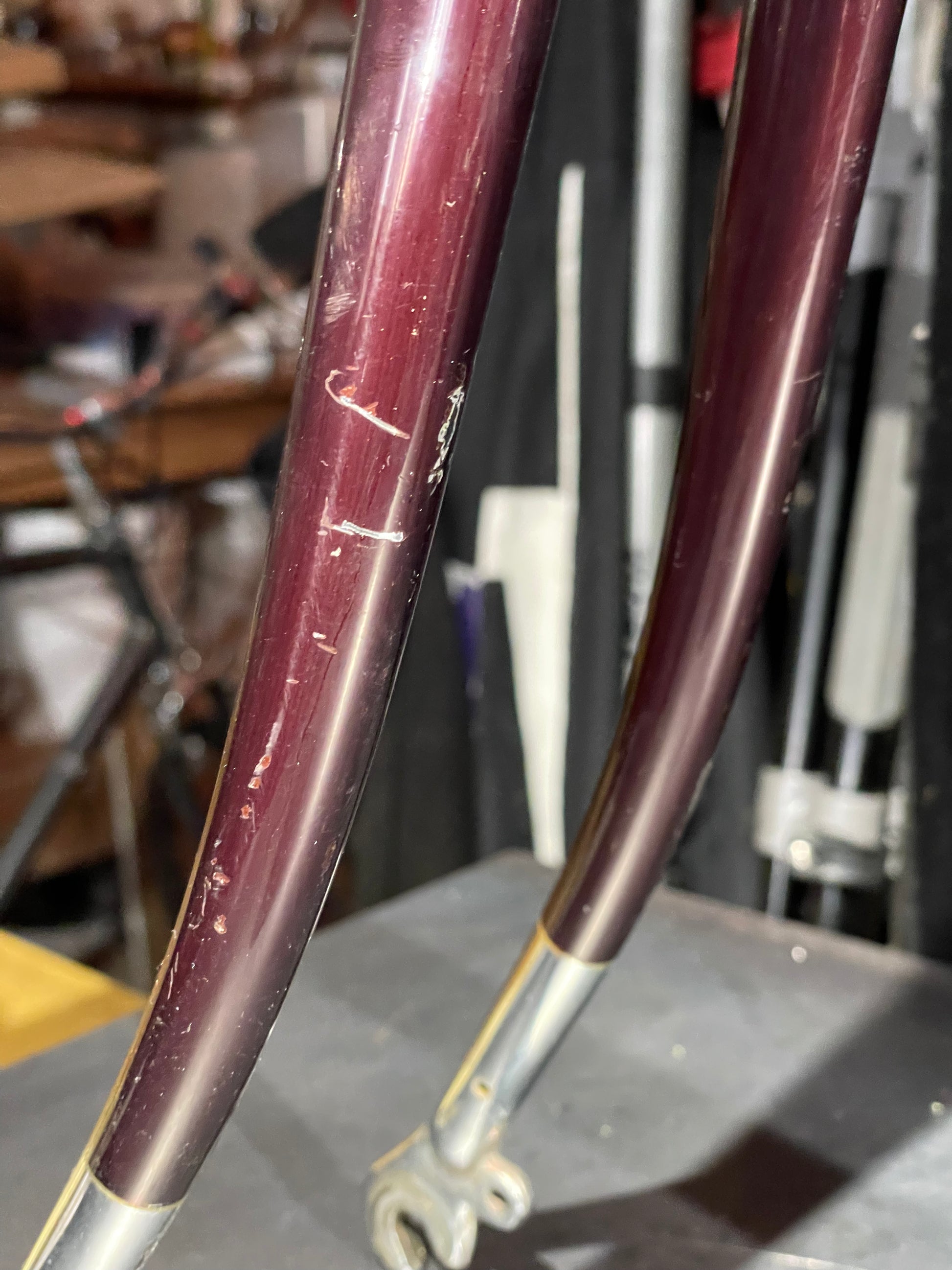This Austro Daimler Inter 10 is made with Reynolds 531 tubing and is finished in a beautiful, root beer brown. It also features hand painted gold pin striping that ties everything together nicely. This frame is in good condition, but shows sign of use. There are paint chips and paint fade but no dents, bends, or cracks. There also appears to be some rust on the top of the top tube. The bottom bracket and headset feel like they could use some fresh grease as well. It's a great ride!