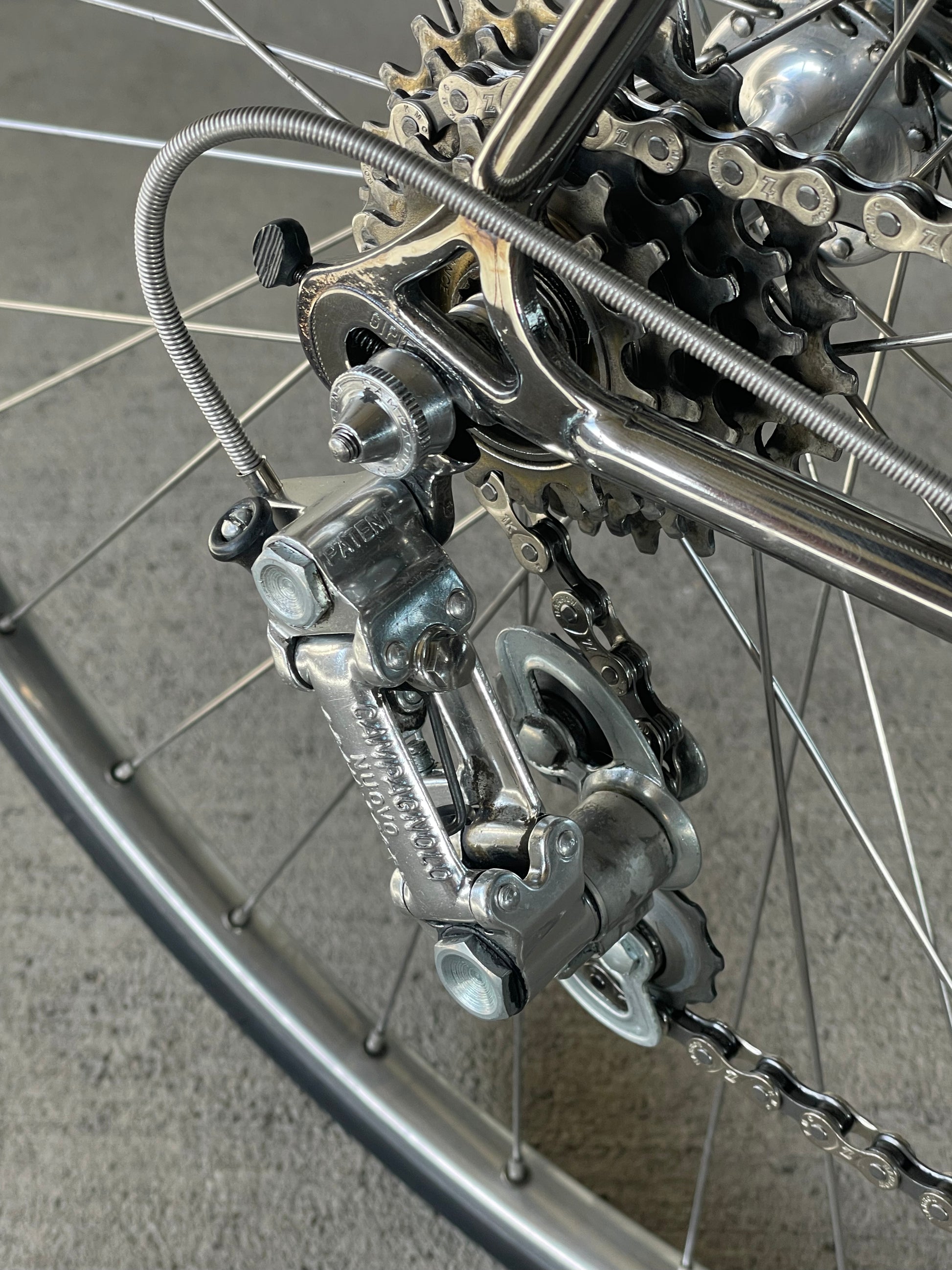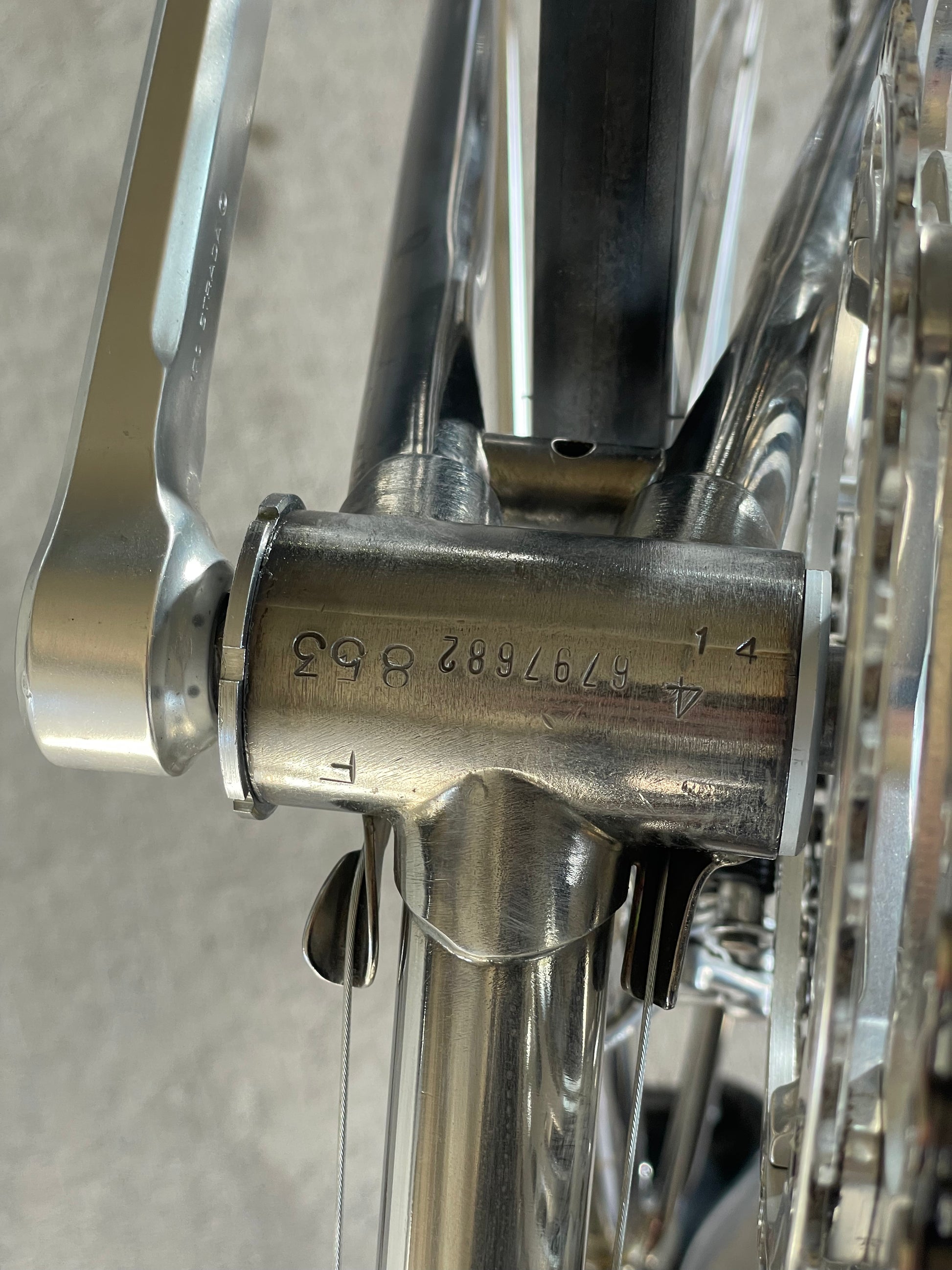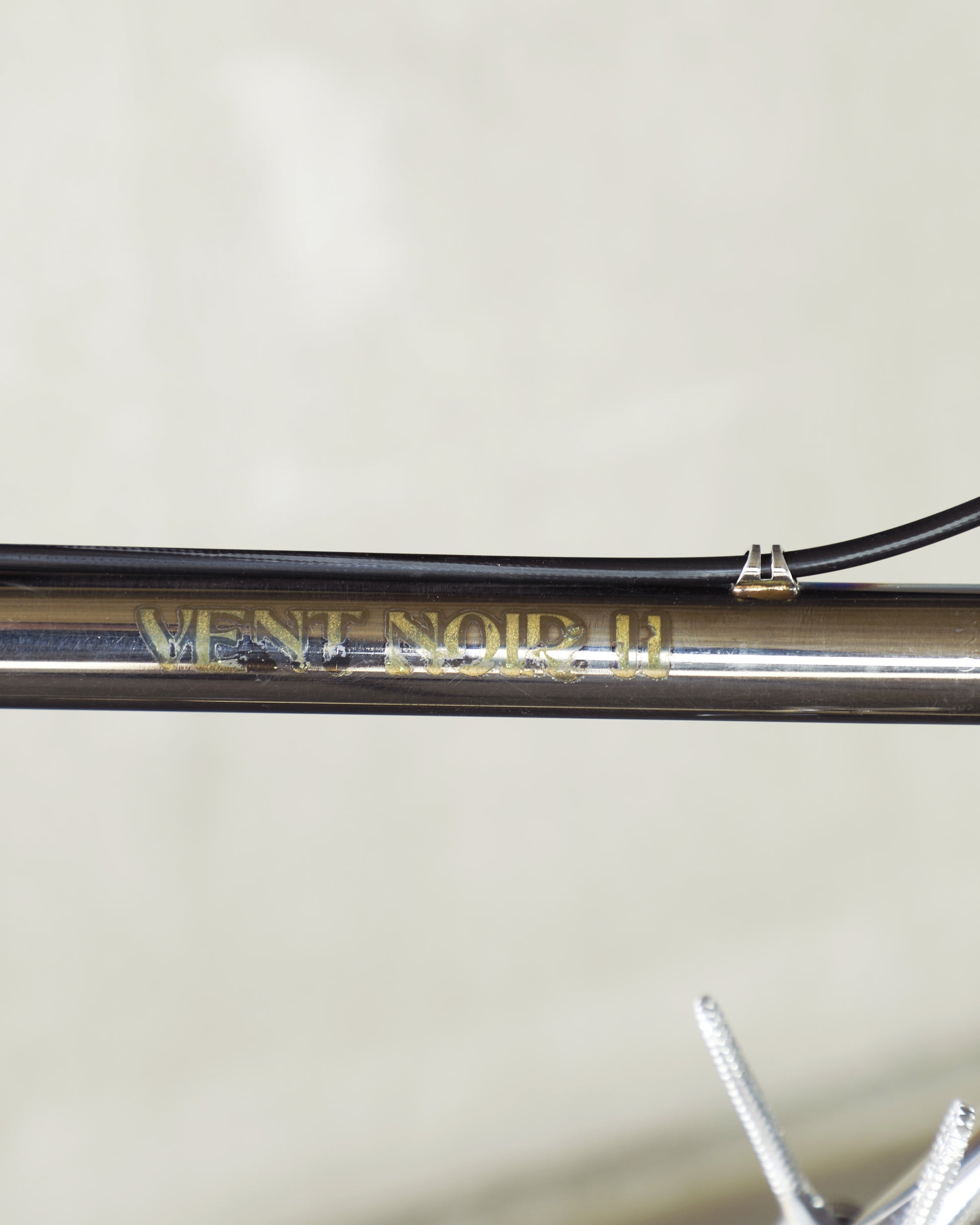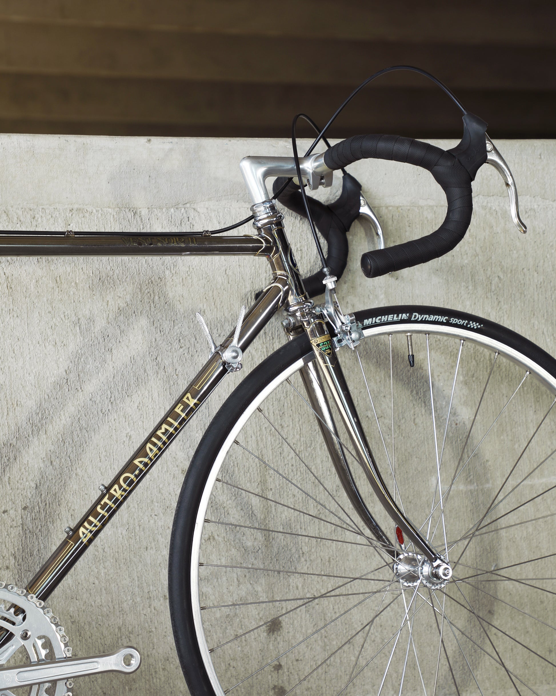 This Austro Daimler Vent Noir II is absolutely stunning. The frame and fork are made with Reynolds 531 tubing and the bike comes equipped with a complete Campagnolo Gran Sport groupset. The frame is finished in a very unique smoked chrome with gold decals and pin-striping. Overall, this bike is in great condition. There are no dents, bends, or cracks in the frame. This bike was fully refurbished - new bar tape, cables, and cable housing was installed and the bottom bracket was given a full rebuild. All parts were removed, cleaned, and then carefully reinstalled. It's ready to ride. The brake hoods were also replaced and they don't have the greatest fit. They don't slide around, they just don't hug the entire lever towards the top. The saddle also shows some wear. This bike in the sun will make your jaw drop!