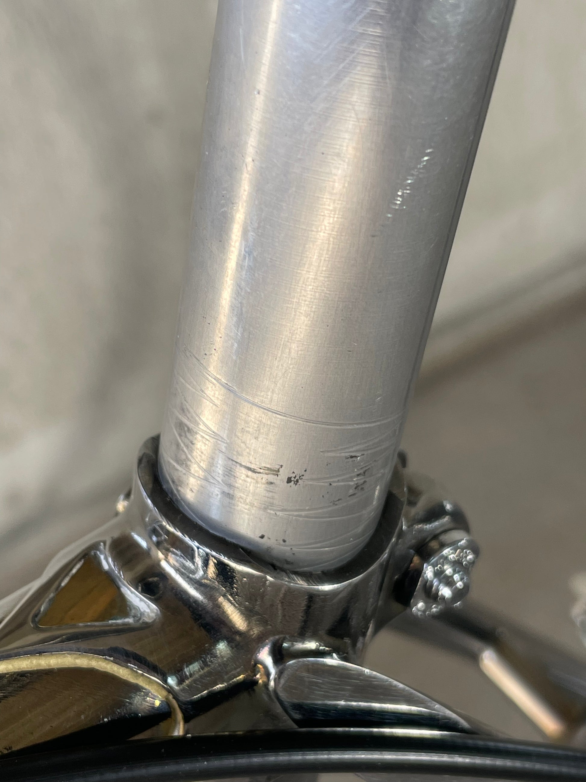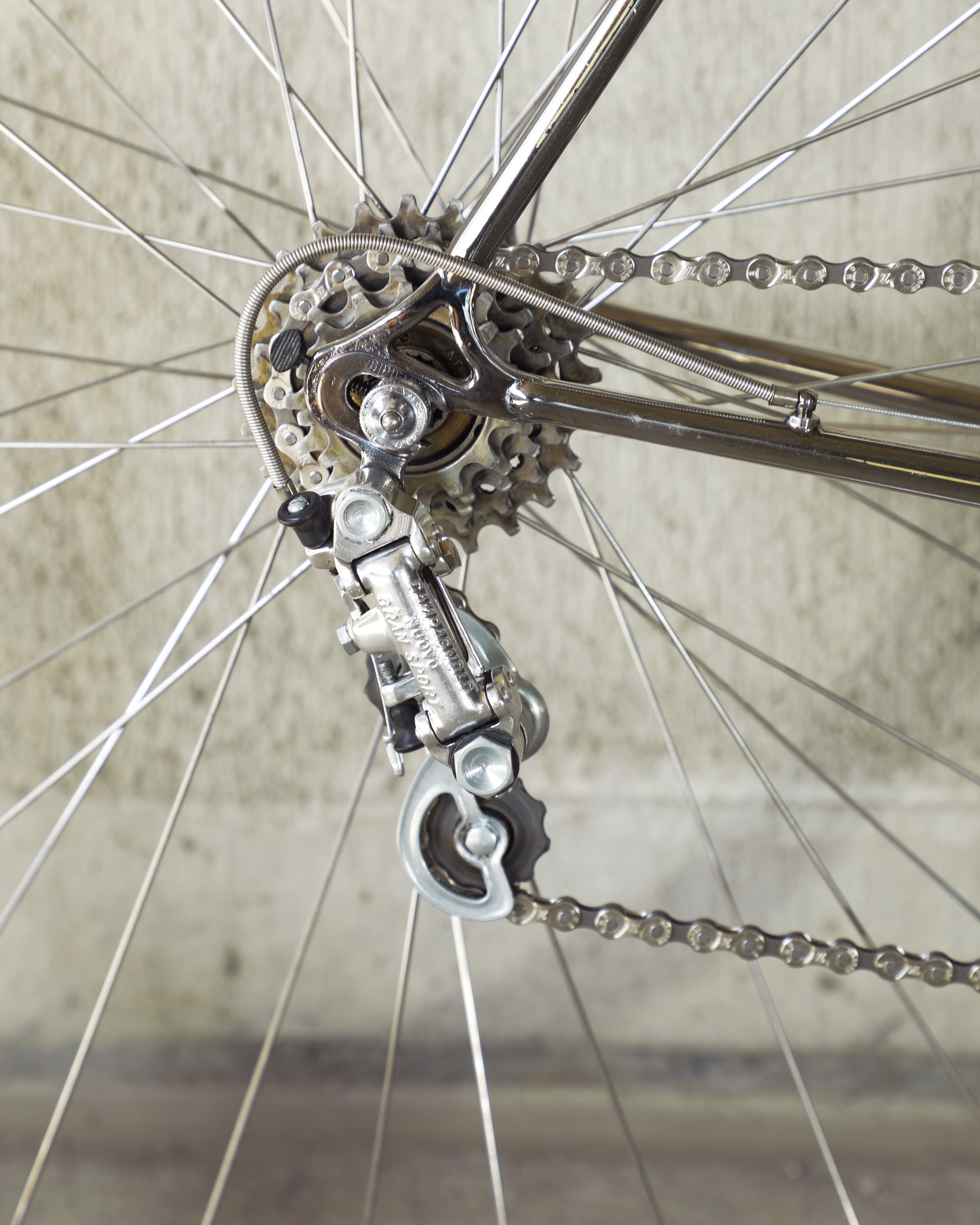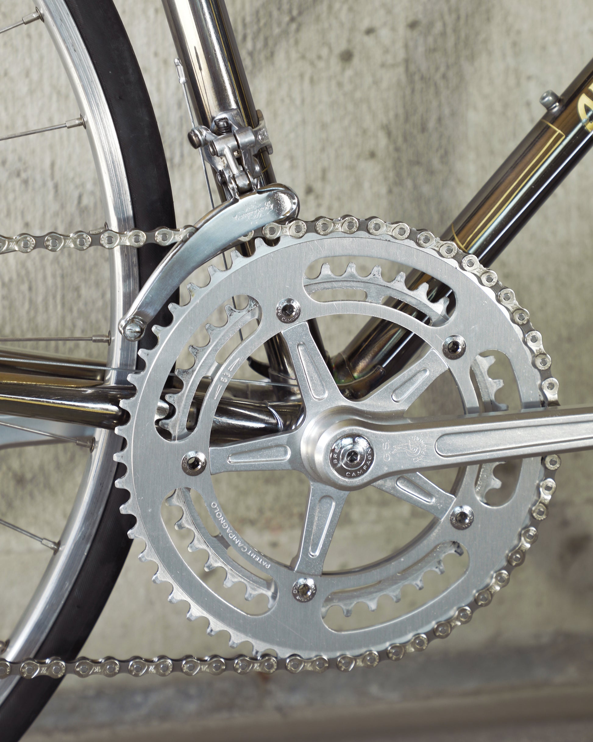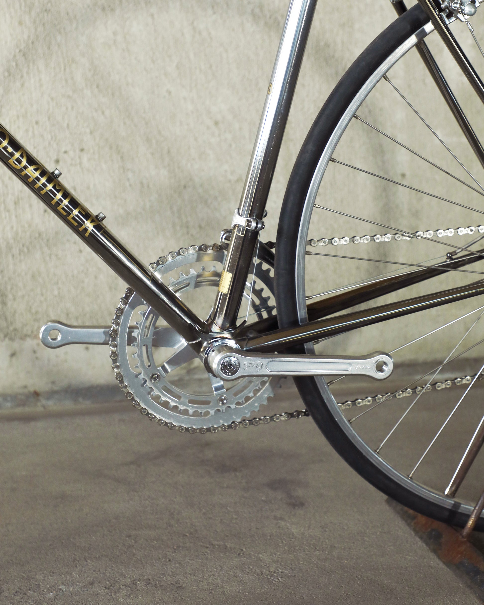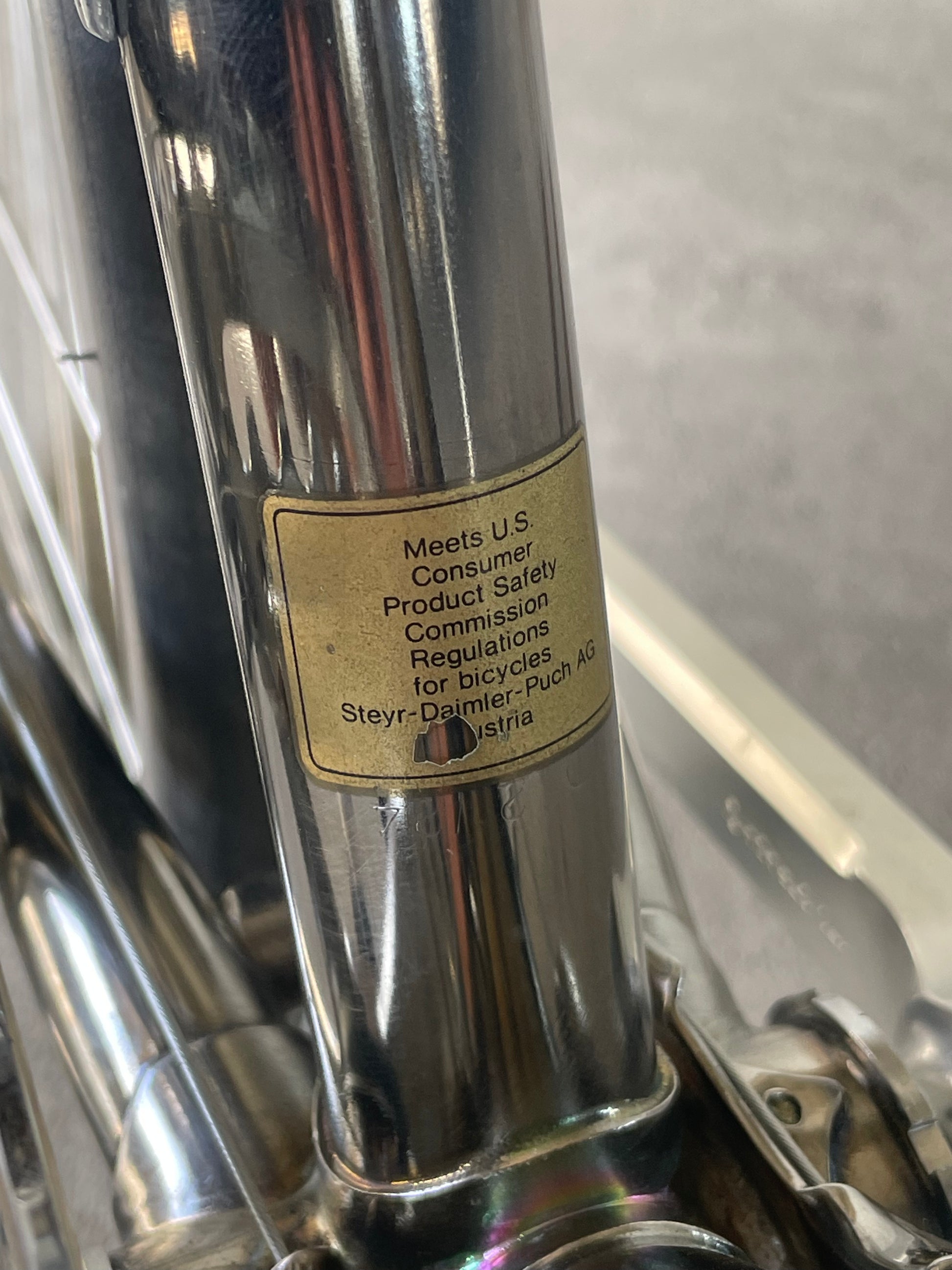 This Austro Daimler Vent Noir II is absolutely stunning. The frame and fork are made with Reynolds 531 tubing and the bike comes equipped with a complete Campagnolo Gran Sport groupset. The frame is finished in a very unique smoked chrome with gold decals and pin-striping. Overall, this bike is in great condition. There are no dents, bends, or cracks in the frame. This bike was fully refurbished - new bar tape, cables, and cable housing was installed and the bottom bracket was given a full rebuild. All parts were removed, cleaned, and then carefully reinstalled. It's ready to ride. The brake hoods were also replaced and they don't have the greatest fit. They don't slide around, they just don't hug the entire lever towards the top. The saddle also shows some wear. This bike in the sun will make your jaw drop!