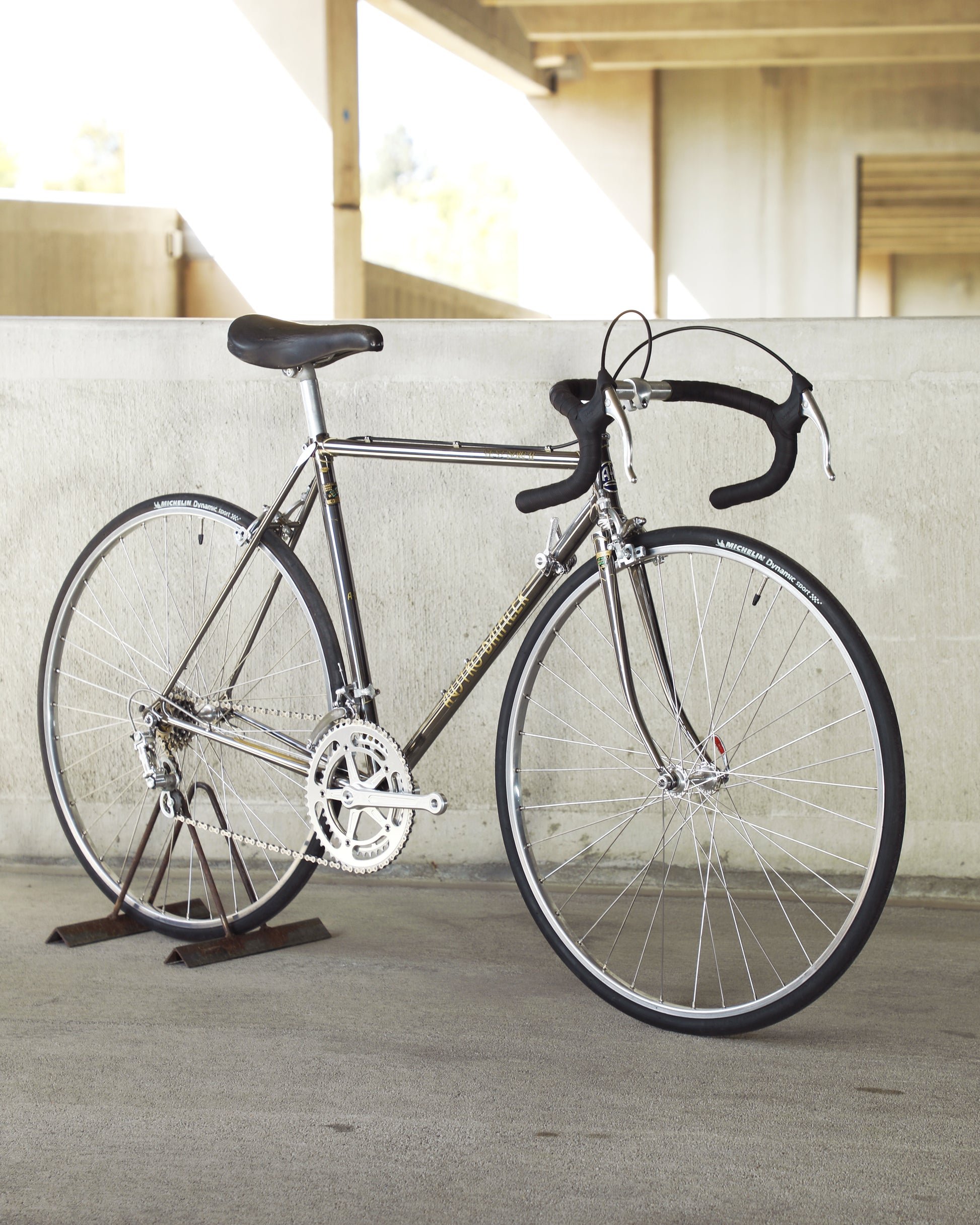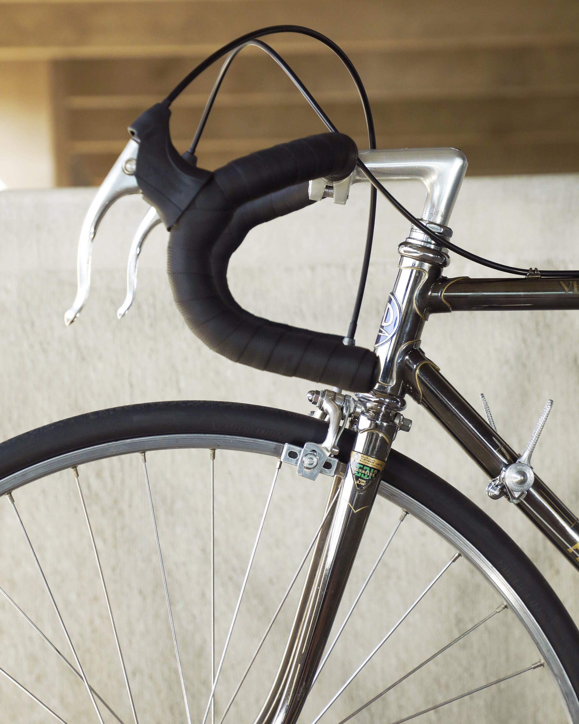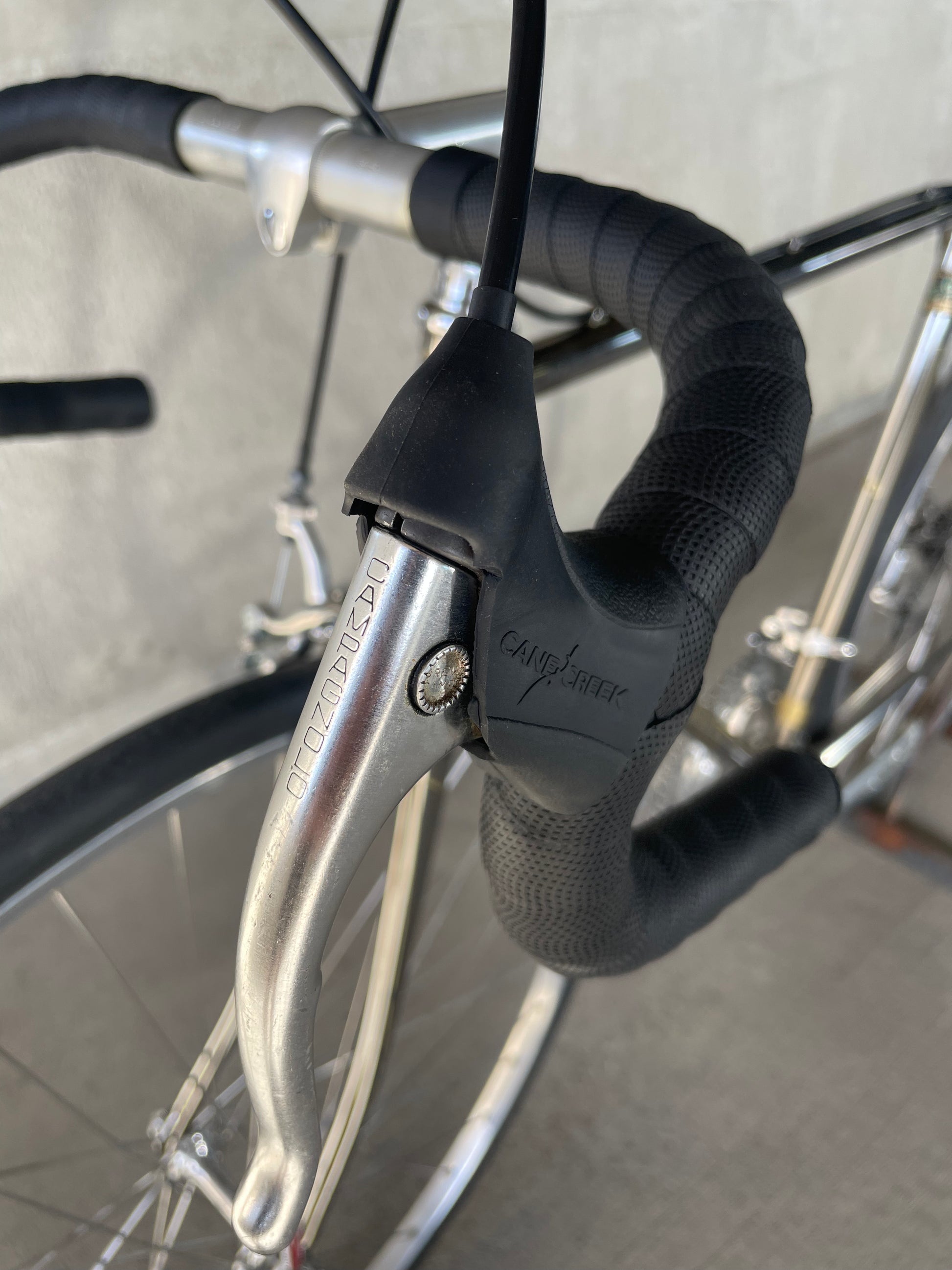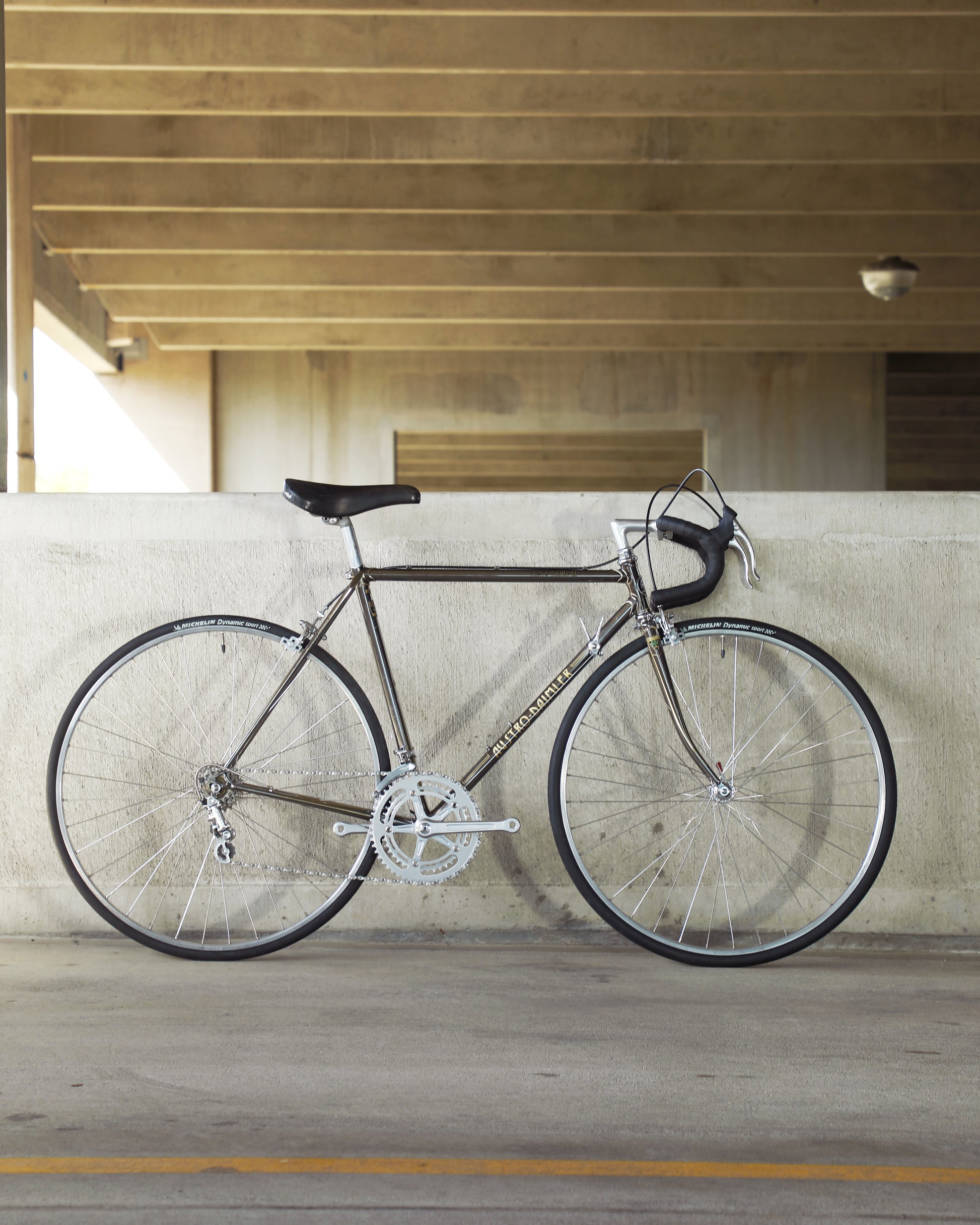 This Austro Daimler Vent Noir II is absolutely stunning. The frame and fork are made with Reynolds 531 tubing and the bike comes equipped with a complete Campagnolo Gran Sport groupset. The frame is finished in a very unique smoked chrome with gold decals and pin-striping. Overall, this bike is in great condition. There are no dents, bends, or cracks in the frame. This bike was fully refurbished - new bar tape, cables, and cable housing was installed and the bottom bracket was given a full rebuild. All parts were removed, cleaned, and then carefully reinstalled. It's ready to ride. The brake hoods were also replaced and they don't have the greatest fit. They don't slide around, they just don't hug the entire lever towards the top. The saddle also shows some wear. This bike in the sun will make your jaw drop!