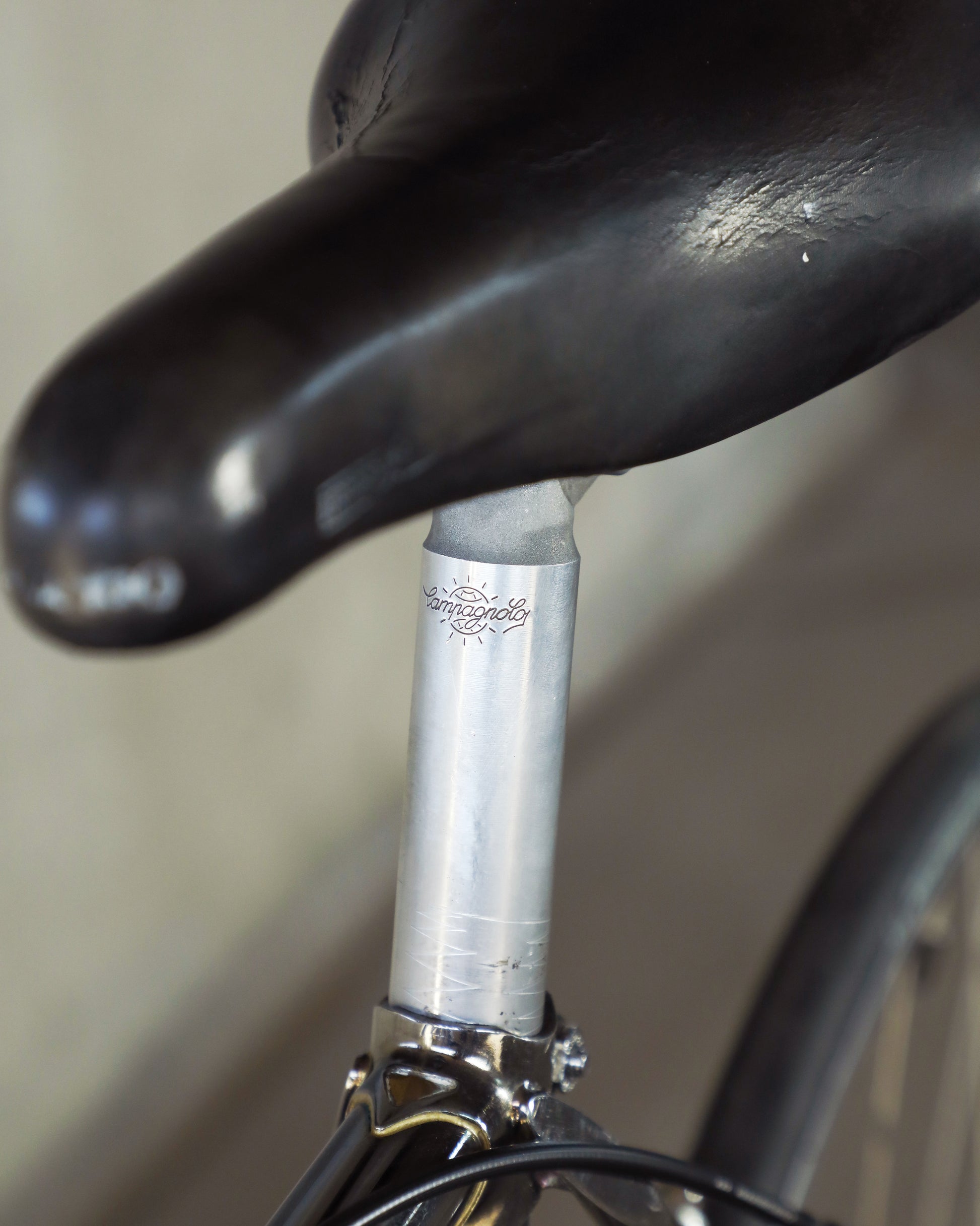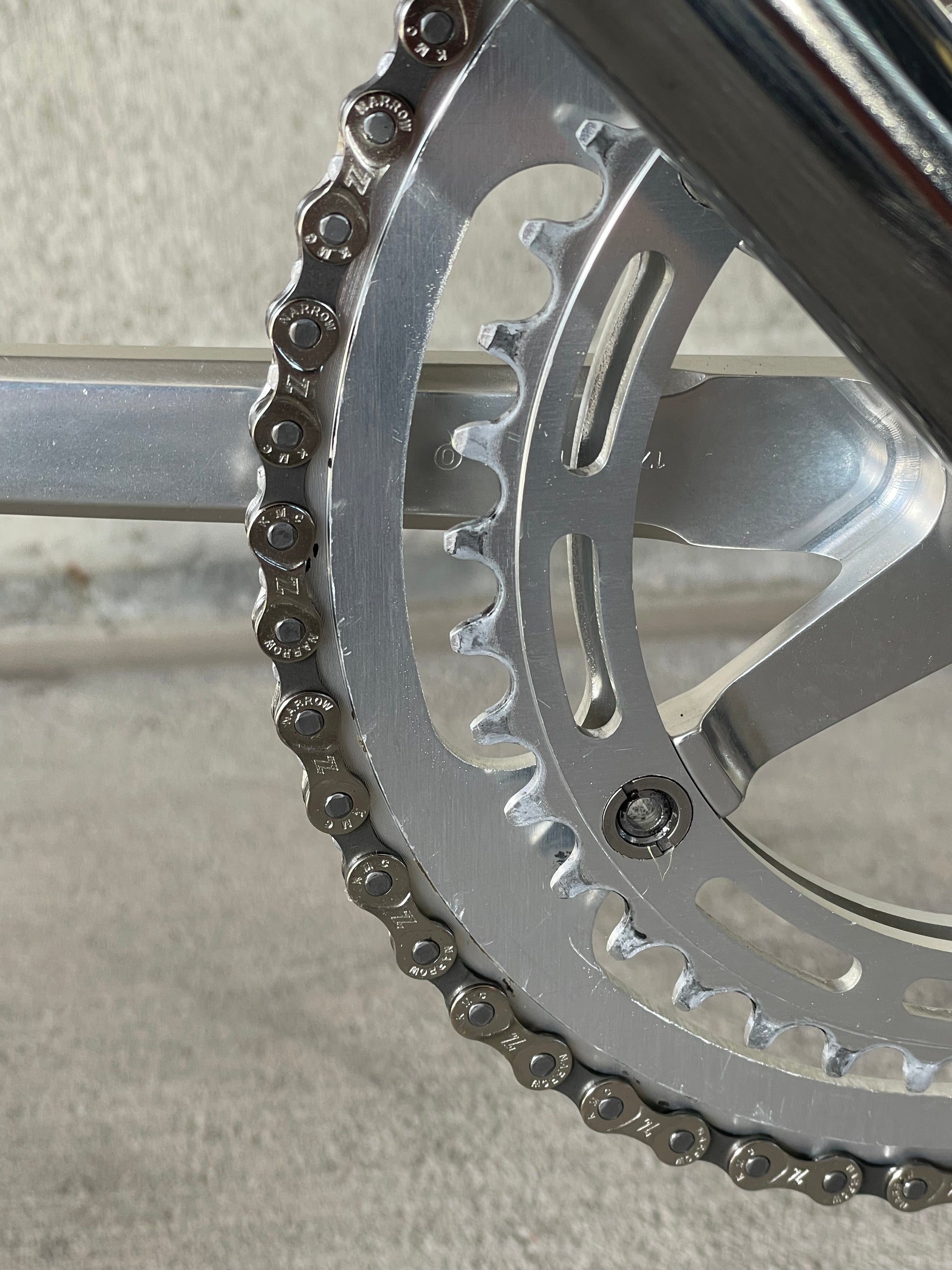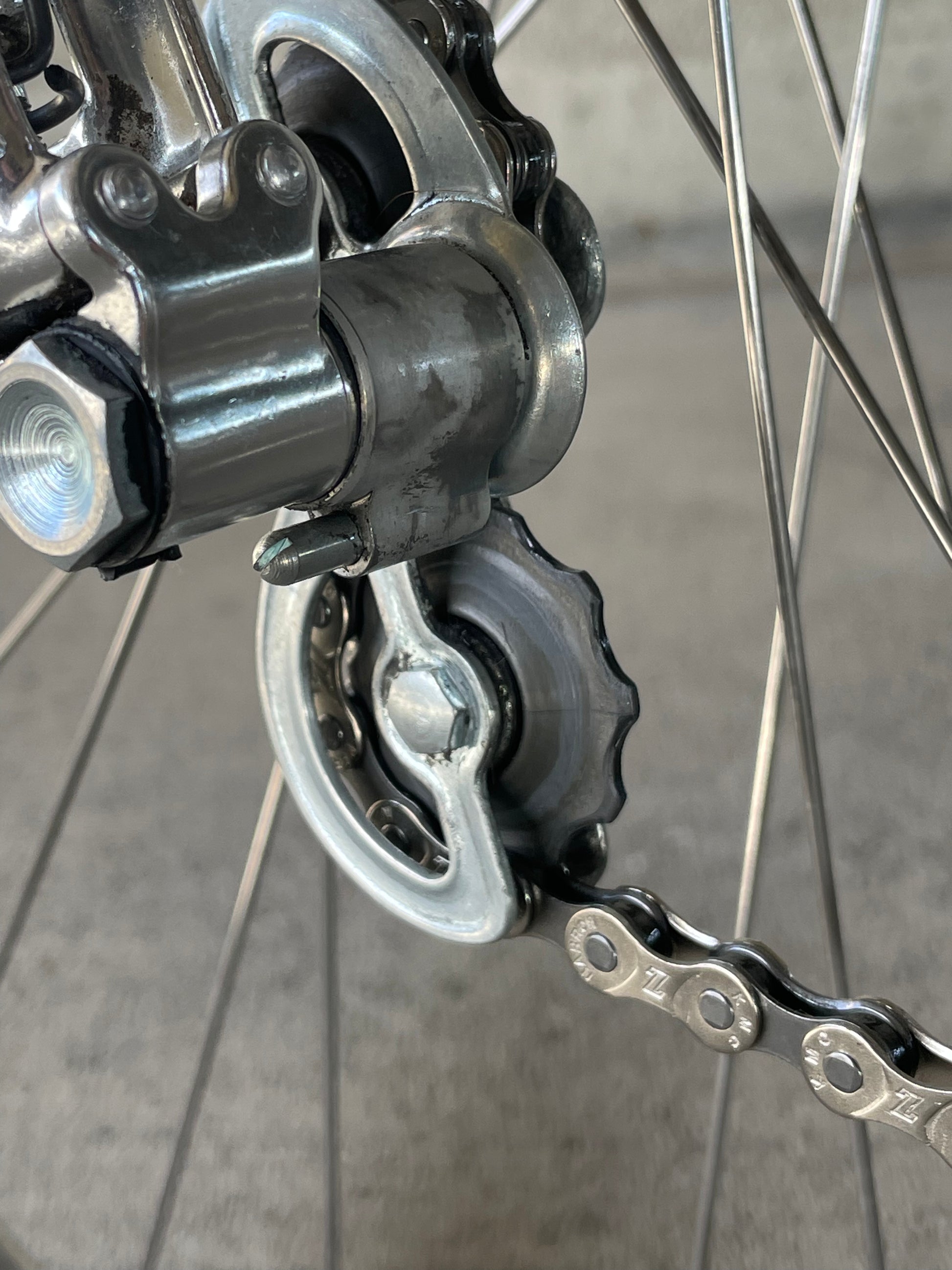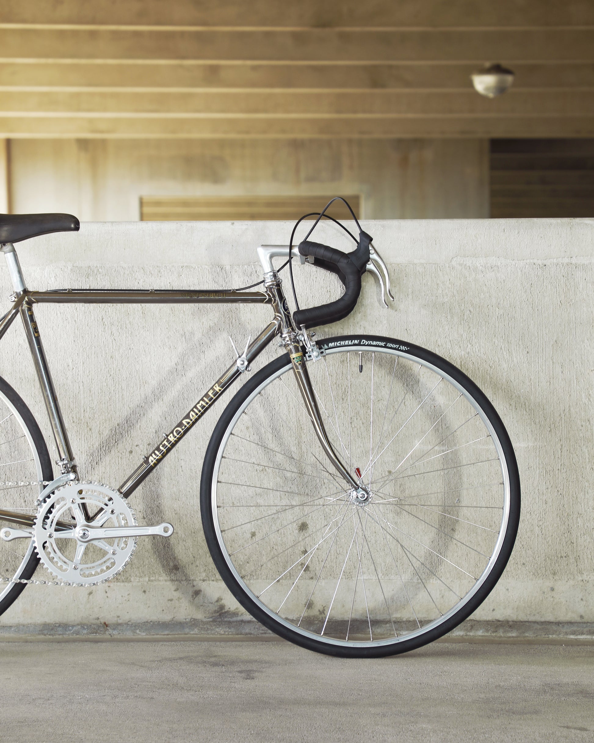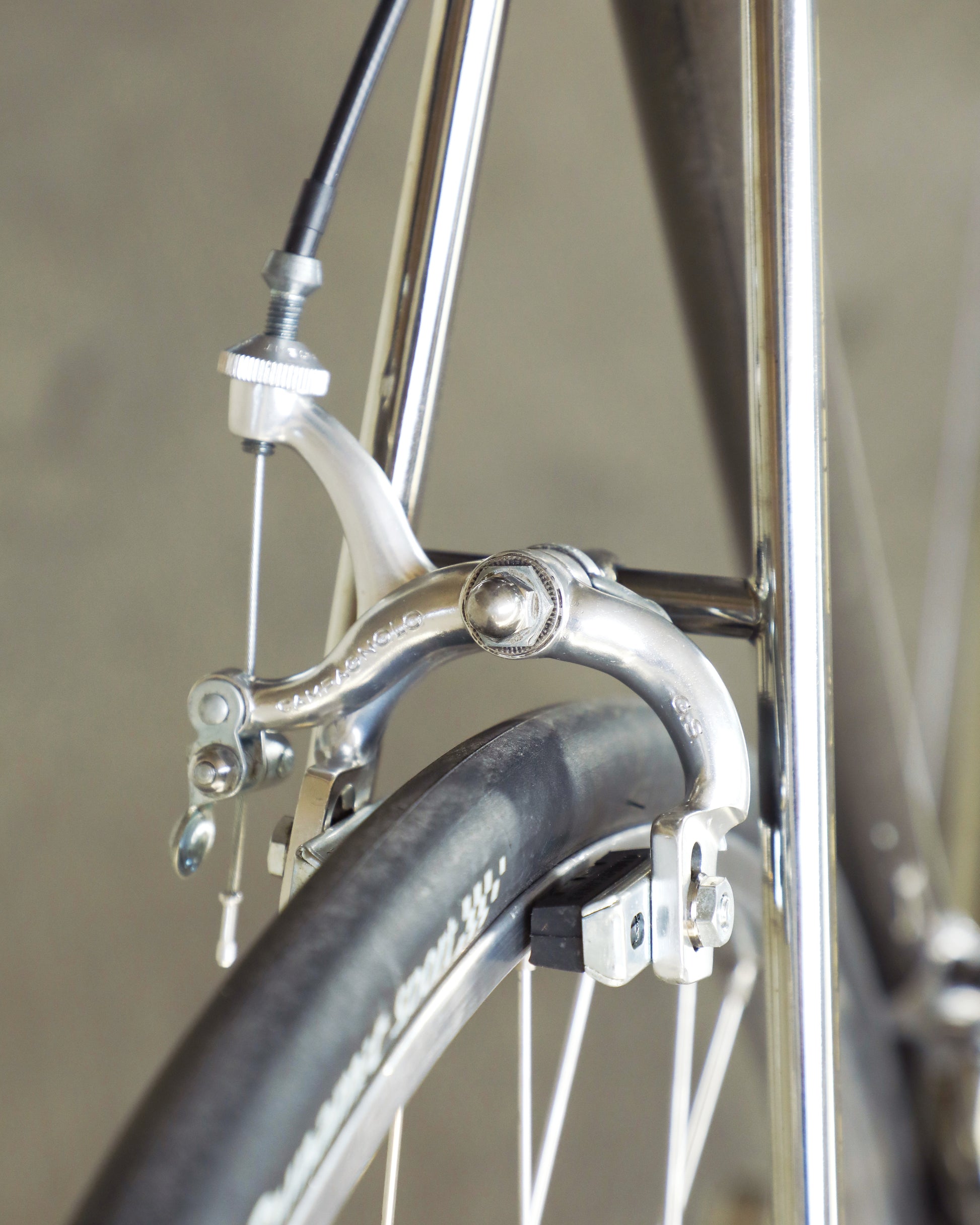 This Austro Daimler Vent Noir II is absolutely stunning. The frame and fork are made with Reynolds 531 tubing and the bike comes equipped with a complete Campagnolo Gran Sport groupset. The frame is finished in a very unique smoked chrome with gold decals and pin-striping. Overall, this bike is in great condition. There are no dents, bends, or cracks in the frame. This bike was fully refurbished - new bar tape, cables, and cable housing was installed and the bottom bracket was given a full rebuild. All parts were removed, cleaned, and then carefully reinstalled. It's ready to ride. The brake hoods were also replaced and they don't have the greatest fit. They don't slide around, they just don't hug the entire lever towards the top. The saddle also shows some wear. This bike in the sun will make your jaw drop!