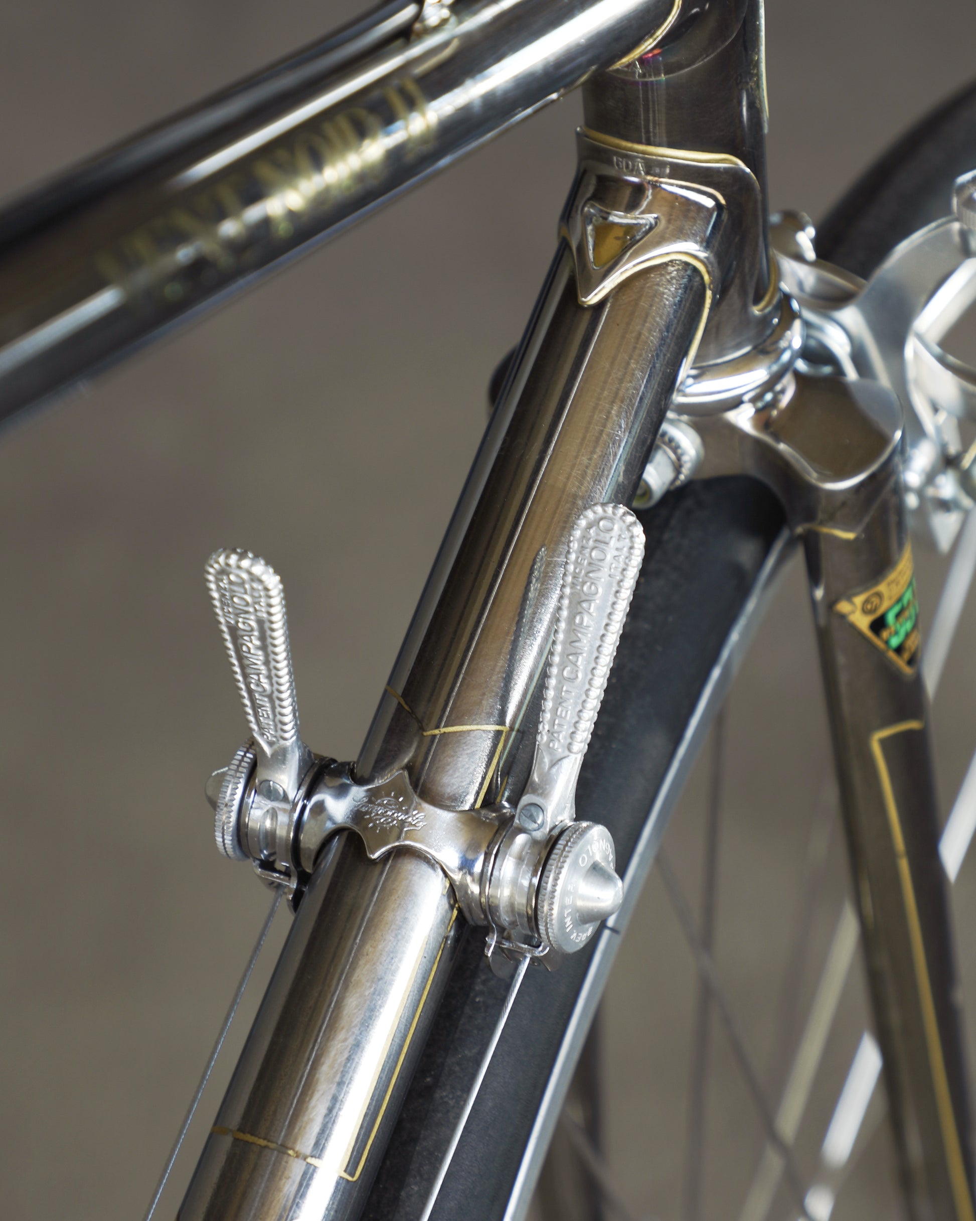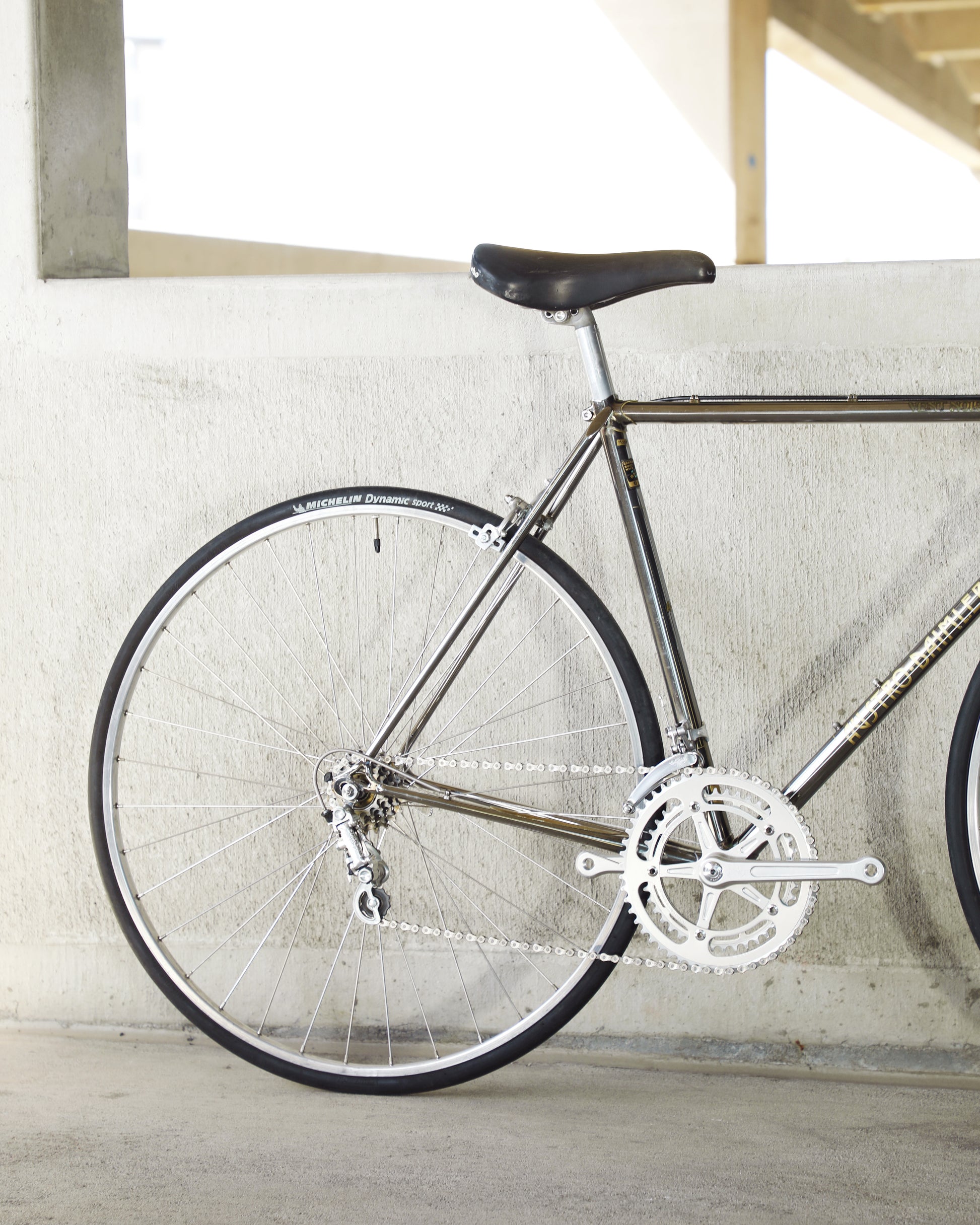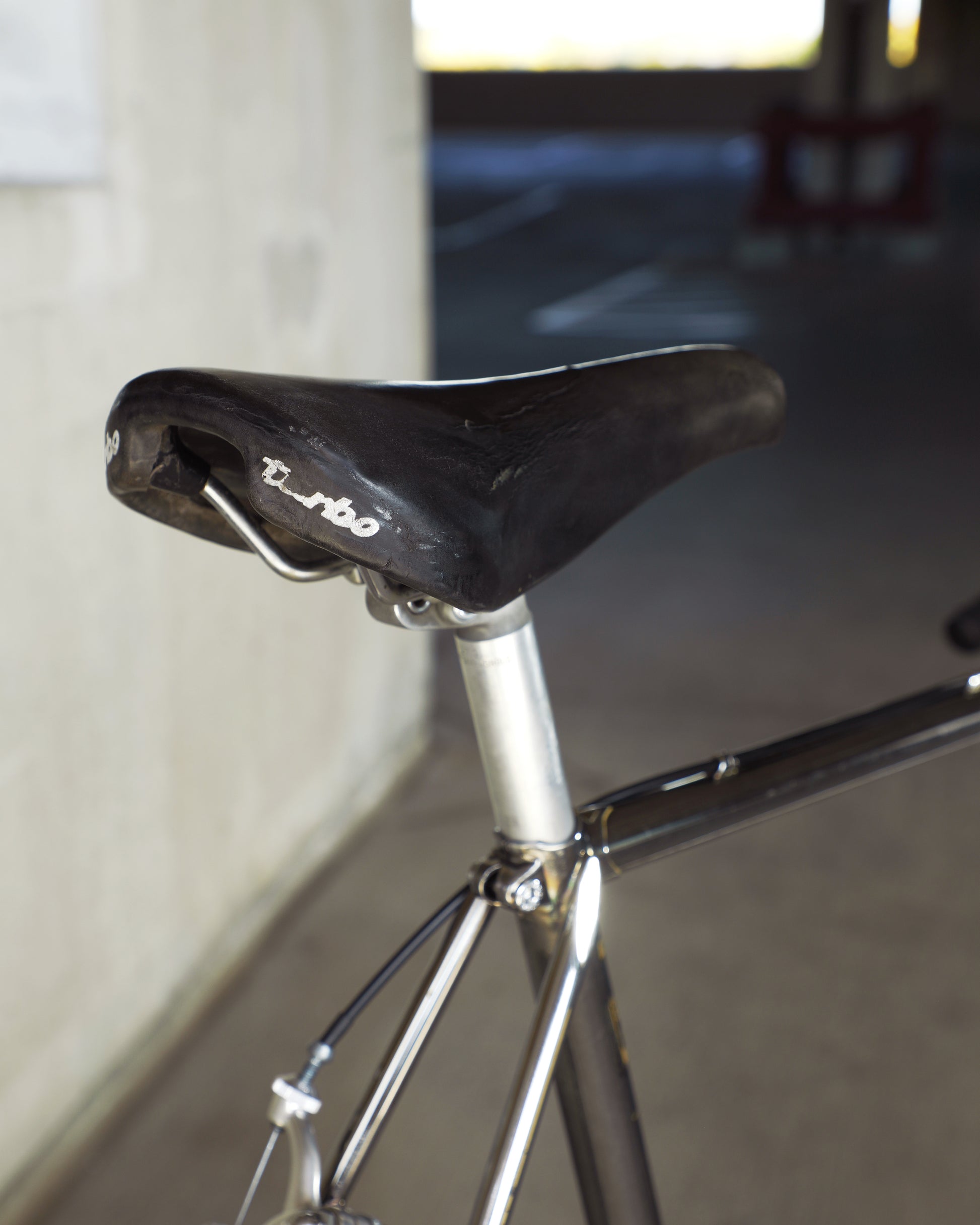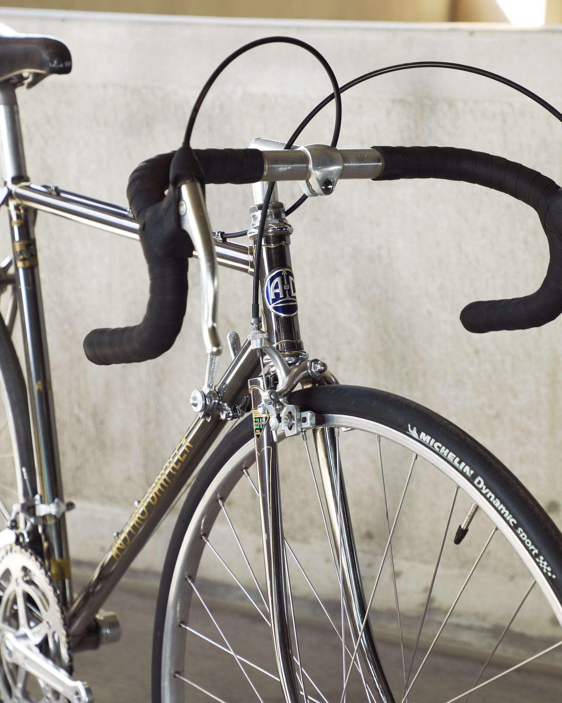 This Austro Daimler Vent Noir II is absolutely stunning. The frame and fork are made with Reynolds 531 tubing and the bike comes equipped with a complete Campagnolo Gran Sport groupset. The frame is finished in a very unique smoked chrome with gold decals and pin-striping. Overall, this bike is in great condition. There are no dents, bends, or cracks in the frame. This bike was fully refurbished - new bar tape, cables, and cable housing was installed and the bottom bracket was given a full rebuild. All parts were removed, cleaned, and then carefully reinstalled. It's ready to ride. The brake hoods were also replaced and they don't have the greatest fit. They don't slide around, they just don't hug the entire lever towards the top. The saddle also shows some wear. This bike in the sun will make your jaw drop!