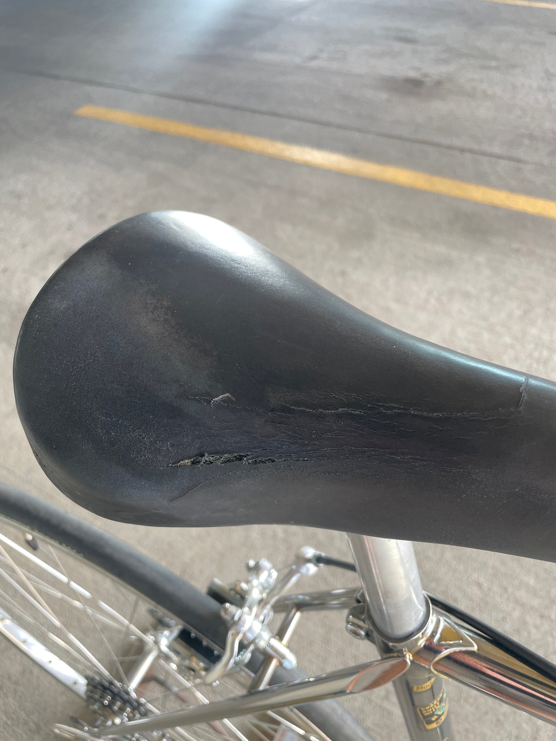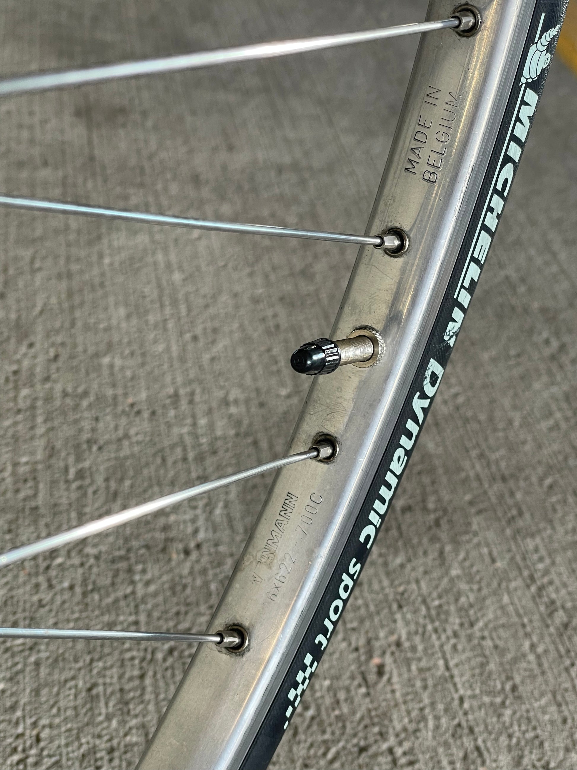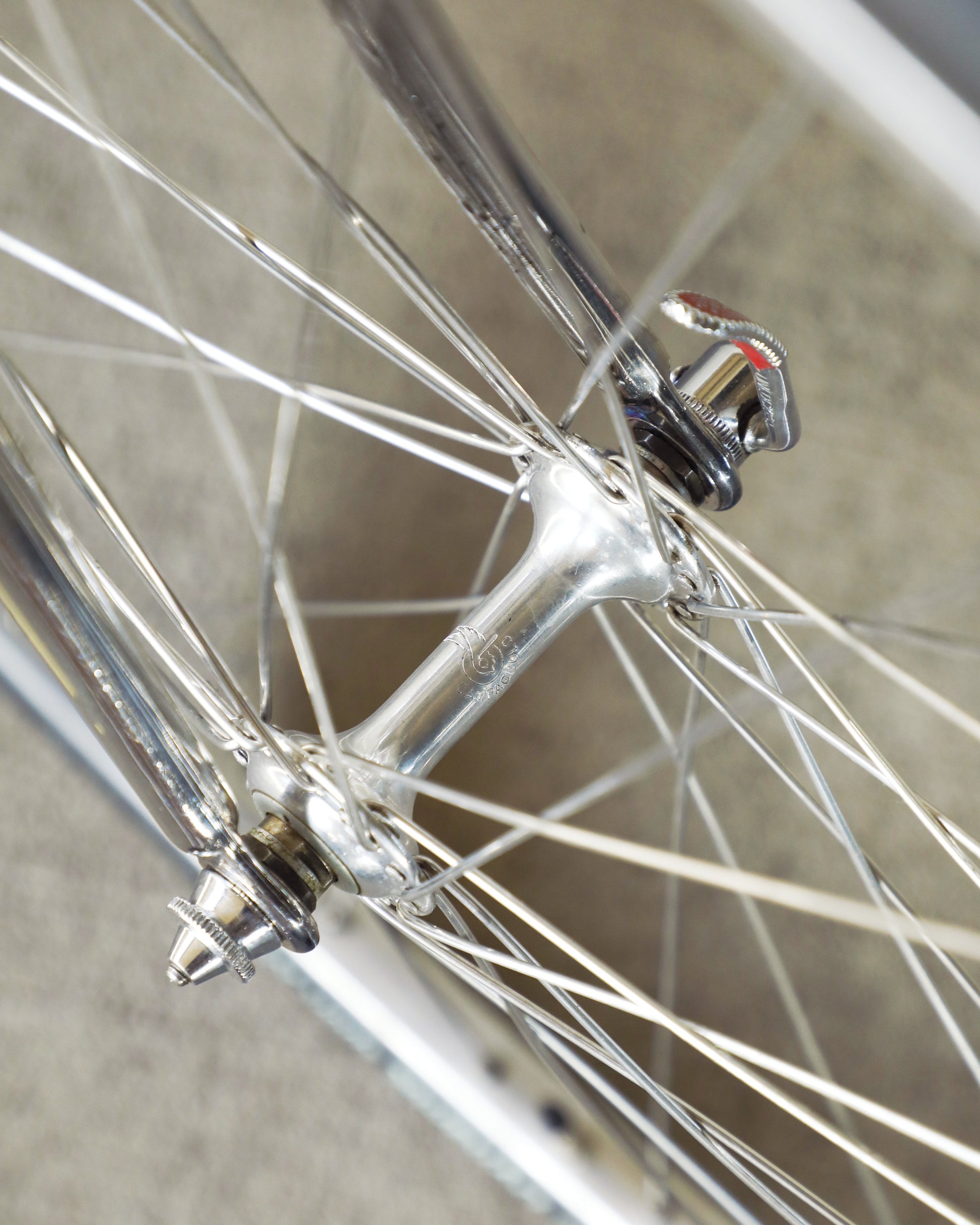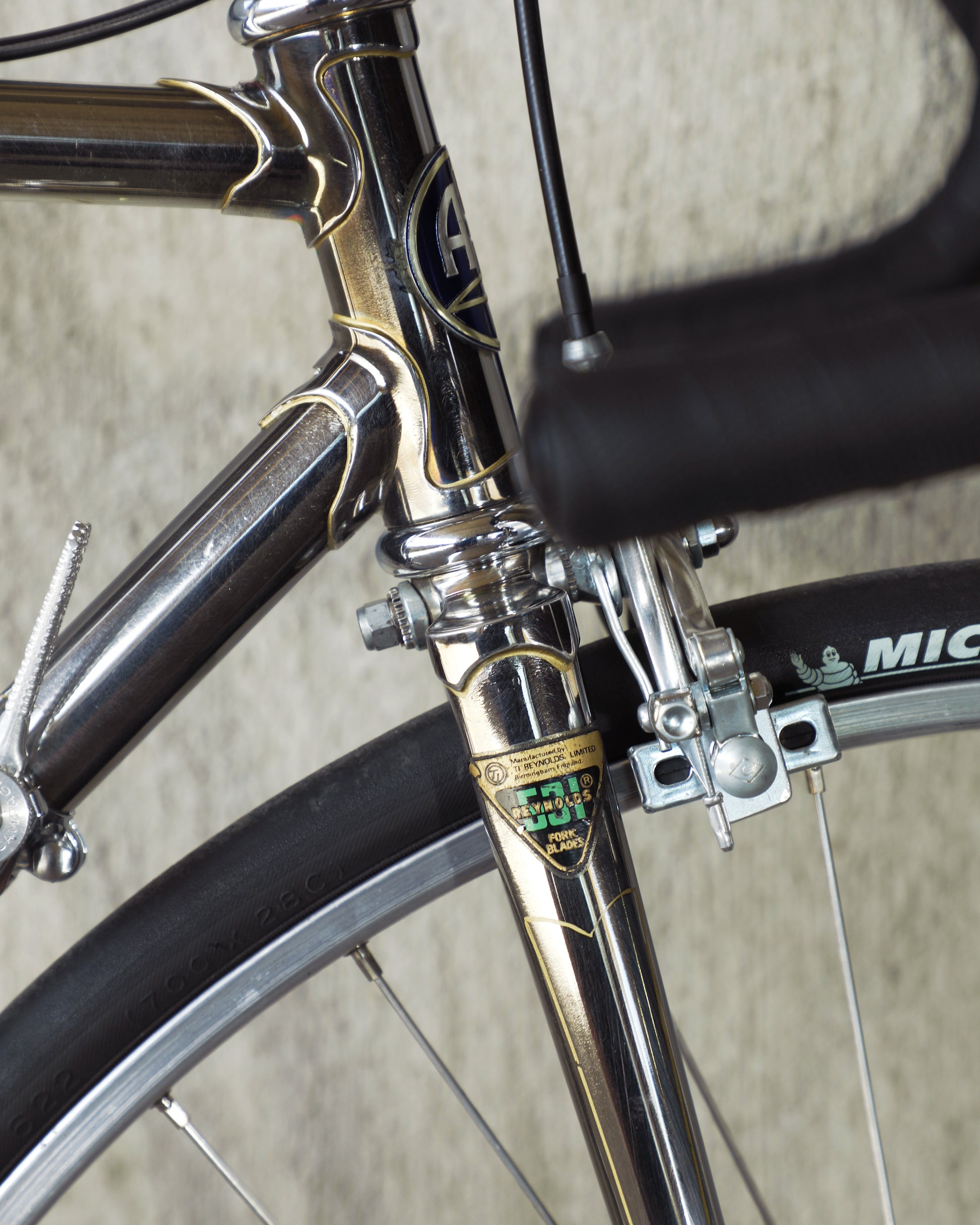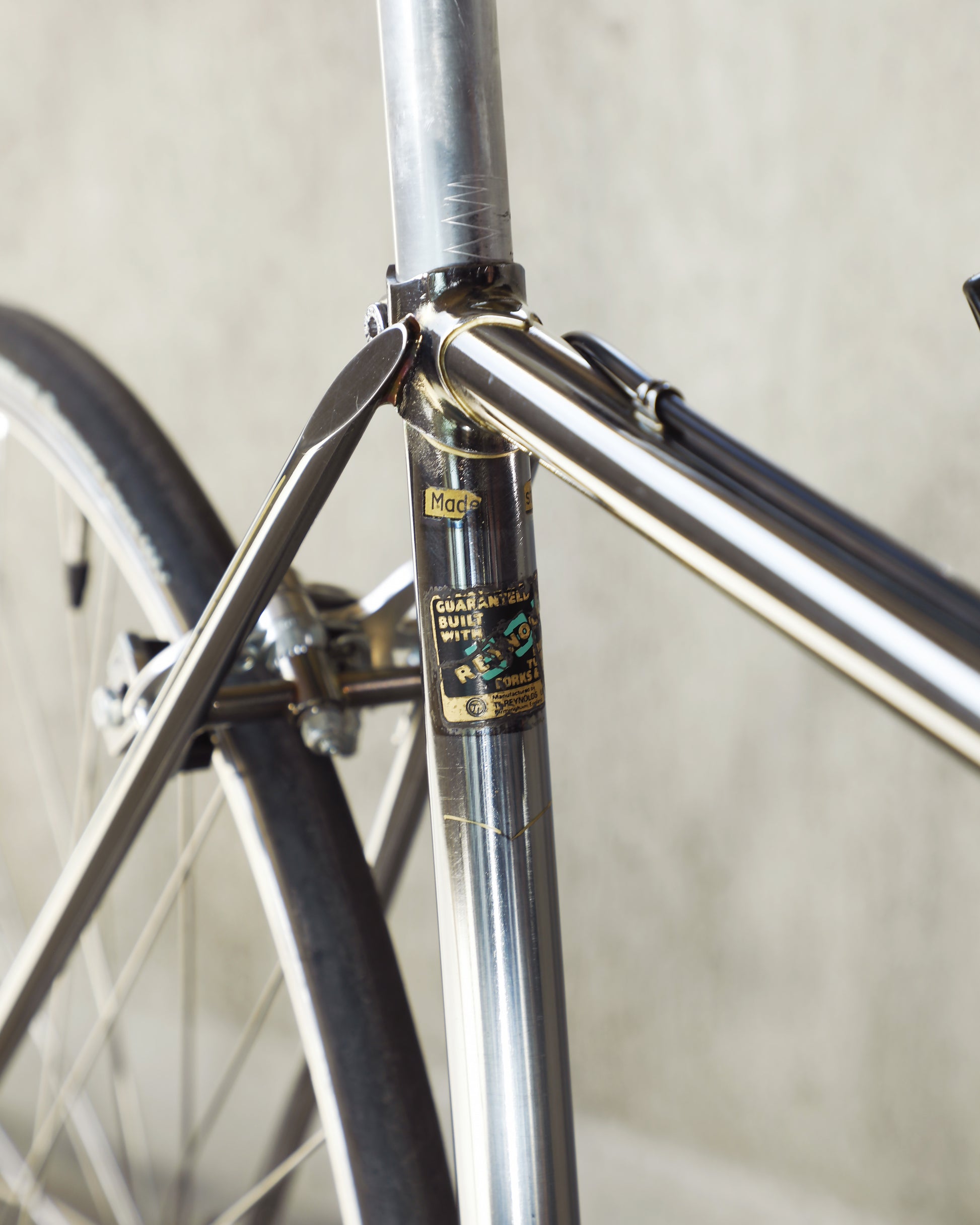 This Austro Daimler Vent Noir II is absolutely stunning. The frame and fork are made with Reynolds 531 tubing and the bike comes equipped with a complete Campagnolo Gran Sport groupset. The frame is finished in a very unique smoked chrome with gold decals and pin-striping. Overall, this bike is in great condition. There are no dents, bends, or cracks in the frame. This bike was fully refurbished - new bar tape, cables, and cable housing was installed and the bottom bracket was given a full rebuild. All parts were removed, cleaned, and then carefully reinstalled. It's ready to ride. The brake hoods were also replaced and they don't have the greatest fit. They don't slide around, they just don't hug the entire lever towards the top. The saddle also shows some wear. This bike in the sun will make your jaw drop!