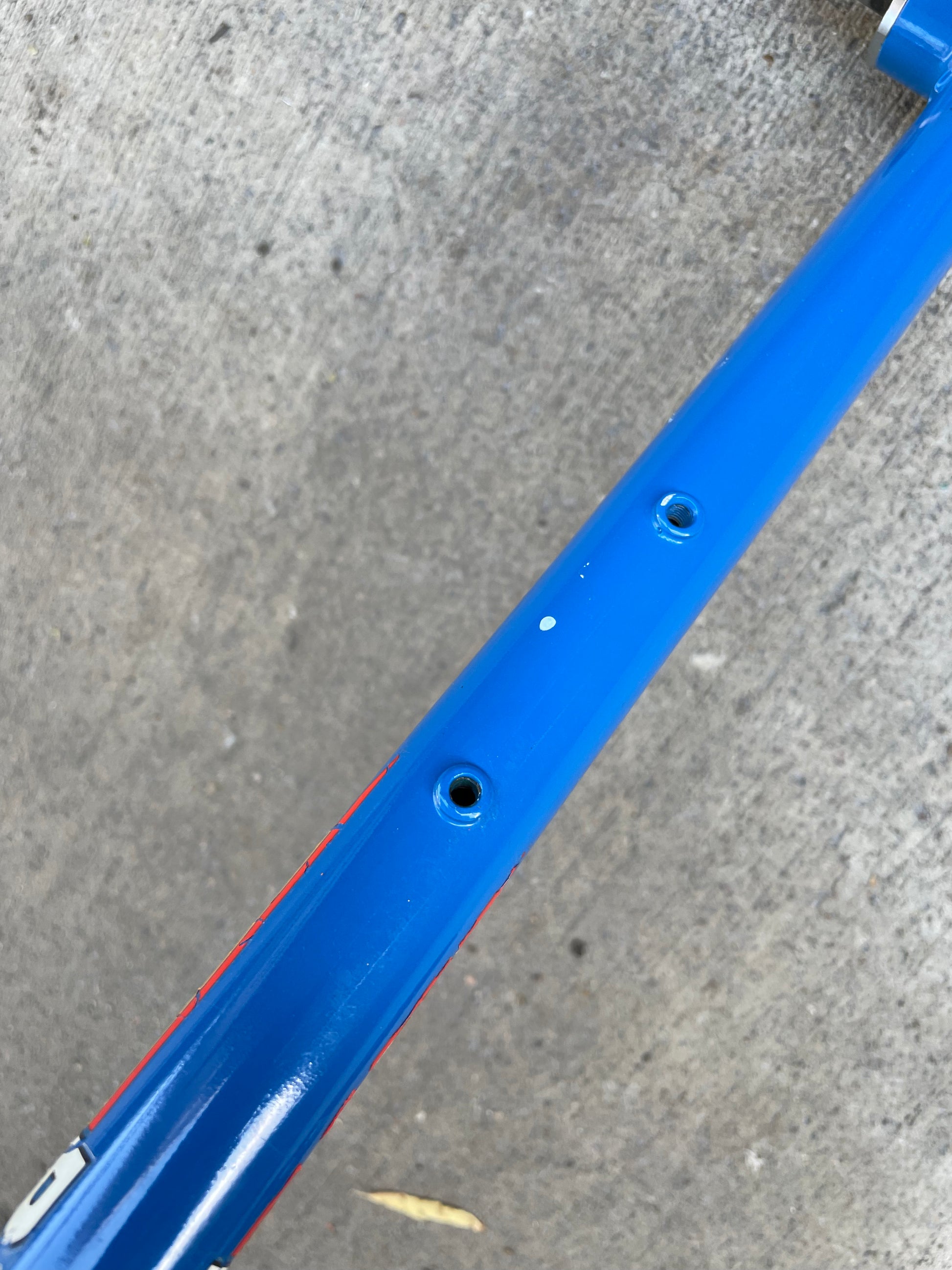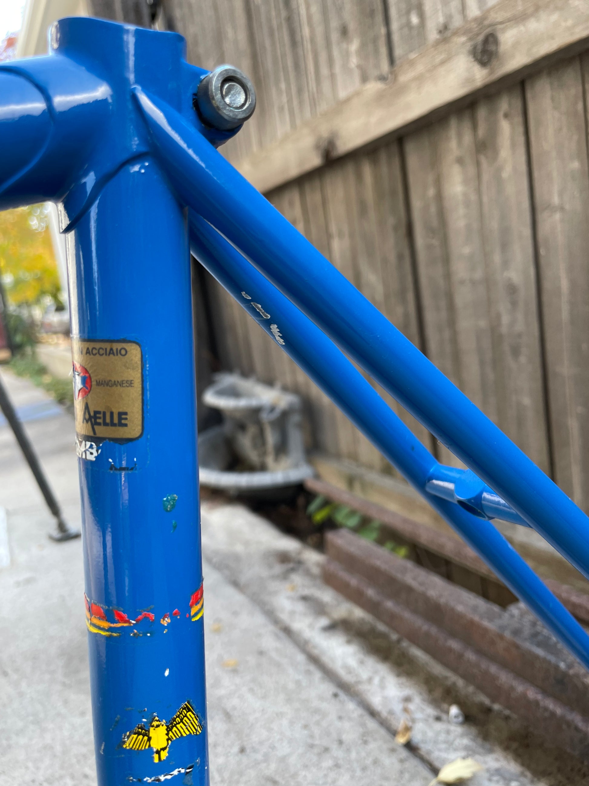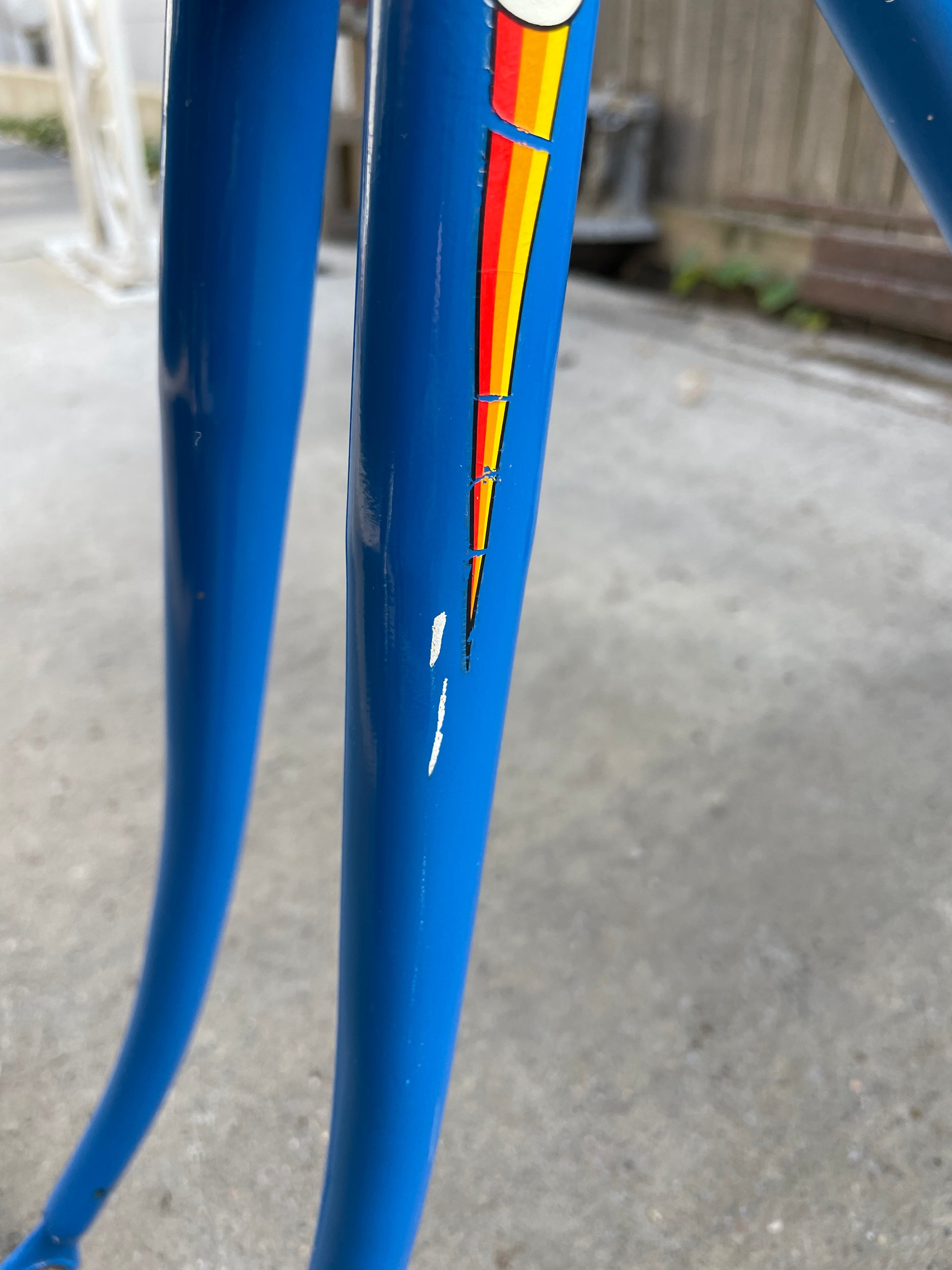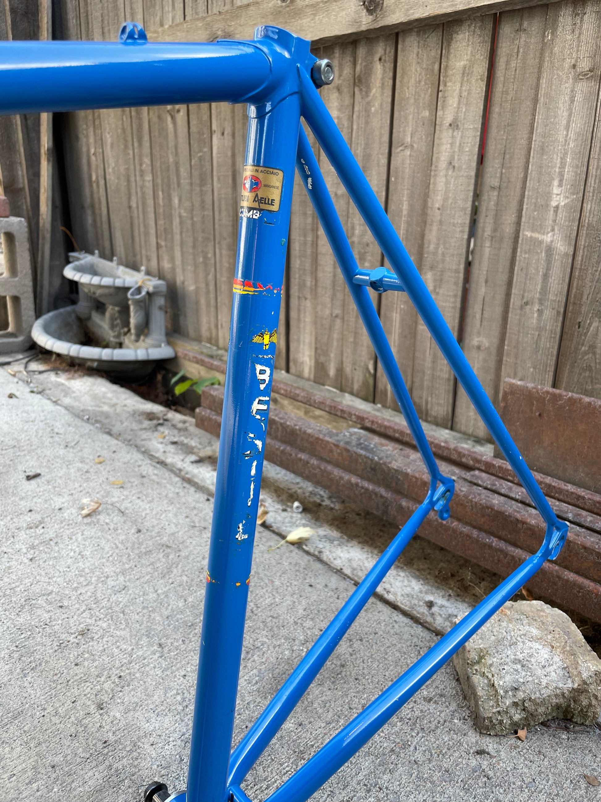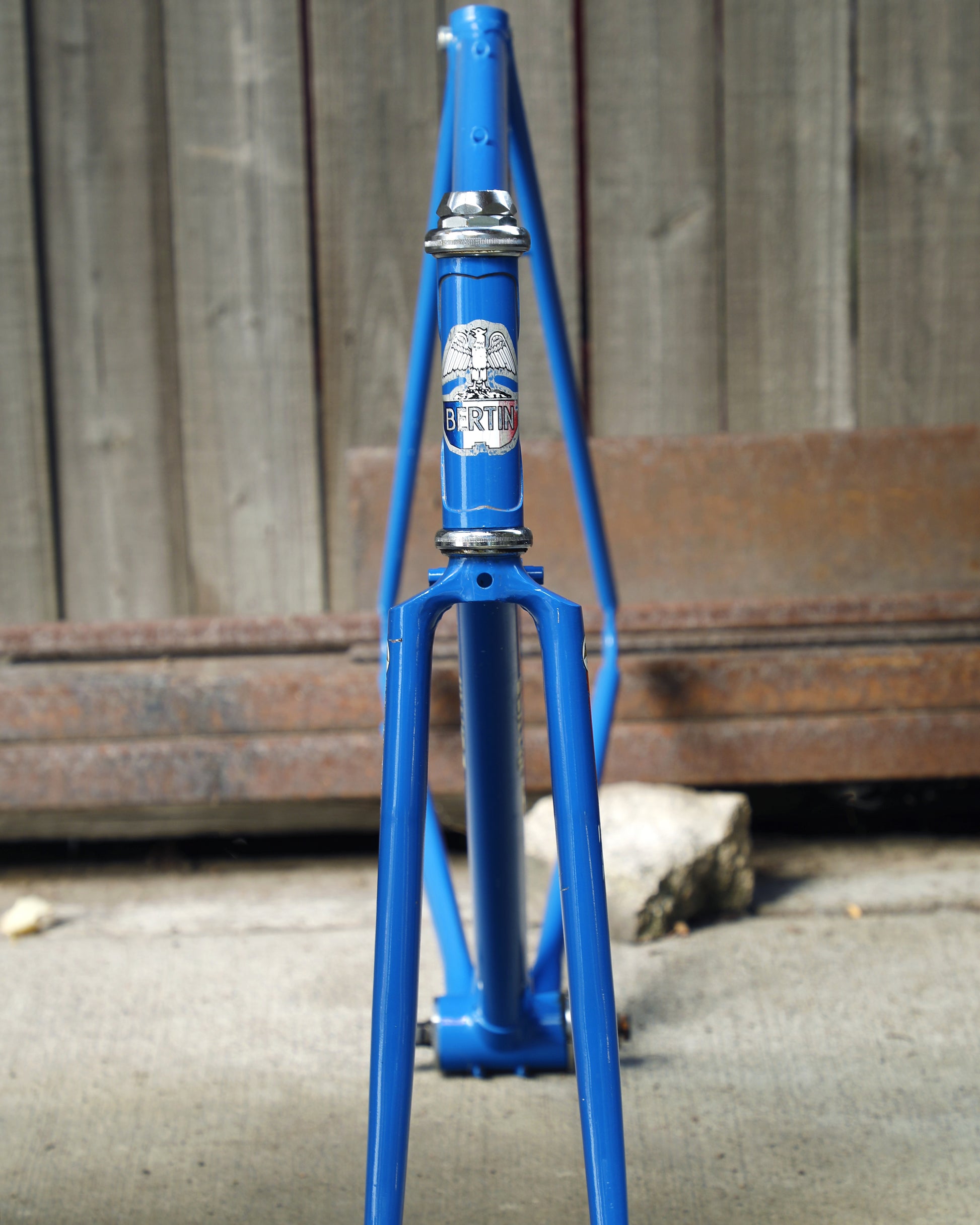 This Andre Bertin road frameset is in very good condition! There are a few paint chips here and there, but nothing worth writing home about. No dents, bends, or cracks anywhere on the frame. The headset and bottom bracket have not been removed and inspected. The frame is made from Columbus Aelle tubing, which was a very solid tubeset at the time! This is a great high quality, entry level steel frame.