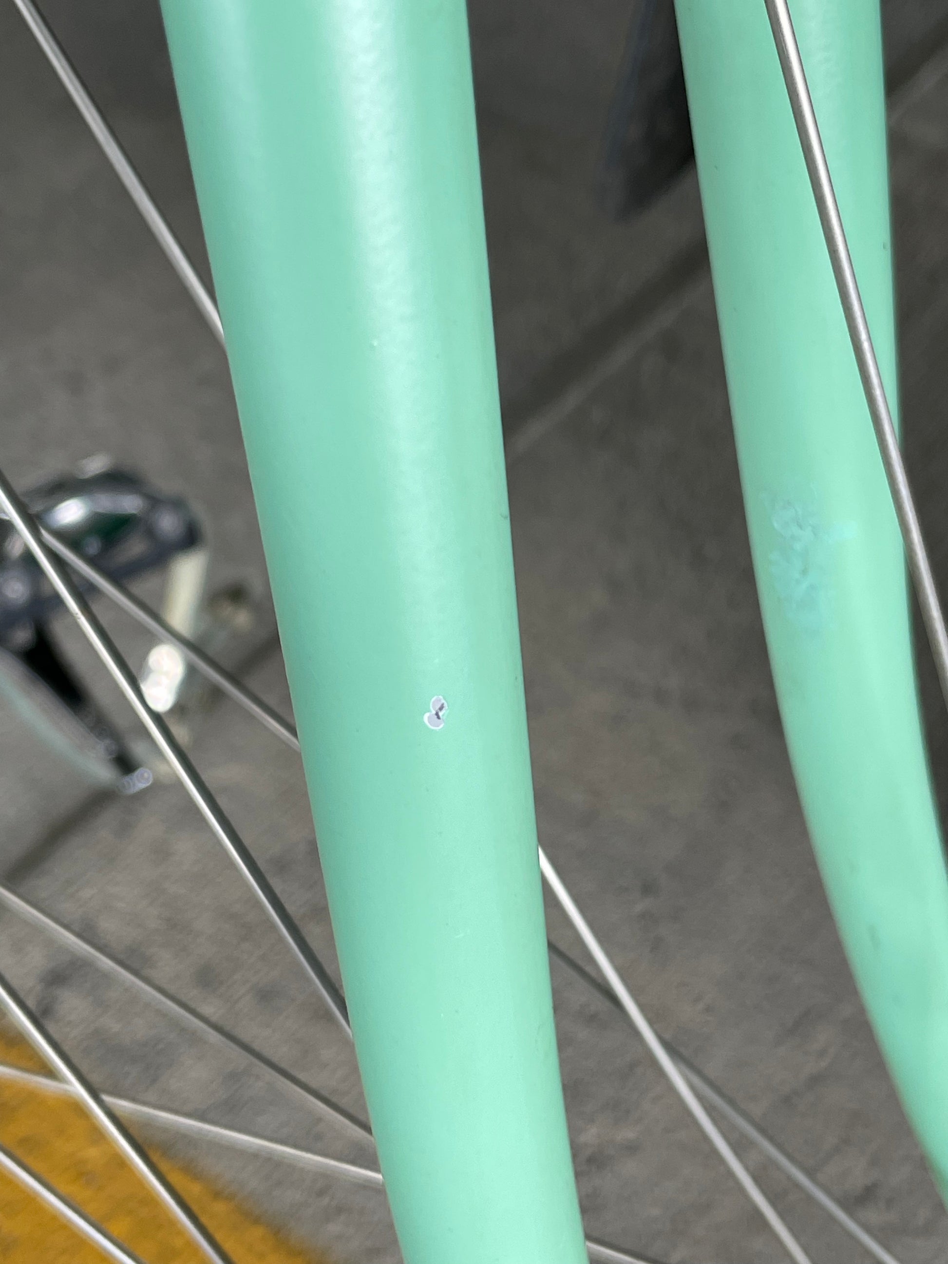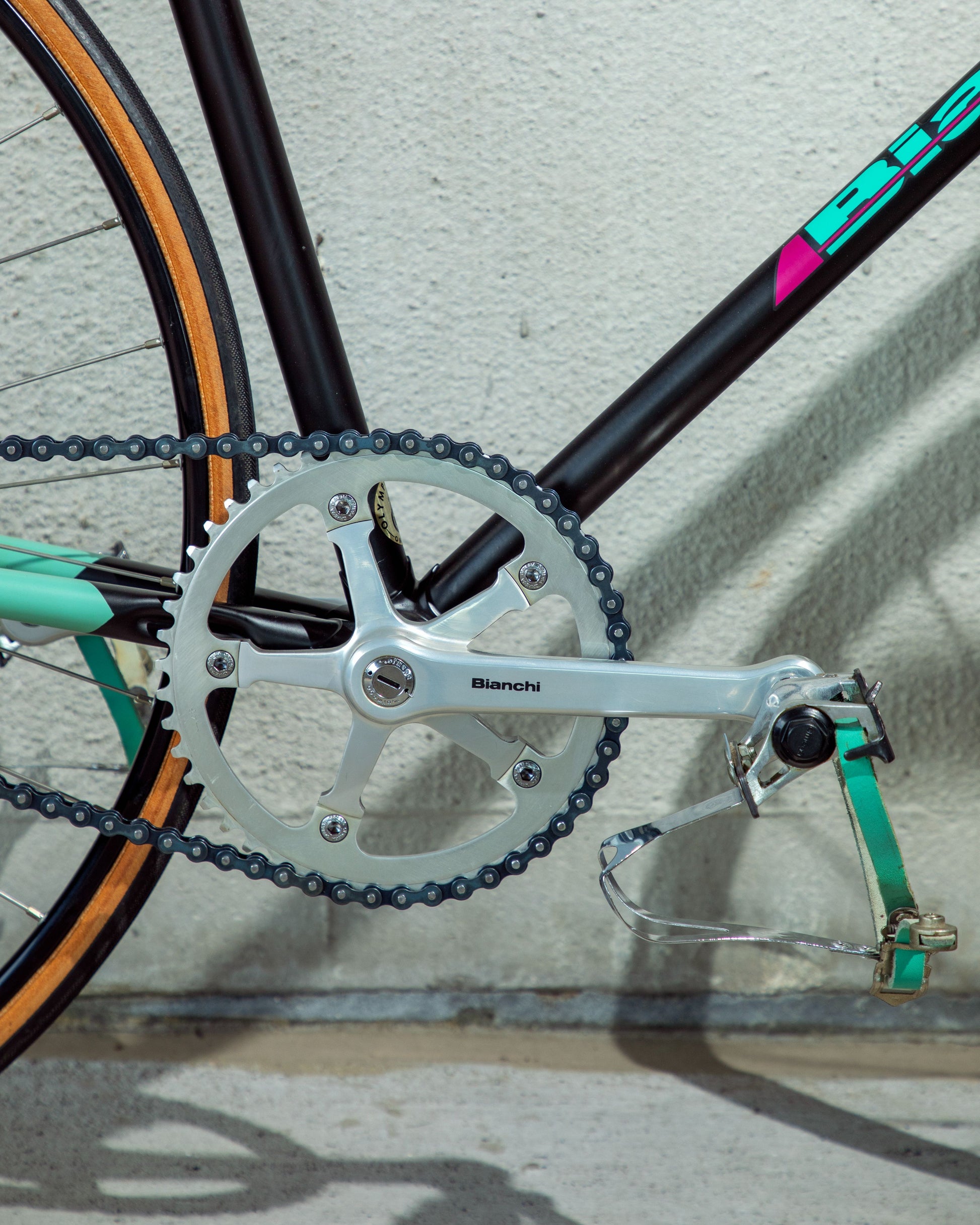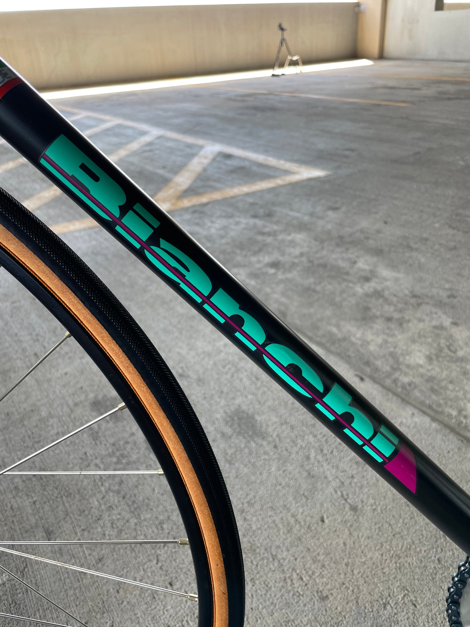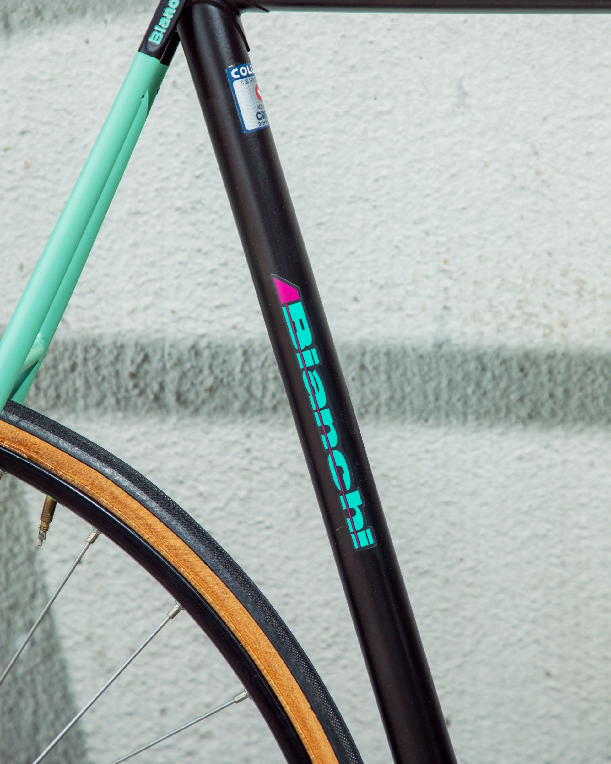 This 1991 Bianchi Pista has been a wall hanger its entire life. The bike is originally from Omaha, Nebraska, where it hung on a bike shop wall. Everything on the bike is catalog spec and in incredible condition, even down to the original tubular tires. Although this bike is in museum condition, it still has a few blemishes from being moved around. There is a paint chip on the inside of both fork blades and a very small paint blemish on the downtube. It looks like whatever chipped the paint, also left the smallest impression in the tube. I would also advise gluing on new tires if you intend to ride this bike, as the glue has lived its life and would likely not hold up while riding. The logo on the back of the saddle is also starting to lift on the right side. The back of the seatpost has some scratches from being removed/installed. I highlighted all of these areas with photos, so please take a look at those to get a better understanding as to the true condition.