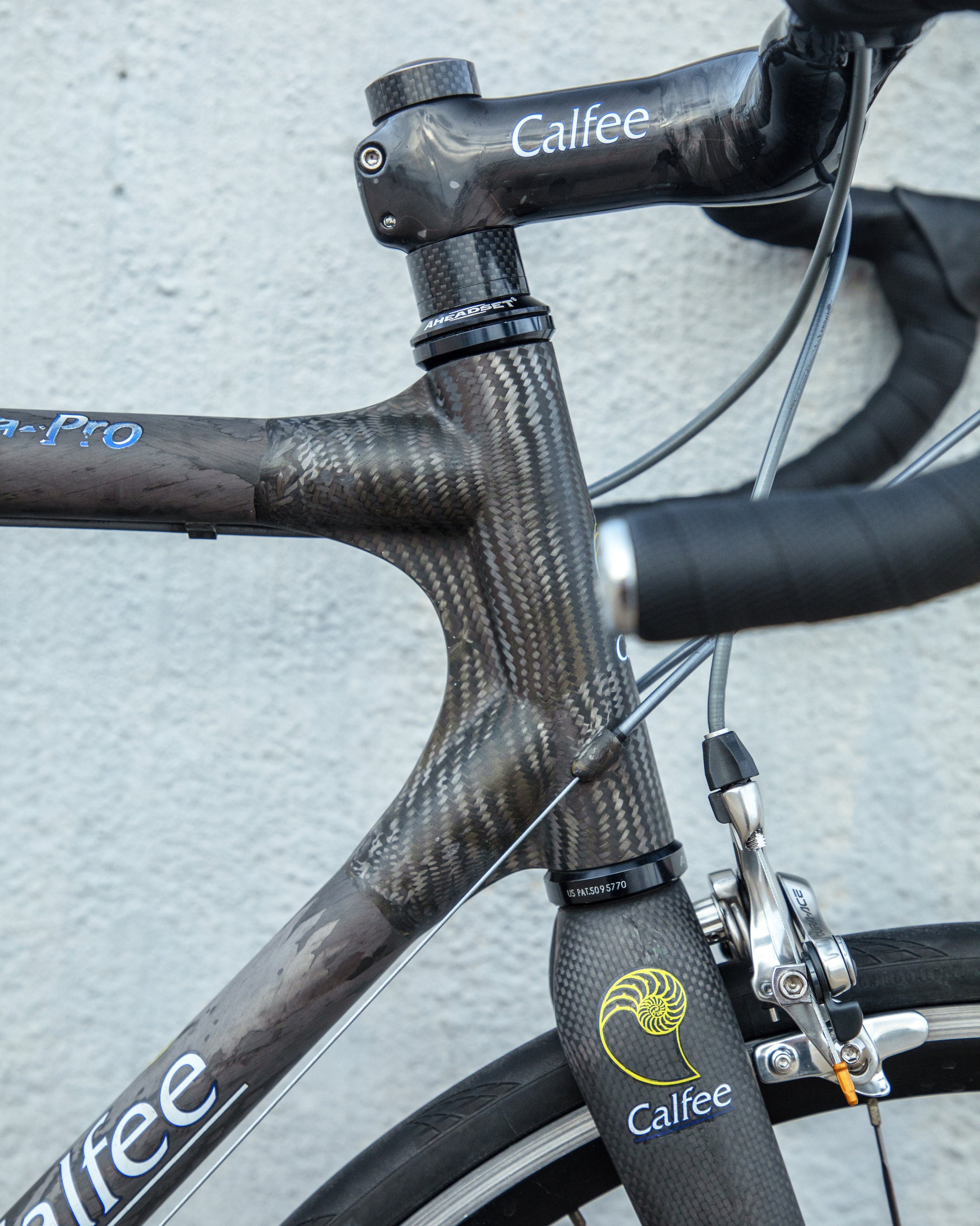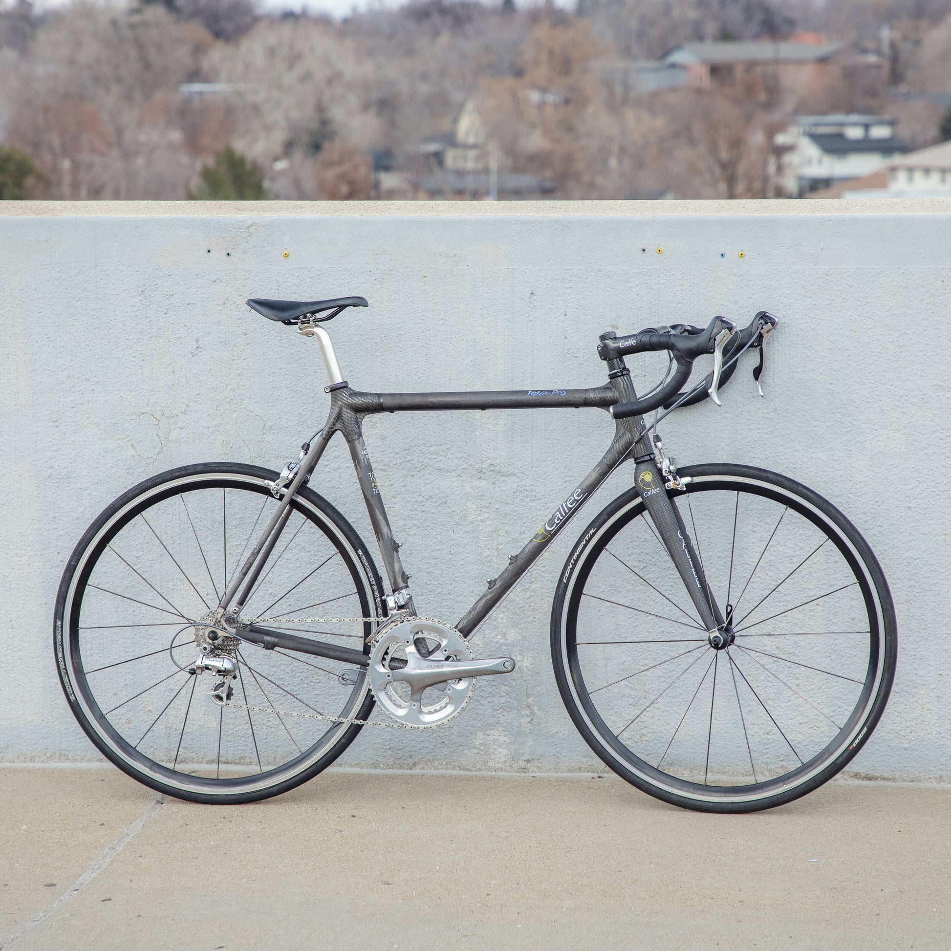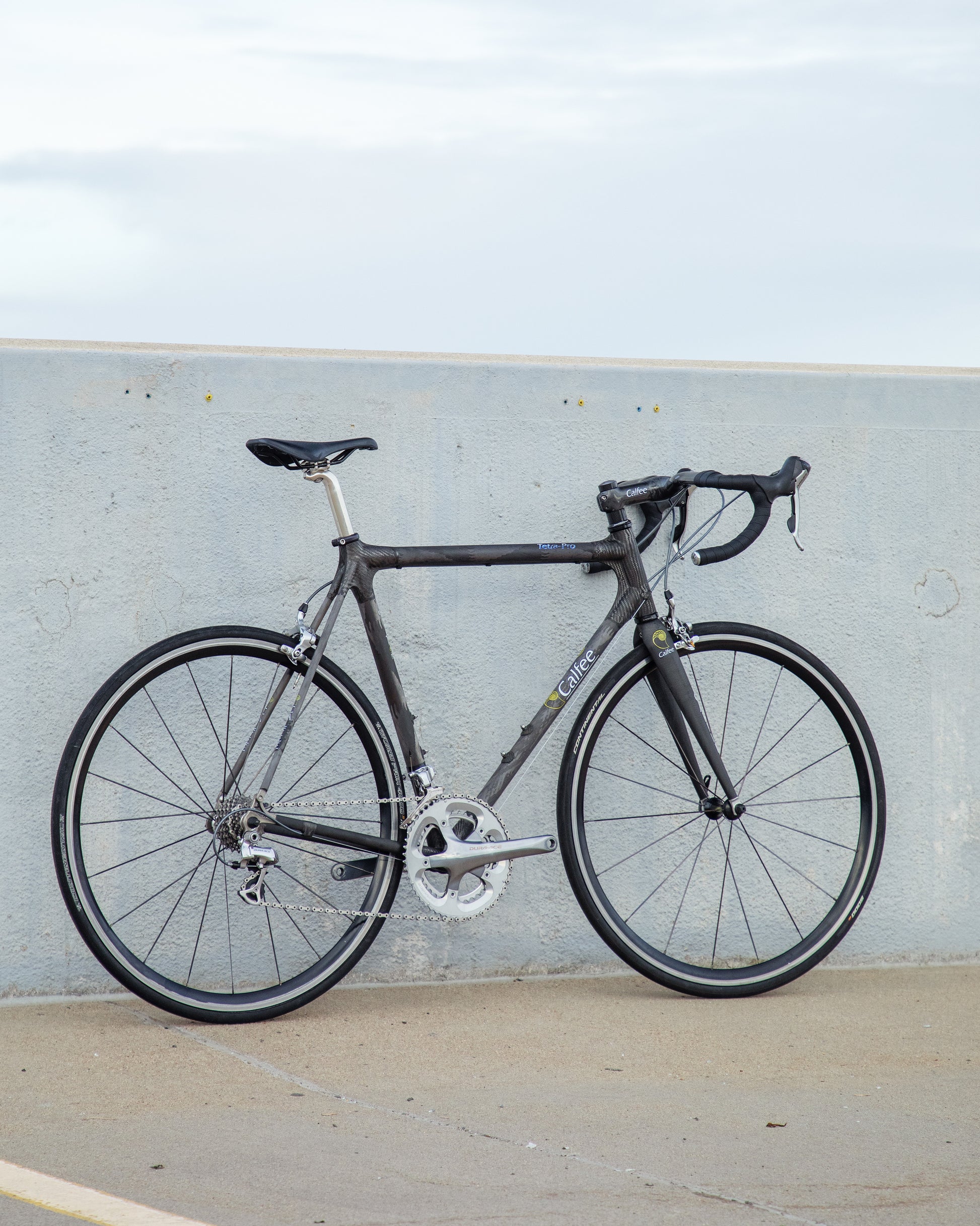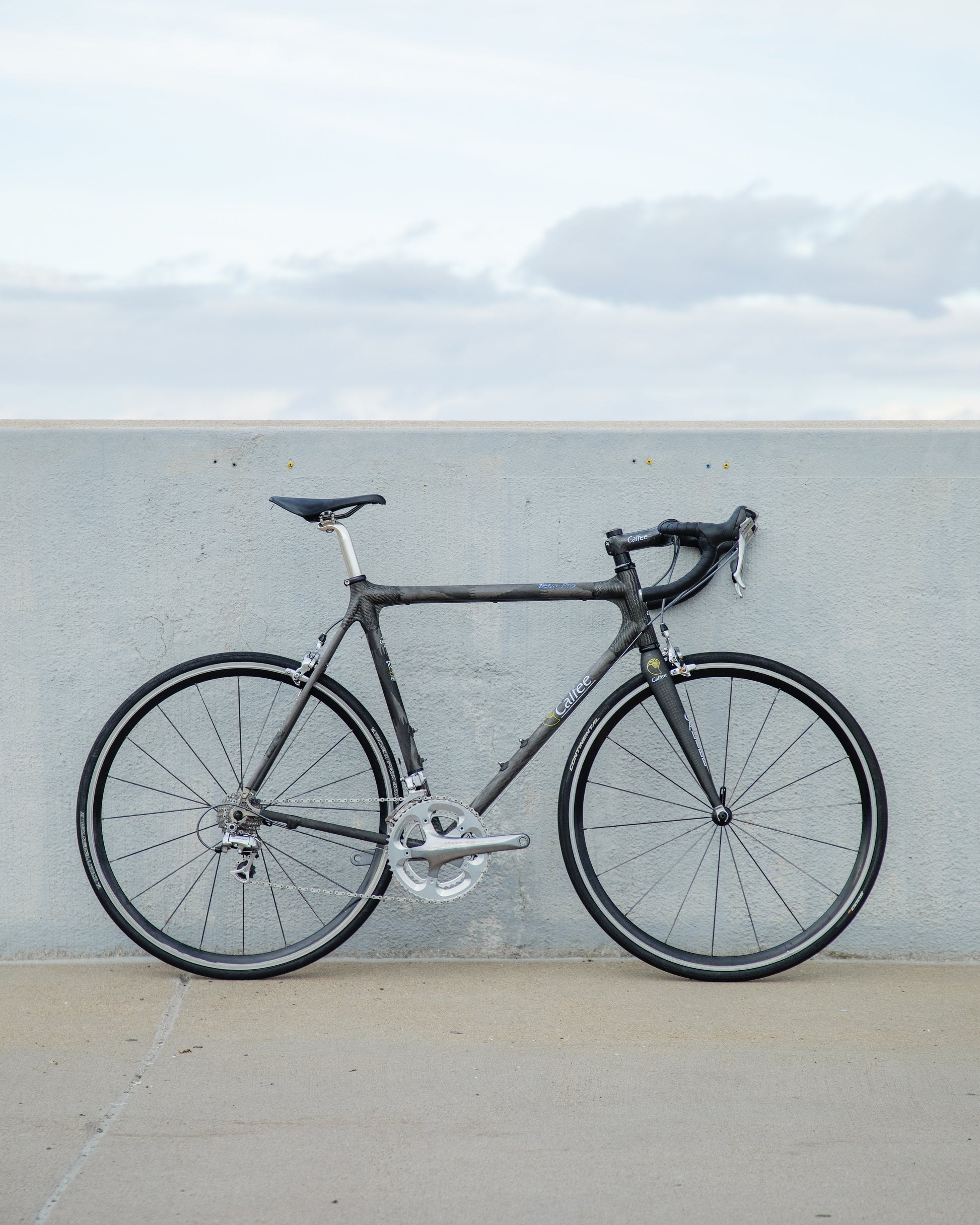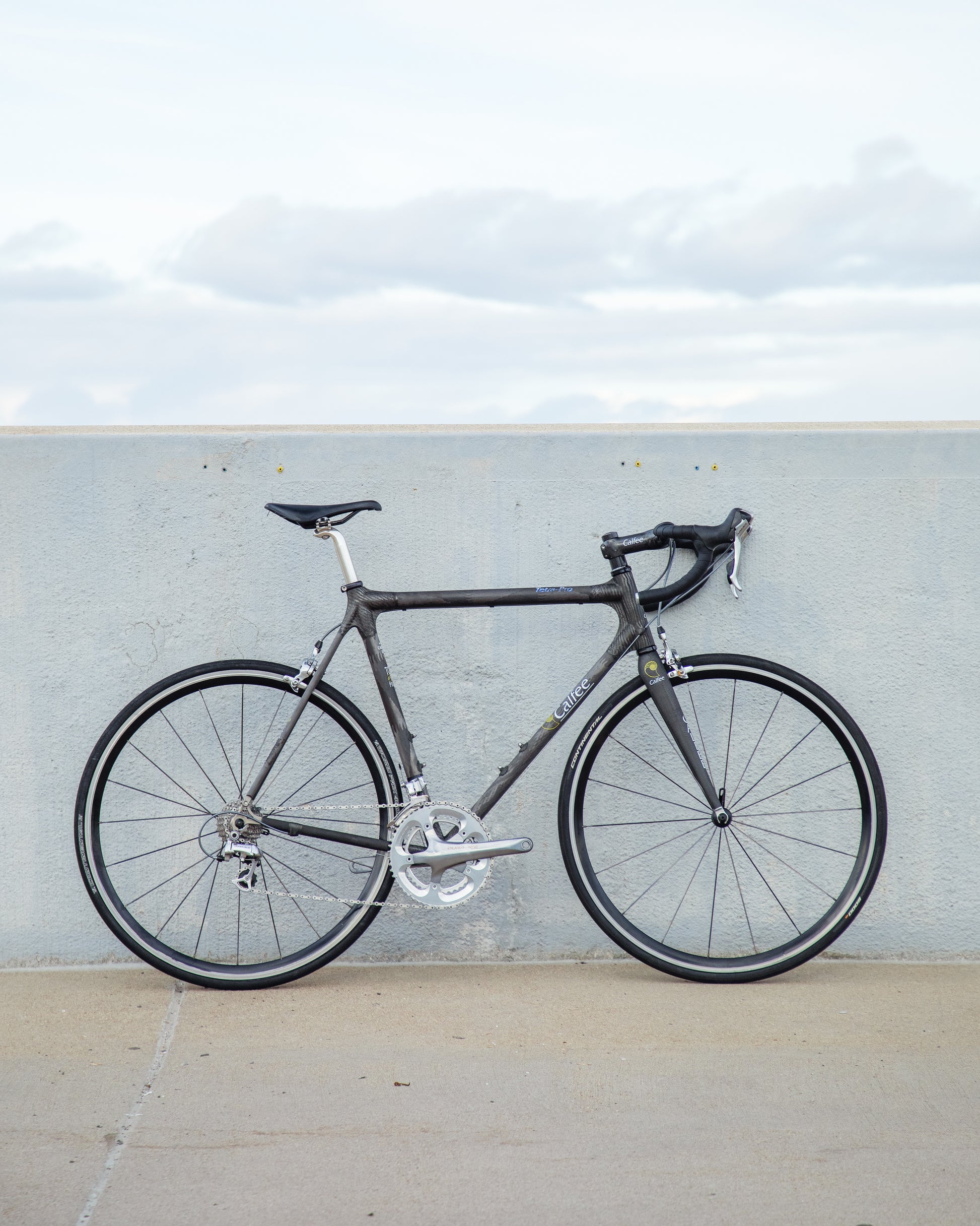 The Calfee Tetra Pro, to me, is the most beautiful carbon fiber bike ever made. The exposed carbon resembles that of a multi-million dollar hypercar. The webbed lugs are unique to Calfee and gives the look of speed and aerodynamics. From a distance, the bike almost looks like it's made with steel tubing. The tubes aren't obnoxiously large like on modern carbon bikes. This bike is in great condition, but shows sign of use. The decals are faded in areas but the carbon looks amazing. The epoxy isn't flaking off anywhere on the frame. All components were removed and the frame was carefully inspected for any cracks - there are none. It comes with a very cool, one-piece carbon bar/stem made by Calfee with two different weaves of carbon. All components are Dura-Ace 7800 - one of the most snappy and beautiful groupsets to come from Shimano. the tires are miss-match in model and have some life left in them. This is a serious ride, designed for one purpose and that is to go fast.
