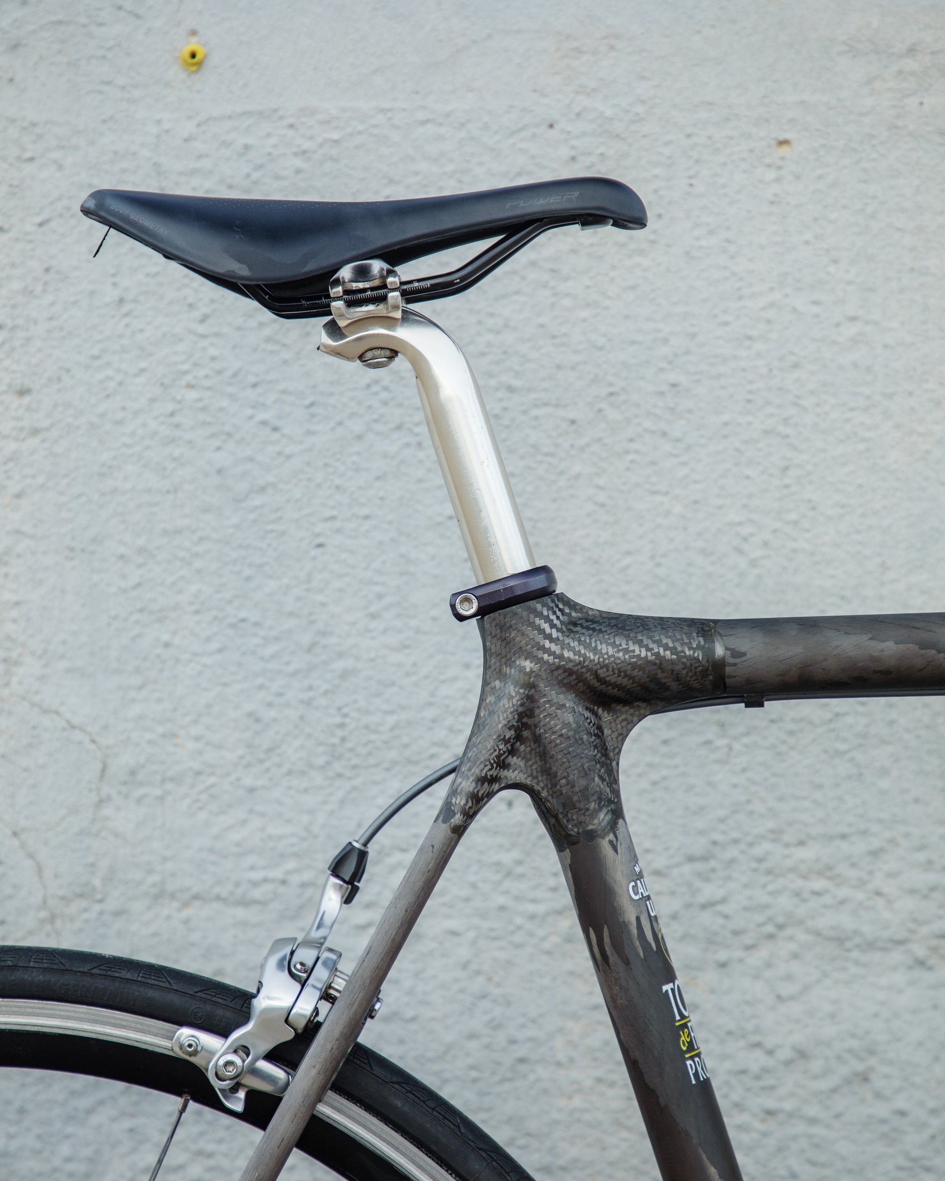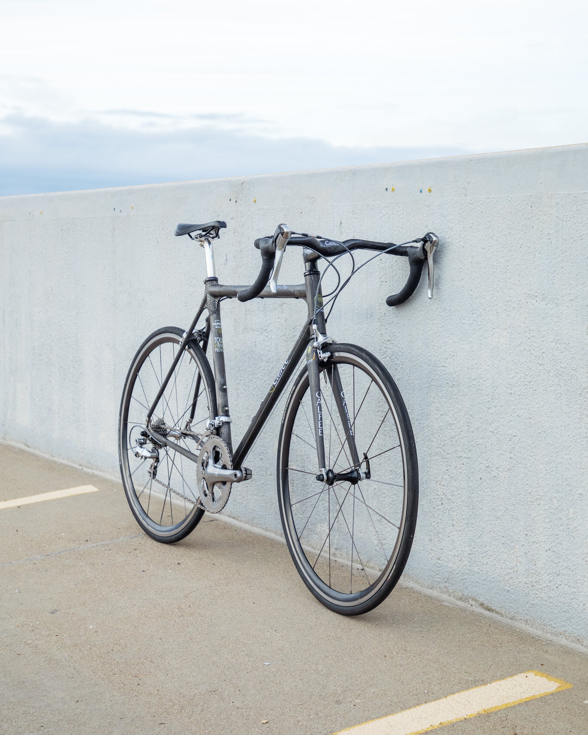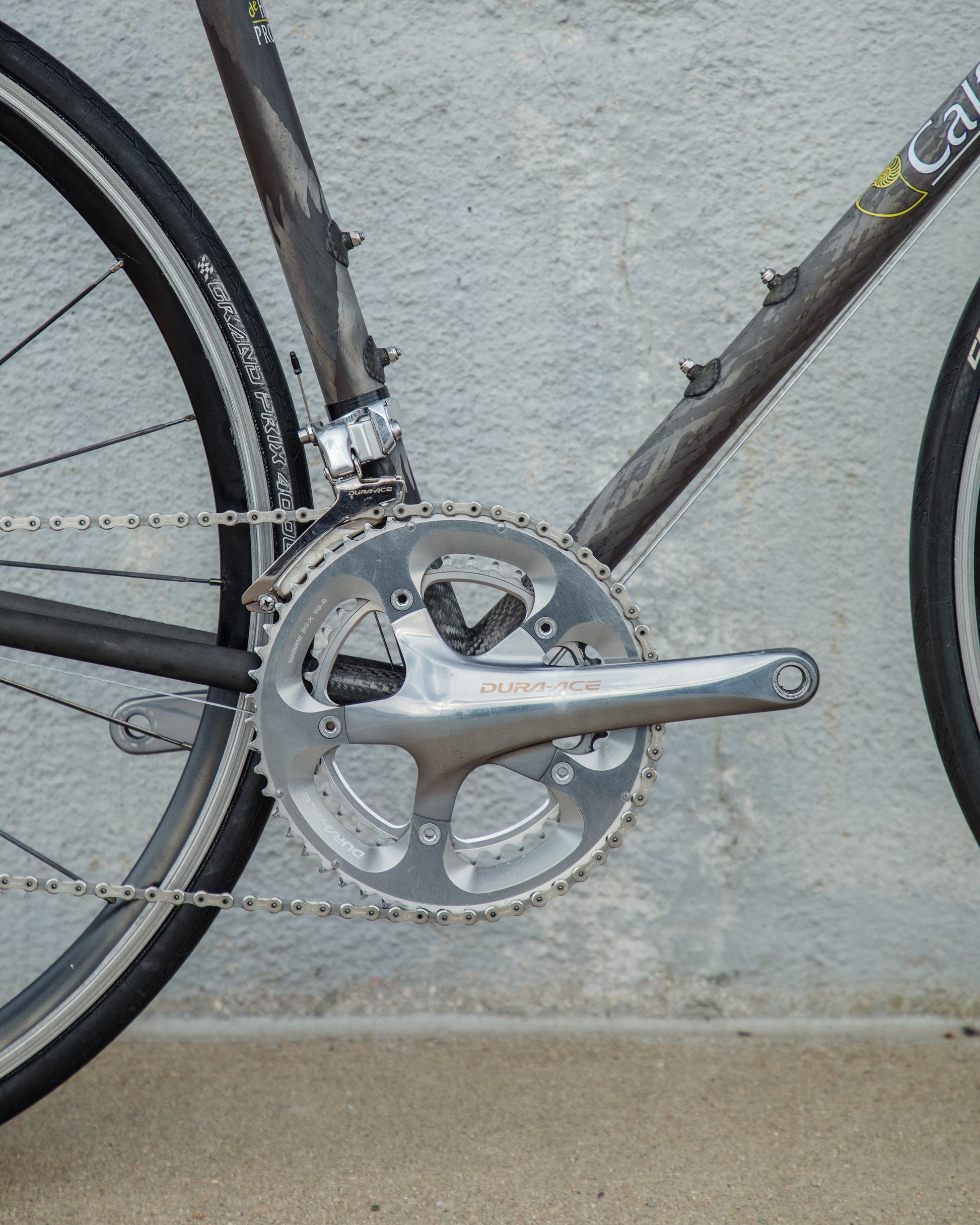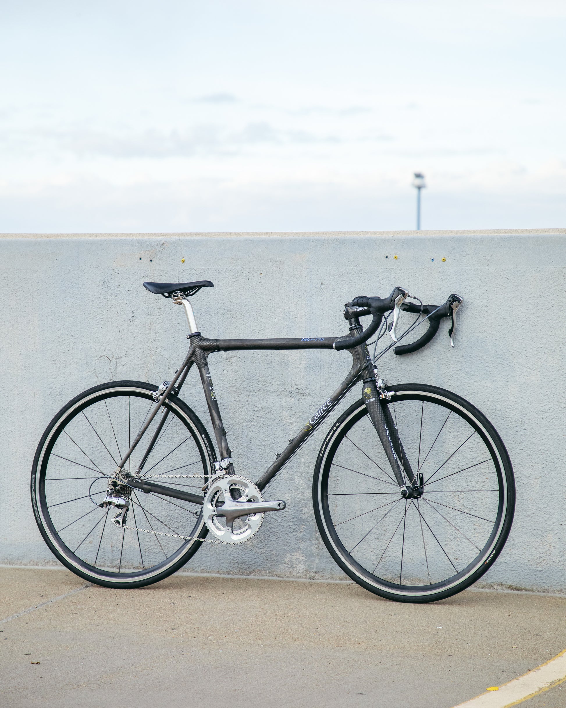 The Calfee Tetra Pro, to me, is the most beautiful carbon fiber bike ever made. The exposed carbon resembles that of a multi-million dollar hypercar. The webbed lugs are unique to Calfee and gives the look of speed and aerodynamics. From a distance, the bike almost looks like it's made with steel tubing. The tubes aren't obnoxiously large like on modern carbon bikes. This bike is in great condition, but shows sign of use. The decals are faded in areas but the carbon looks amazing. The epoxy isn't flaking off anywhere on the frame. All components were removed and the frame was carefully inspected for any cracks - there are none. It comes with a very cool, one-piece carbon bar/stem made by Calfee with two different weaves of carbon. All components are Dura-Ace 7800 - one of the most snappy and beautiful groupsets to come from Shimano. the tires are miss-match in model and have some life left in them. This is a serious ride, designed for one purpose and that is to go fast.
