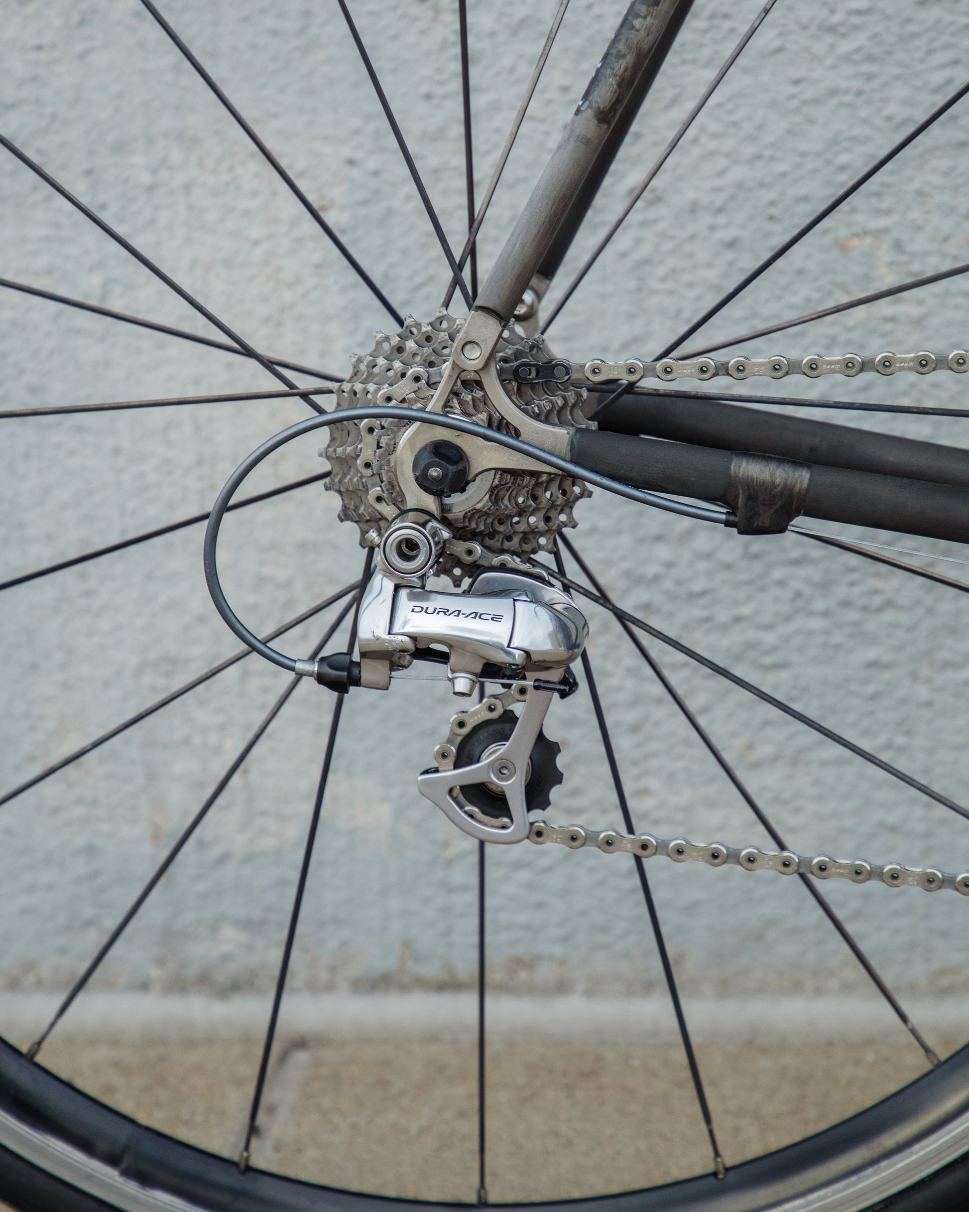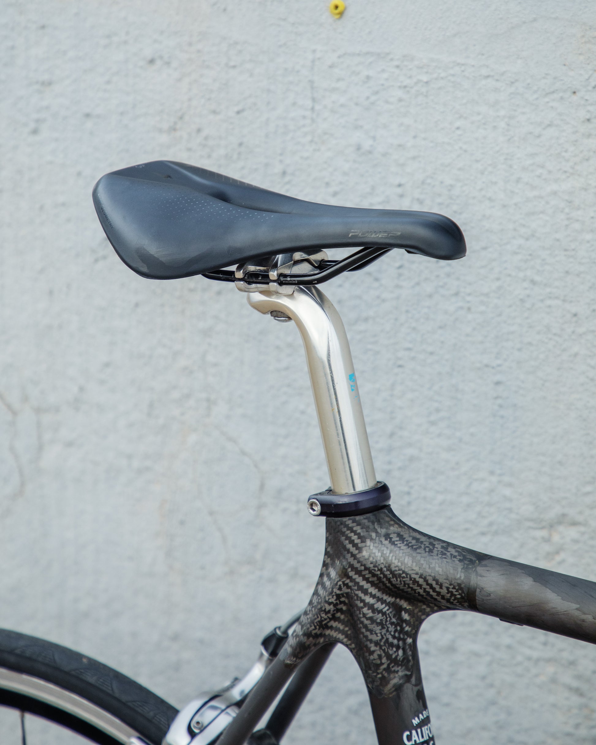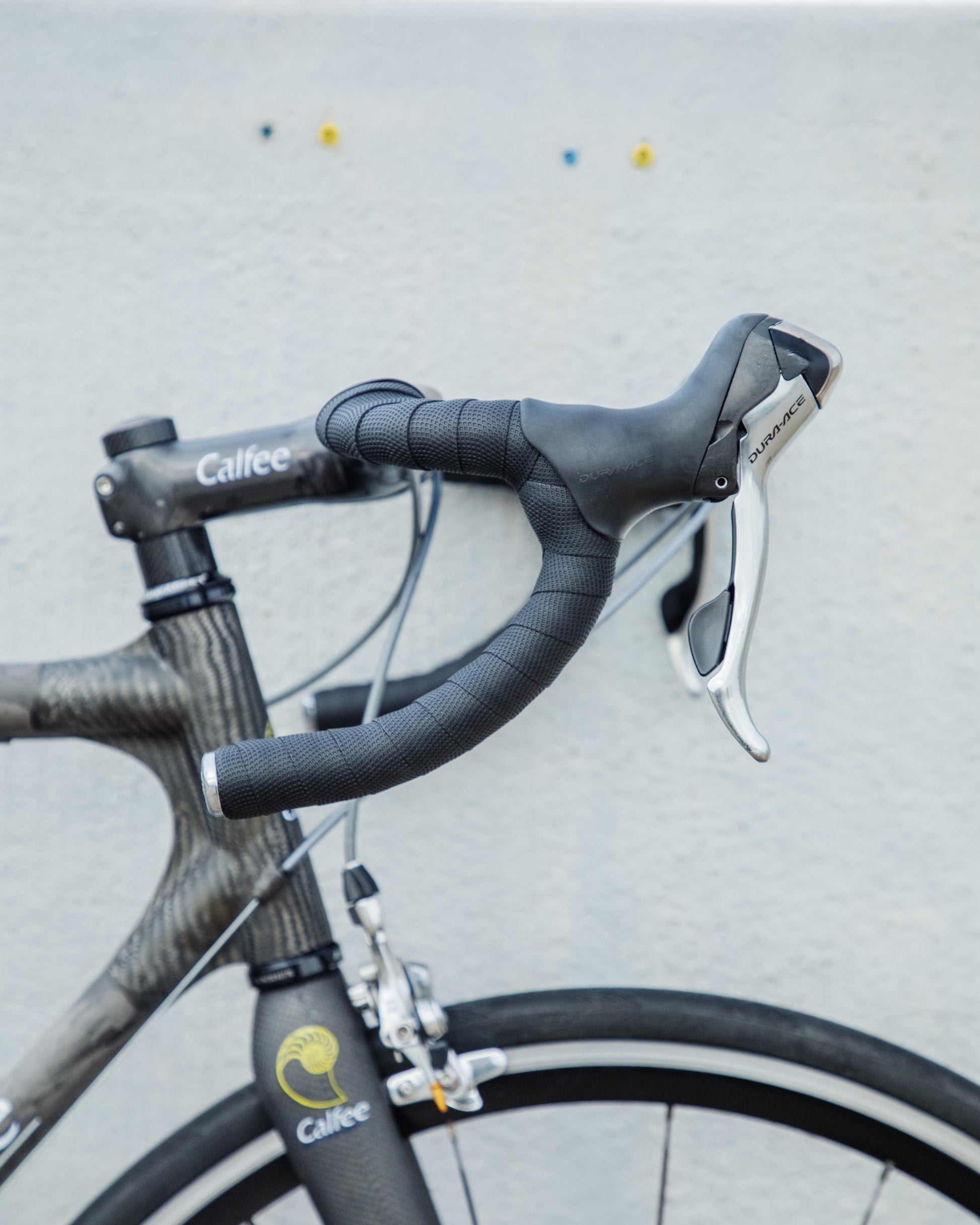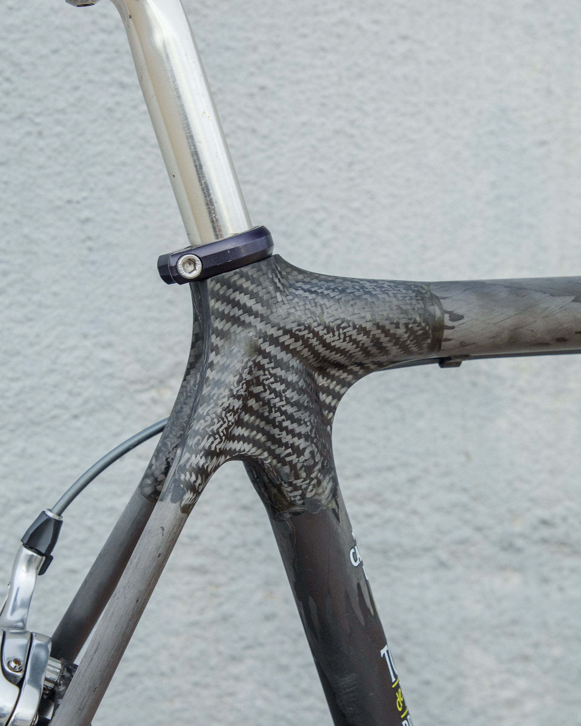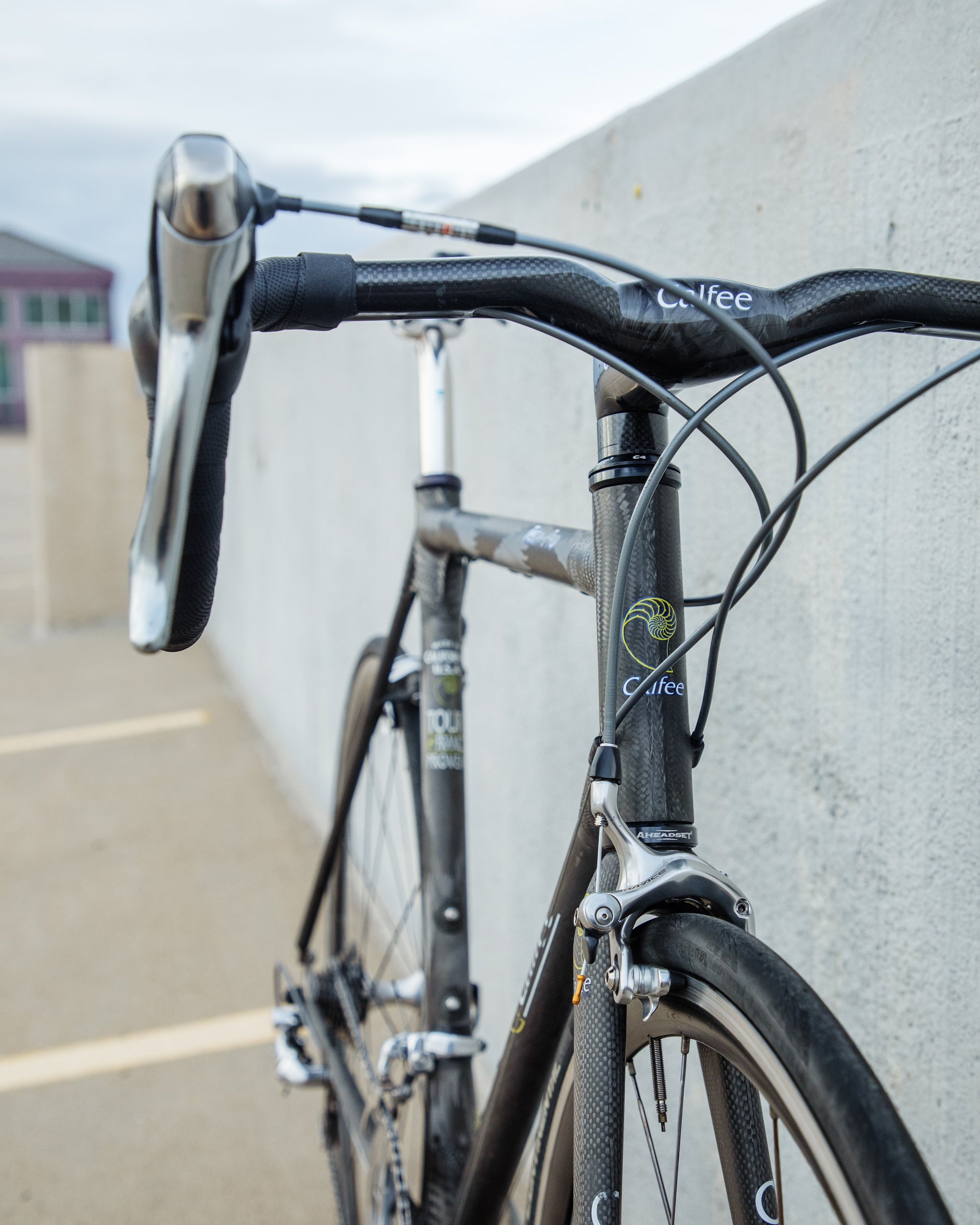 The Calfee Tetra Pro, to me, is the most beautiful carbon fiber bike ever made. The exposed carbon resembles that of a multi-million dollar hypercar. The webbed lugs are unique to Calfee and gives the look of speed and aerodynamics. From a distance, the bike almost looks like it's made with steel tubing. The tubes aren't obnoxiously large like on modern carbon bikes. This bike is in great condition, but shows sign of use. The decals are faded in areas but the carbon looks amazing. The epoxy isn't flaking off anywhere on the frame. All components were removed and the frame was carefully inspected for any cracks - there are none. It comes with a very cool, one-piece carbon bar/stem made by Calfee with two different weaves of carbon. All components are Dura-Ace 7800 - one of the most snappy and beautiful groupsets to come from Shimano. the tires are miss-match in model and have some life left in them. This is a serious ride, designed for one purpose and that is to go fast.