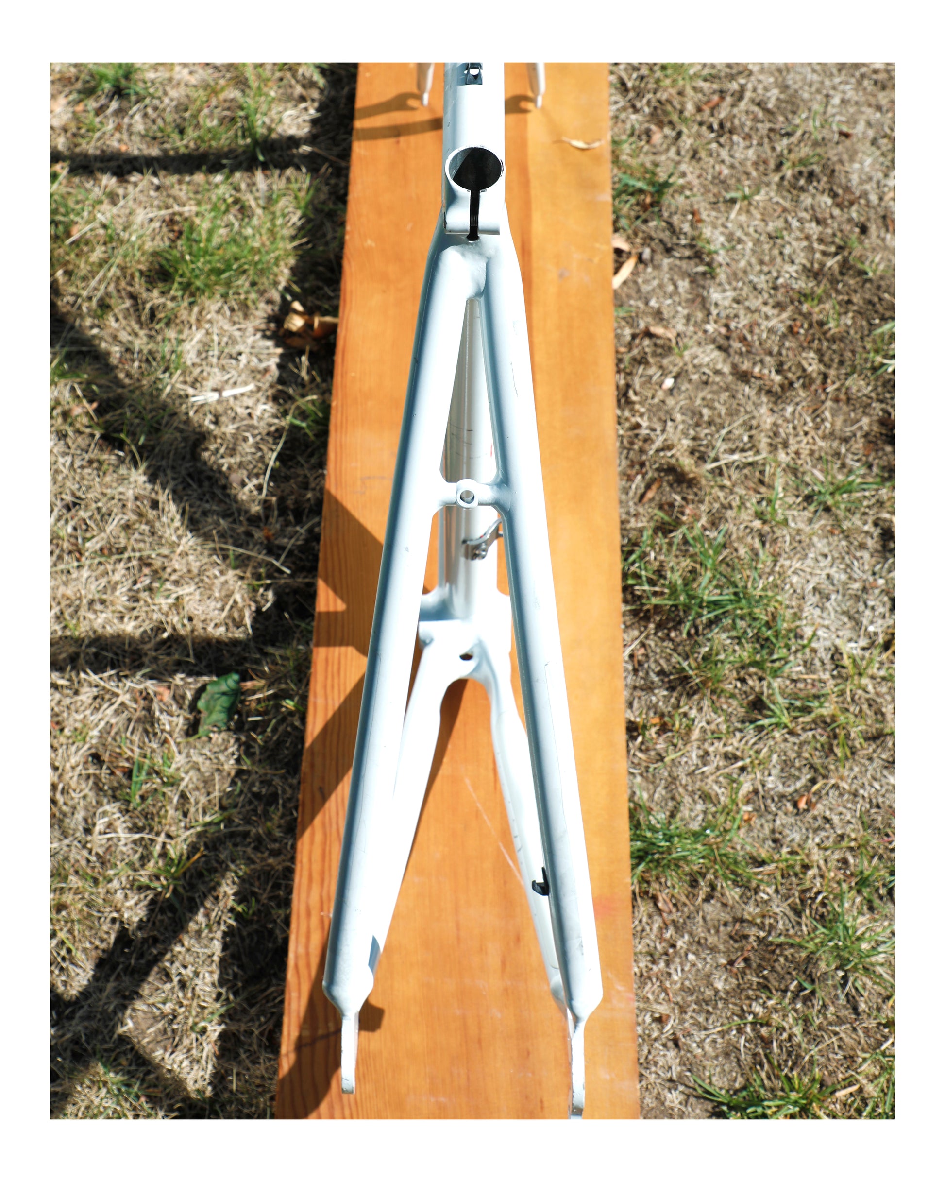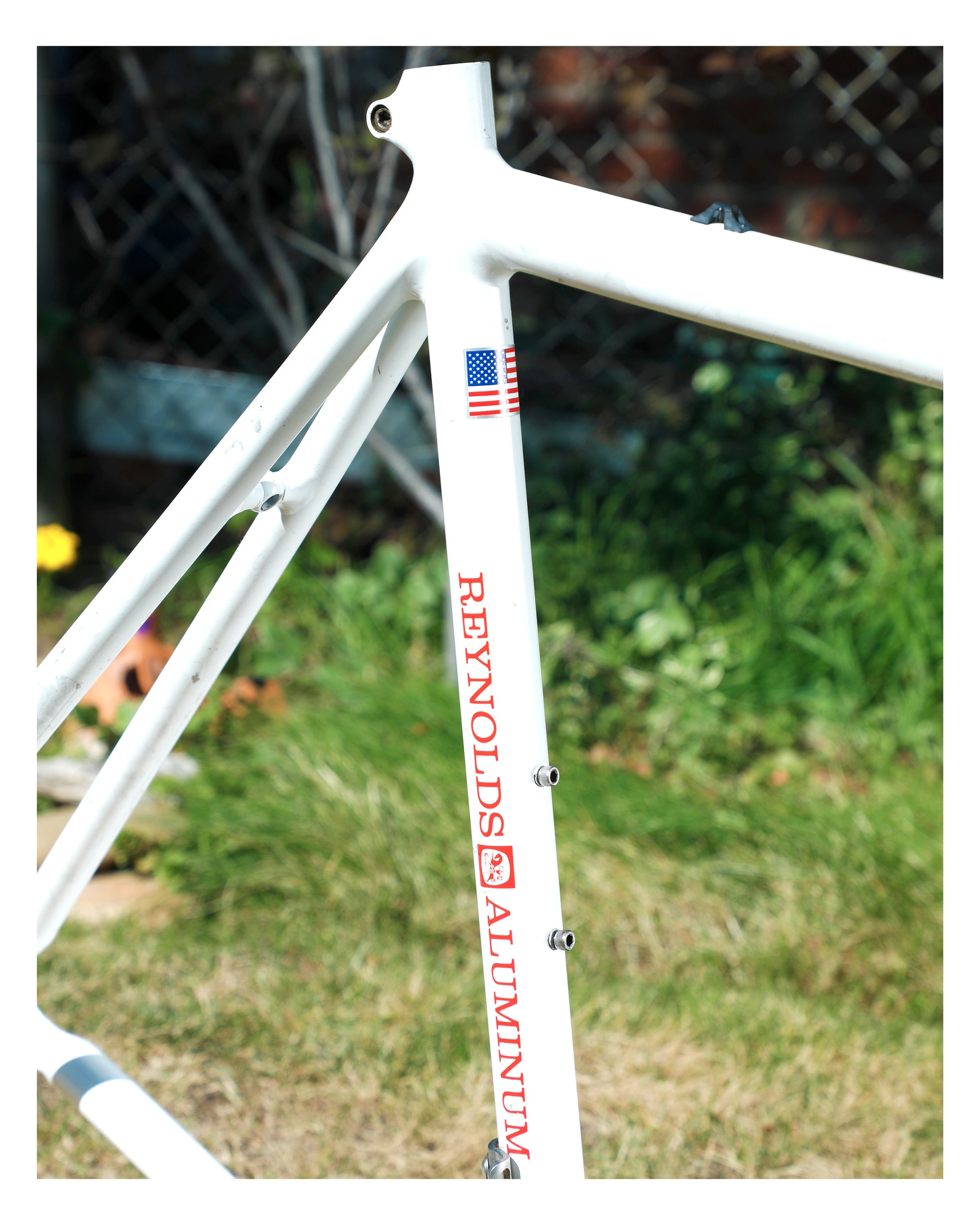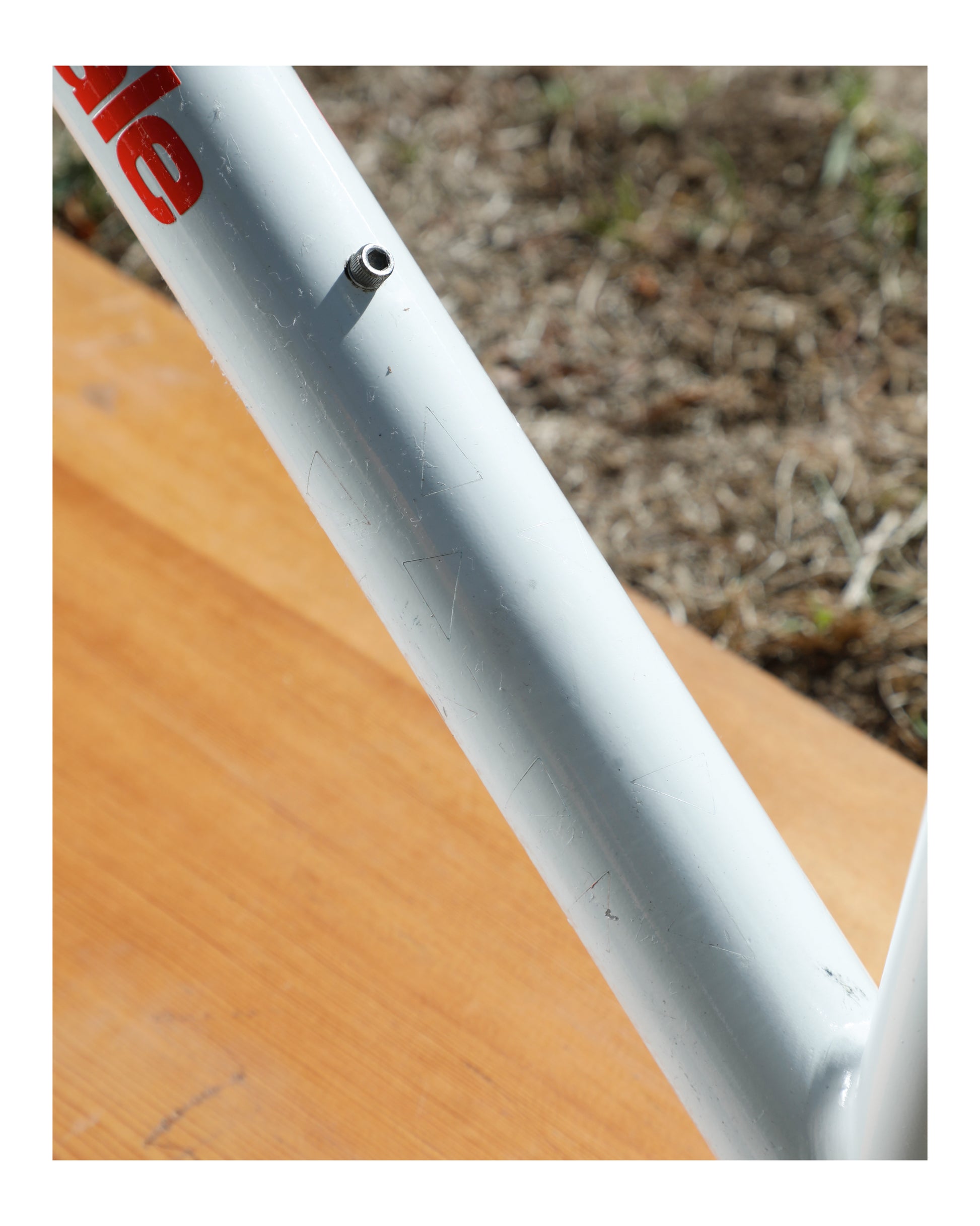 Unfortunately, the precious owner removed all of the color speckle decals. I'd love for this frame to go to someone who is willing to put the time and effort into re-decaling it. It deserves it and looks SO COOL! The cable guide closest to the seat post has a crack in it. The frame looks great and only has a couple scuffs and the outline of previous stickers. I did my best to clean it up and make it more presentable.