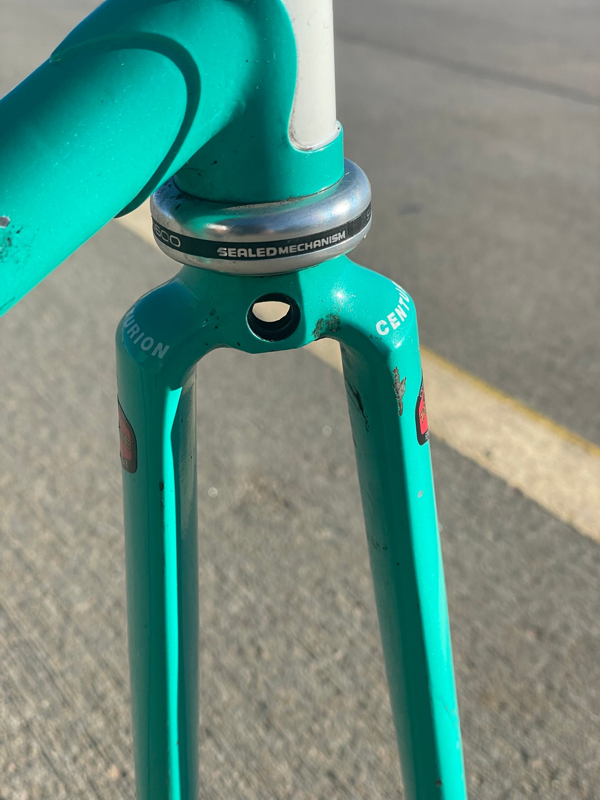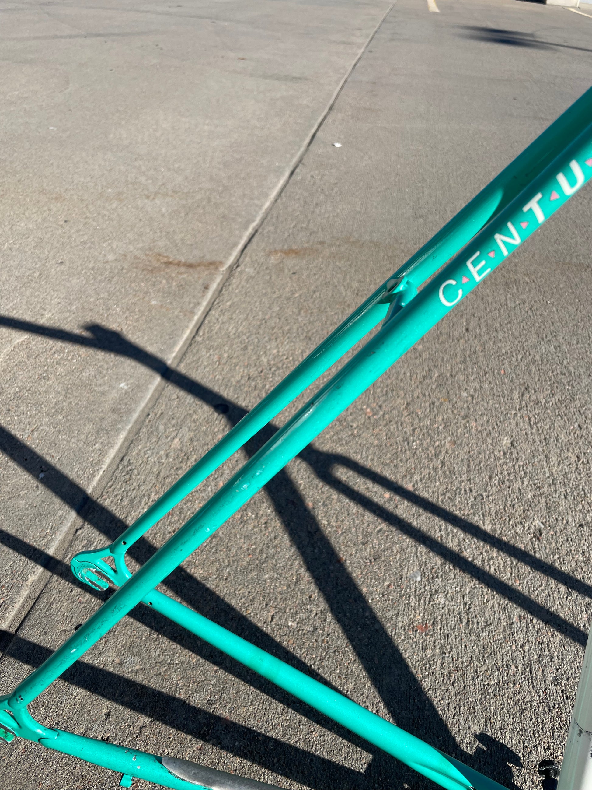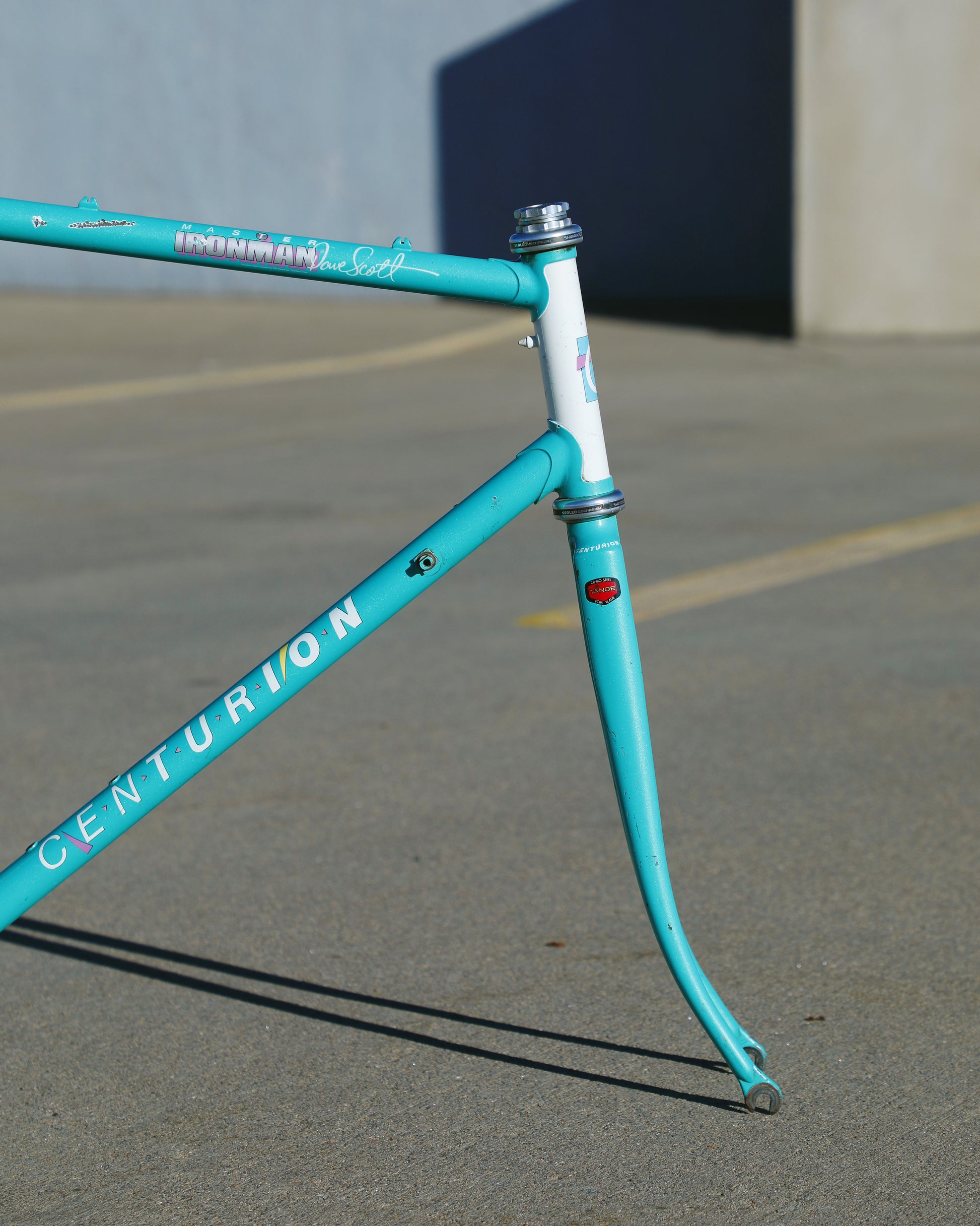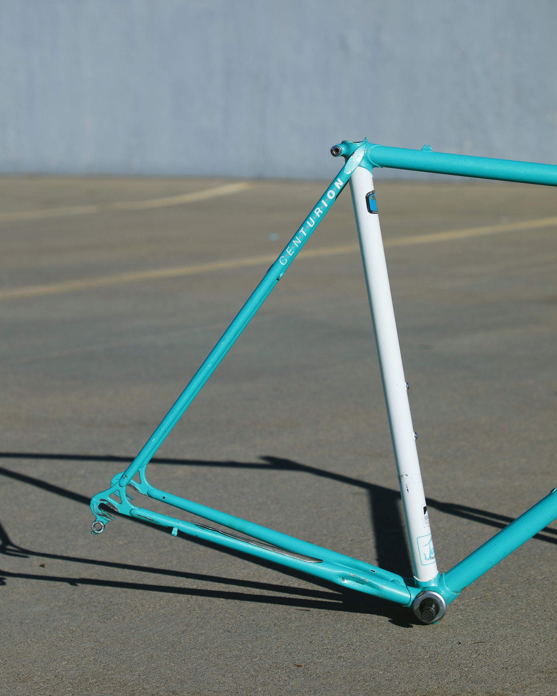 This centurion frame is in good condition but shows sign of use. There is a large scrape on the top tube (drive side). Someone also ingraved there name into the paint on the bottom of he down tube. Some other paint chips here and there but no dents, bends, or cracks. Bottom bracket and headset included (have not been serviced). It's a great looking frame made with renowned Tange 1 tubing.