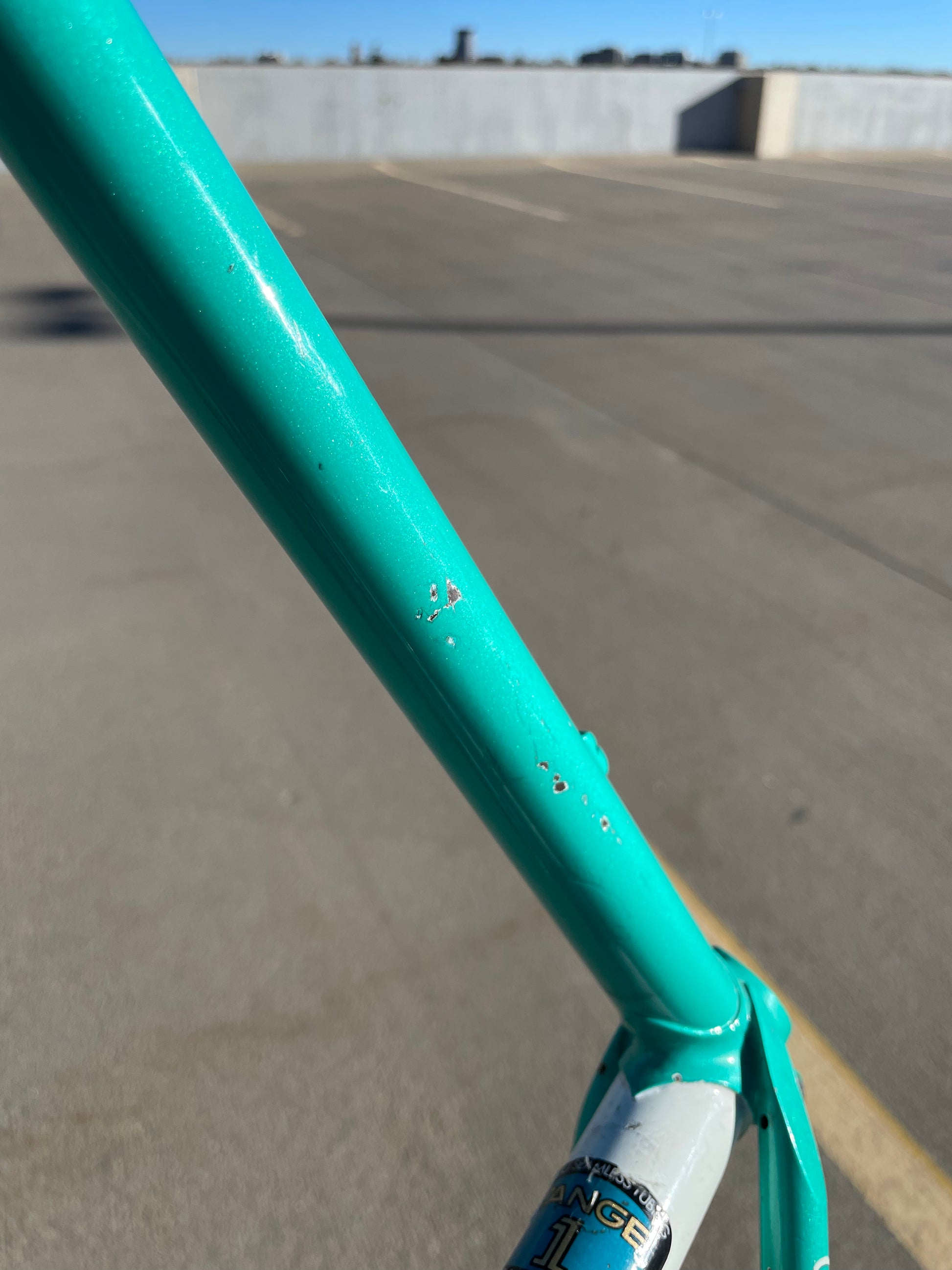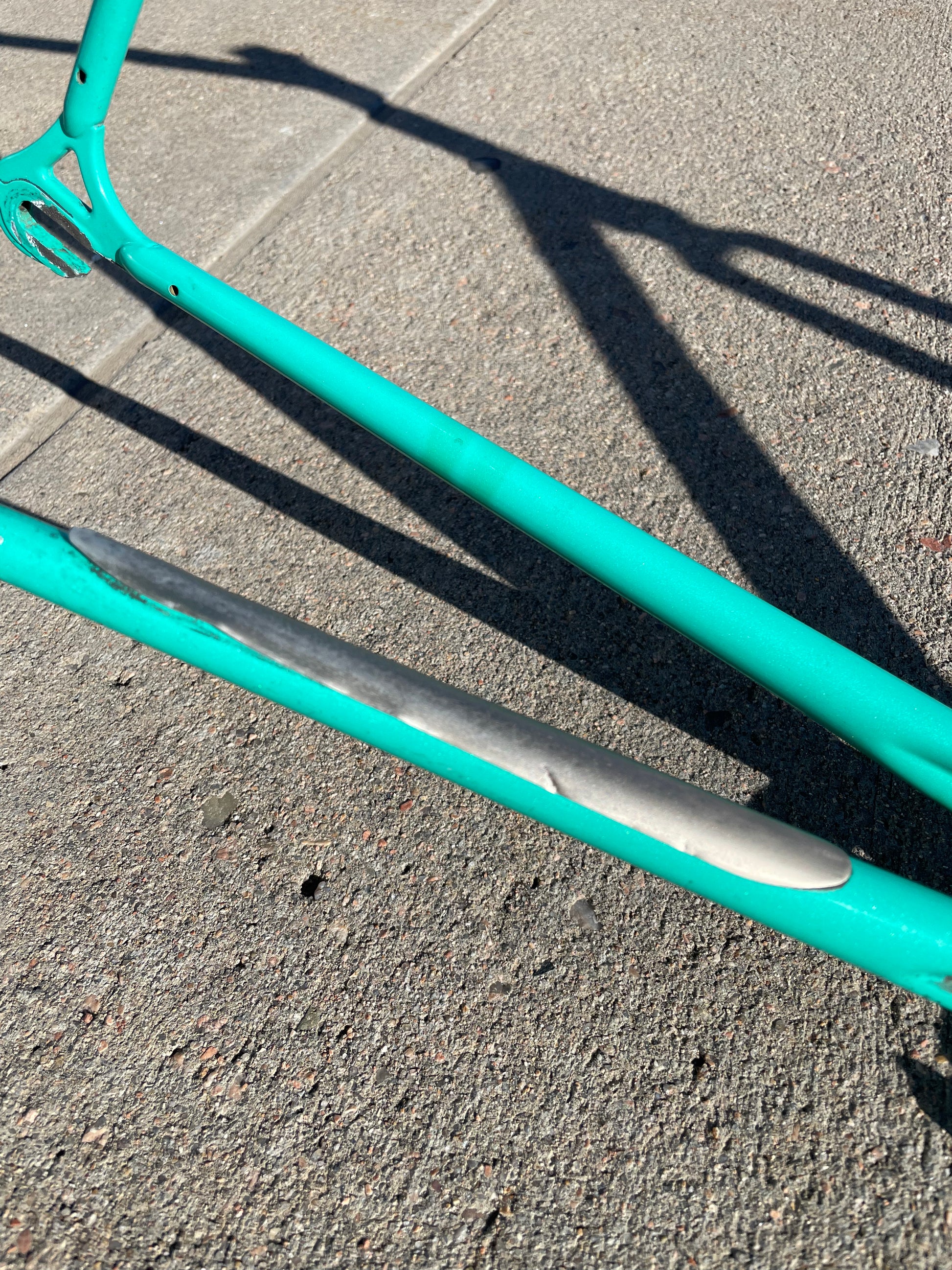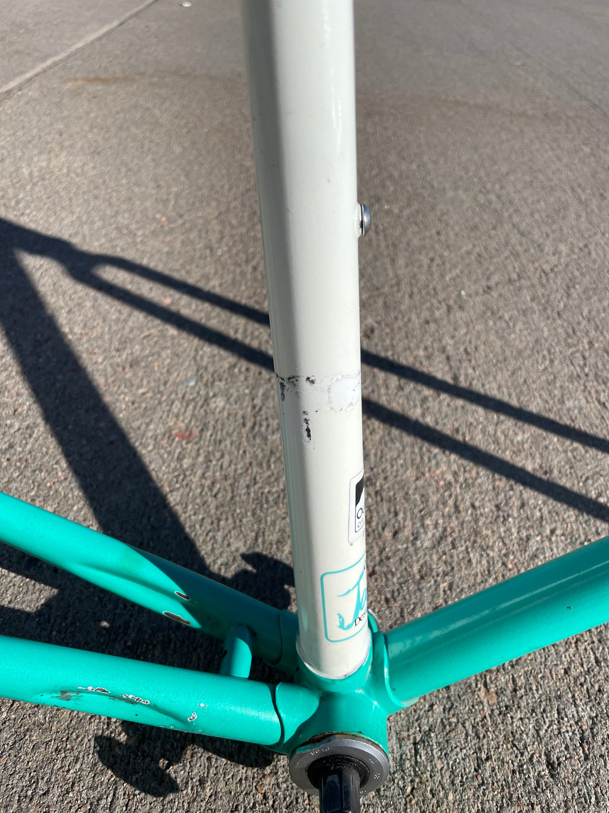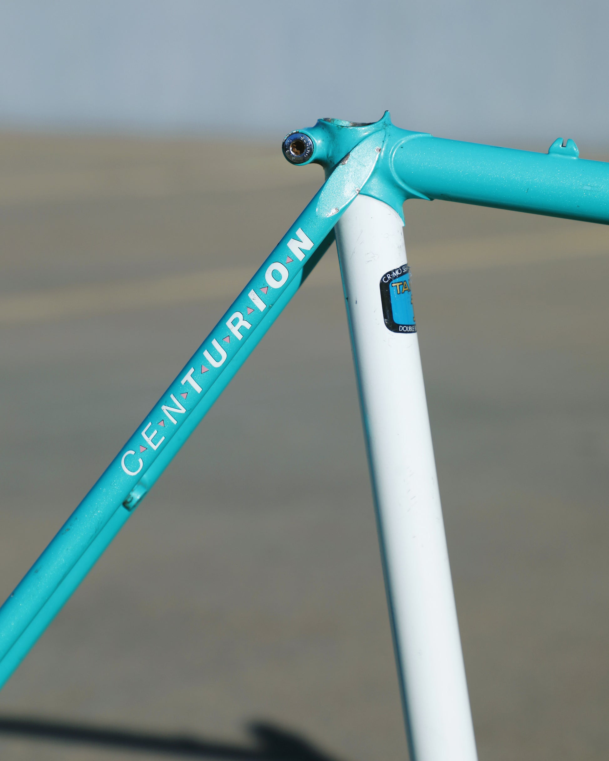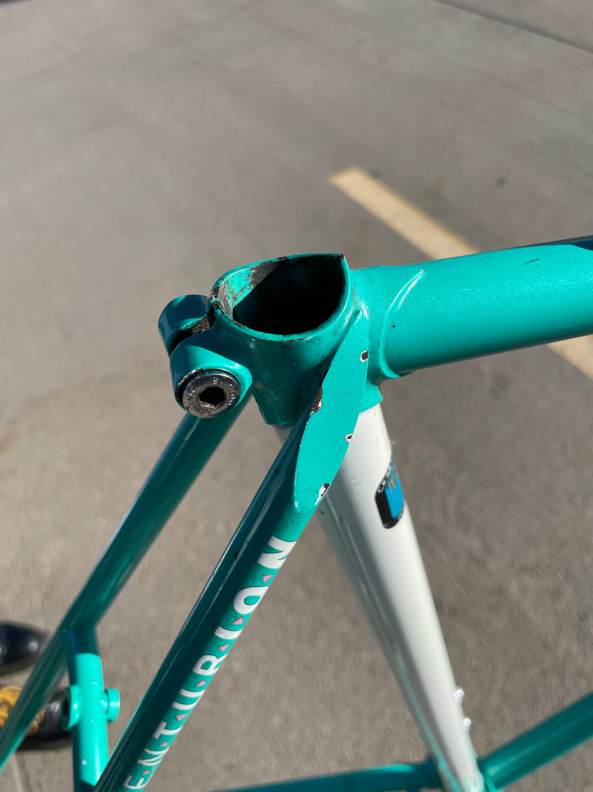 This centurion frame is in good condition but shows sign of use. There is a large scrape on the top tube (drive side). Someone also ingraved there name into the paint on the bottom of he down tube. Some other paint chips here and there but no dents, bends, or cracks. Bottom bracket and headset included (have not been serviced). It's a great looking frame made with renowned Tange 1 tubing.